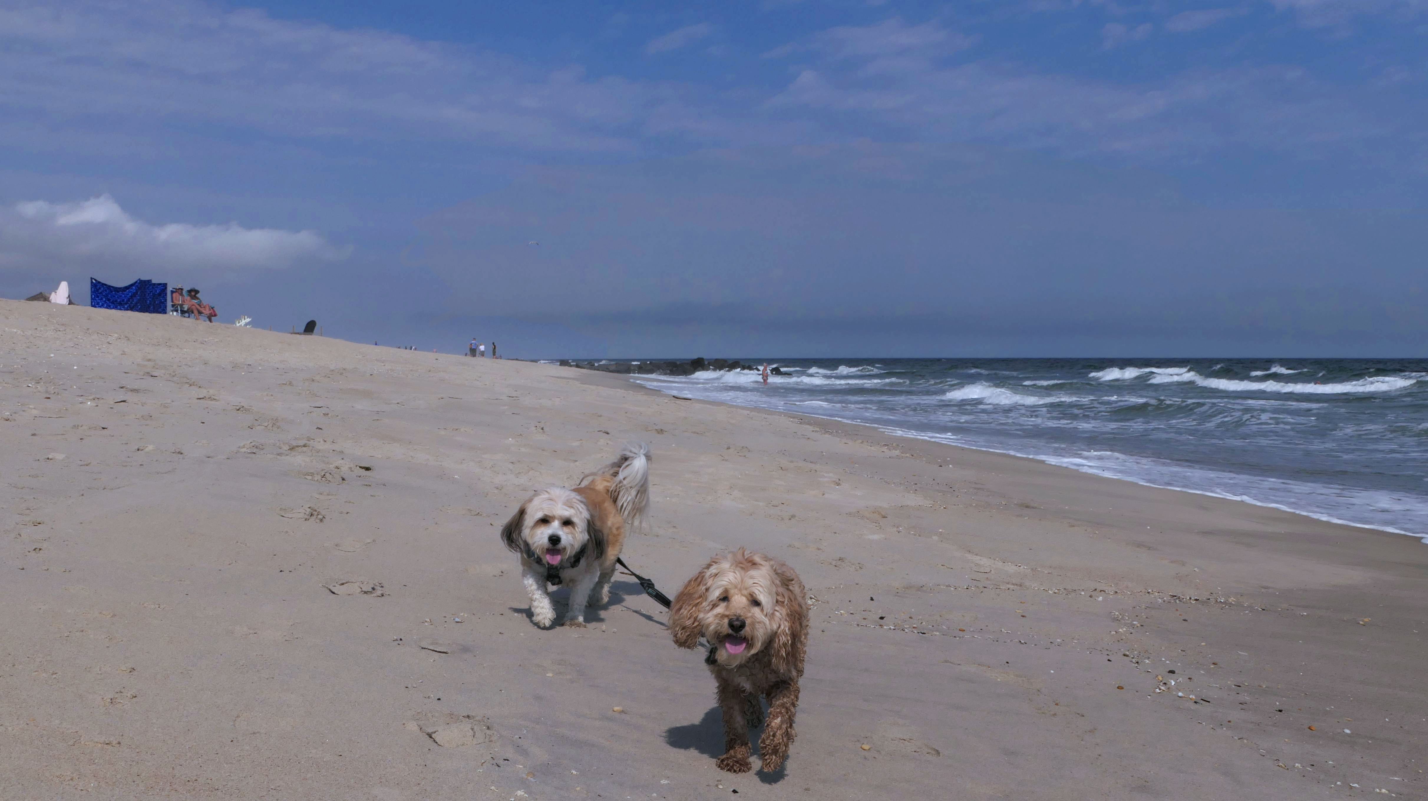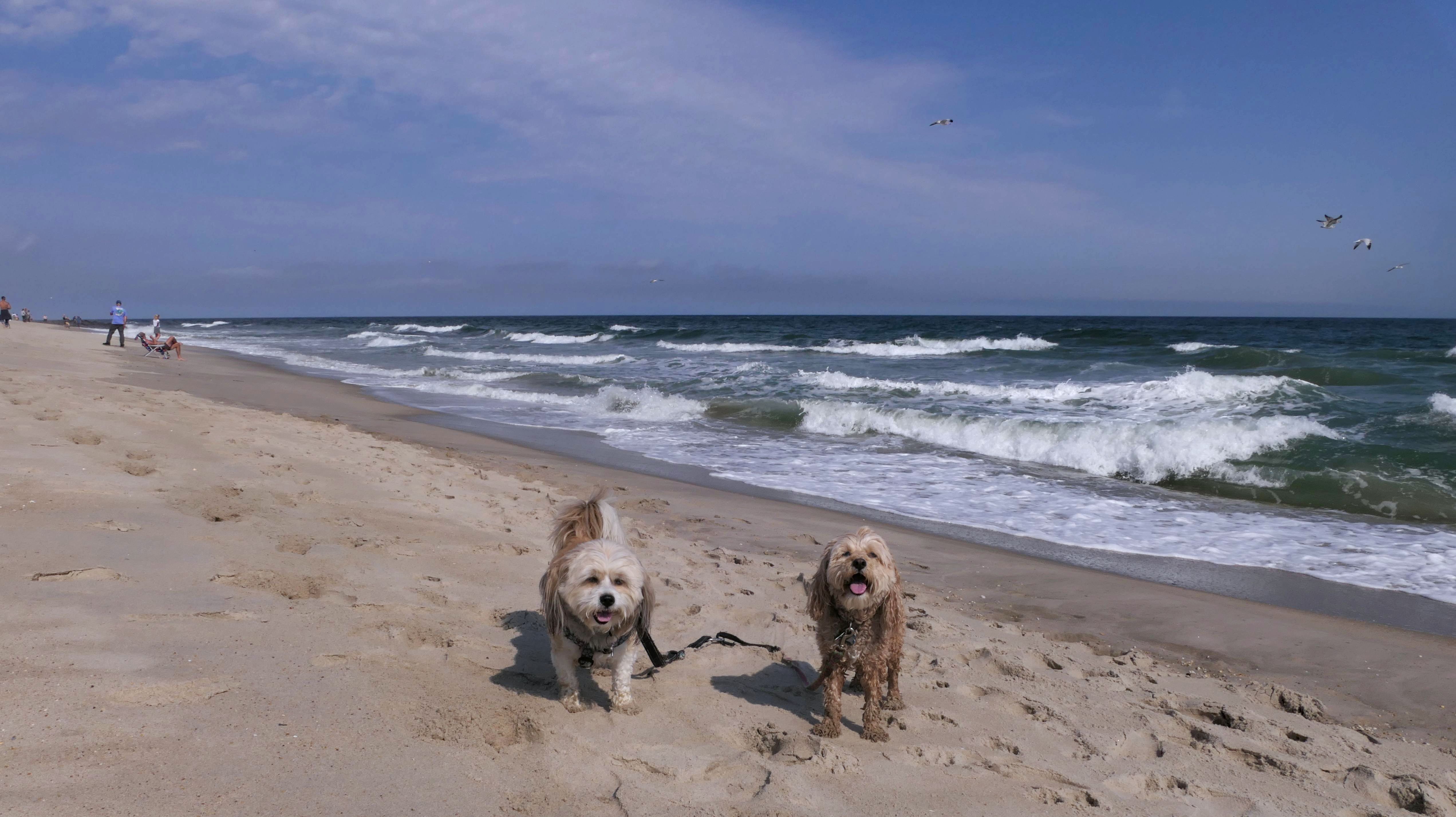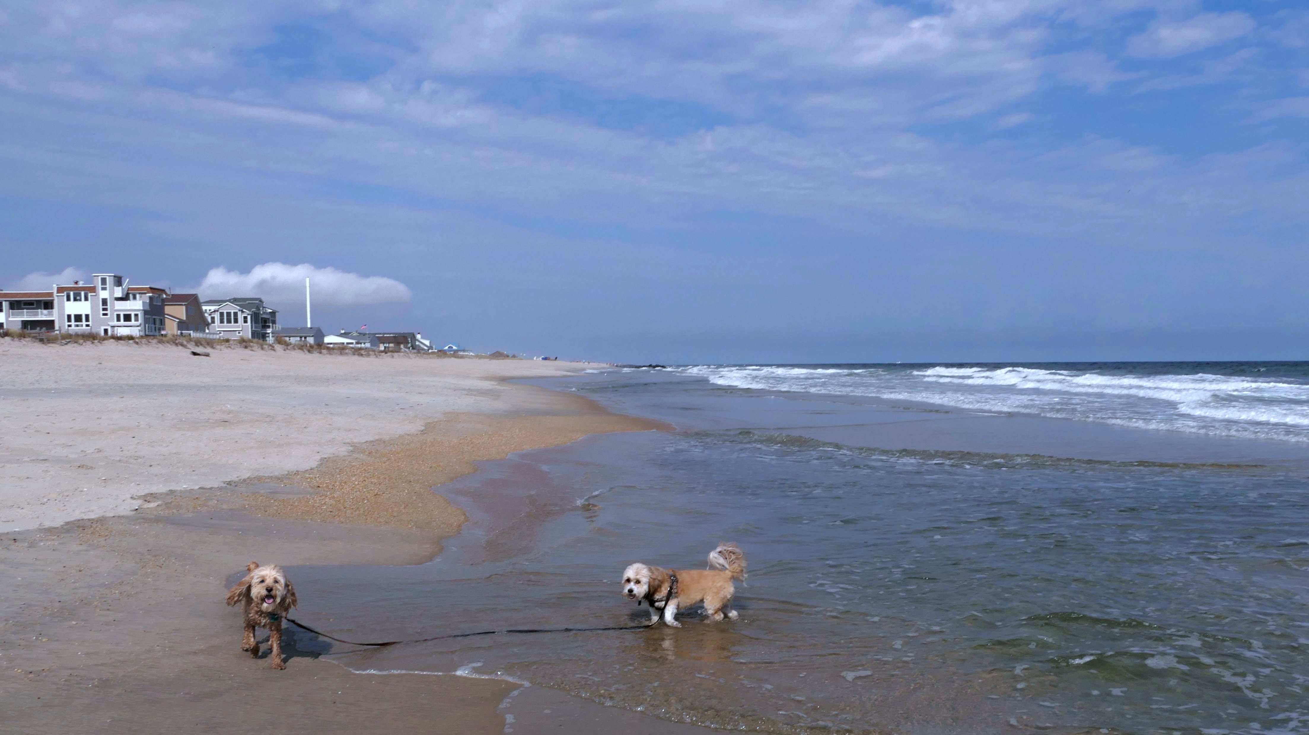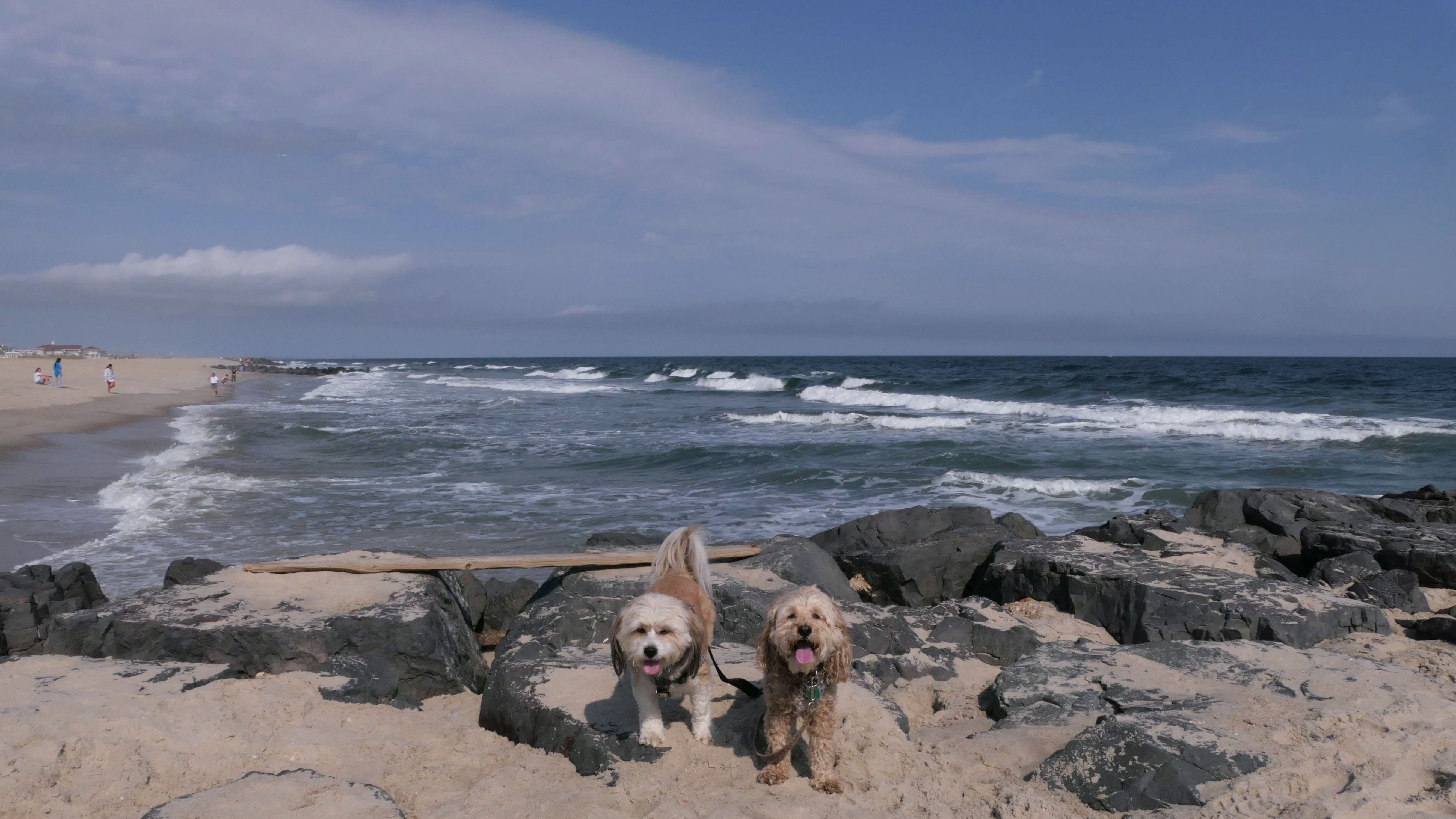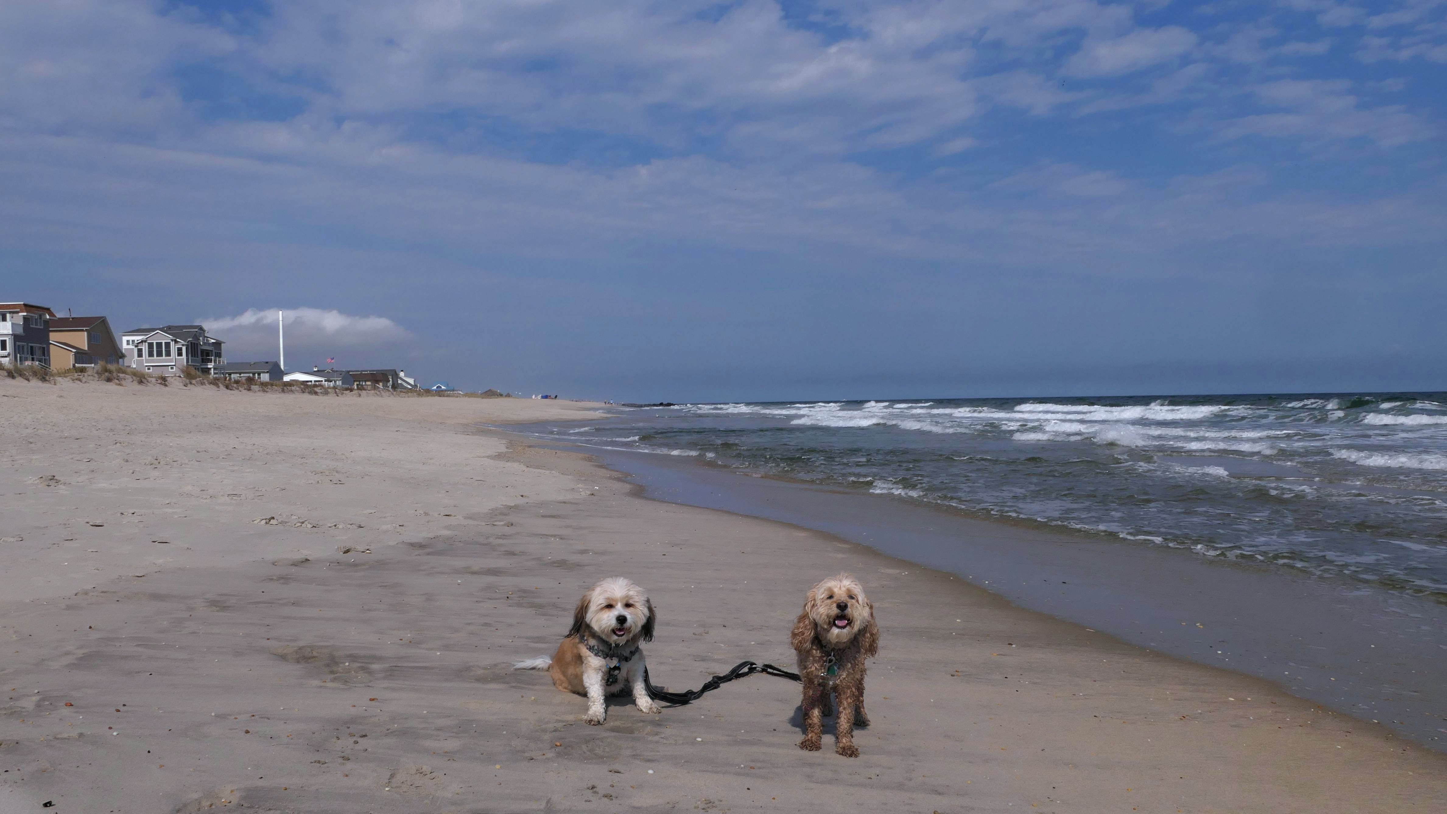 I just don't want to give up on summer! We drove 3+ hours for another little taste of summer. It was 45 degrees, cloudy and raining in Connecticut when we left the house, but 73 degrees, warm and mostly sunny at this beach on the Jersey Shore. It's a pretty nice beach too. Dogs are allowed in the off-season, from September 16th to March 14th. Parking is free in the off-season as well. We parked at the main lot and walked about a mile and back in both directions, walking a bit over four miles total. I was surprised to see the palm trees. They appear to be part of Surfrider Beach Club. Do they plant new ones every year? That, along with the haze in the air, certainly added to the summer feel. It was wonderful to have another day like this, especially considering how miserable the weather was in Connecticut.