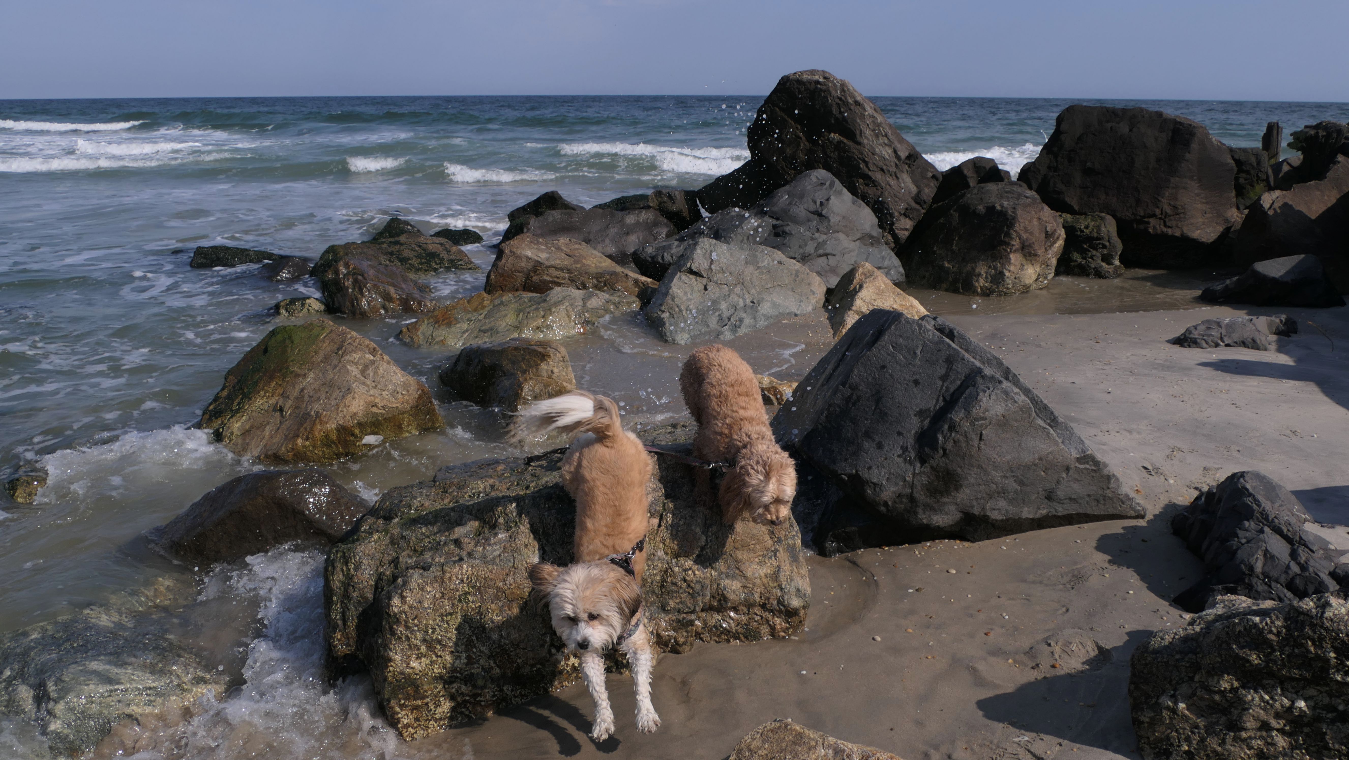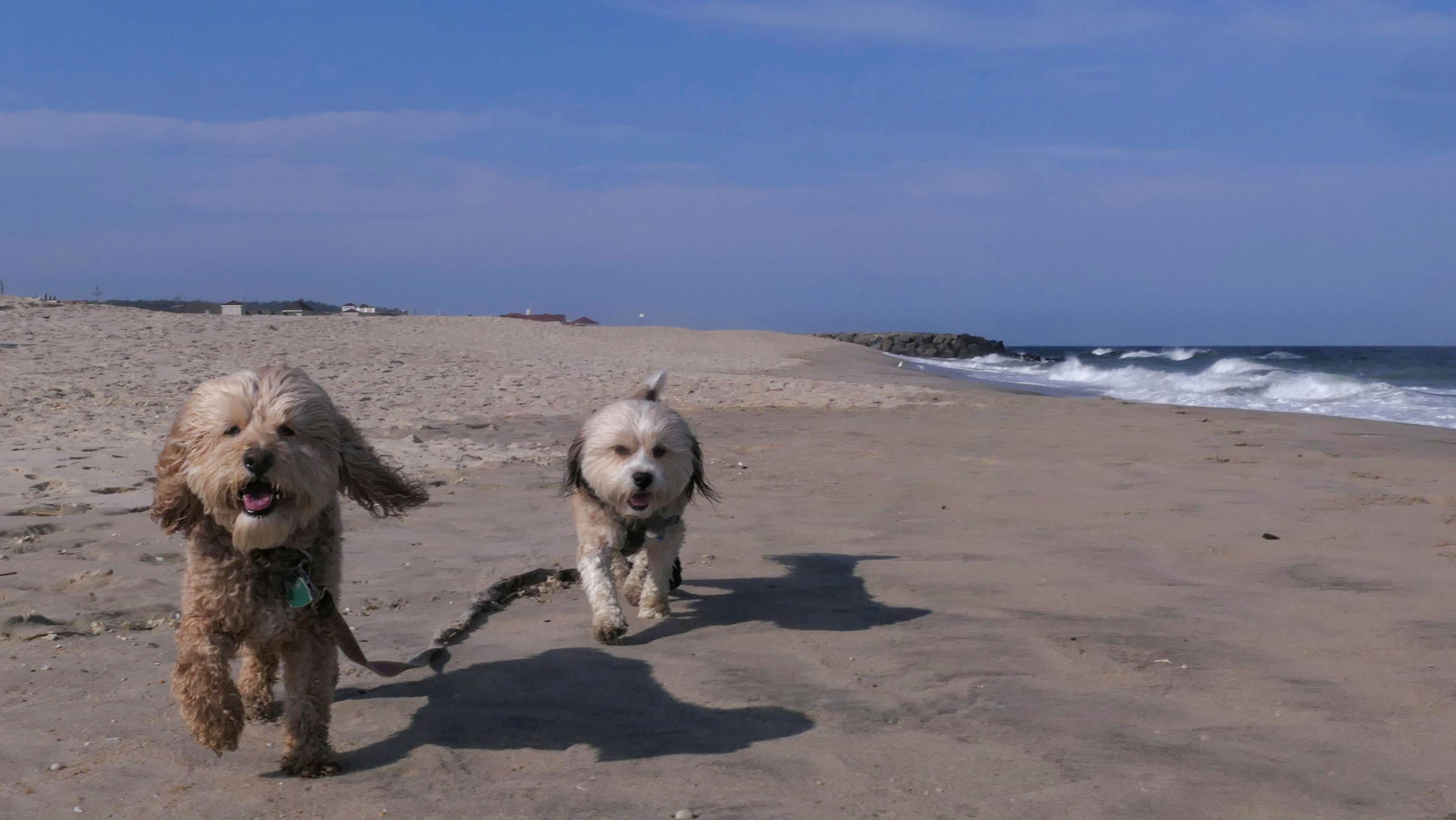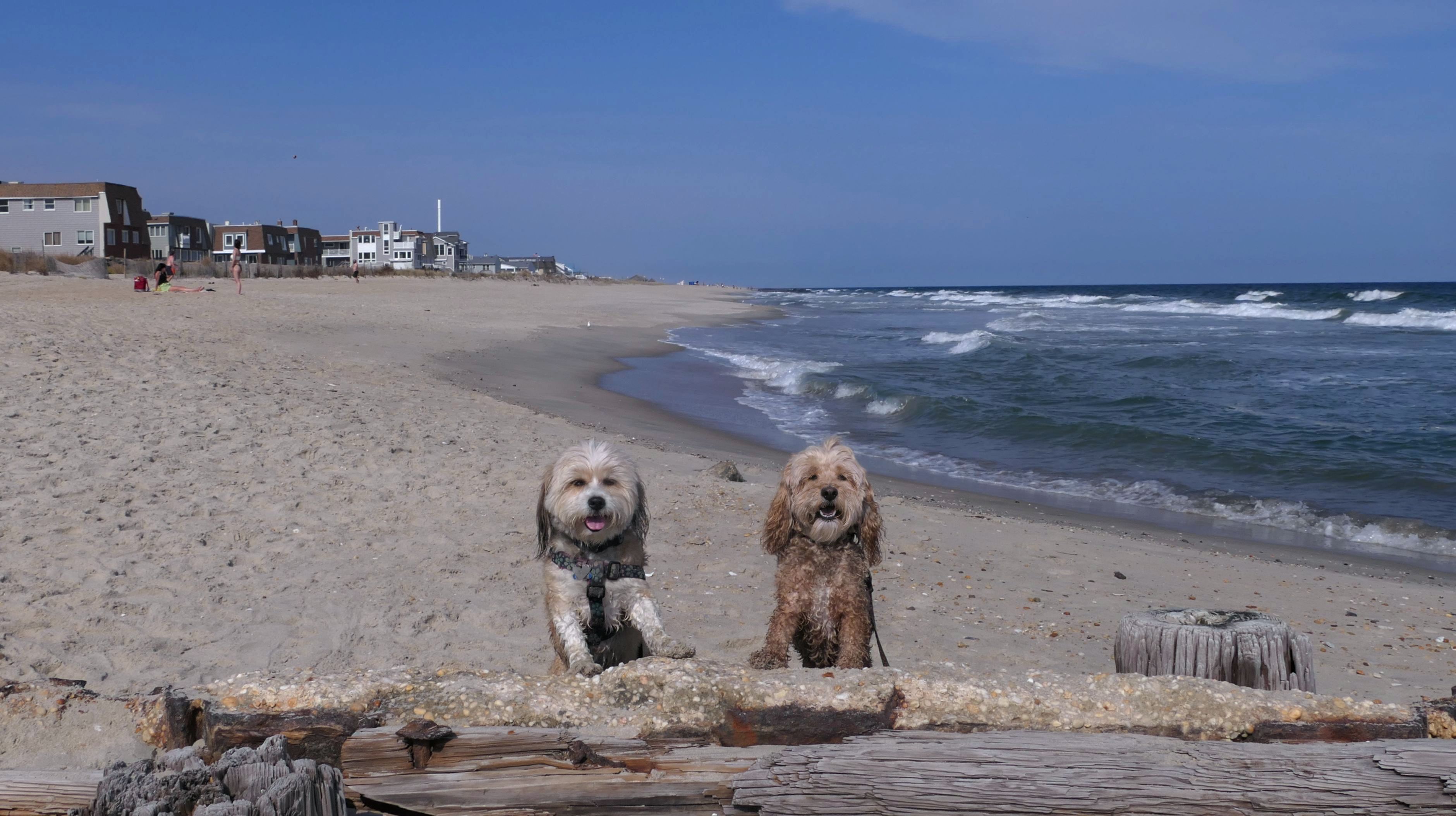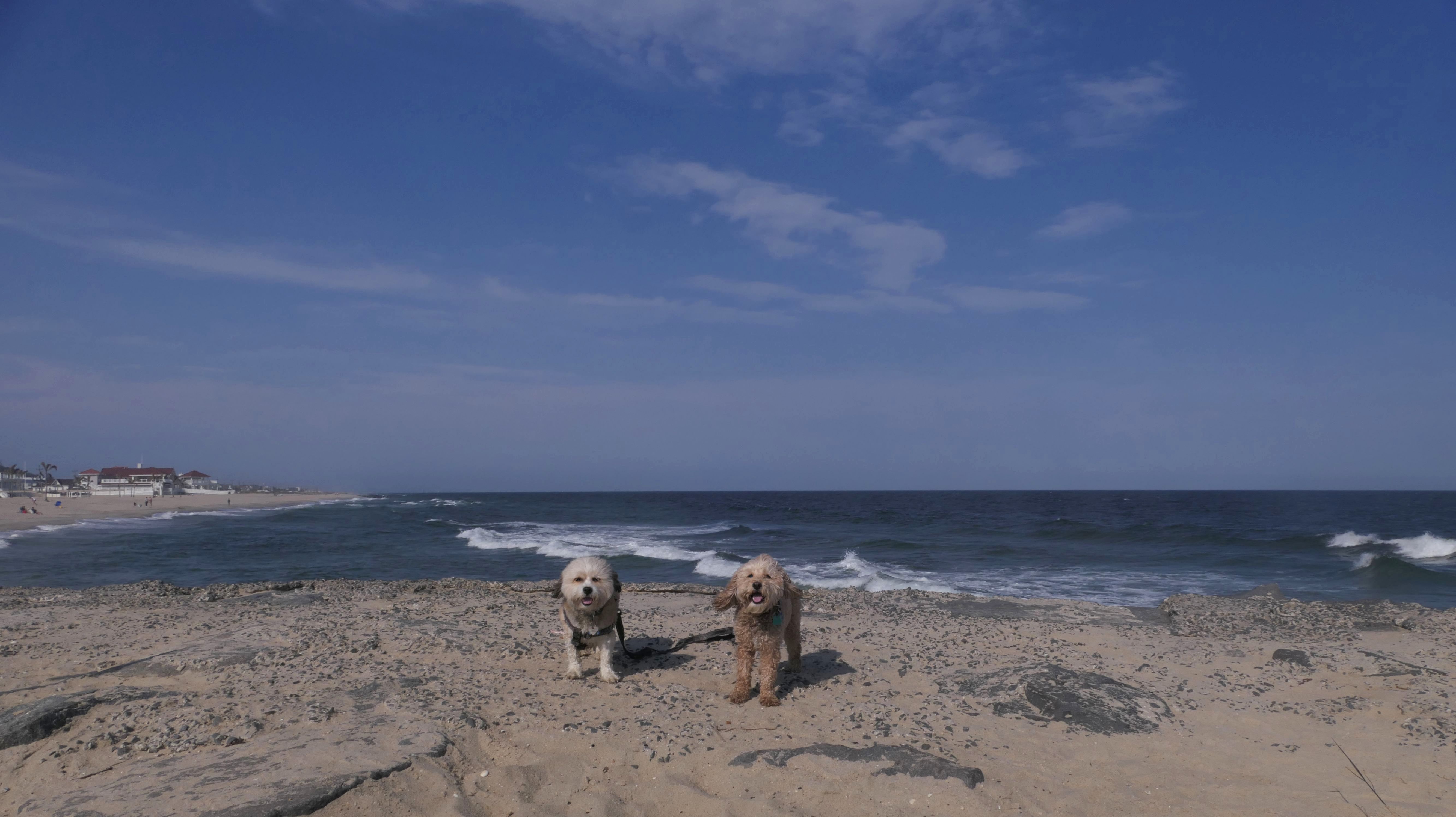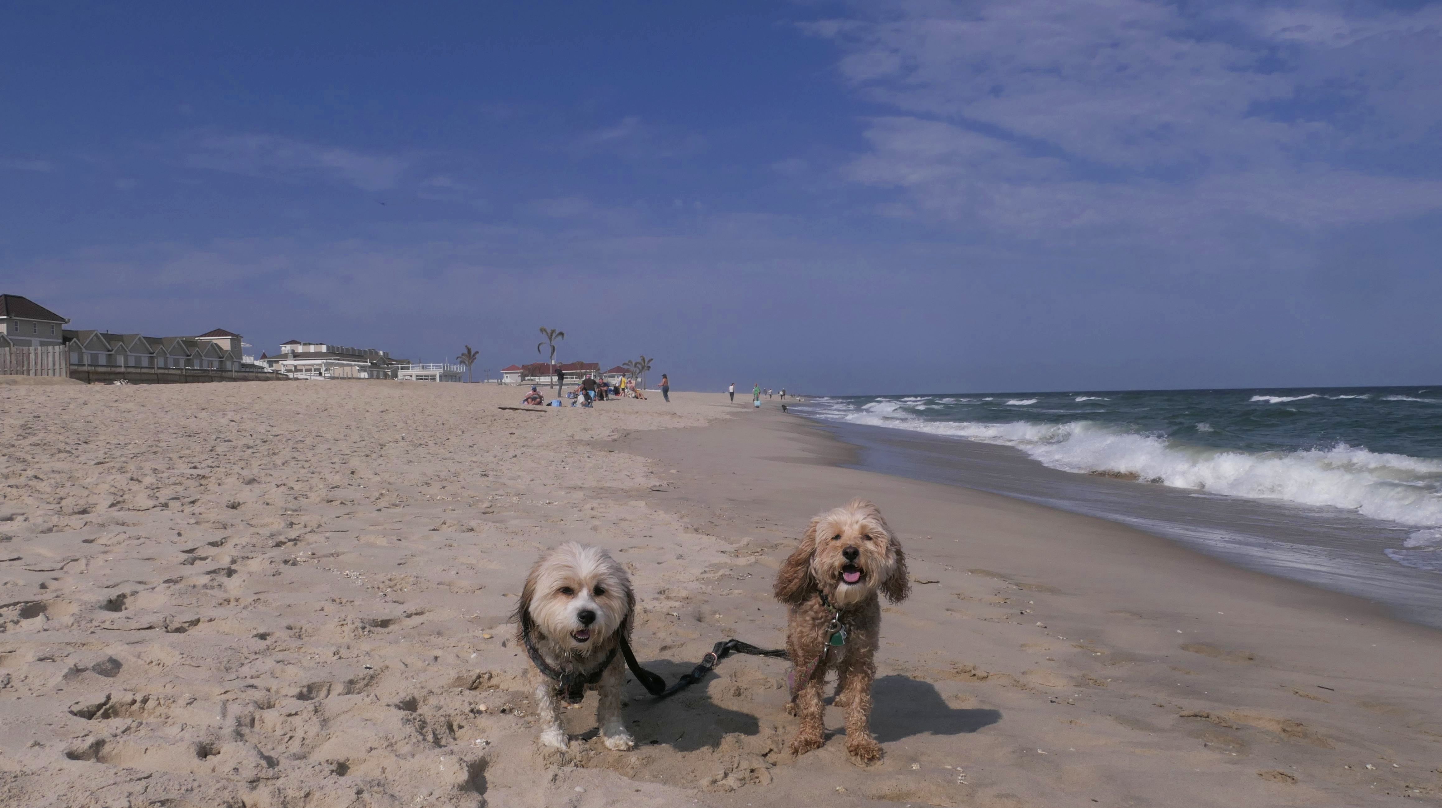 I just don't want to give up on summer! We drove 3+ hours for another little taste of summer. It was 45 degrees, cloudy and raining in Connecticut when we left the house, but 73 degrees, warm and mostly sunny at this beach on the Jersey Shore. It's a pretty nice beach too. Dogs are allowed in the off-season, from September 16th to March 14th. Parking is free in the off-season as well. We parked at the main lot and walked about a mile and back in both directions, walking a bit over four miles total. I was surprised to see the palm trees. They appear to be part of Surfrider Beach Club. Do they plant new ones every year? That, along with the haze in the air, certainly added to the summer feel. It was wonderful to have another day like this, especially considering how miserable the weather was in Connecticut.