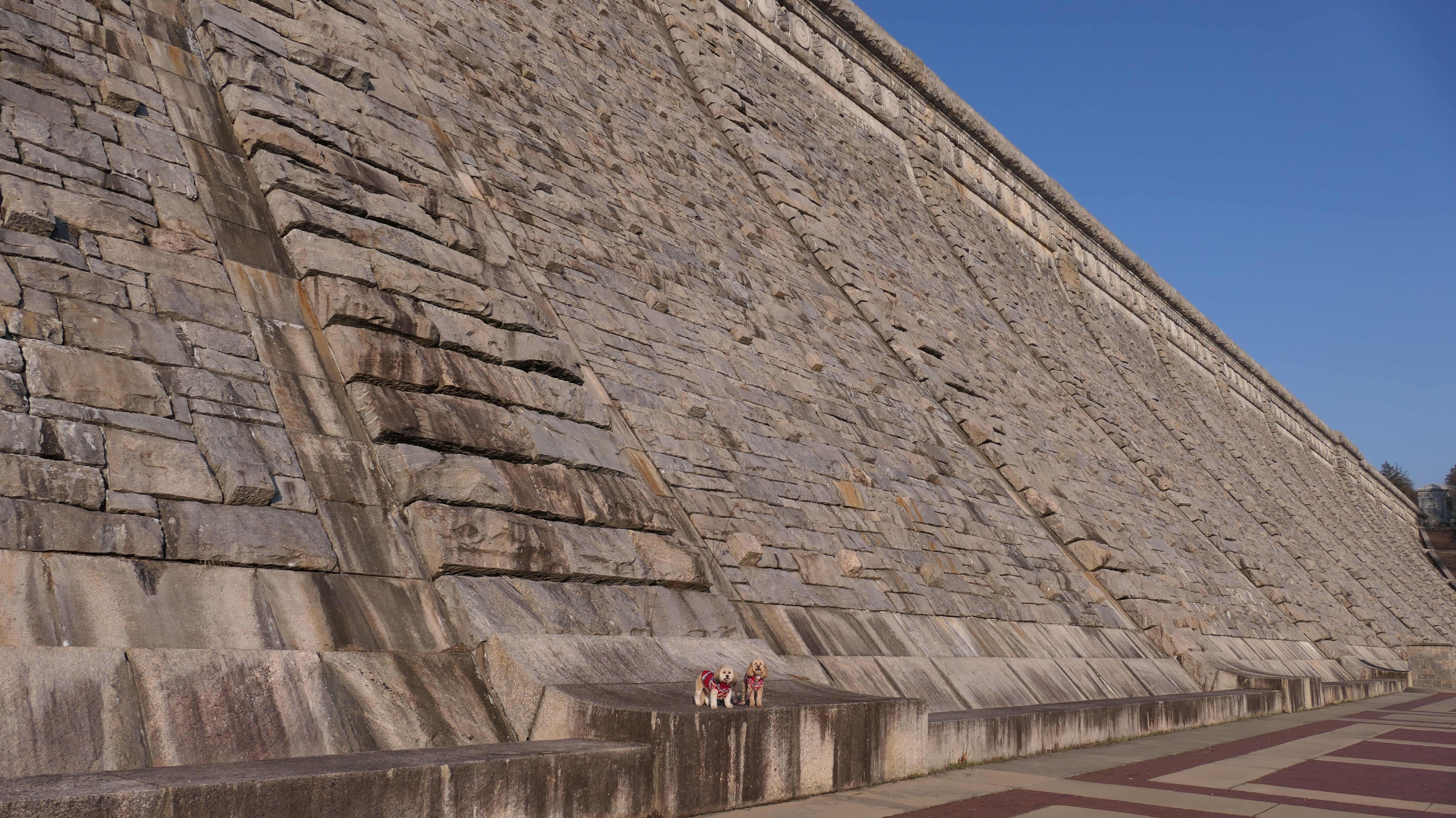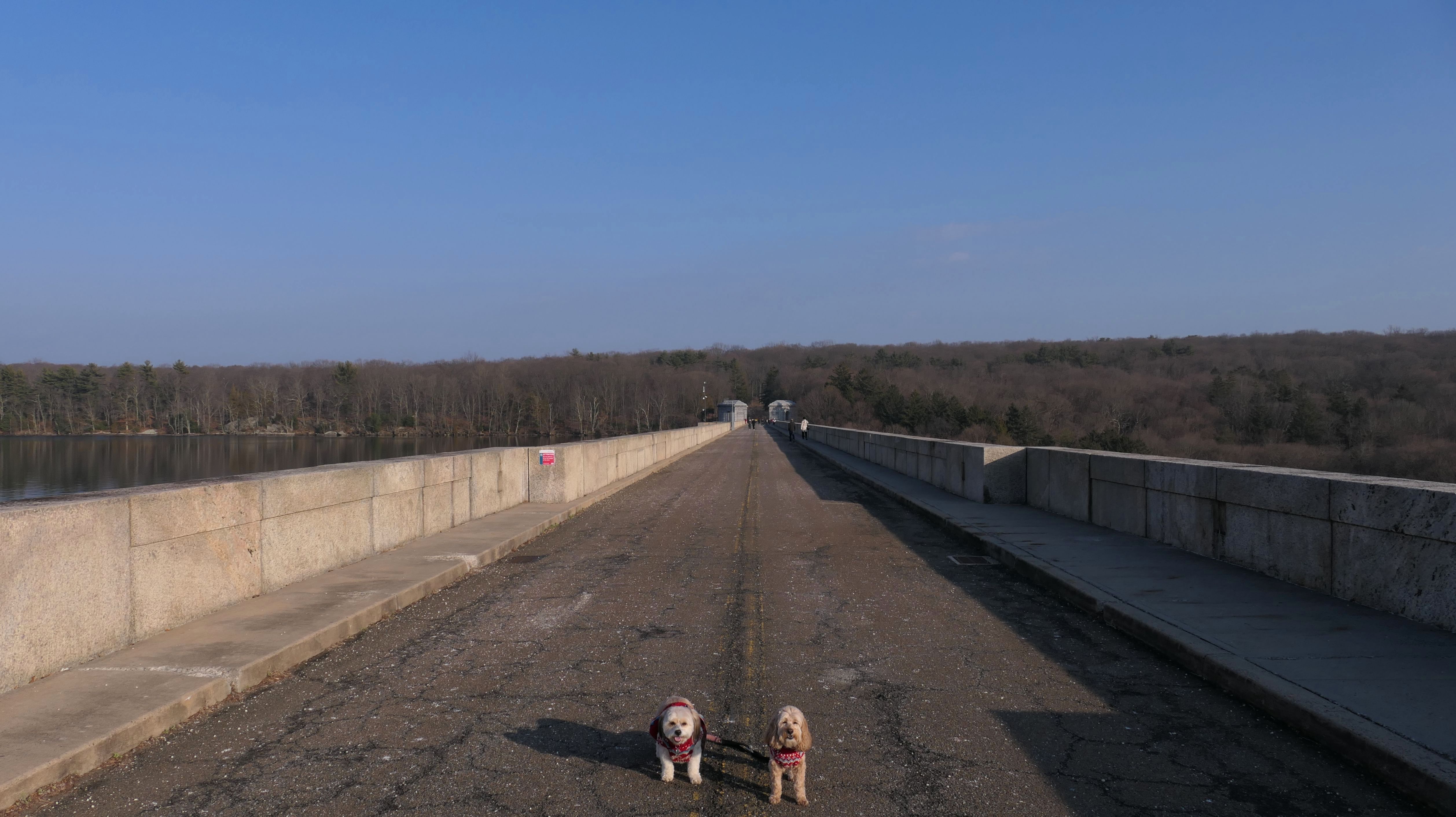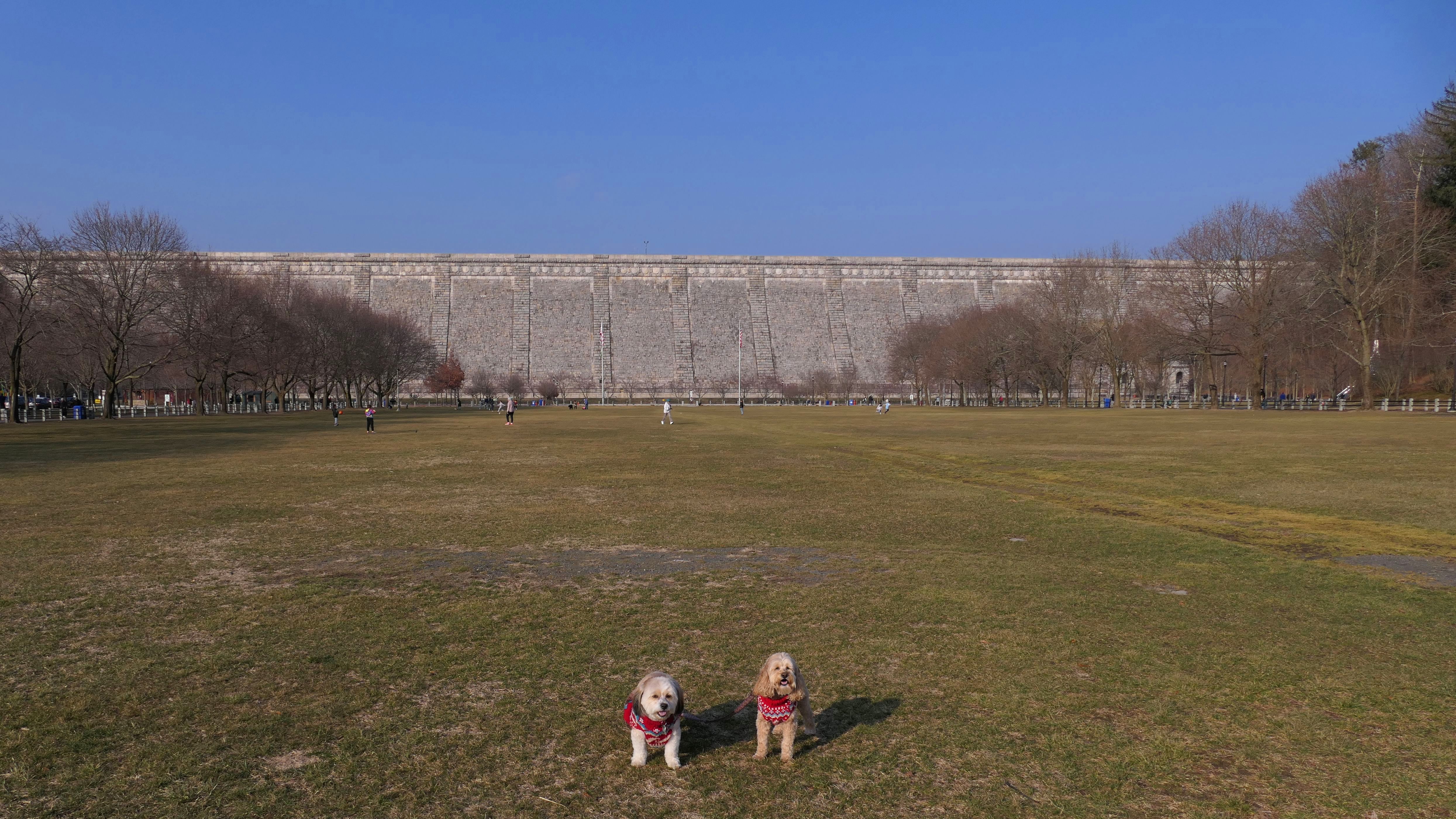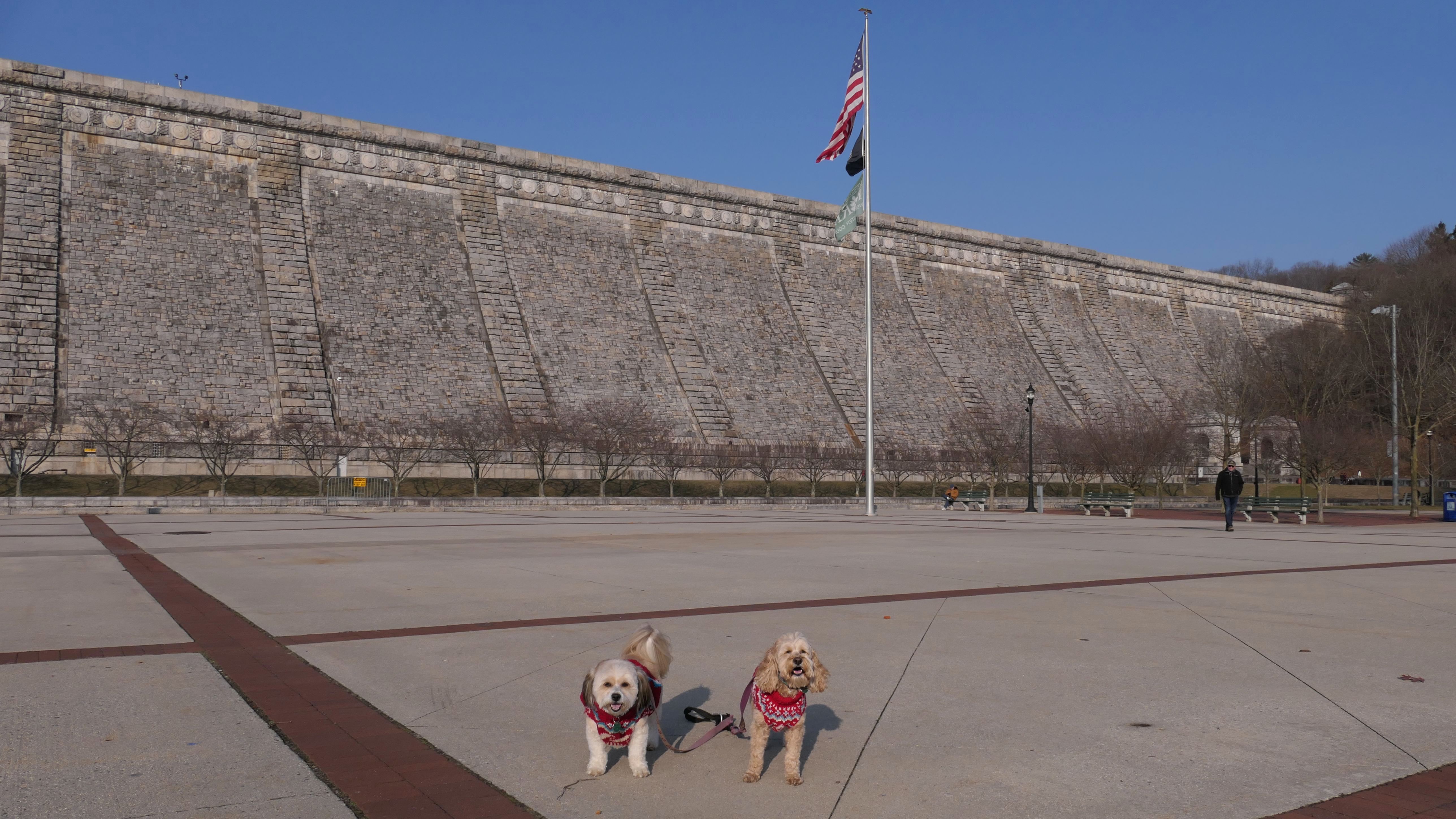 We hadn't been on an adventure in six days. Our wonderful February weather this year finally took a turn of the worse, and it was rainy and cold all week. It was warmer and sunnier in Westchester County New York, so we headed to this place. This is a really neat park that straddles the town line between the Valhalla section of Mount Pleasant and North Castle. There is an open grass area, and a promenade of sorts, in front of the very large dam. The west side of the park features a playground, while the east side of the park includes "The Rising", a 9/11 monument that honors the victims from Westchester County. Obviously, the main feature of the park is the dam. There are stairways on both sides of the dam, so we climbed to the top. There is an old road that runs right across the top of the dam that is closed to vehicular traffic. It is now just a pedestrian walk way. There are nice views from the top of the dam. I have to admit, climbing the stairs was a good workout. The climb is over 20 flights of the stairs. The dogs didn't really seem to have much issue with the climb. We did this after walking four miles on the Bronx River Pathway, that starts at this park. Needless to say, we made up for not being able to get out of the house in six days. Below are the pictures from the Mount Pleasant section of the park. Visit the North Castle page for pictures from that section.