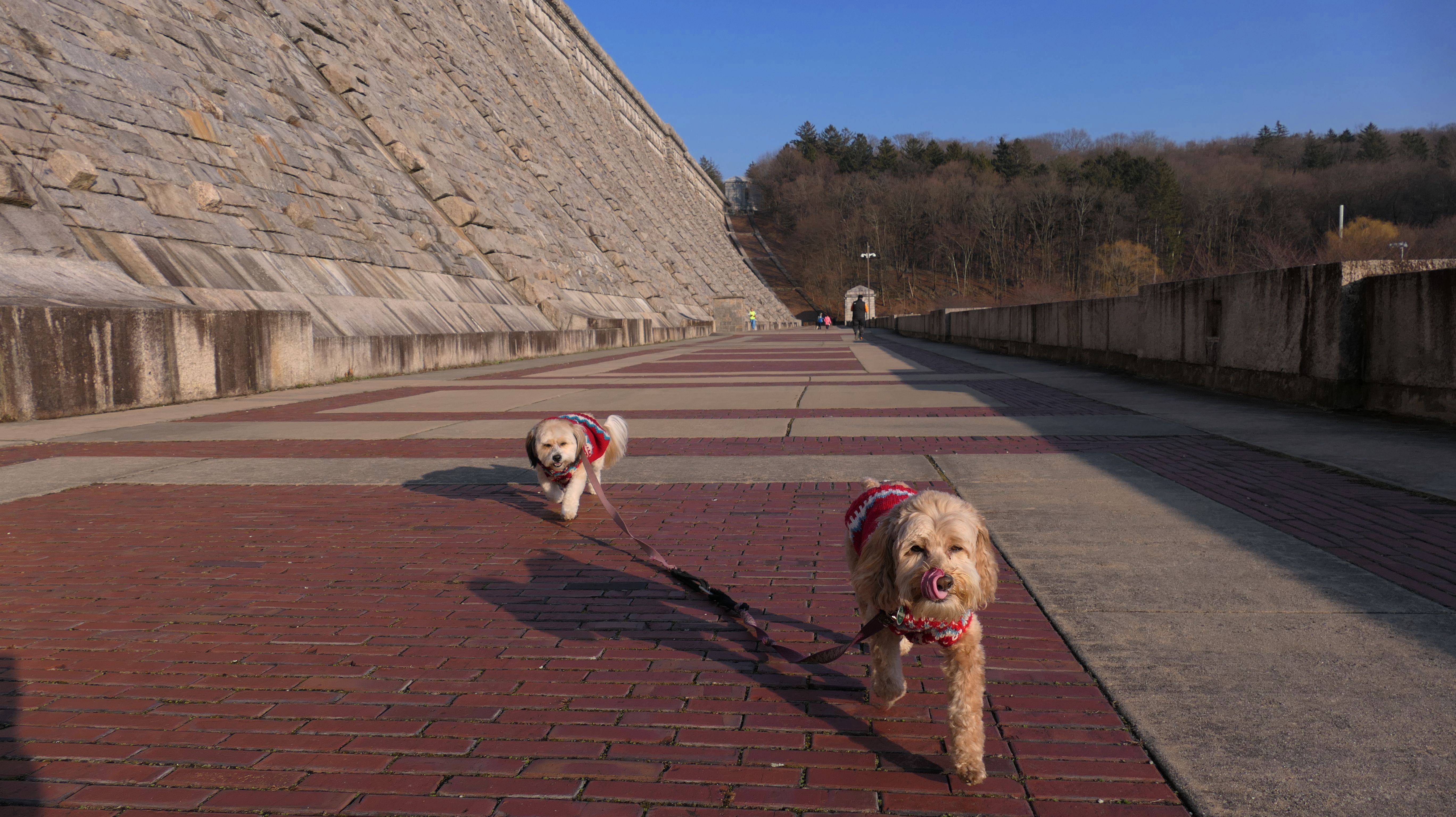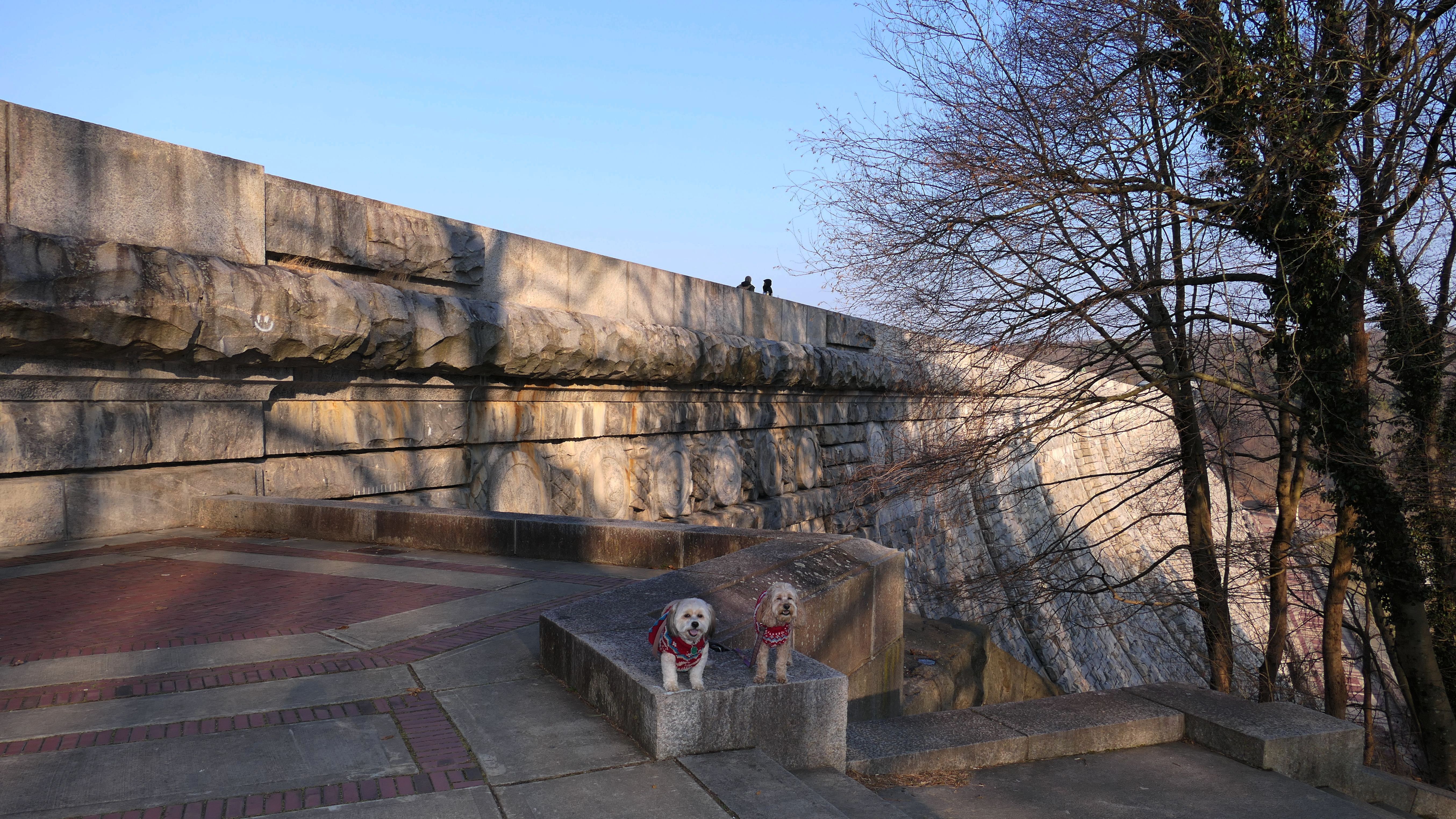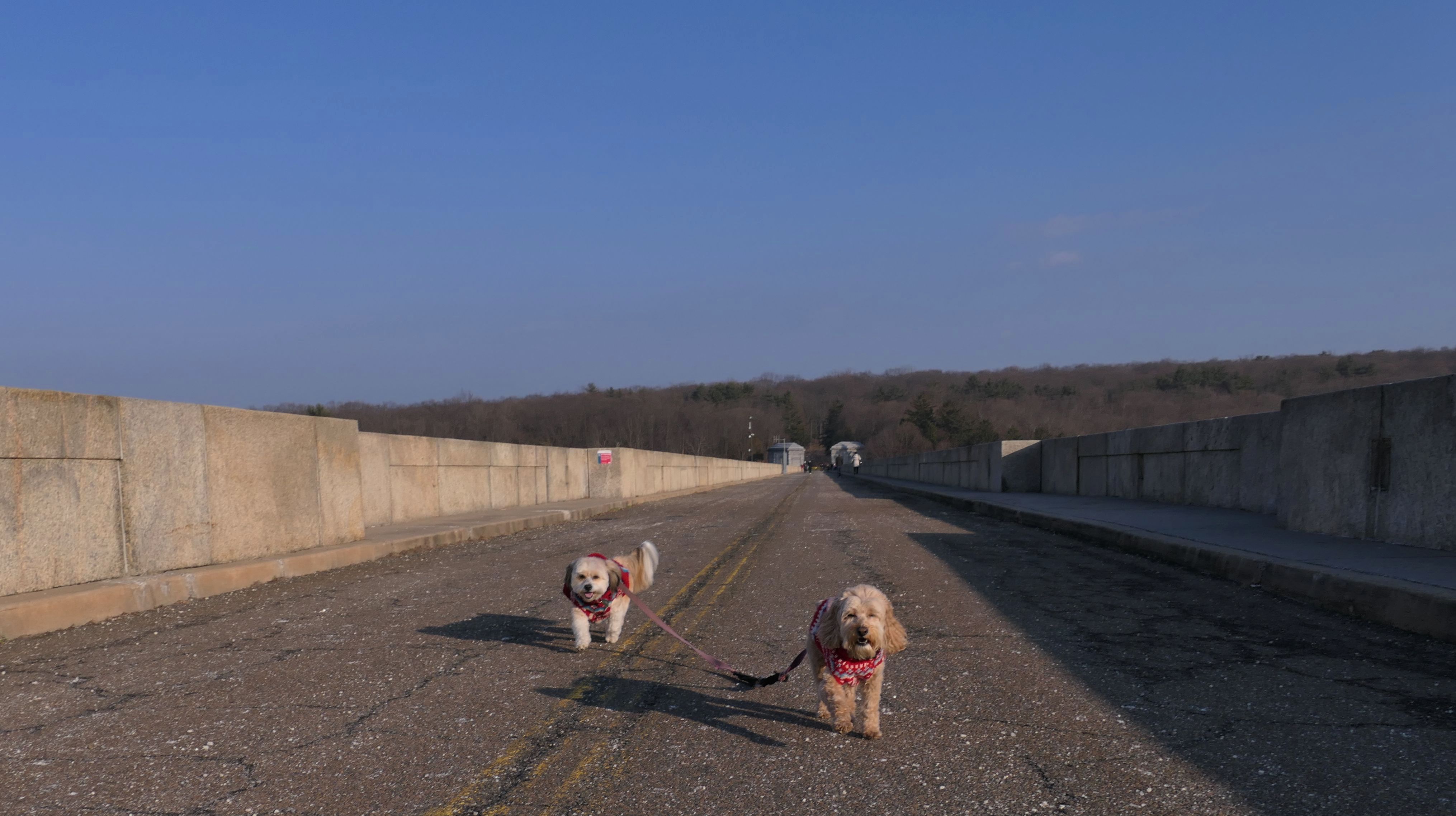 We hadn't been on an adventure in six days. Our wonderful February weather this year finally took a turn of the worse, and it was rainy and cold all week. It was warmer and sunnier in Westchester County New York, so we headed to this place. This is a really neat park that straddles the town line between the Valhalla section of Mount Pleasant and North Castle. There is an open grass area, and a promenade of sorts, in front of the very large dam. The west side of the park features a playground, while the east side of the park includes "The Rising", a 9/11 monument that honors the victims from Westchester County. Obviously, the main feature of the park is the dam. There are stairways on both sides of the dam, so we climbed to the top. There is an old road that runs right across the top of the dam that is closed to vehicular traffic. It is now just a pedestrian walk way. There are nice views from the top of the dam. I have to admit, climbing the stairs was a good workout. The climb is over 20 flights of the stairs. The dogs didn't really seem to have much issue with the climb. We did this after walking four miles on the Bronx River Pathway, that starts at this park. Needless to say, we made up for not being able to get out of the house in six days. Below are the pictures from the Mount Pleasant section of the park. Visit the North Castle page for pictures from that section.