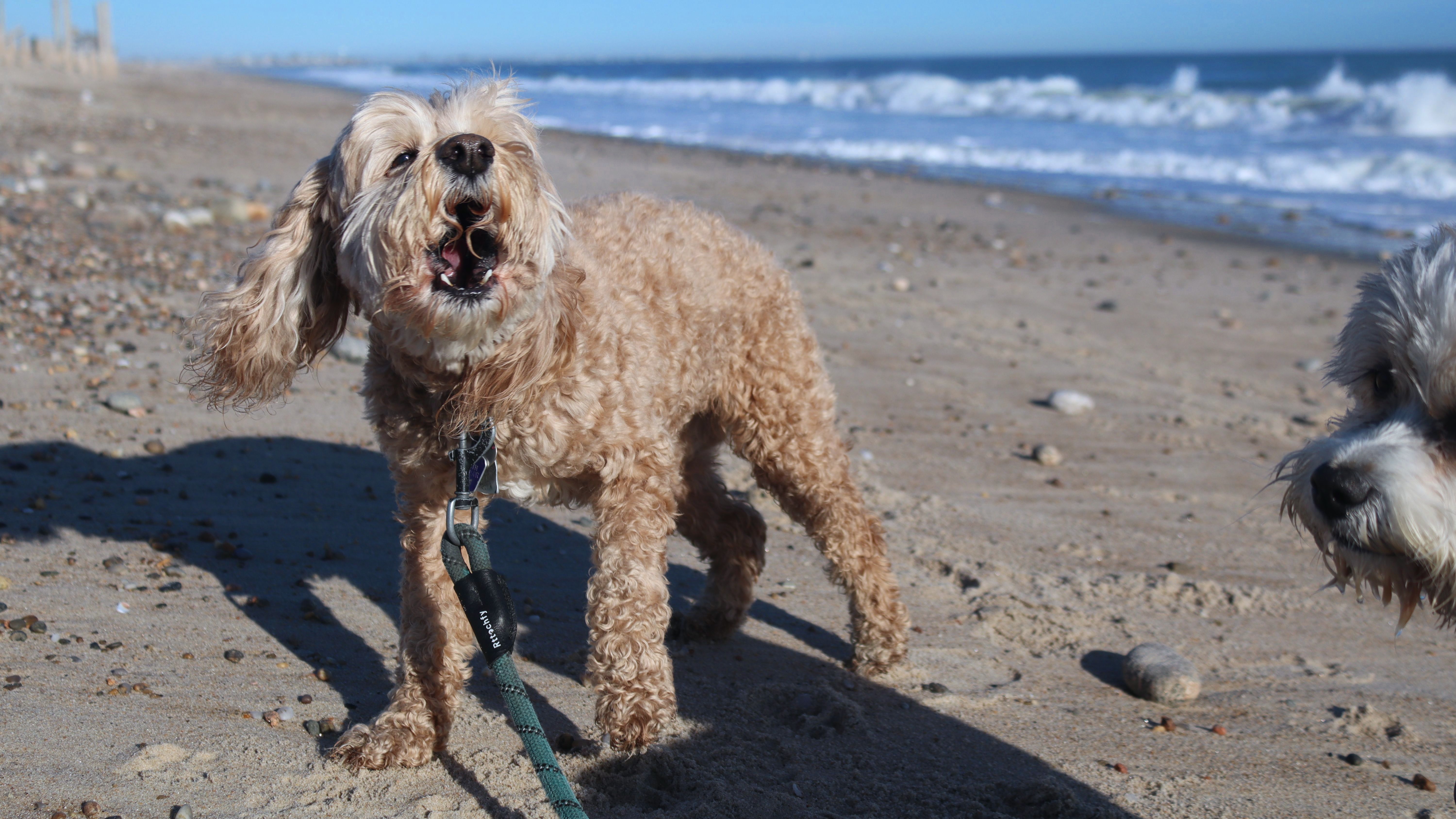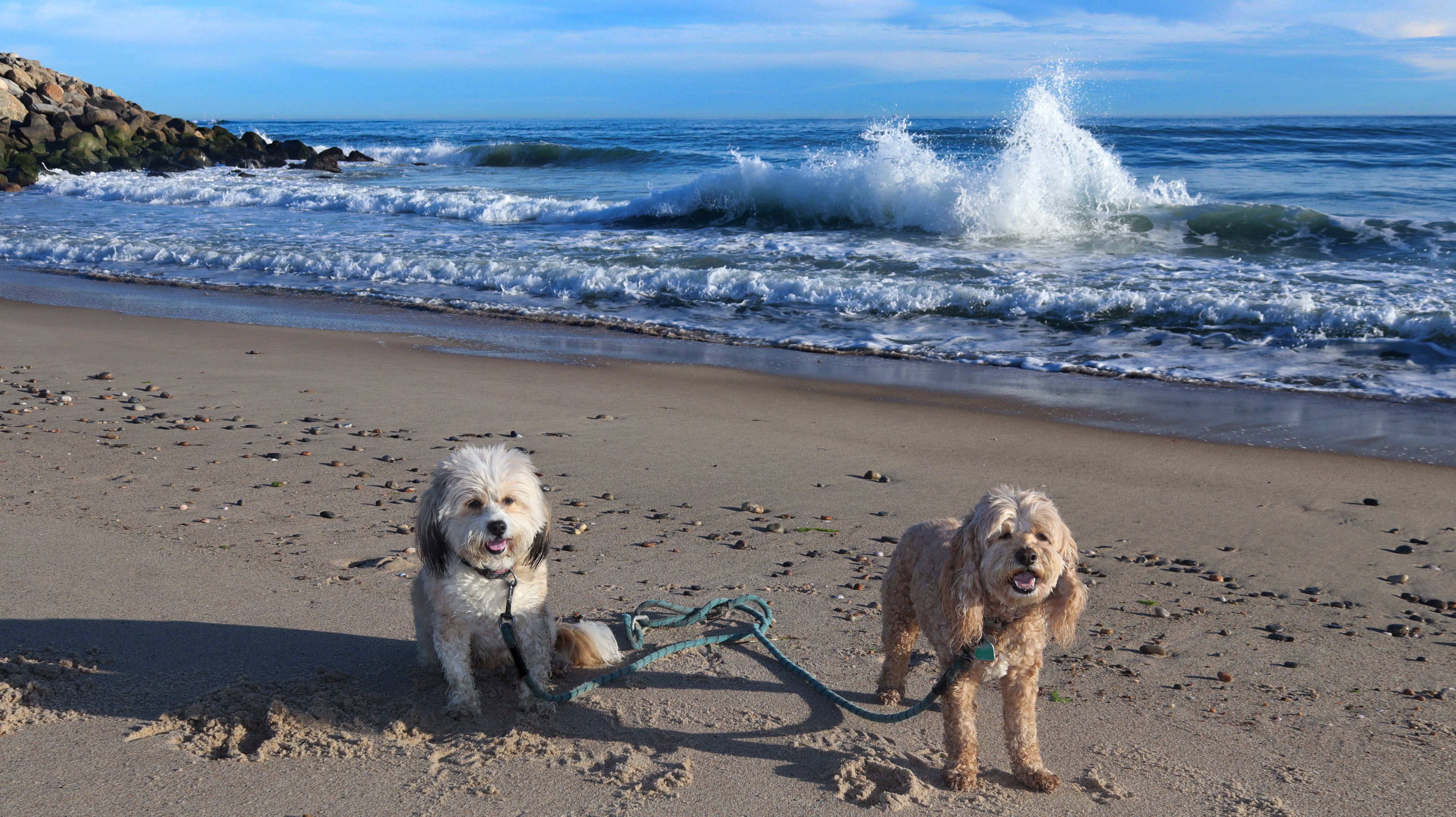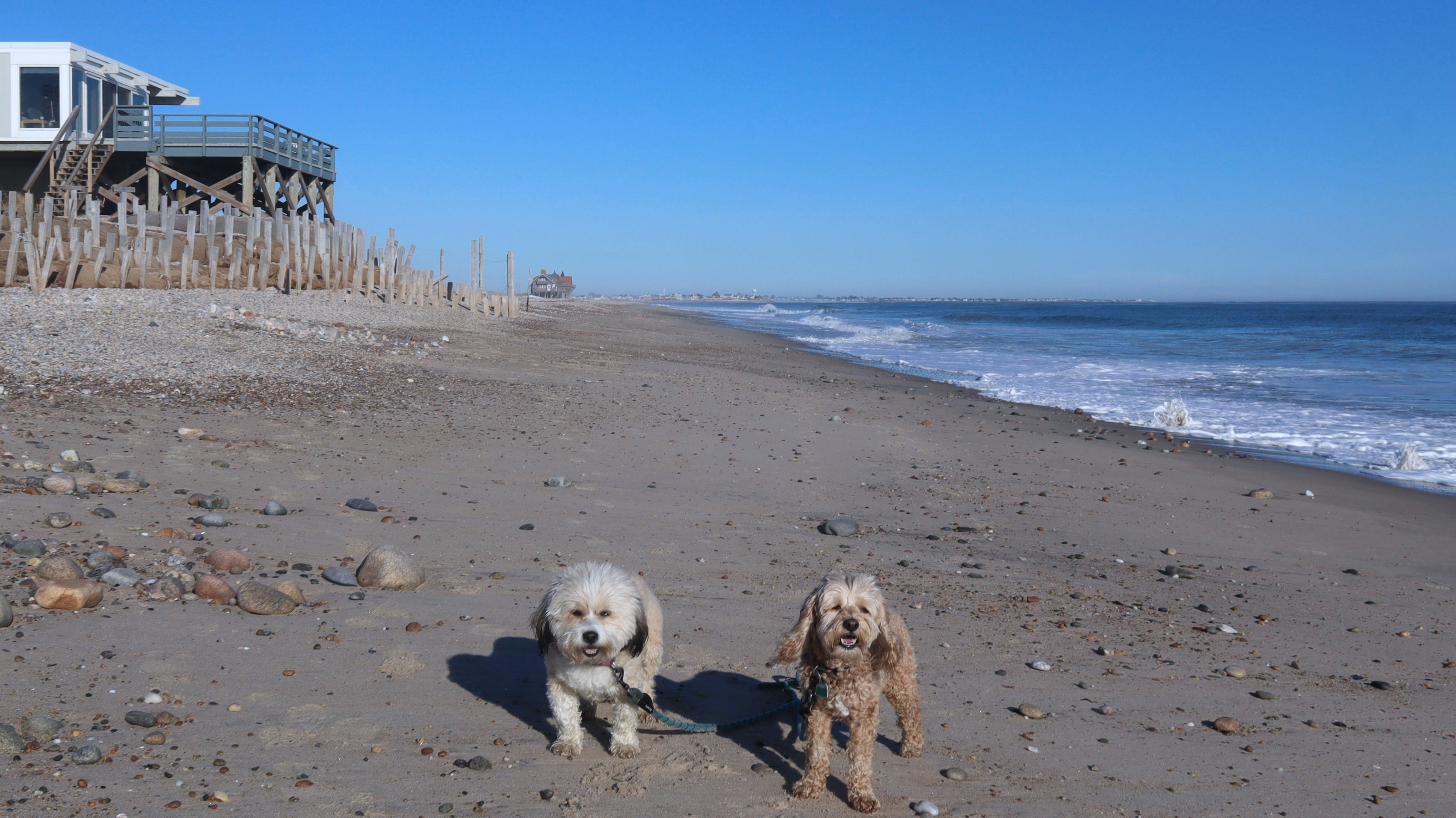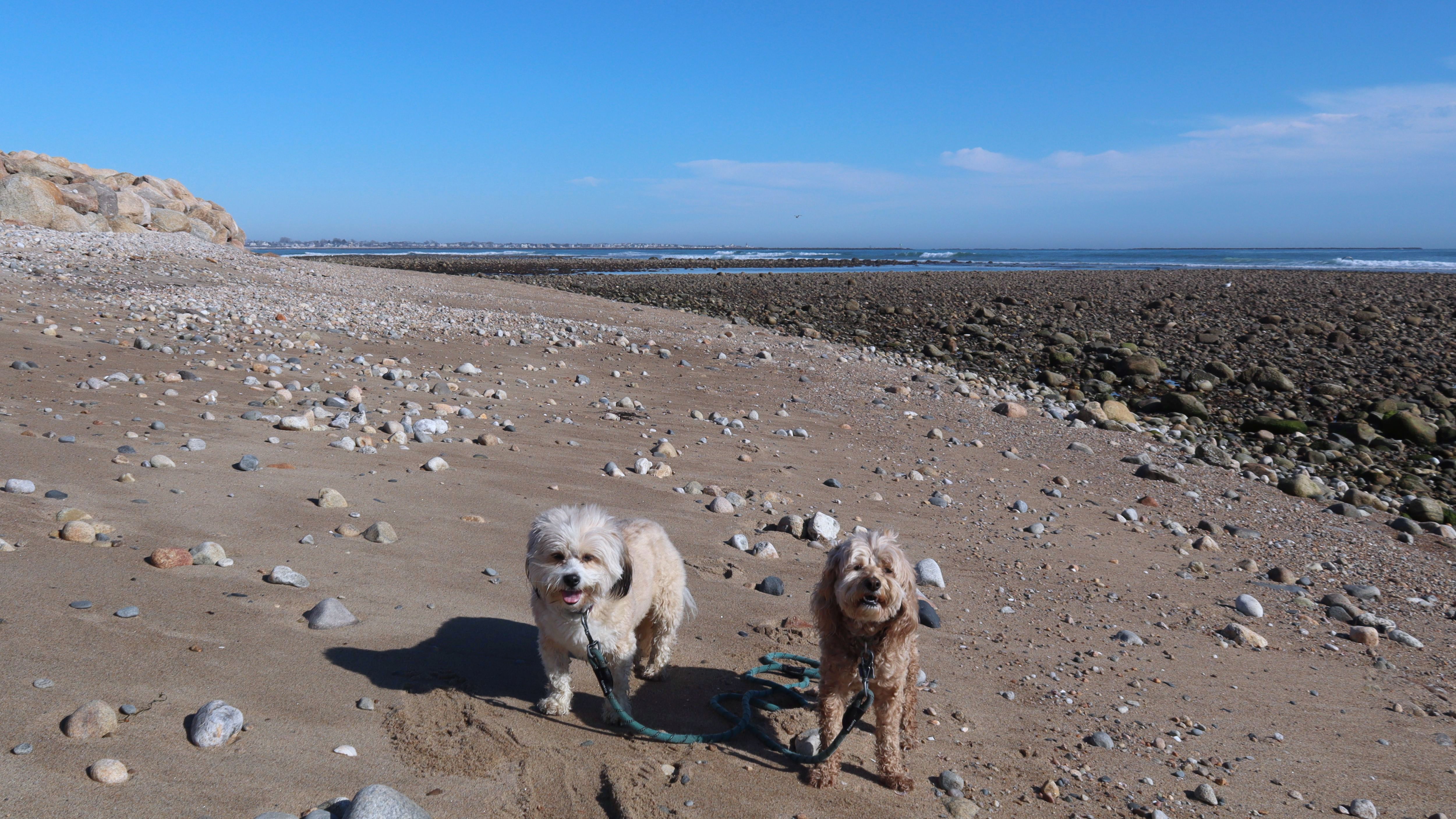 This was our second visit to this "secret" beach. We visited at the end of November last time, but this time it was a hot summer day in June! We stopped here while walking back to our car parked at Deep Hole, returning from the Ocean Avenue Shoreline Access Point. There's plenty of seaweed and muck at the edge of the beach, so it's not a great spot for the dogs to go into the water. We found a clean area near the rocks, where Mandy and Lexi were able to cool off. This is a neat spot for photos, but not a great beach for swimming or wading.