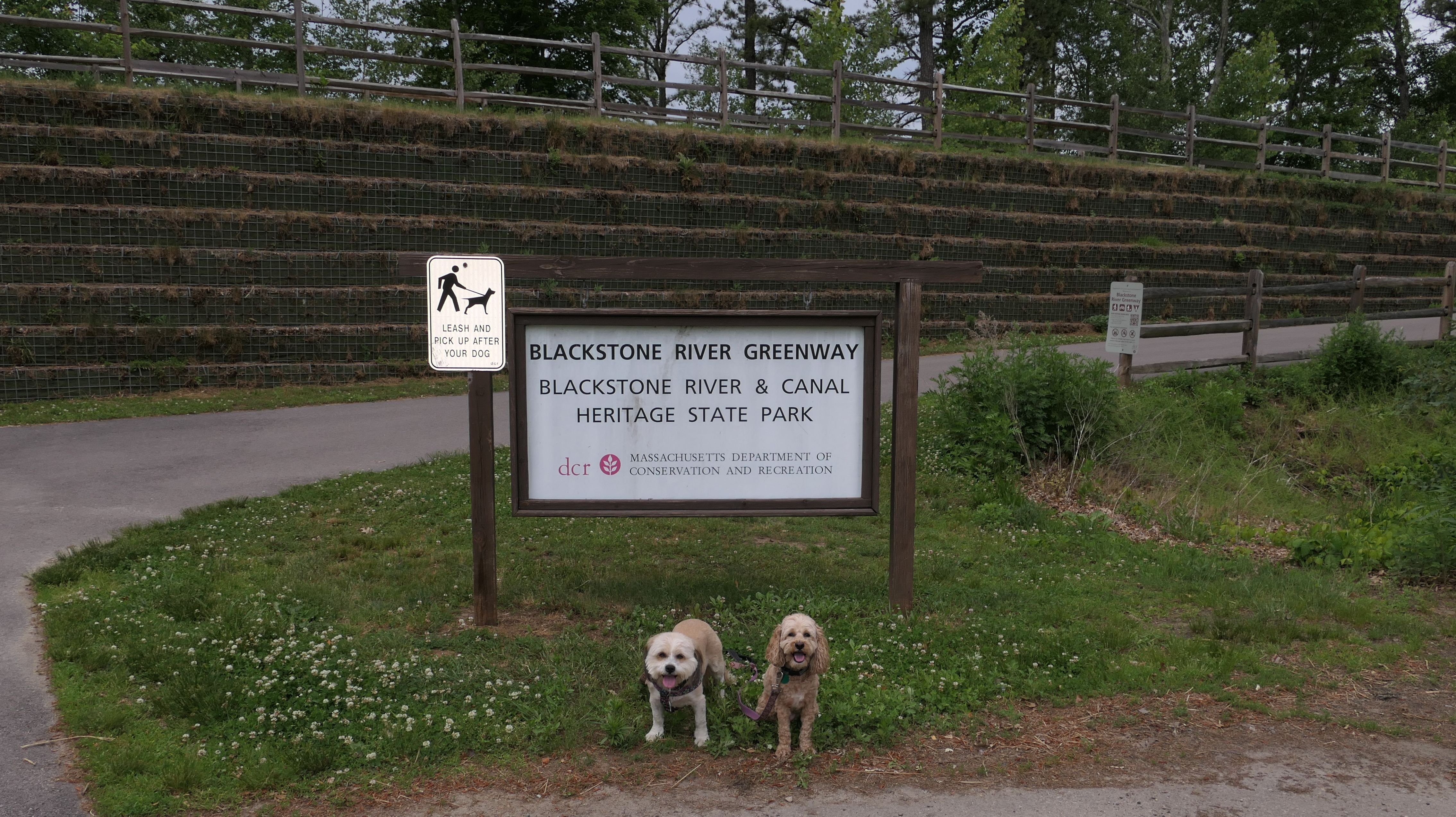 This is a pretty standard paved rail trail. We walked a section between Millville and Uxbridge. We also explored a side trail in Uxbridge that went into the woods. I like the sign behind the dogs in second picture below. Dogs are welcome, but dogs who poop might be arrested!