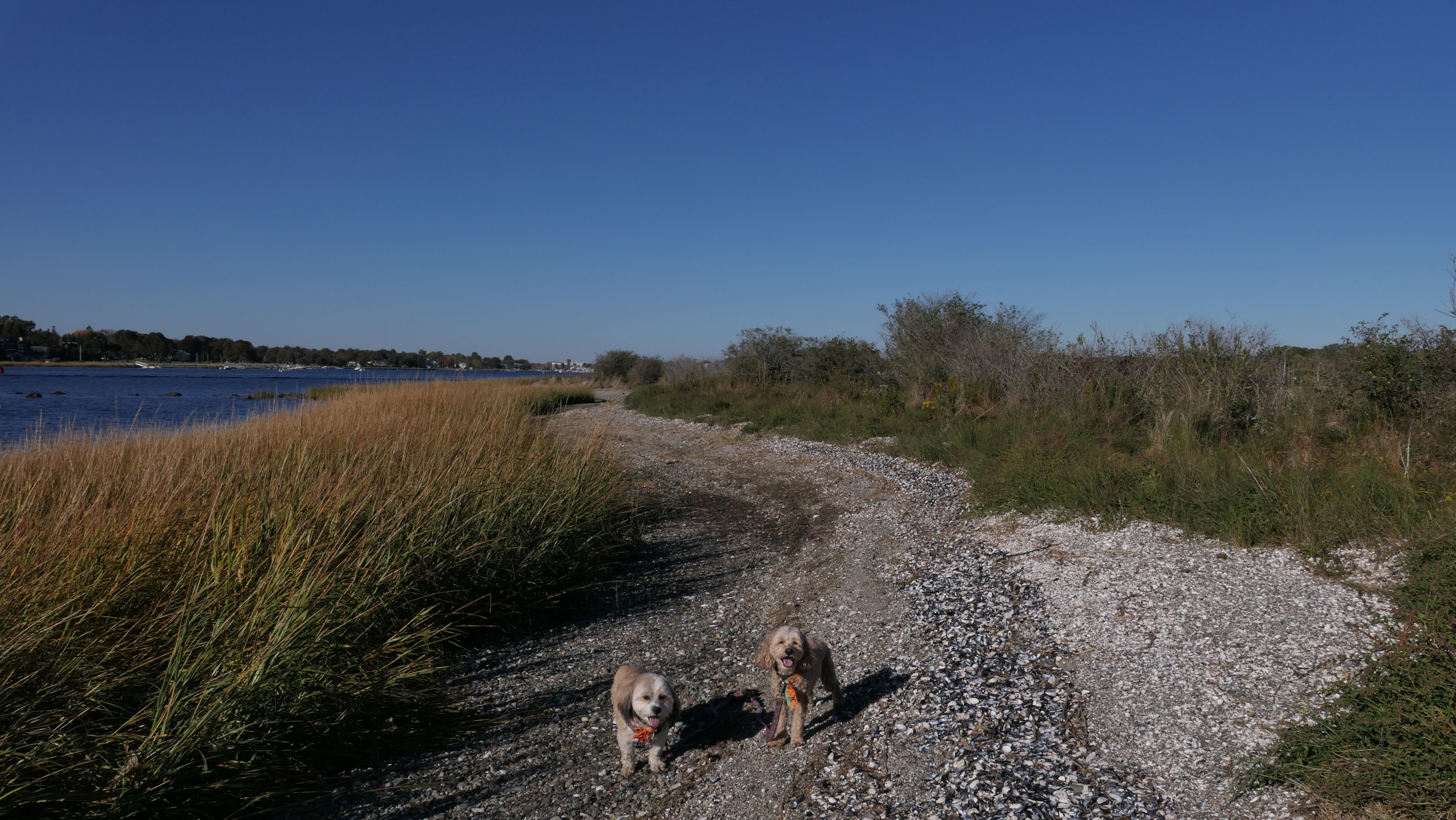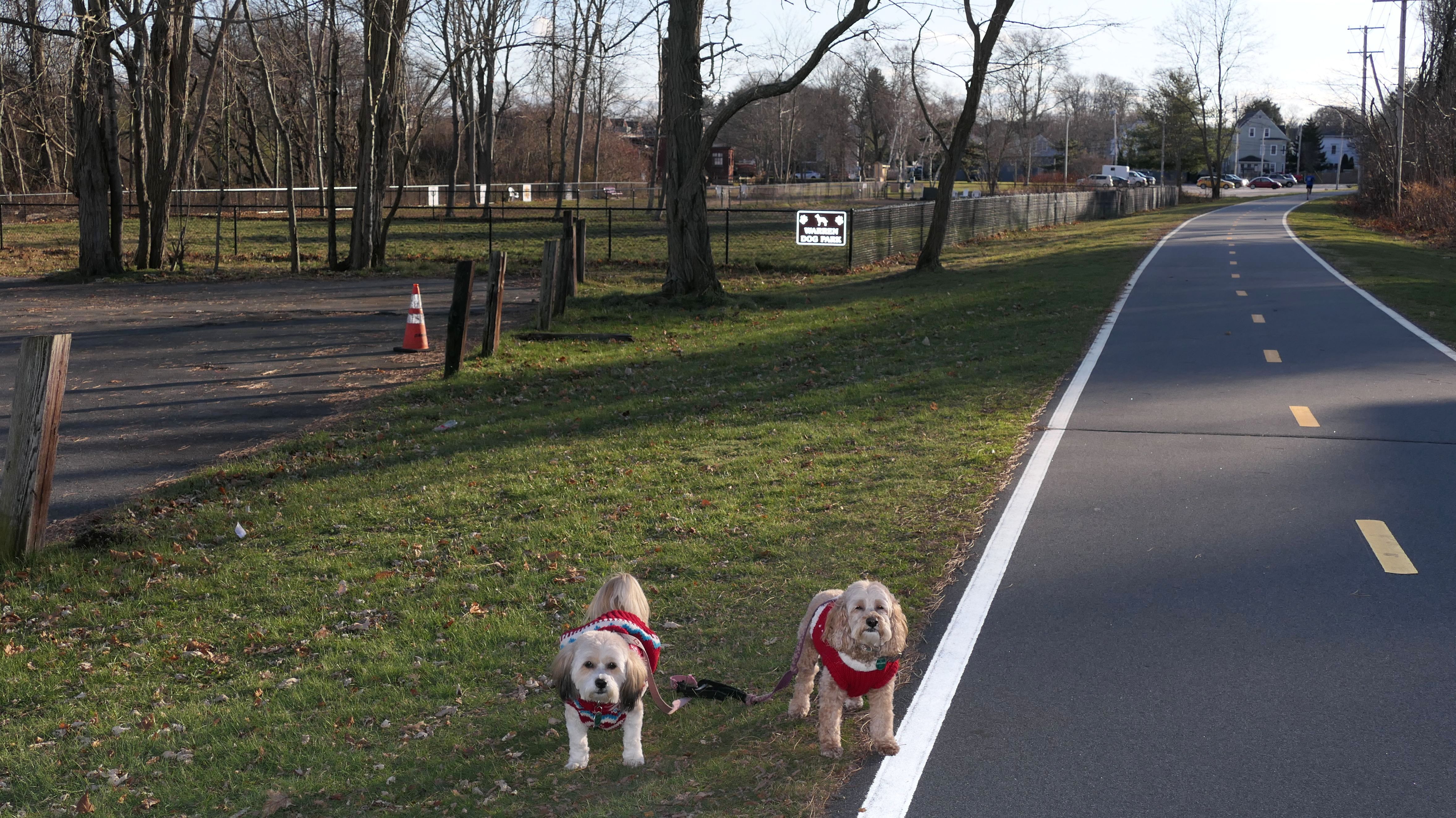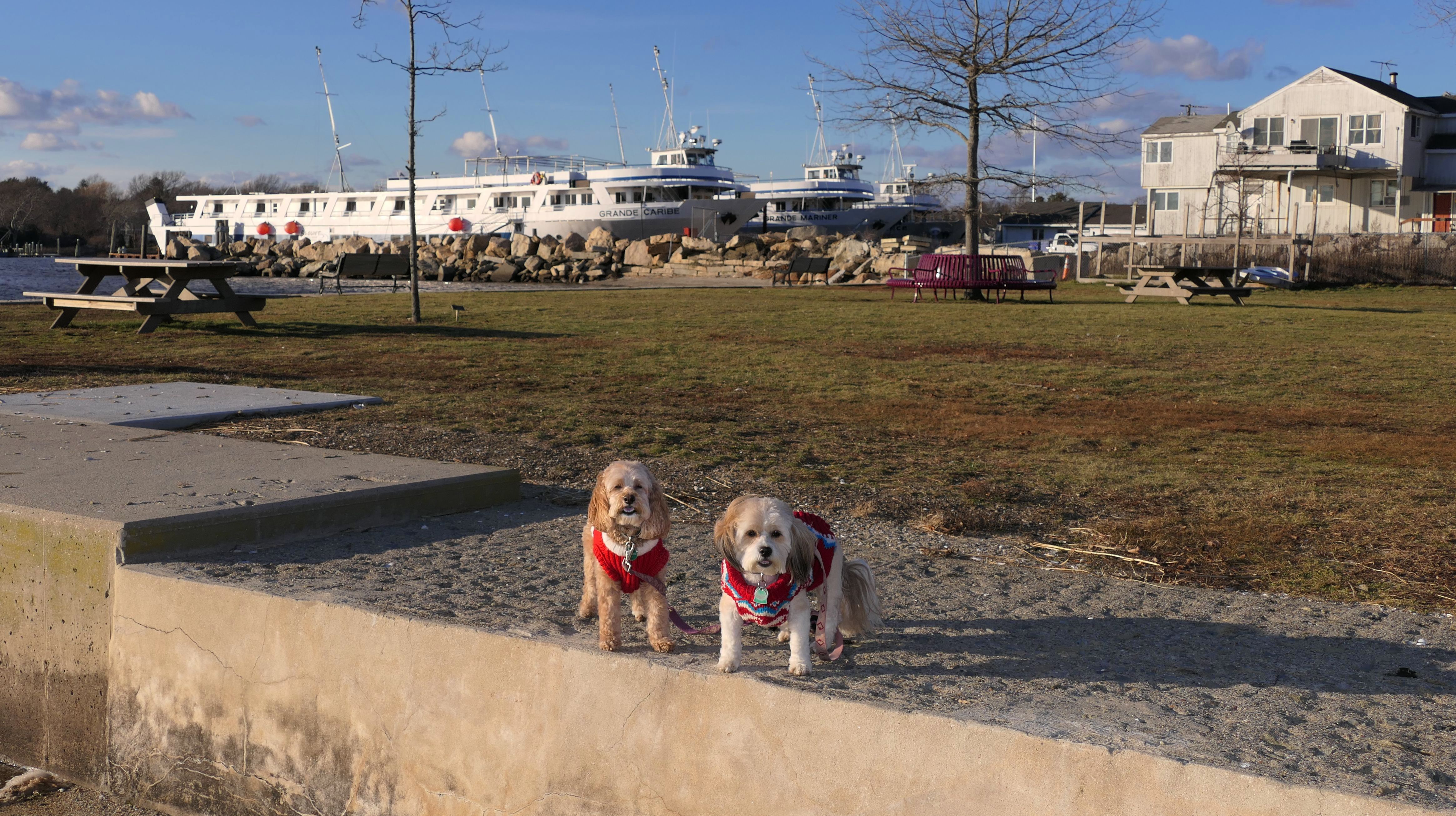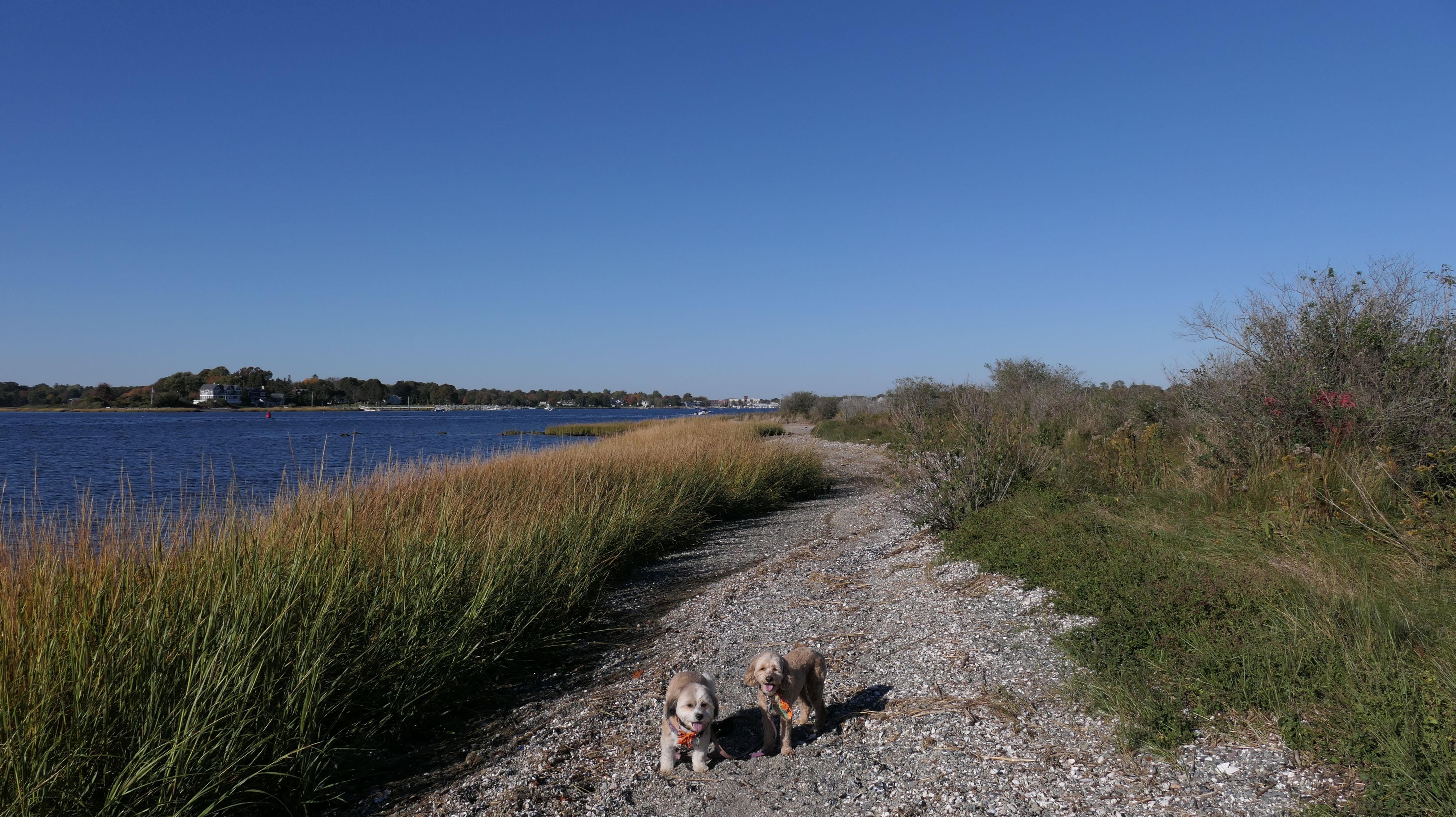 This is a town park with a short paved walking path, athletic fields, and some open space for just sitting on the grass and relaxing. The hill overlooks the town beach, situated at the mouth of the Warren River, as it opens out into Narragansett Bay. We arrived via a connecting trail from the East Bay Bike Path. It was a chilly December day, but there were still sailboats out in the water. Mandy tried to walk out into the water, but I had to stop her because it was too cold for that!