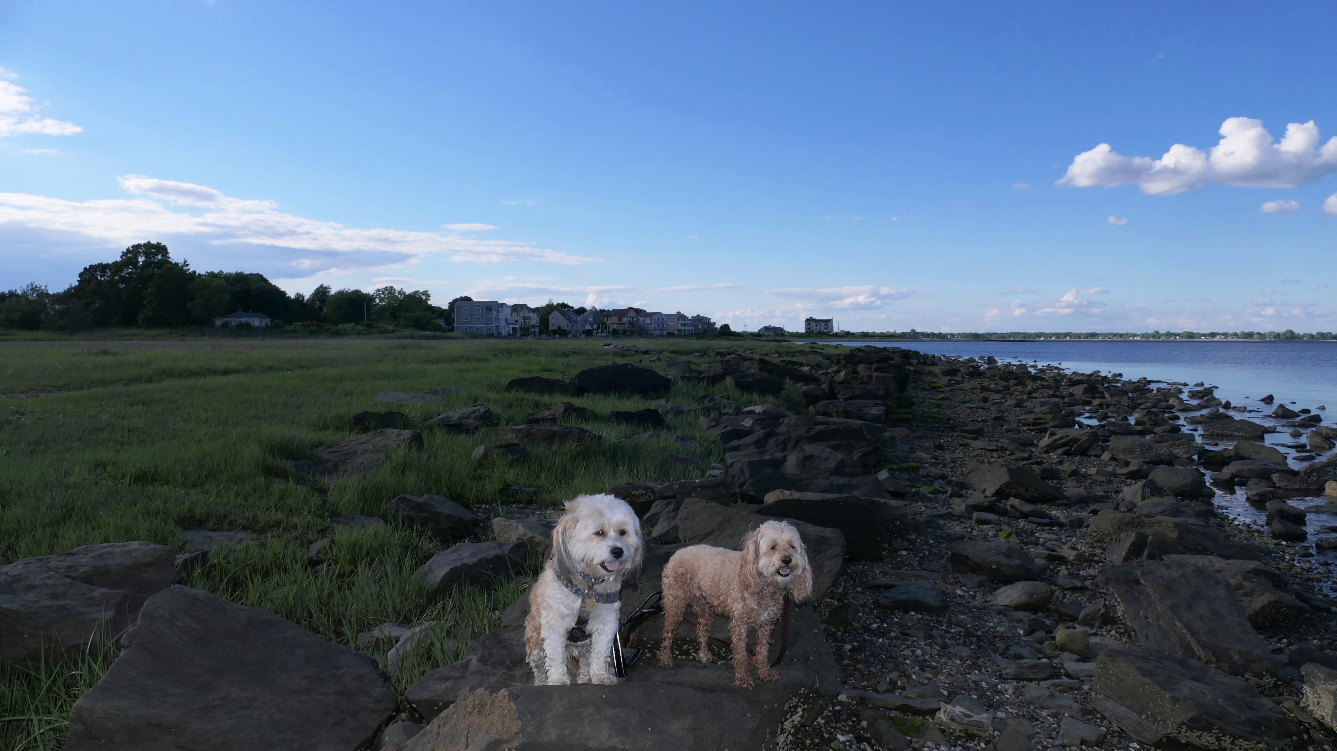 We visit Rhode Island often time a year, since it tends to be cooler than Connecticut, especially around the shore and the bay. But Rhode Island is a small state, so we've had to repeat places quite a bit this year. We originally visited this great, dog-friendly park a bit over two years ago. This park is worth repeating! This time, it was later in the day, and a bit sunnier, but we did much of the same walk as the first time. We generally followed the paved loop trail around the park, but took some of the side trails that lead out to the rocks. There are a couple beach areas, and you can even see both the Jamestown and Newport bridges in the distance. The biggest difference from our last visit, is that an event was going on this time. They have movies in the park on Thursday nights in the summer. There are food trucks and a few vendor tents for people to enjoy before the movies start at dusk. The movie this night was "DC's League of Super Pets", but we didn't stay for the film. The whole thing is presented by Wave Federal Credit Union. The very nice women at the Wave tent provided Mandy & Lexi with scarves, and gave them lots of attention, which they love!
