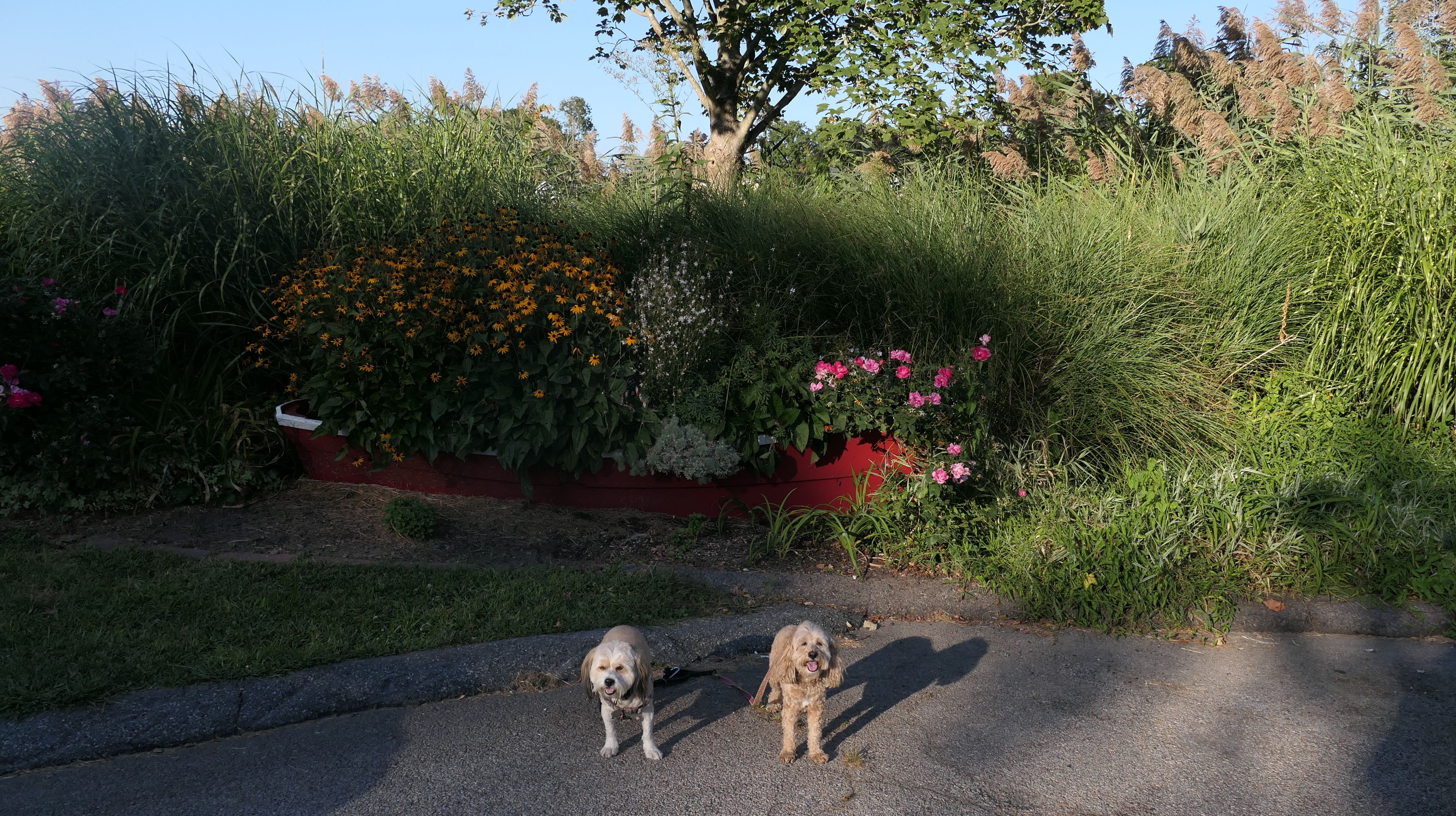 This is a small neighborhood in Warwick, bordering Apponaug Cove. There's a very small park here, as well as a marina, a restaurant and a gift shop. We walked from the park at the end of Hallworth Drive, down Arnold's Neck Drive, toward Post Road and back. Near the marina, there is a boat launch where the dogs decided to cool off in the water.