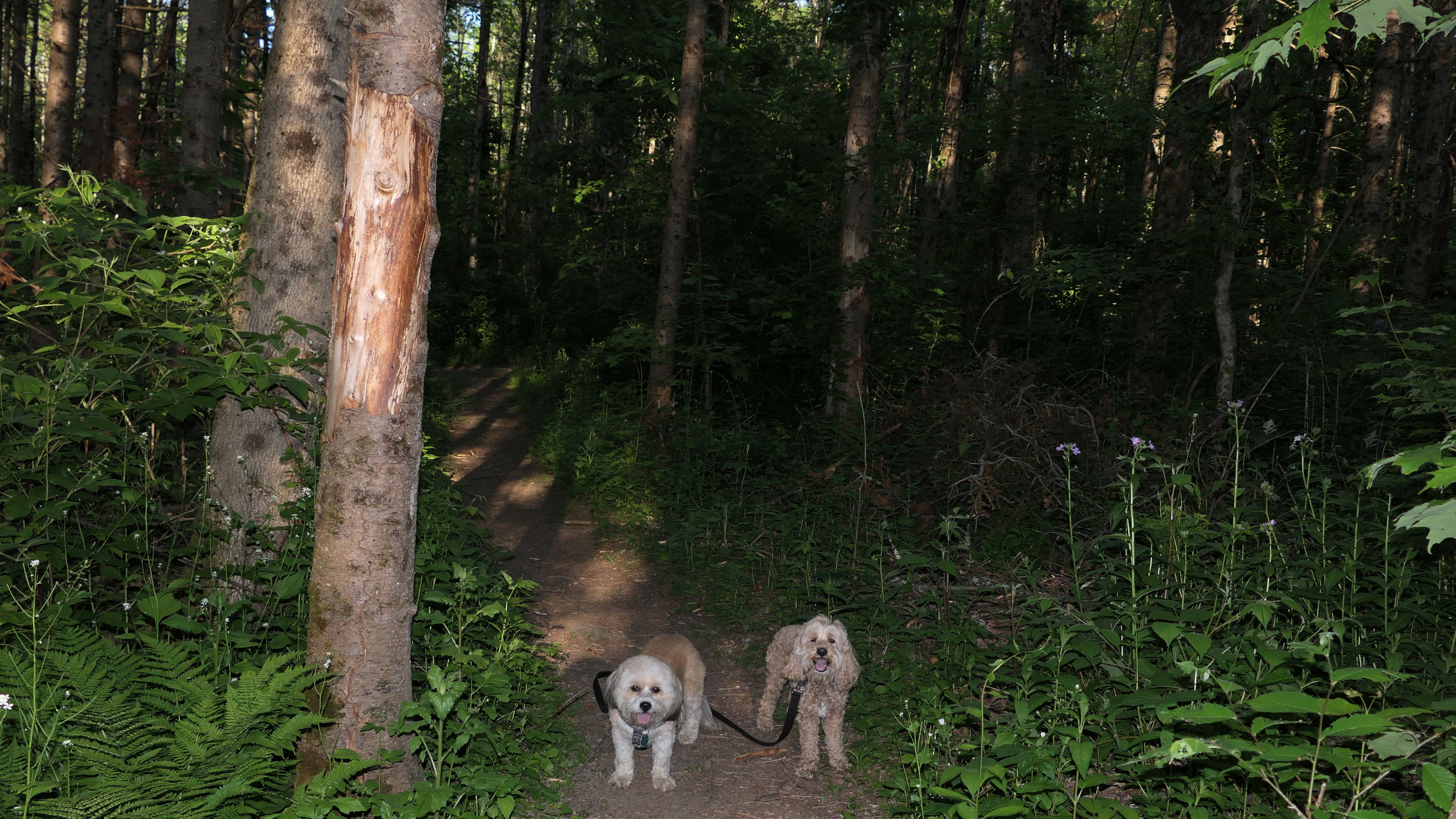 This was a fun hike. There's a 1.2 mile loop trail with a spur that goes out to an observation platform. The trail starts in West Stockbridge, but the majority of the trail crosses over into Richmond. Either side of the loop is downhill, and the western end of the loop is steeper. We went down the east side. The spur trail that goes out to the observation platform is a bit dangerous toward the end. There's a rocky stair case curving up a hill with a pretty good drop to the right. I would suggest not slipping. There is a metal staircase that goes down to the observation platform. The platform gives a great view of waterfall, but the flow was pretty weak. It's hard to see in the pictures. There's a fence that protects from a deep drop, but it blocks the view when trying to get to the waterfall in the same picture with small dogs. We then had to proceed uphill to complete the loop and get back to the car. It was a challenging climb up, but we all survived! The pictures below are from the West Stockbridge section. See the Richmond page for pictures from the Richmond section of the trail.