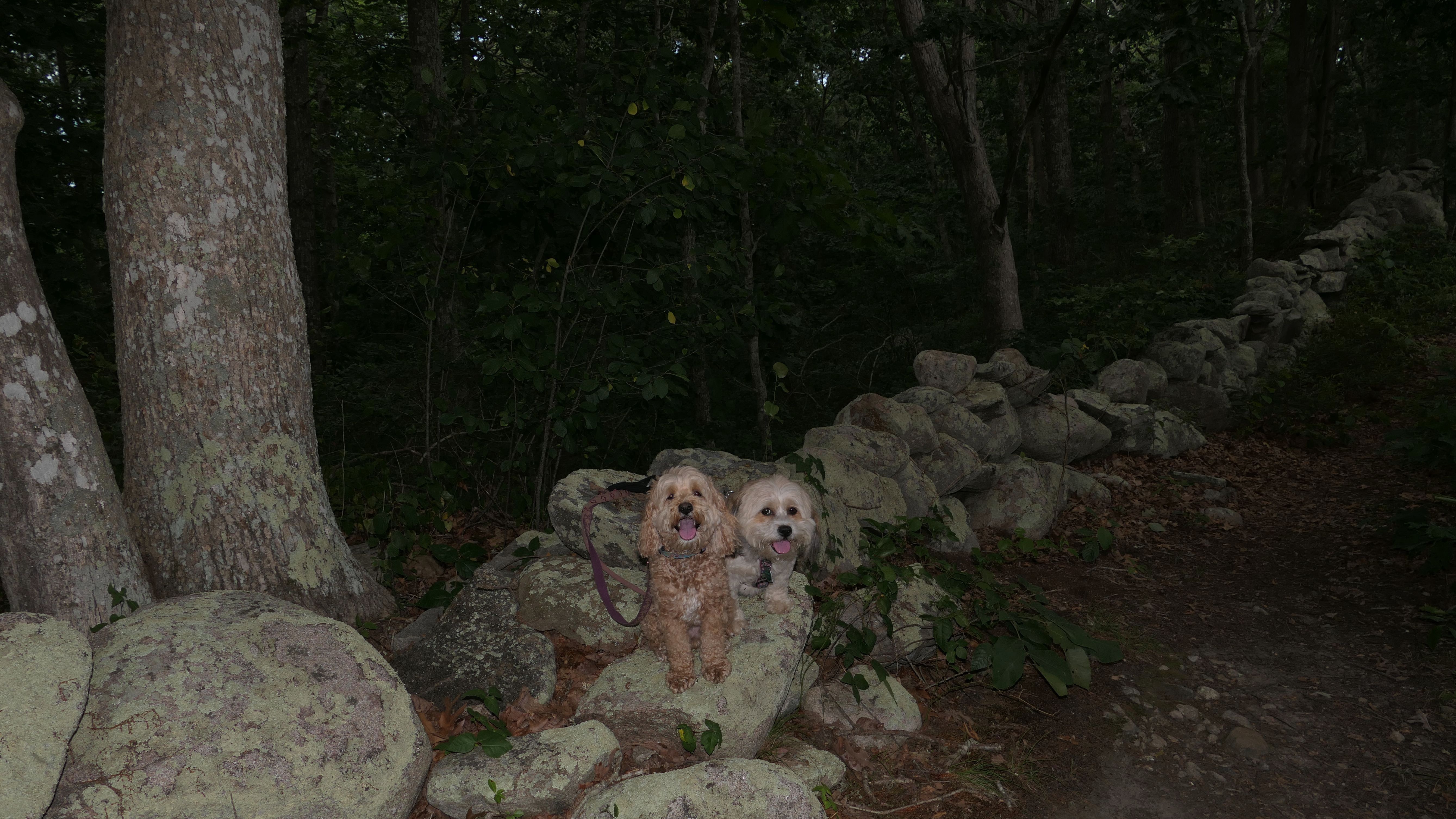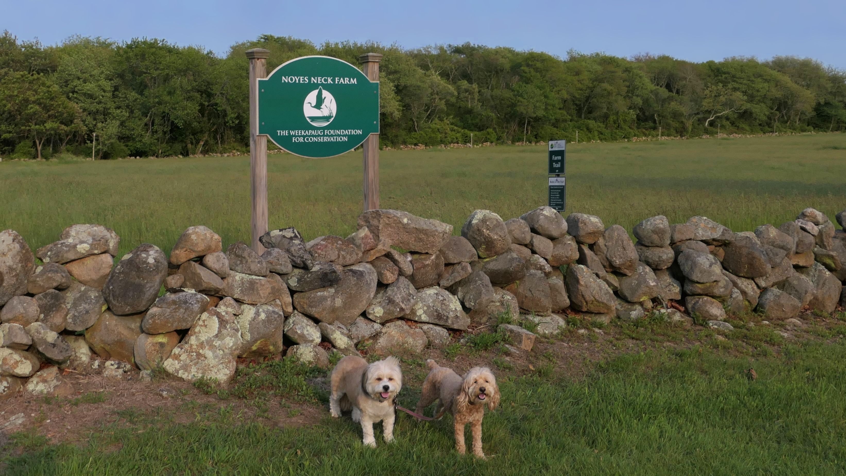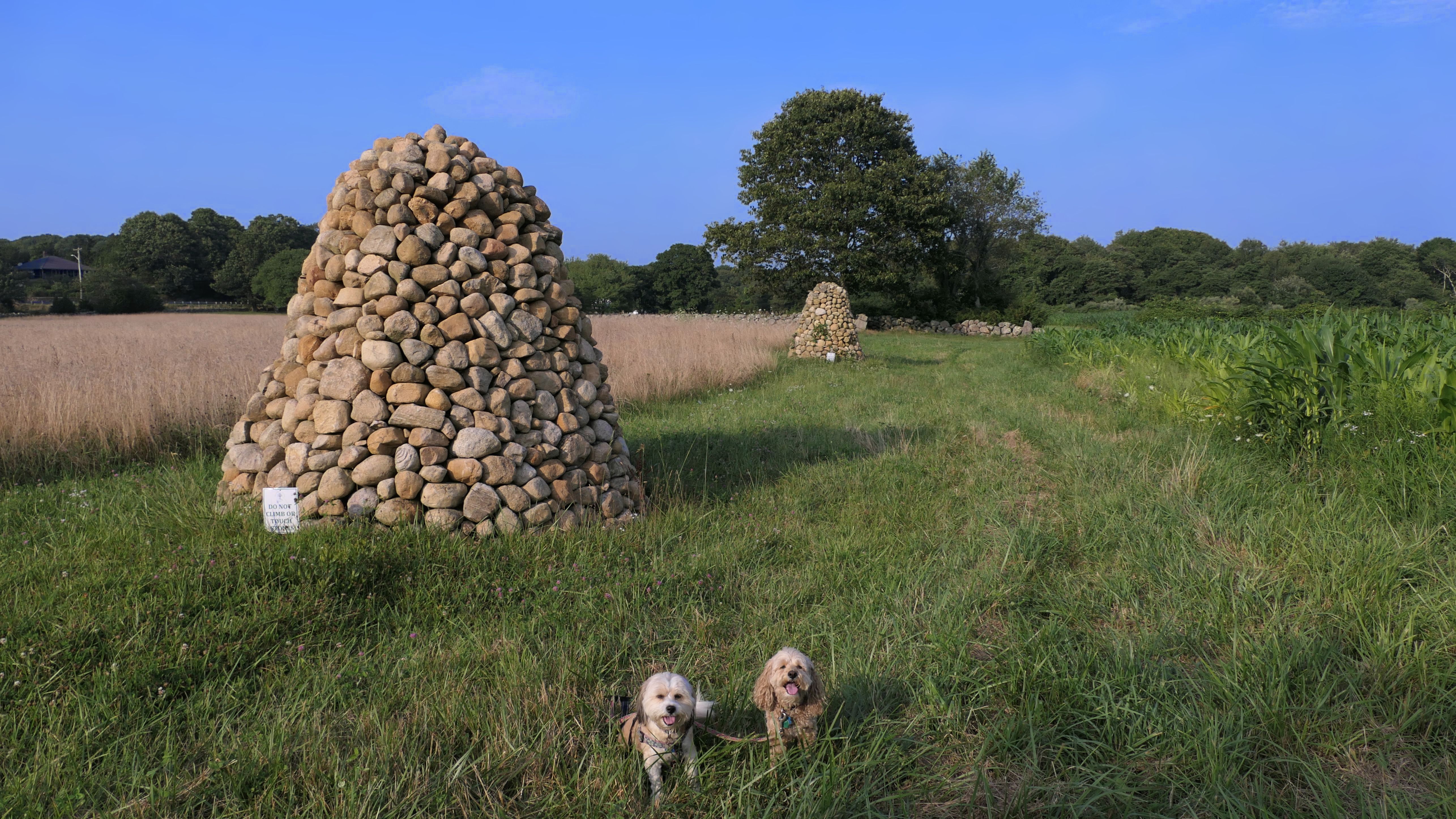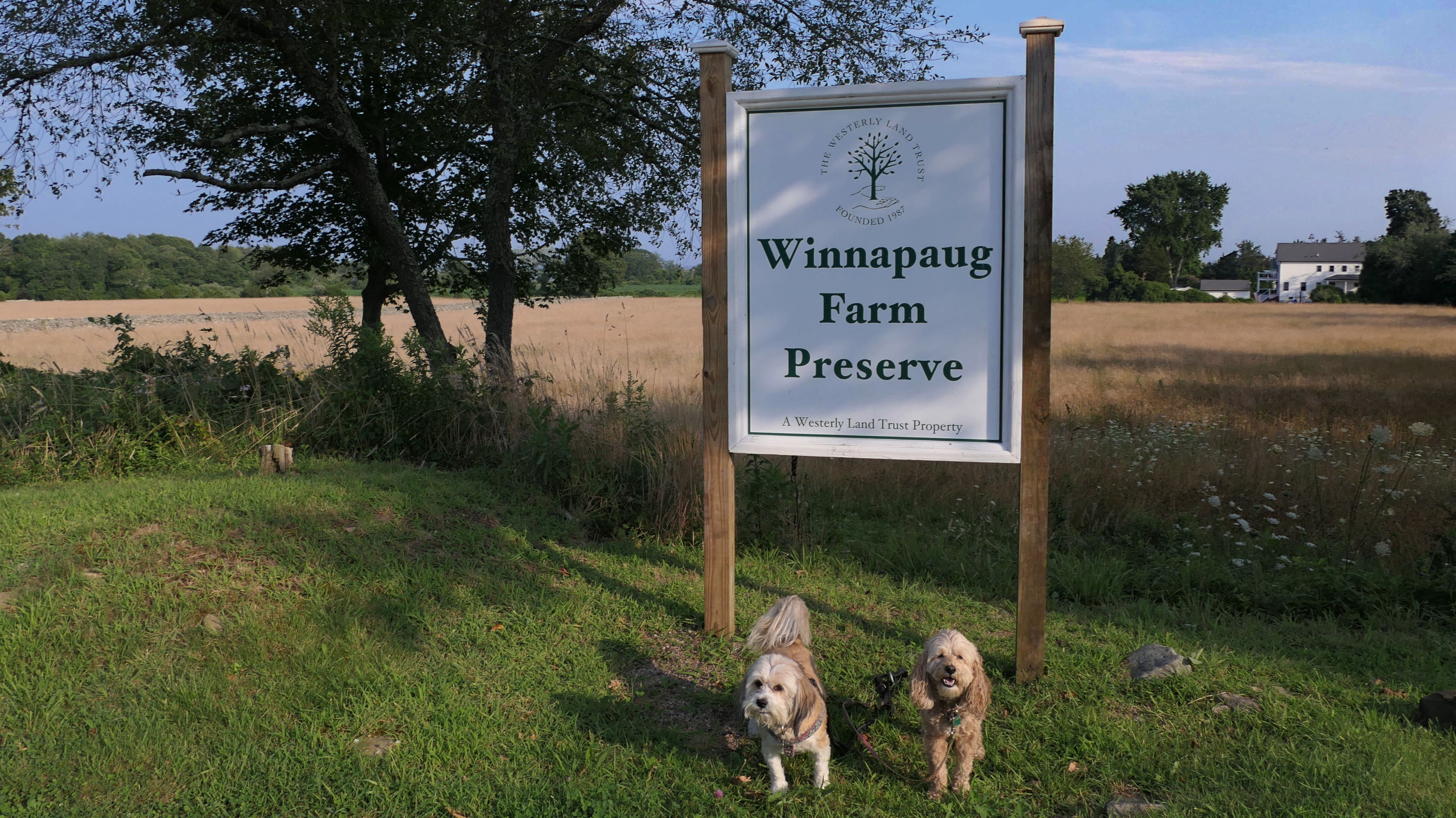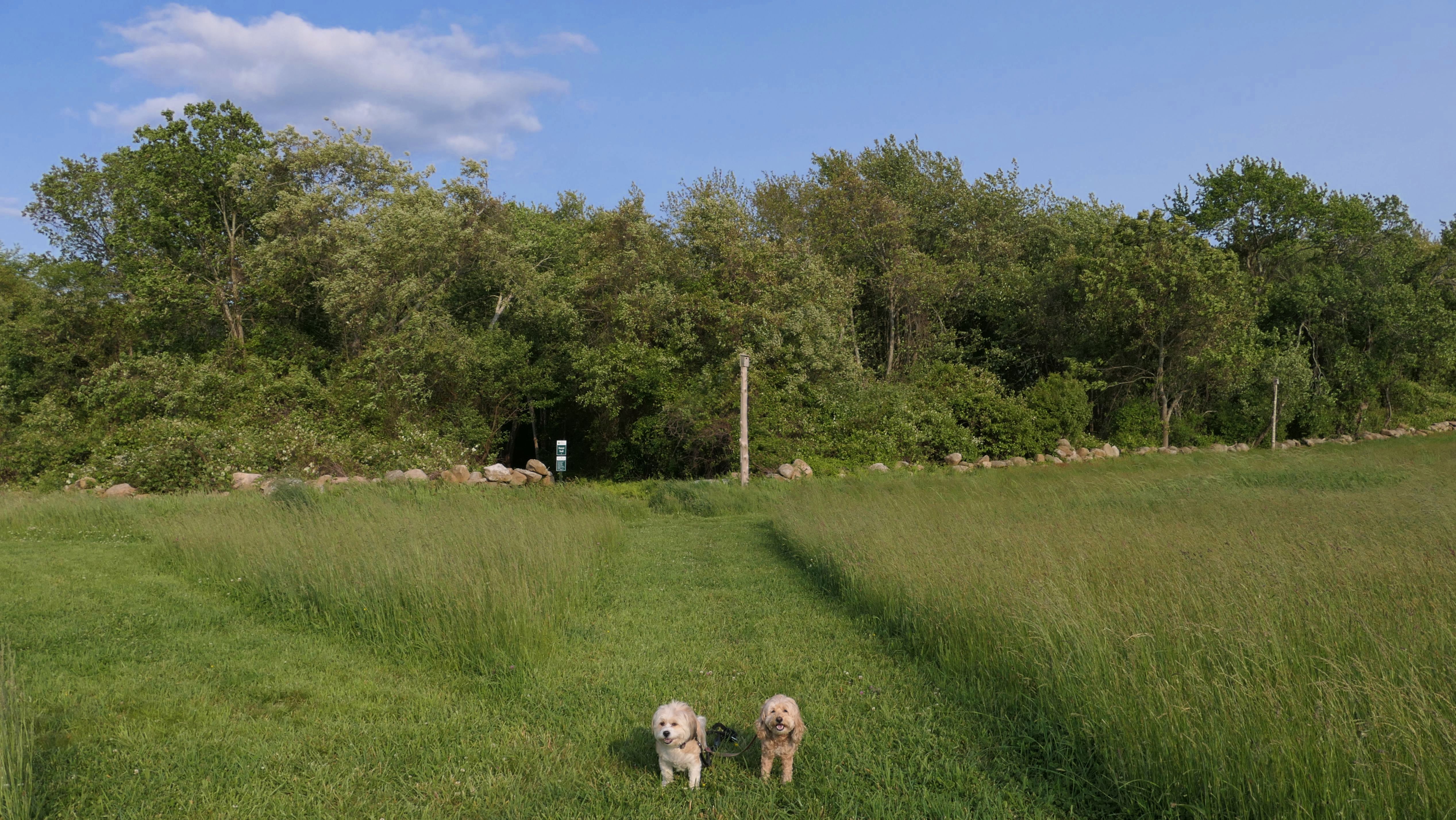This looks like a nice place, with the stone walls and the cairns, and the salt pond, but this was a rough two mile hike. The trail is in the shape of a three prong fork, with the three prongs going out to the salt pond. The problem was that the kind of trails here need to be mowed, and they haven't been mowed in a while. Most of the trails were overgrown. The first part of the trail, sort of the handle of the fork if you will, is easy enough to traverse, despite the long grass, but each of three prongs caused challenges. The first one was the most overgrown, but the also the driest, with only a little bit of mud. We were able to get the closest to Winnapaug Pond here. The second and third trails were easy at the start, but got muddier and more overgrown the closer to the pond we got. I wound up carrying the dogs over long stretches on the 2nd trail, and we simply turned around when we reached the mud on the 3rd trail. I also had to pull a few ticks off both myself and the dogs when we got back to the car. The long grass is a breeding ground for ticks. While there was only a few ticks on us this time, I wouldn't advise coming here earlier in the season, when tick season is at it's peak. This seems like it could be a wonderful spot, but it needs a bit more maintenance.