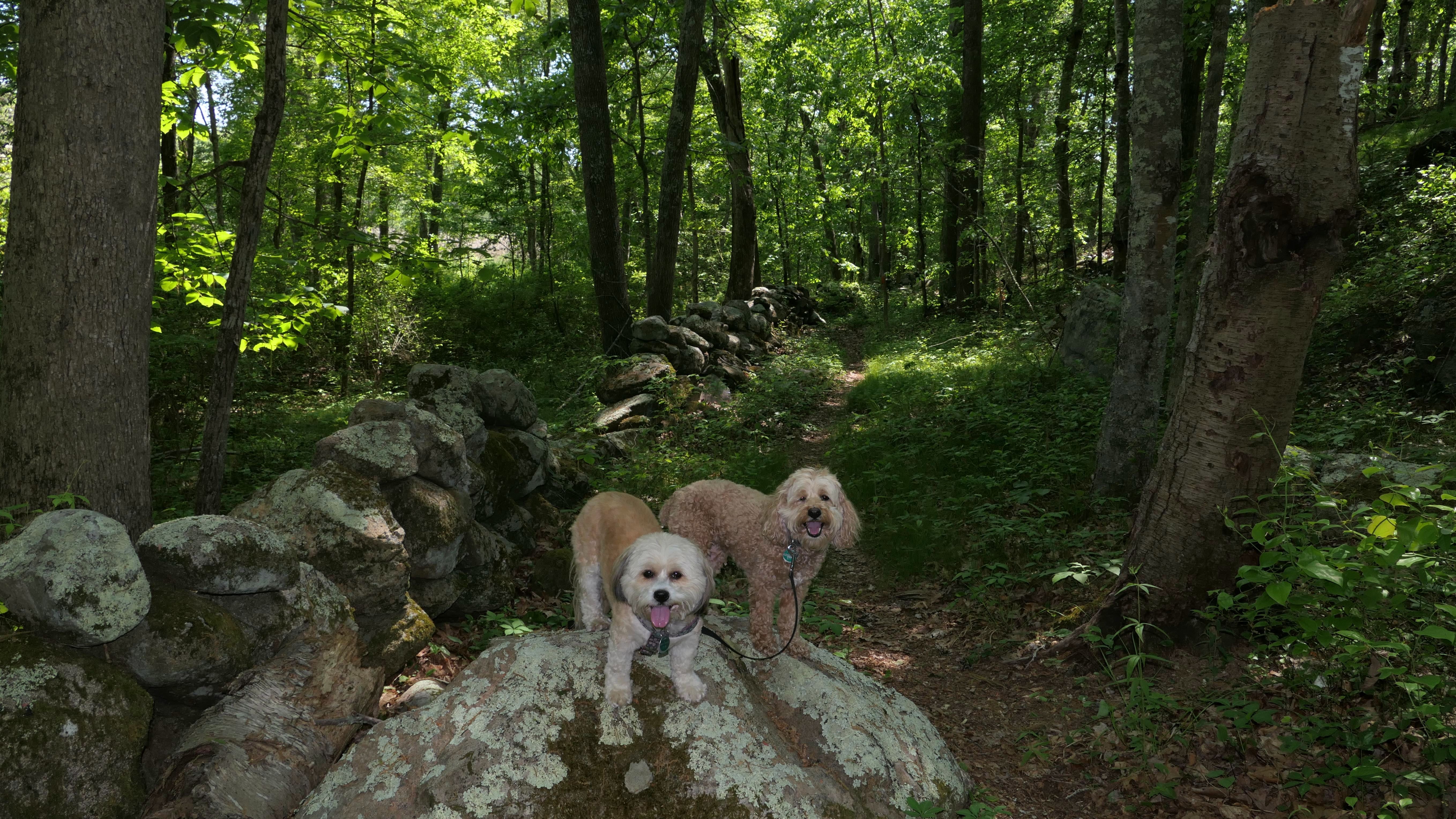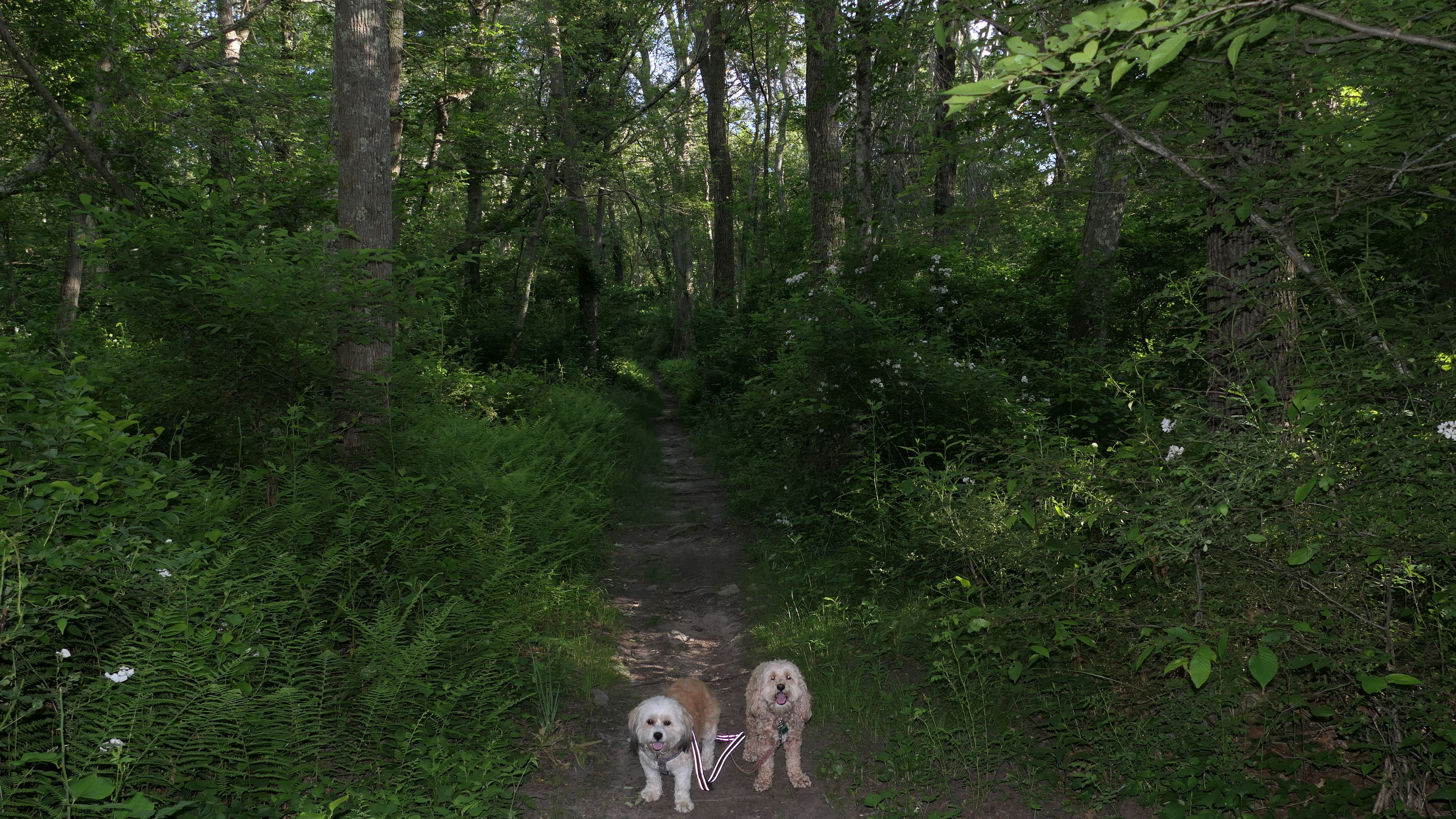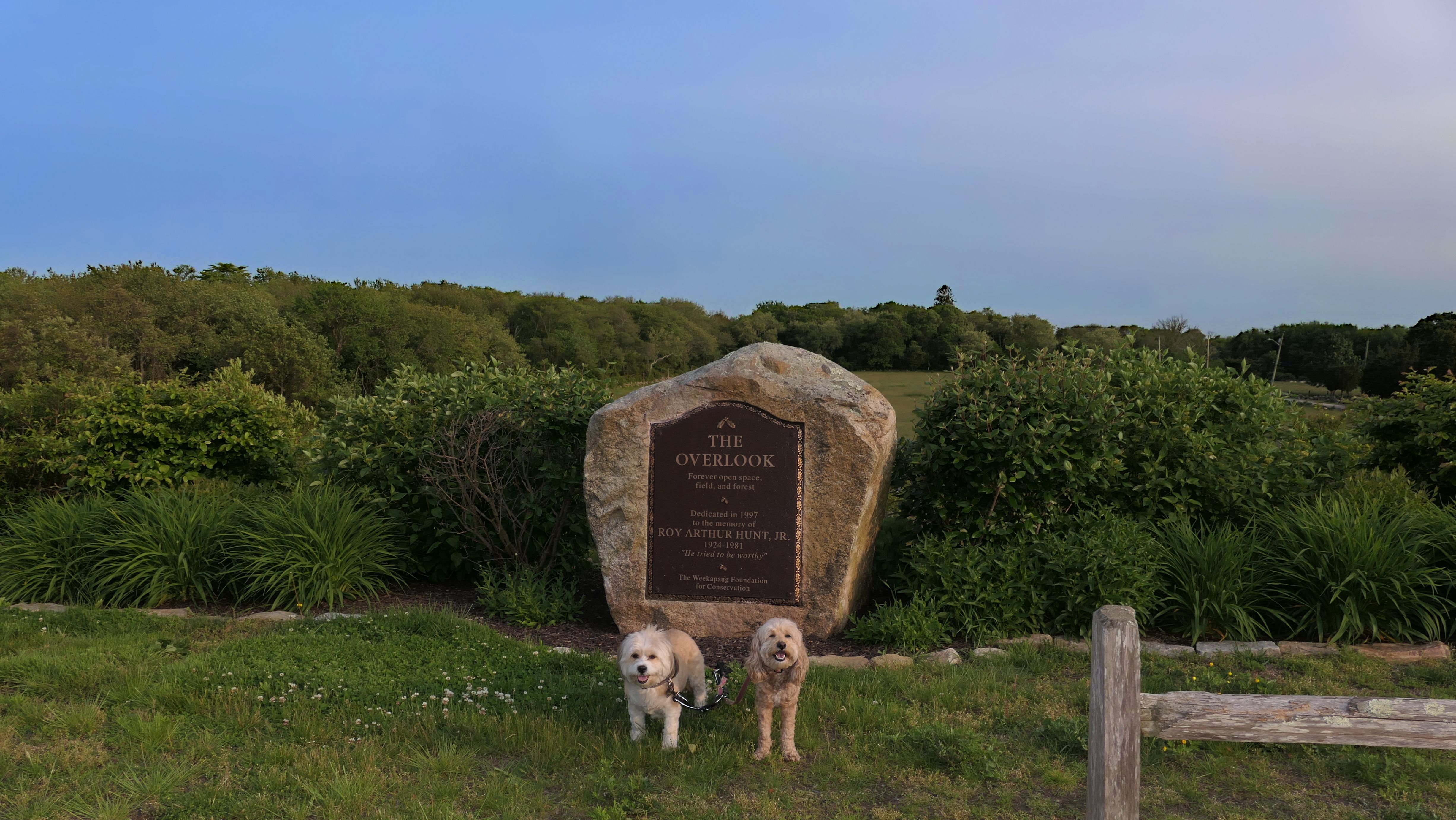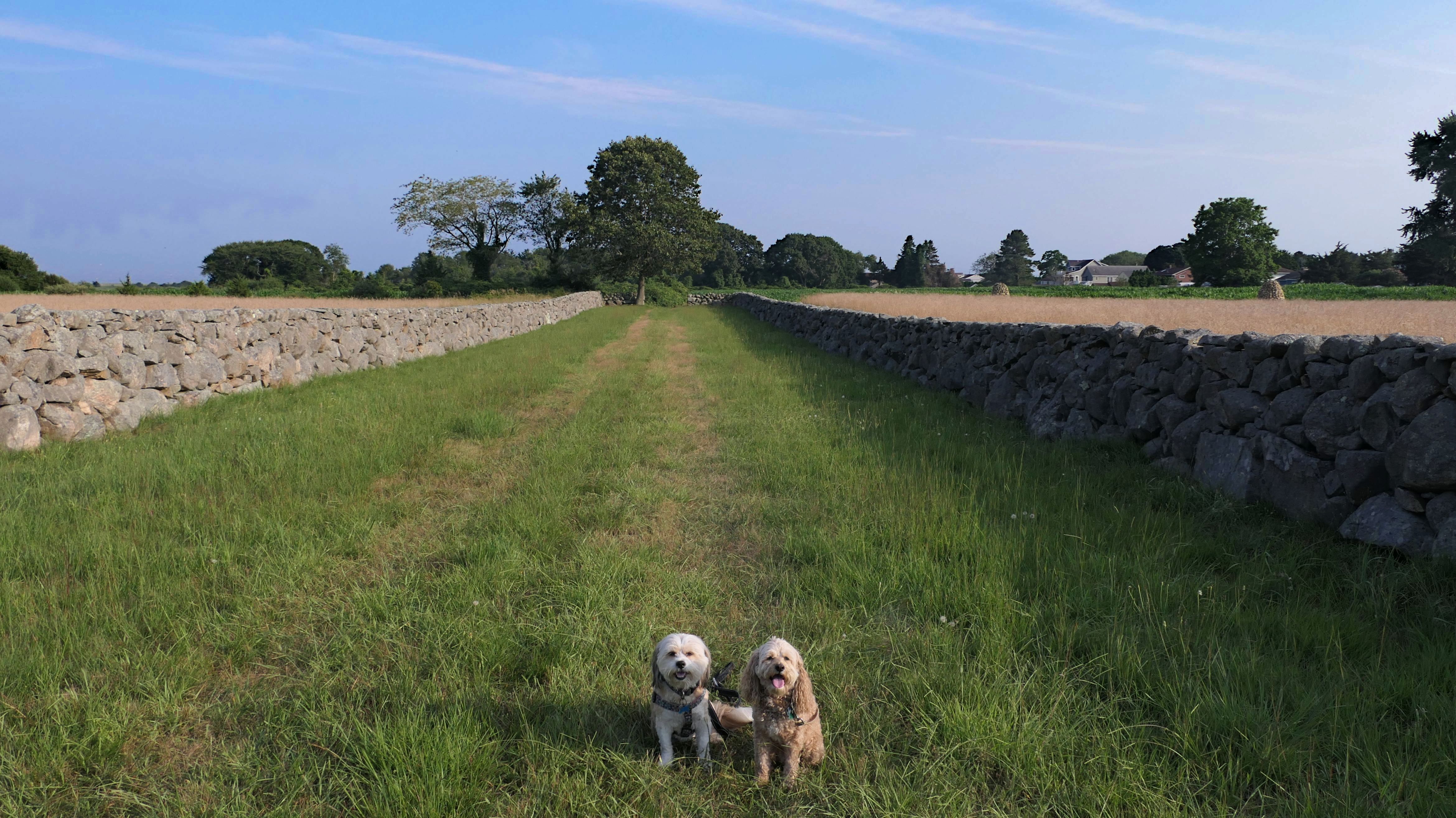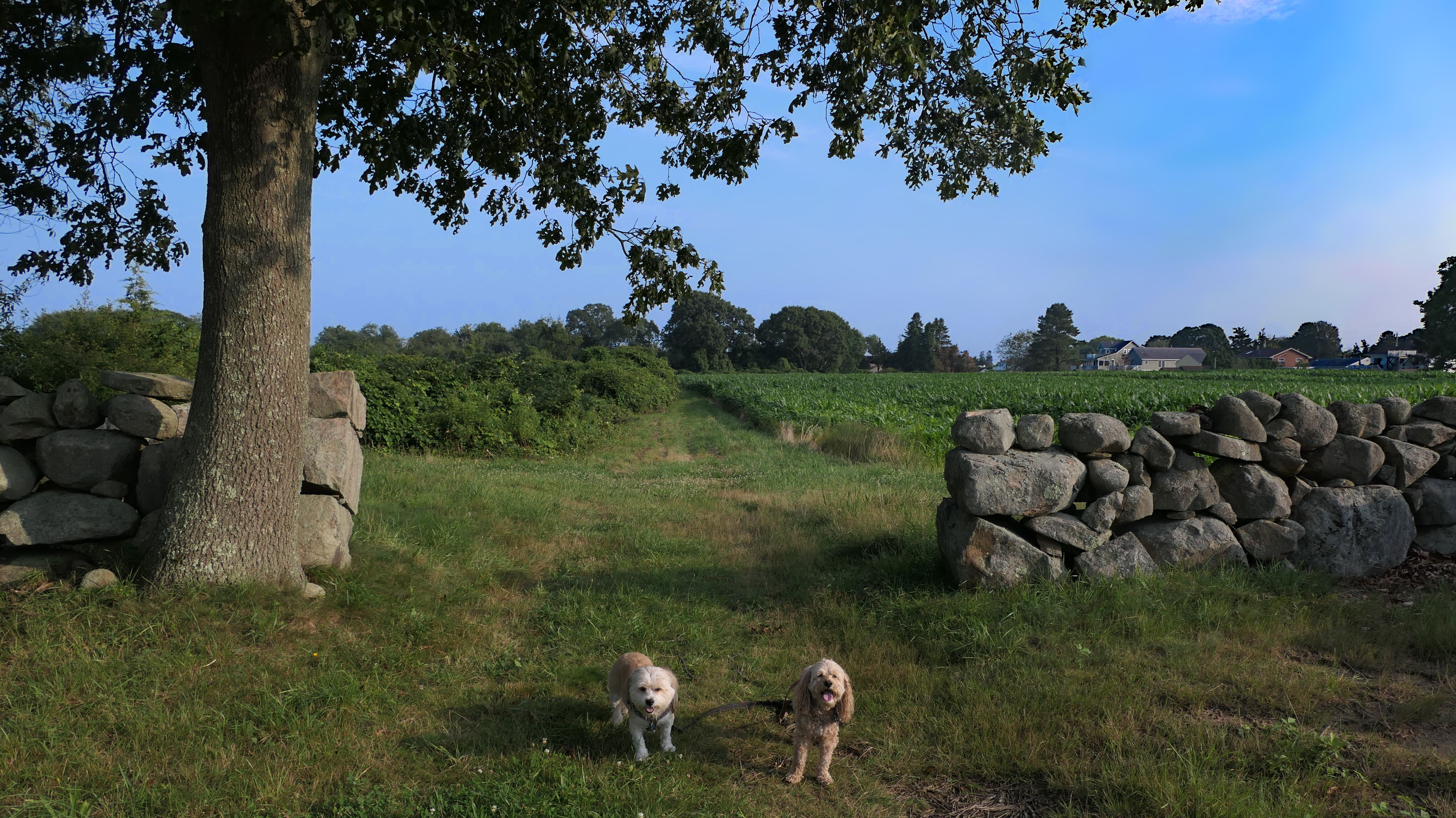 This looks like a nice place, with the stone walls and the cairns, and the salt pond, but this was a rough two mile hike. The trail is in the shape of a three prong fork, with the three prongs going out to the salt pond. The problem was that the kind of trails here need to be mowed, and they haven't been mowed in a while. Most of the trails were overgrown. The first part of the trail, sort of the handle of the fork if you will, is easy enough to traverse, despite the long grass, but each of three prongs caused challenges. The first one was the most overgrown, but the also the driest, with only a little bit of mud. We were able to get the closest to Winnapaug Pond here. The second and third trails were easy at the start, but got muddier and more overgrown the closer to the pond we got. I wound up carrying the dogs over long stretches on the 2nd trail, and we simply turned around when we reached the mud on the 3rd trail. I also had to pull a few ticks off both myself and the dogs when we got back to the car. The long grass is a breeding ground for ticks. While there was only a few ticks on us this time, I wouldn't advise coming here earlier in the season, when tick season is at it's peak. This seems like it could be a wonderful spot, but it needs a bit more maintenance.