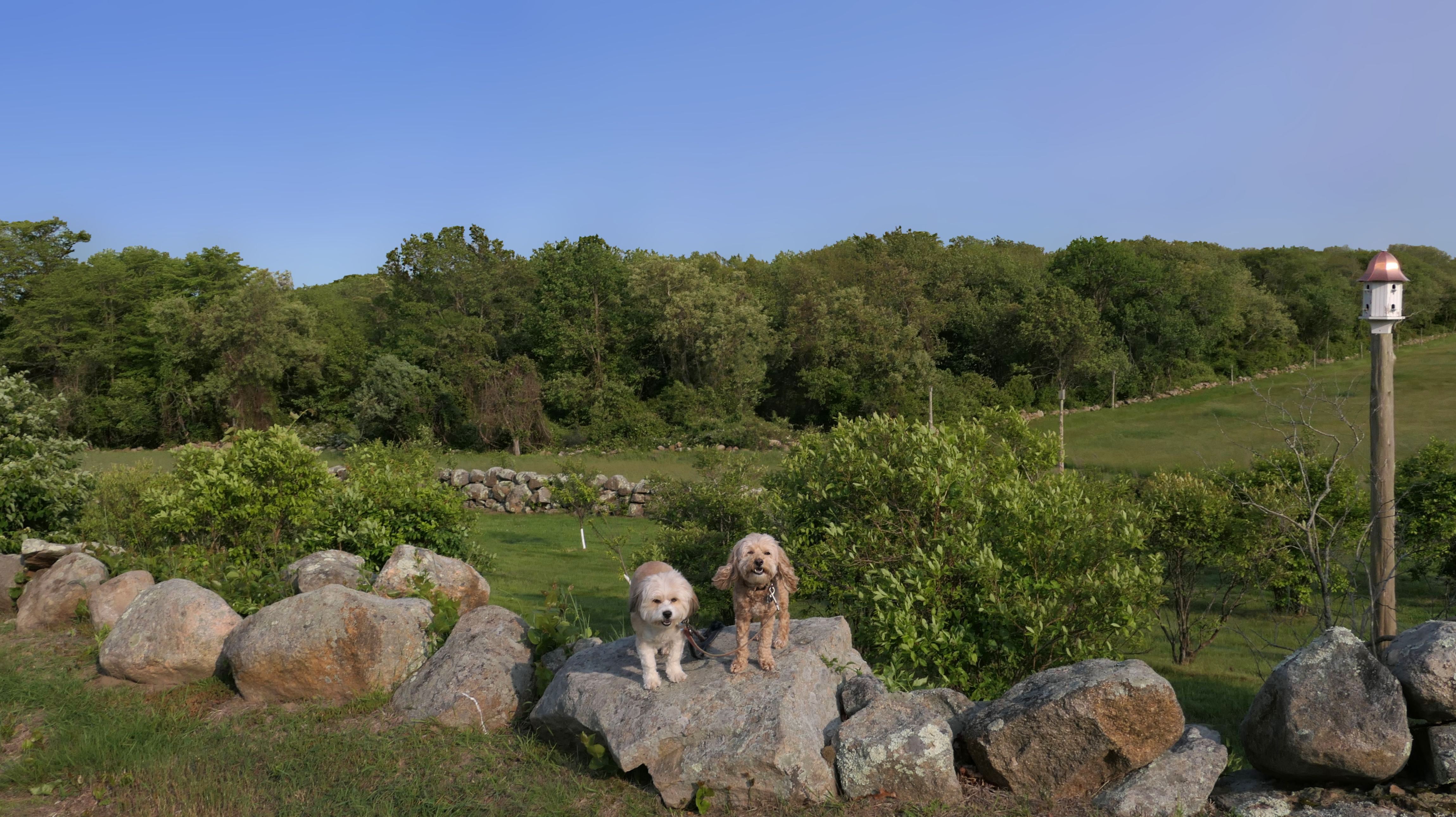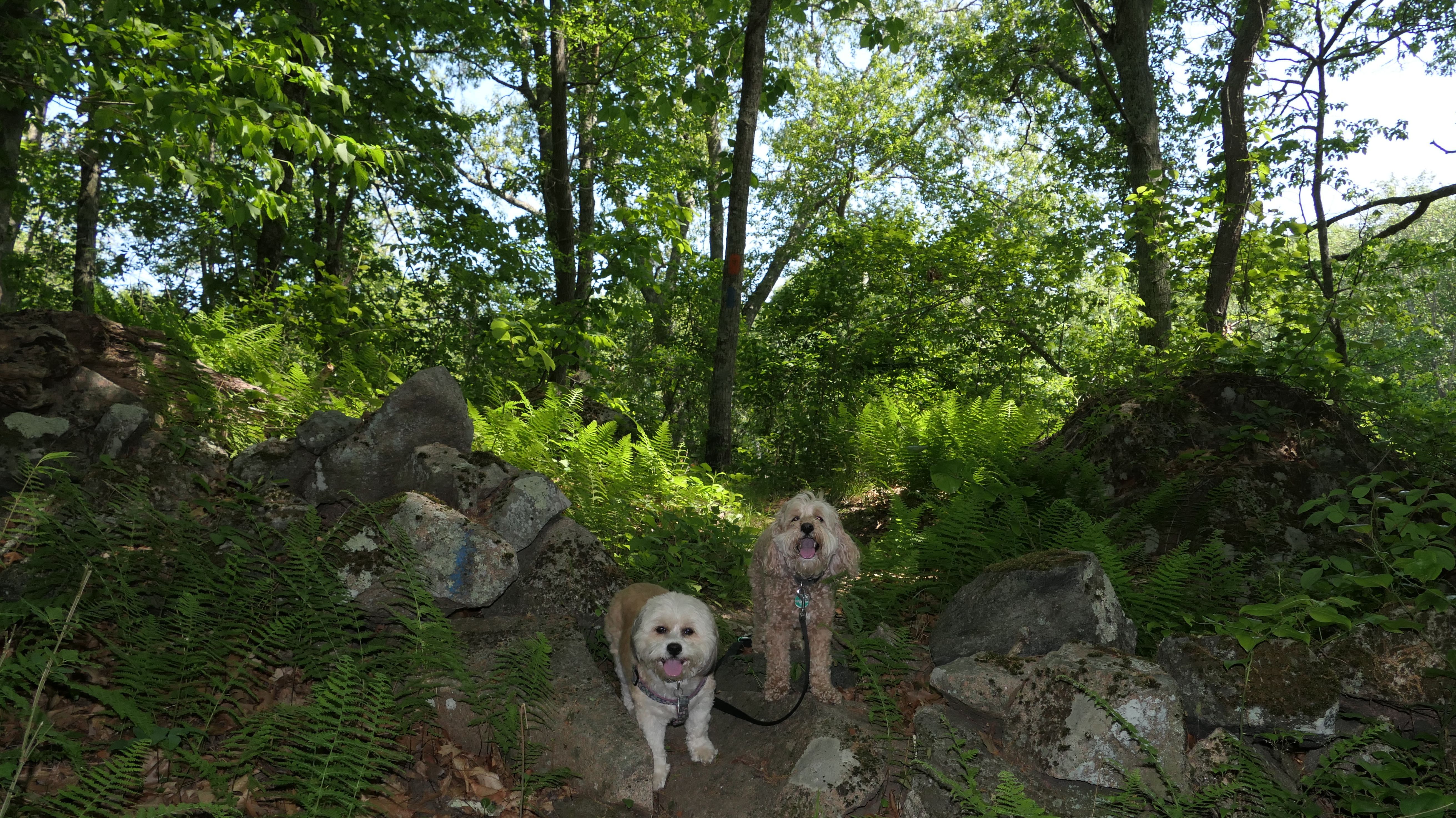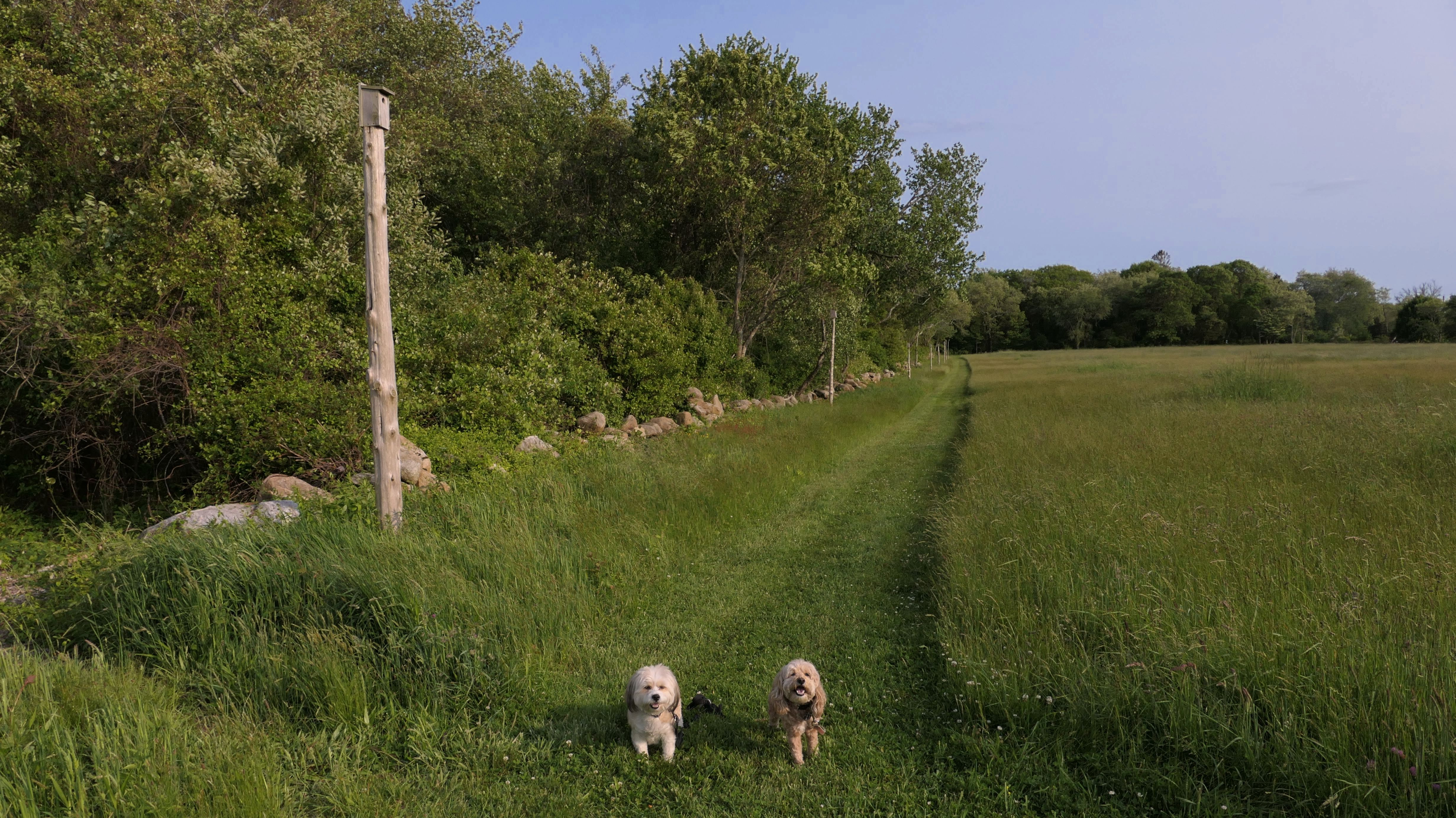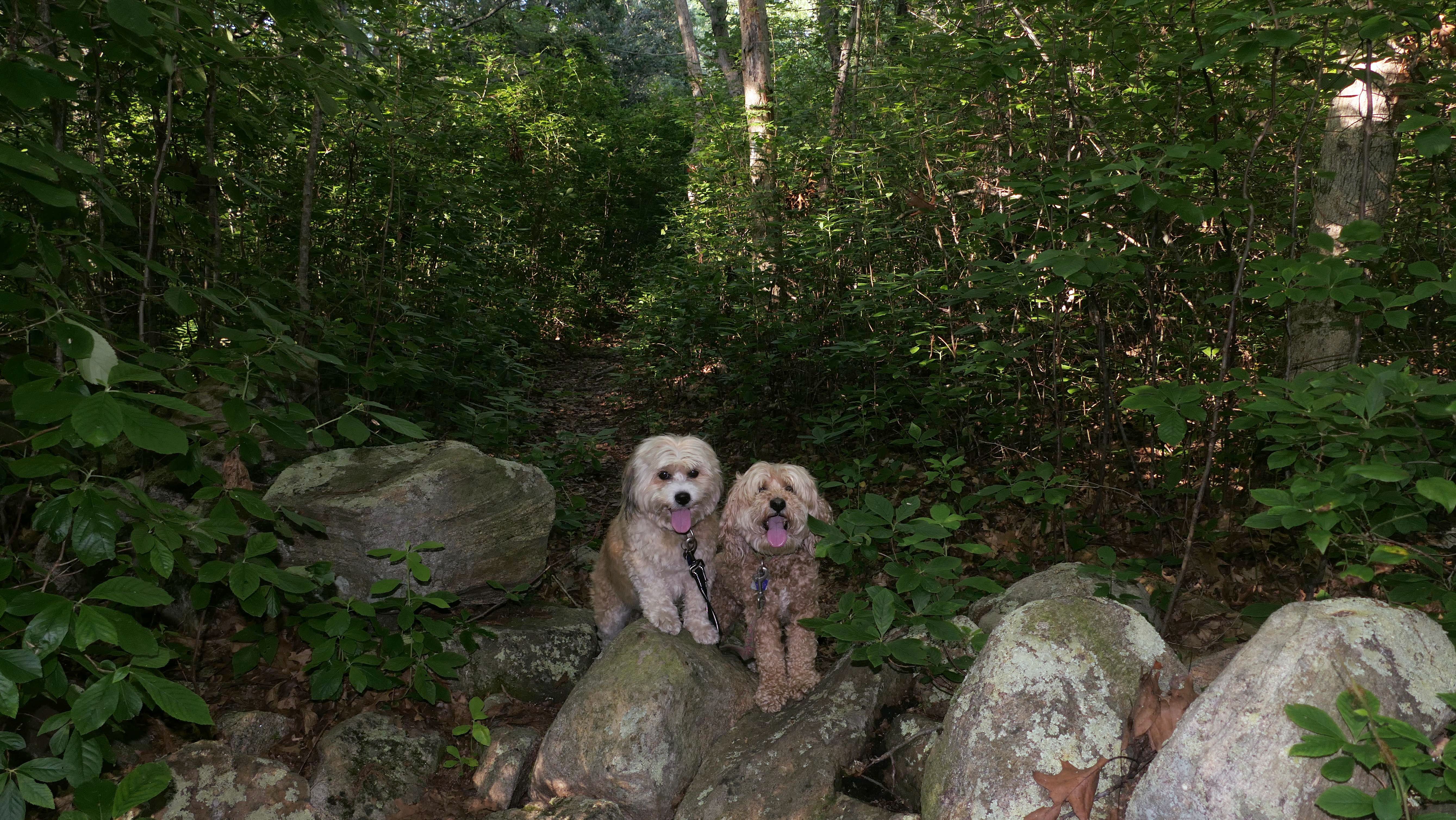 This looks like a nice place, with the stone walls and the cairns, and the salt pond, but this was a rough two mile hike. The trail is in the shape of a three prong fork, with the three prongs going out to the salt pond. The problem was that the kind of trails here need to be mowed, and they haven't been mowed in a while. Most of the trails were overgrown. The first part of the trail, sort of the handle of the fork if you will, is easy enough to traverse, despite the long grass, but each of three prongs caused challenges. The first one was the most overgrown, but the also the driest, with only a little bit of mud. We were able to get the closest to Winnapaug Pond here. The second and third trails were easy at the start, but got muddier and more overgrown the closer to the pond we got. I wound up carrying the dogs over long stretches on the 2nd trail, and we simply turned around when we reached the mud on the 3rd trail. I also had to pull a few ticks off both myself and the dogs when we got back to the car. The long grass is a breeding ground for ticks. While there was only a few ticks on us this time, I wouldn't advise coming here earlier in the season, when tick season is at it's peak. This seems like it could be a wonderful spot, but it needs a bit more maintenance.