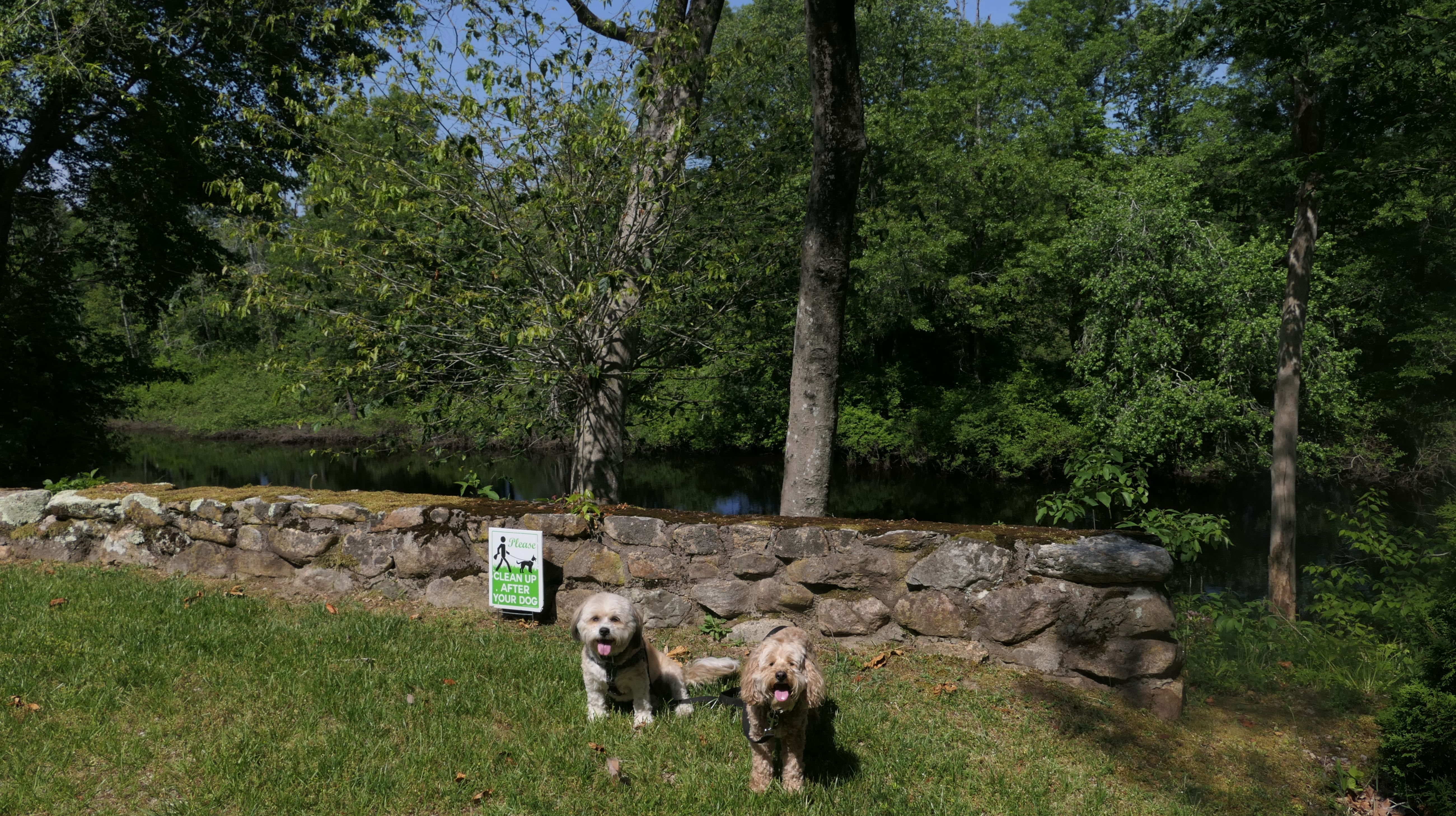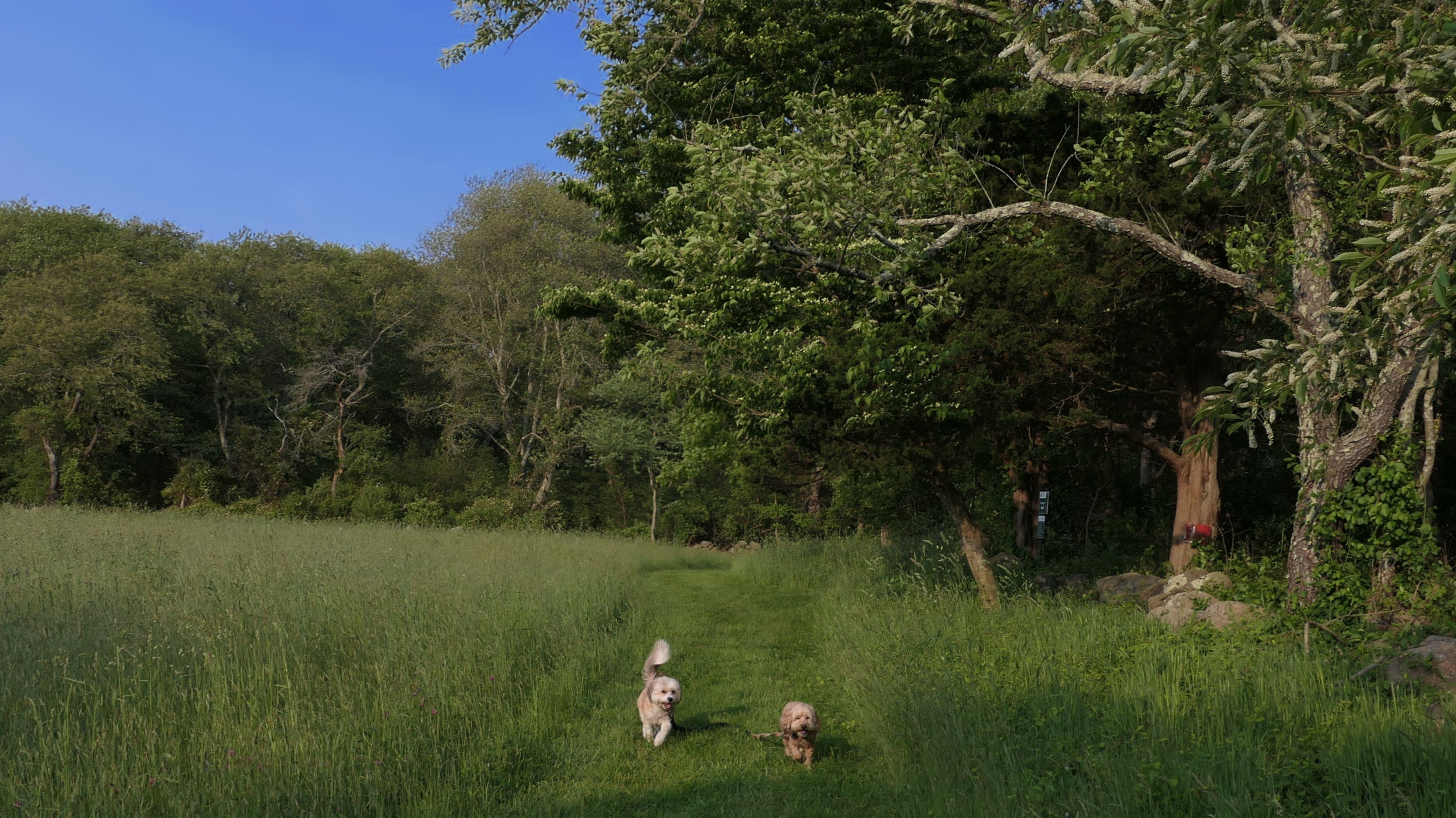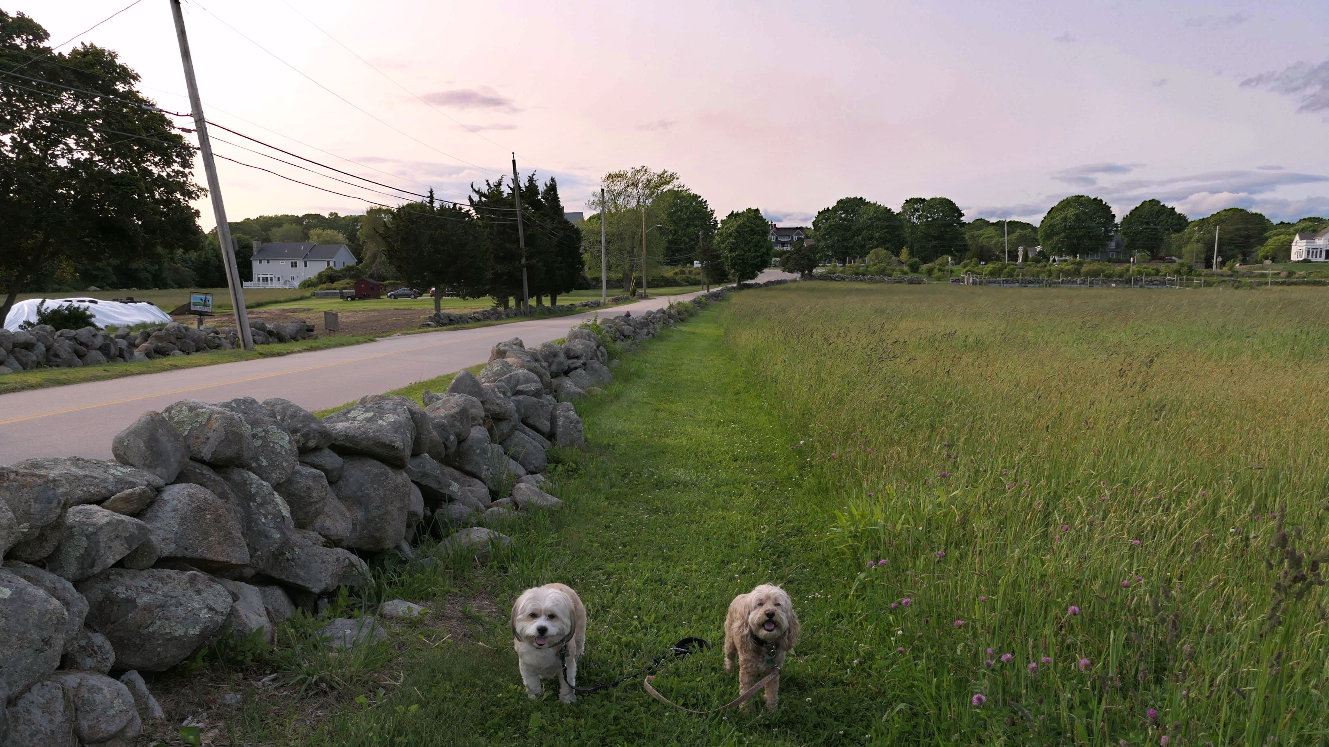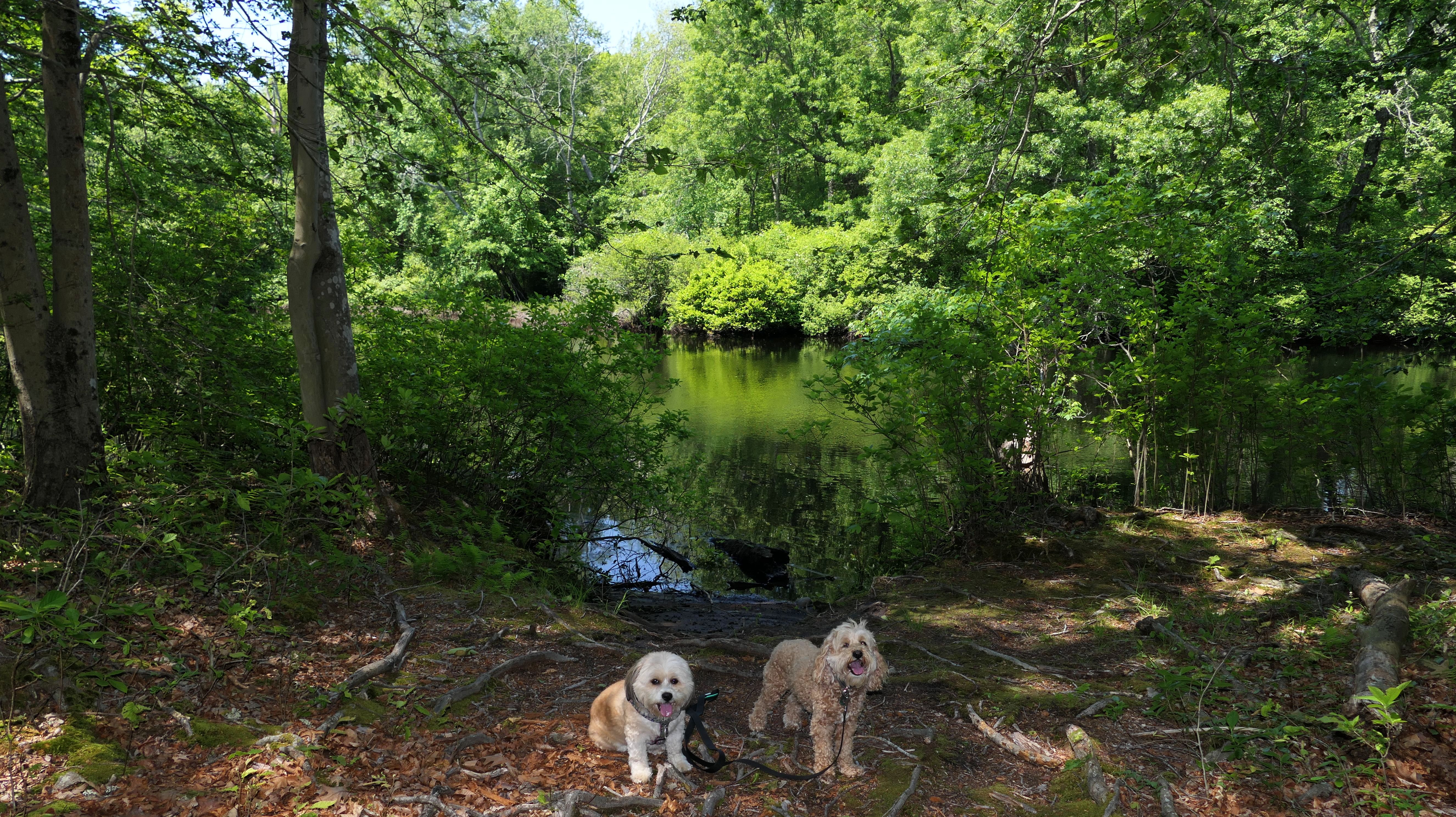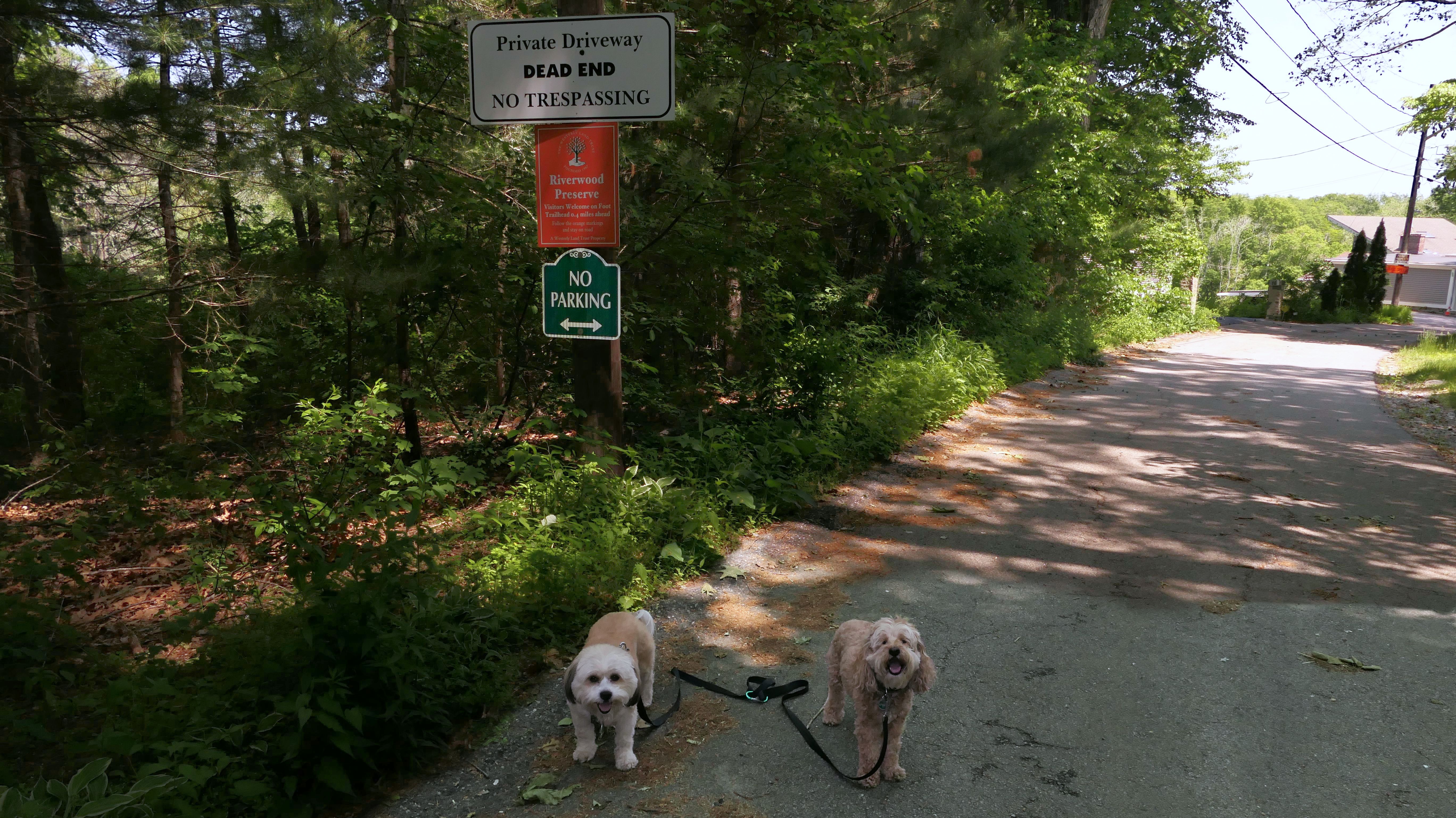 This looks like a nice place, with the stone walls and the cairns, and the salt pond, but this was a rough two mile hike. The trail is in the shape of a three prong fork, with the three prongs going out to the salt pond. The problem was that the kind of trails here need to be mowed, and they haven't been mowed in a while. Most of the trails were overgrown. The first part of the trail, sort of the handle of the fork if you will, is easy enough to traverse, despite the long grass, but each of three prongs caused challenges. The first one was the most overgrown, but the also the driest, with only a little bit of mud. We were able to get the closest to Winnapaug Pond here. The second and third trails were easy at the start, but got muddier and more overgrown the closer to the pond we got. I wound up carrying the dogs over long stretches on the 2nd trail, and we simply turned around when we reached the mud on the 3rd trail. I also had to pull a few ticks off both myself and the dogs when we got back to the car. The long grass is a breeding ground for ticks. While there was only a few ticks on us this time, I wouldn't advise coming here earlier in the season, when tick season is at it's peak. This seems like it could be a wonderful spot, but it needs a bit more maintenance.