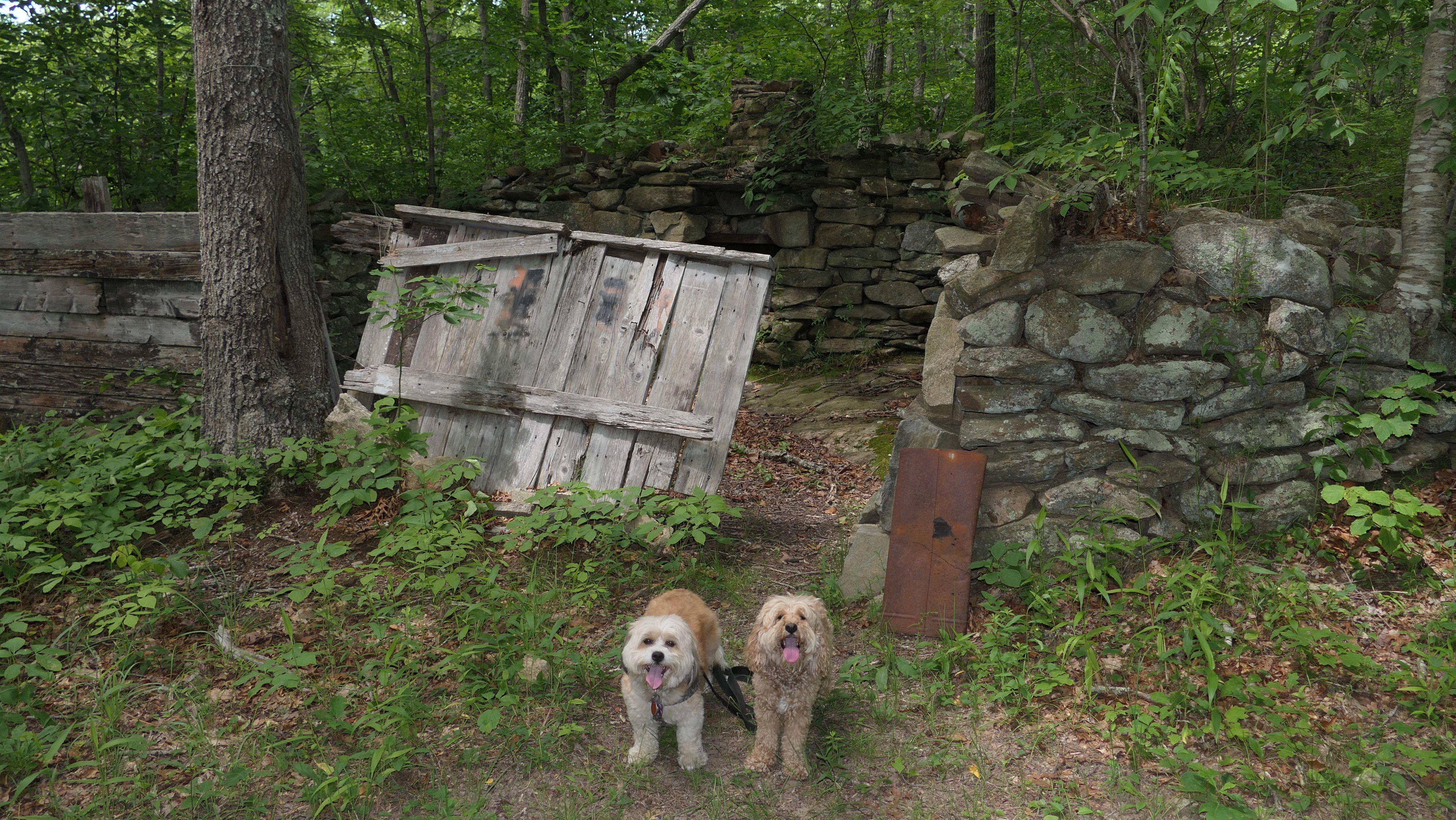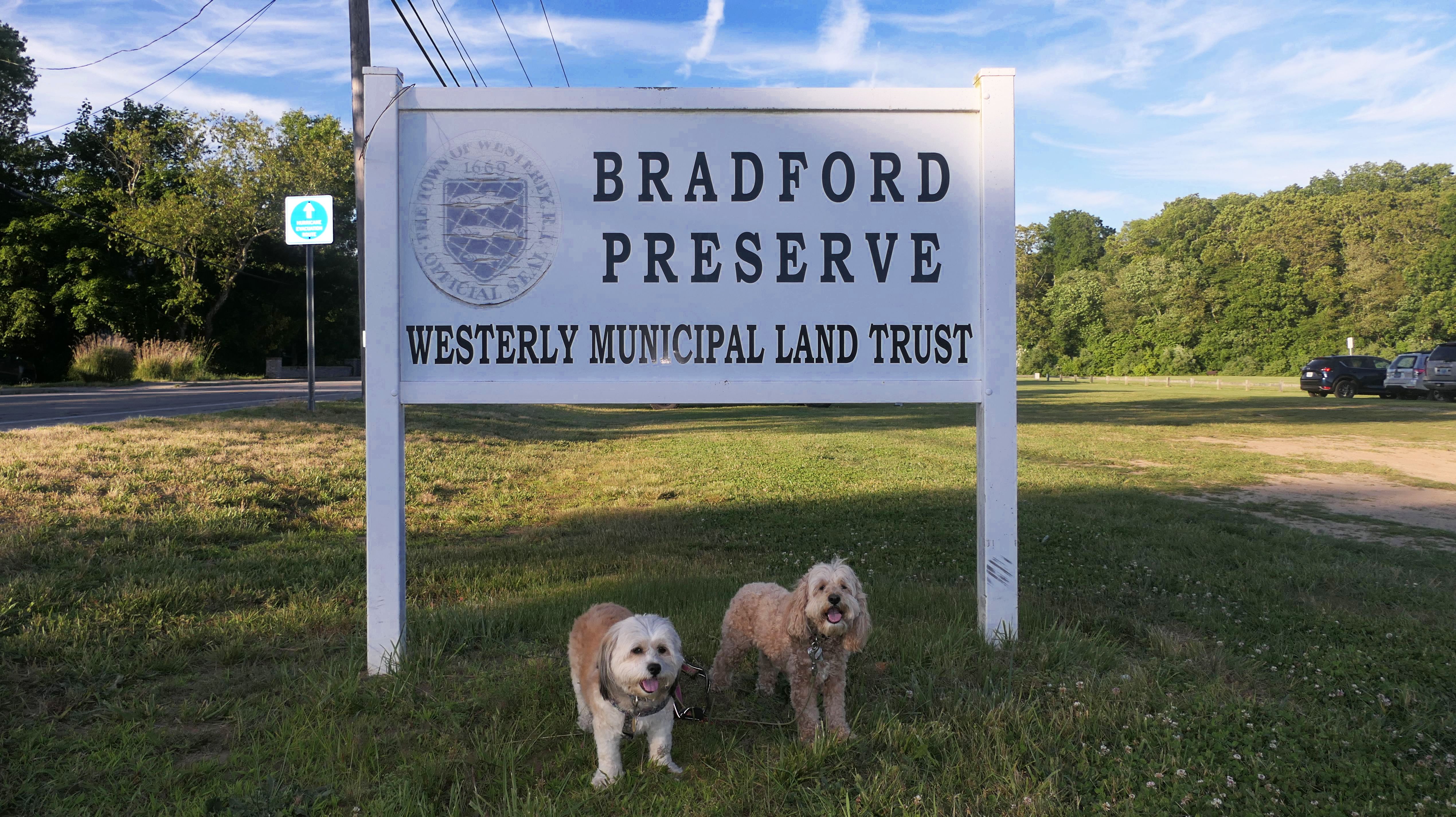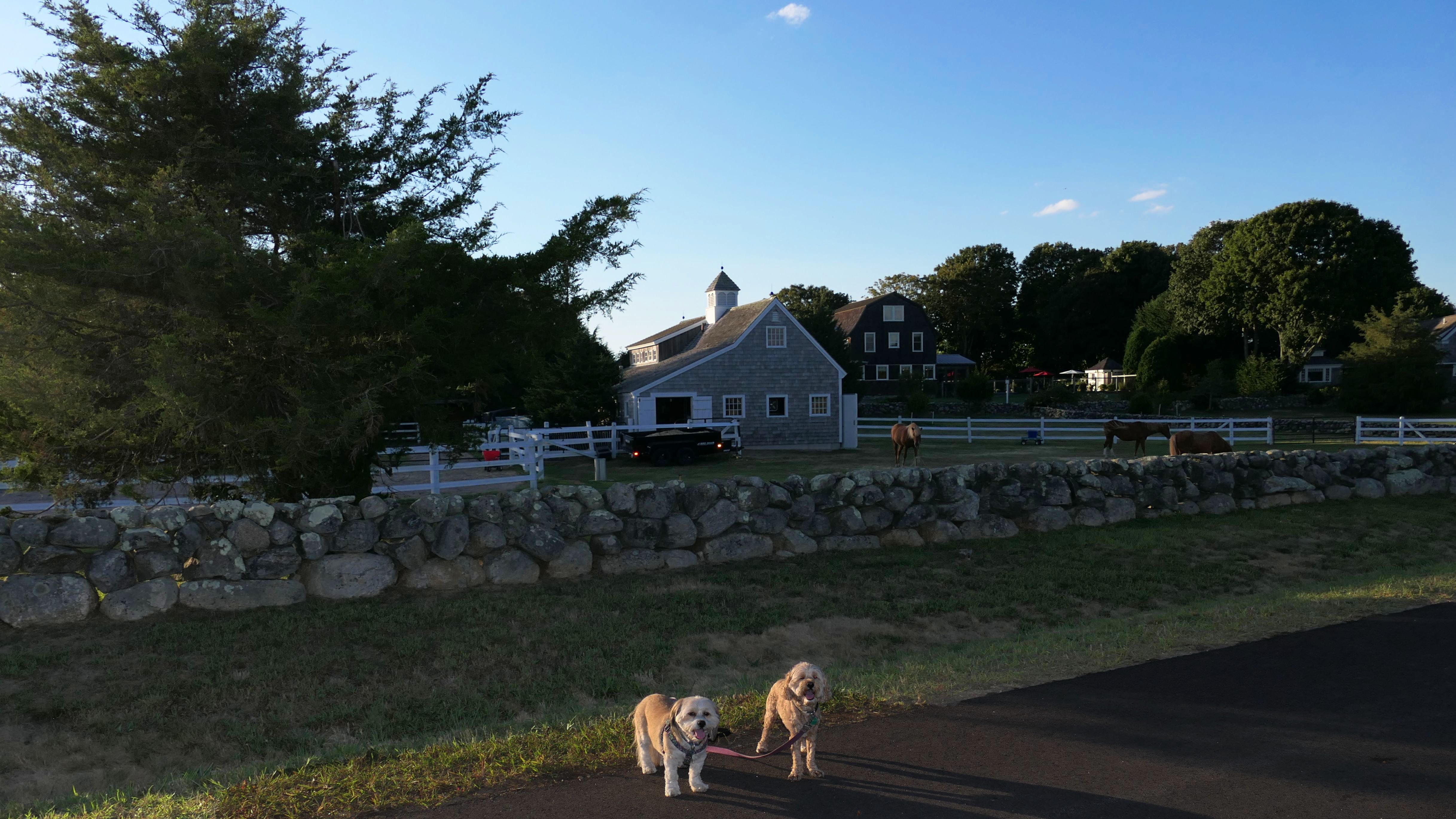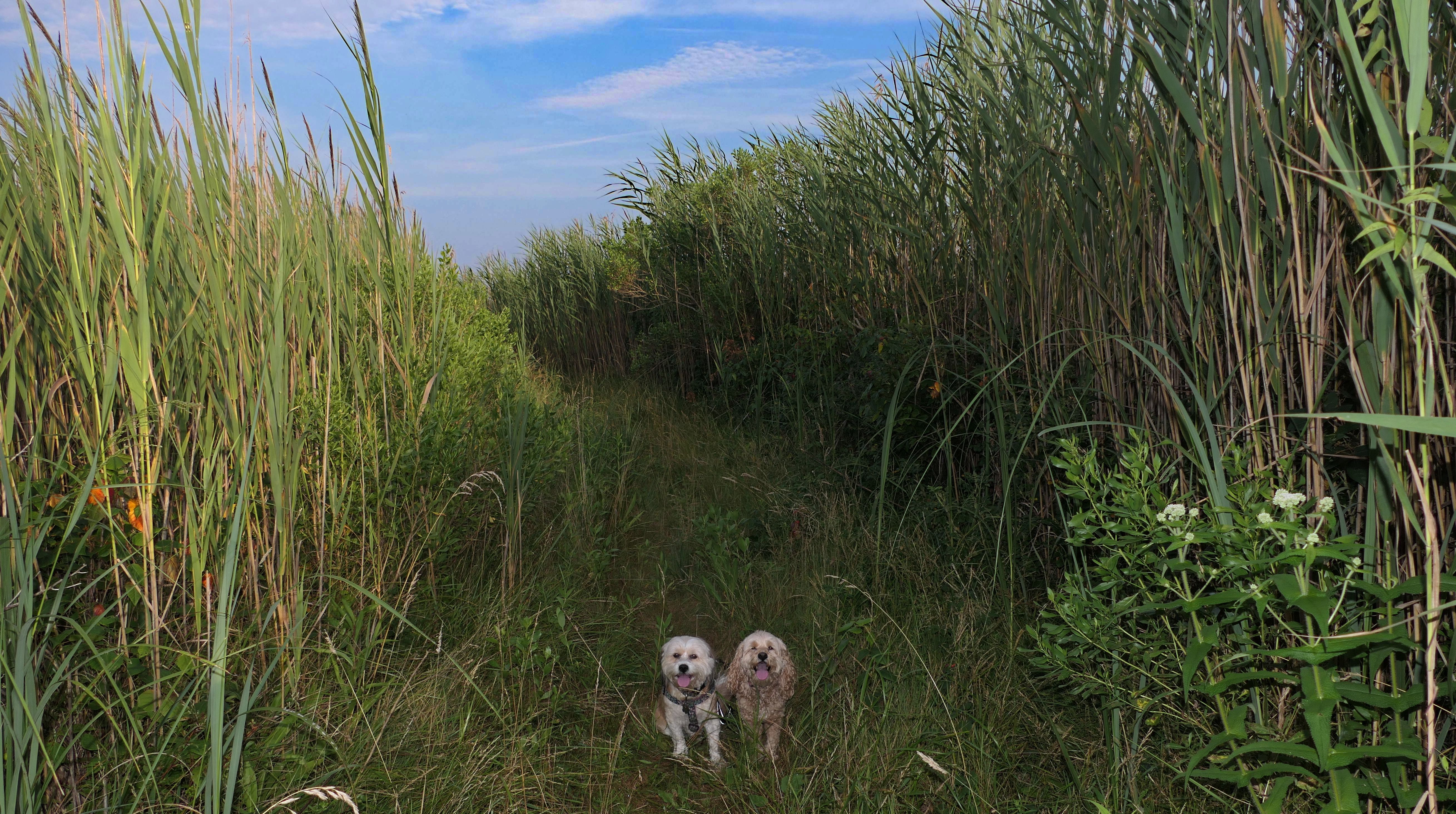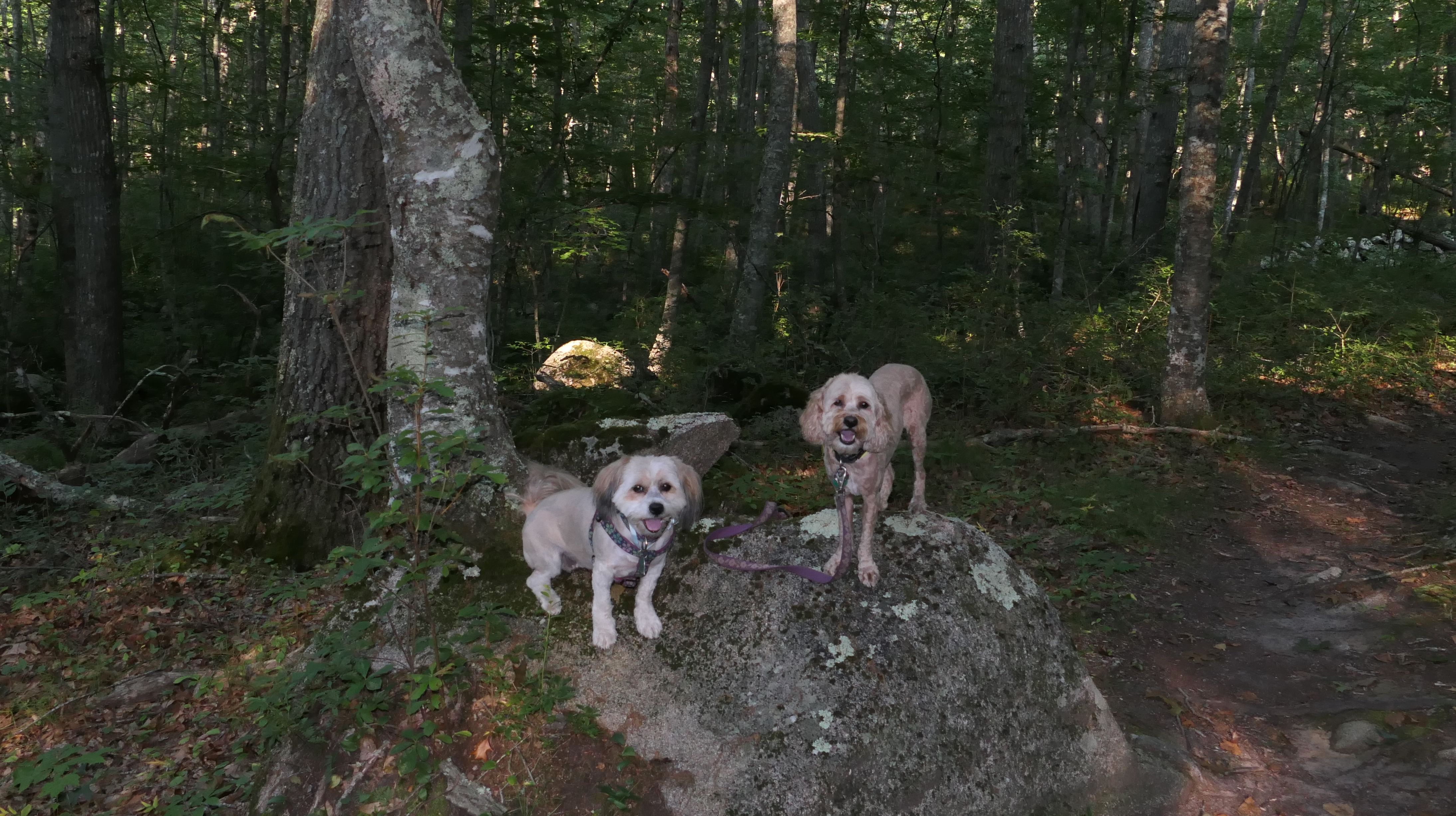 This looks like a nice place, with the stone walls and the cairns, and the salt pond, but this was a rough two mile hike. The trail is in the shape of a three prong fork, with the three prongs going out to the salt pond. The problem was that the kind of trails here need to be mowed, and they haven't been mowed in a while. Most of the trails were overgrown. The first part of the trail, sort of the handle of the fork if you will, is easy enough to traverse, despite the long grass, but each of three prongs caused challenges. The first one was the most overgrown, but the also the driest, with only a little bit of mud. We were able to get the closest to Winnapaug Pond here. The second and third trails were easy at the start, but got muddier and more overgrown the closer to the pond we got. I wound up carrying the dogs over long stretches on the 2nd trail, and we simply turned around when we reached the mud on the 3rd trail. I also had to pull a few ticks off both myself and the dogs when we got back to the car. The long grass is a breeding ground for ticks. While there was only a few ticks on us this time, I wouldn't advise coming here earlier in the season, when tick season is at it's peak. This seems like it could be a wonderful spot, but it needs a bit more maintenance.