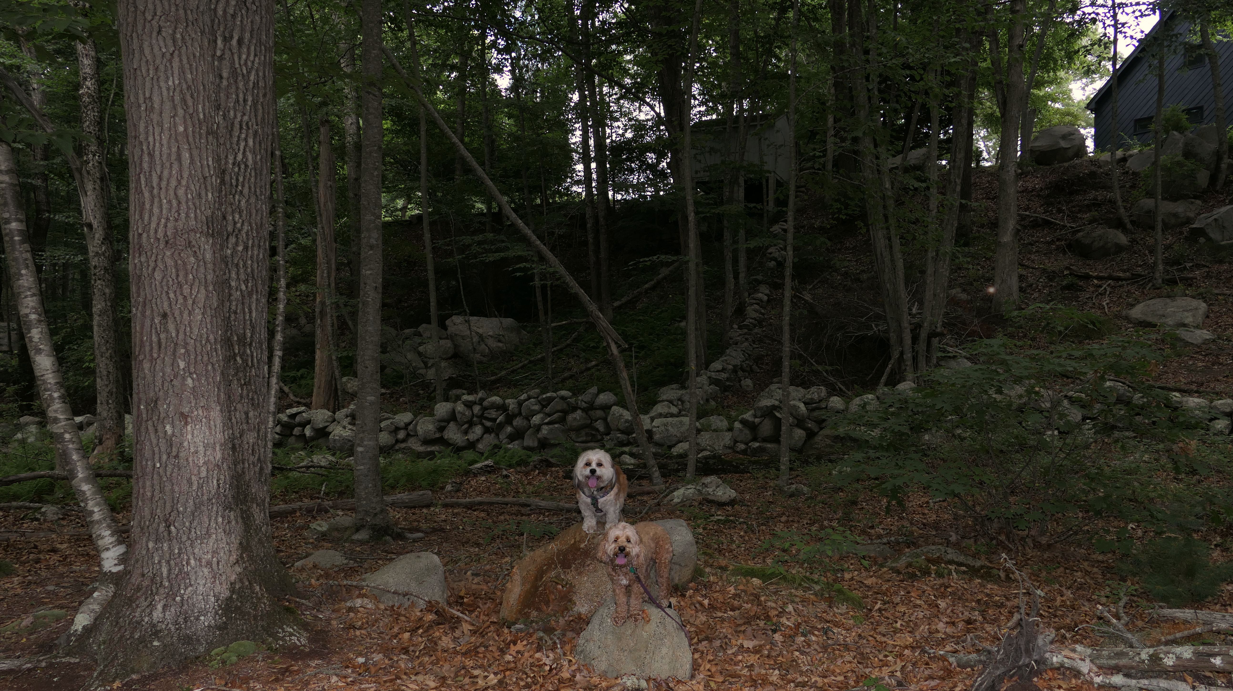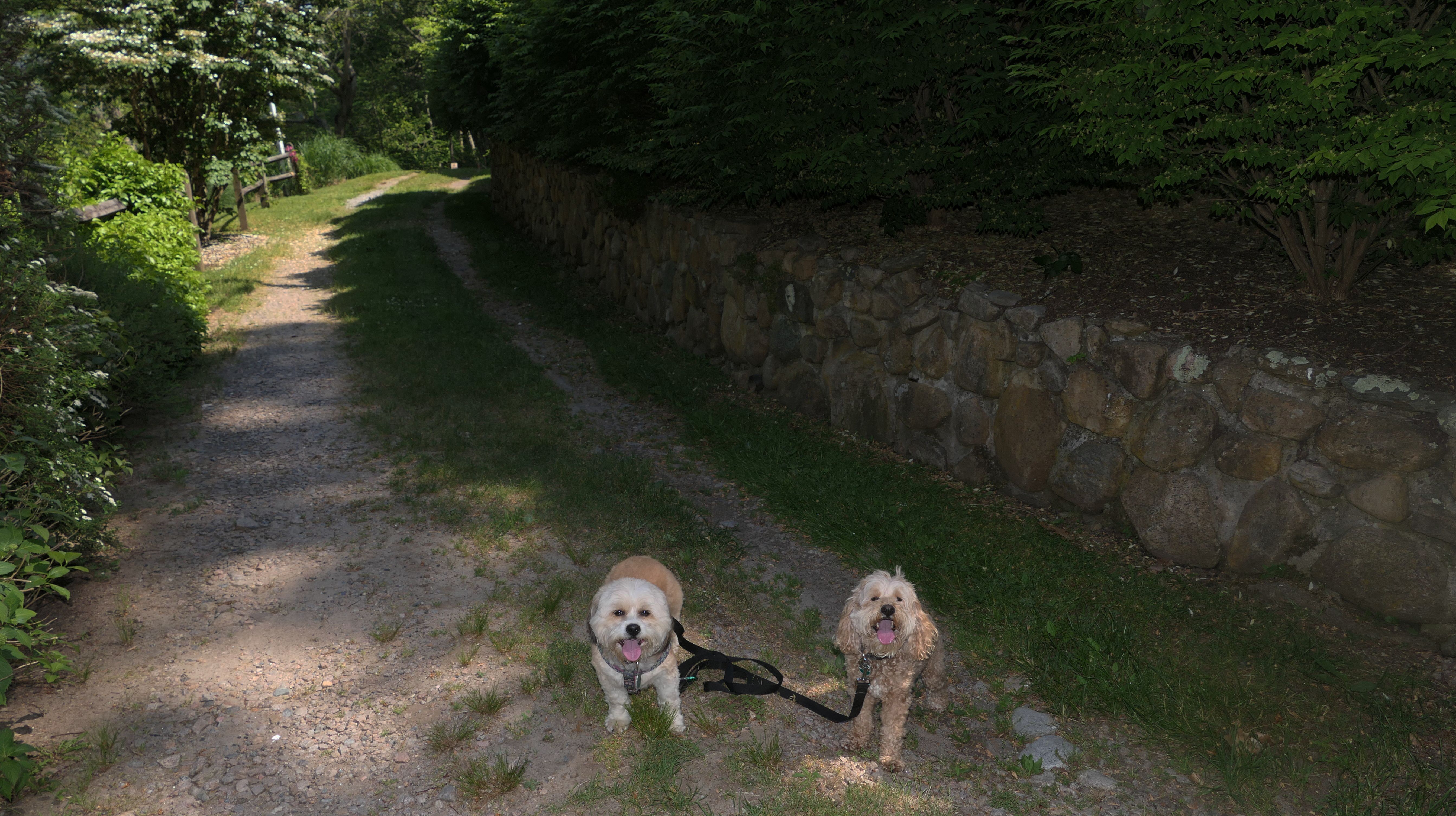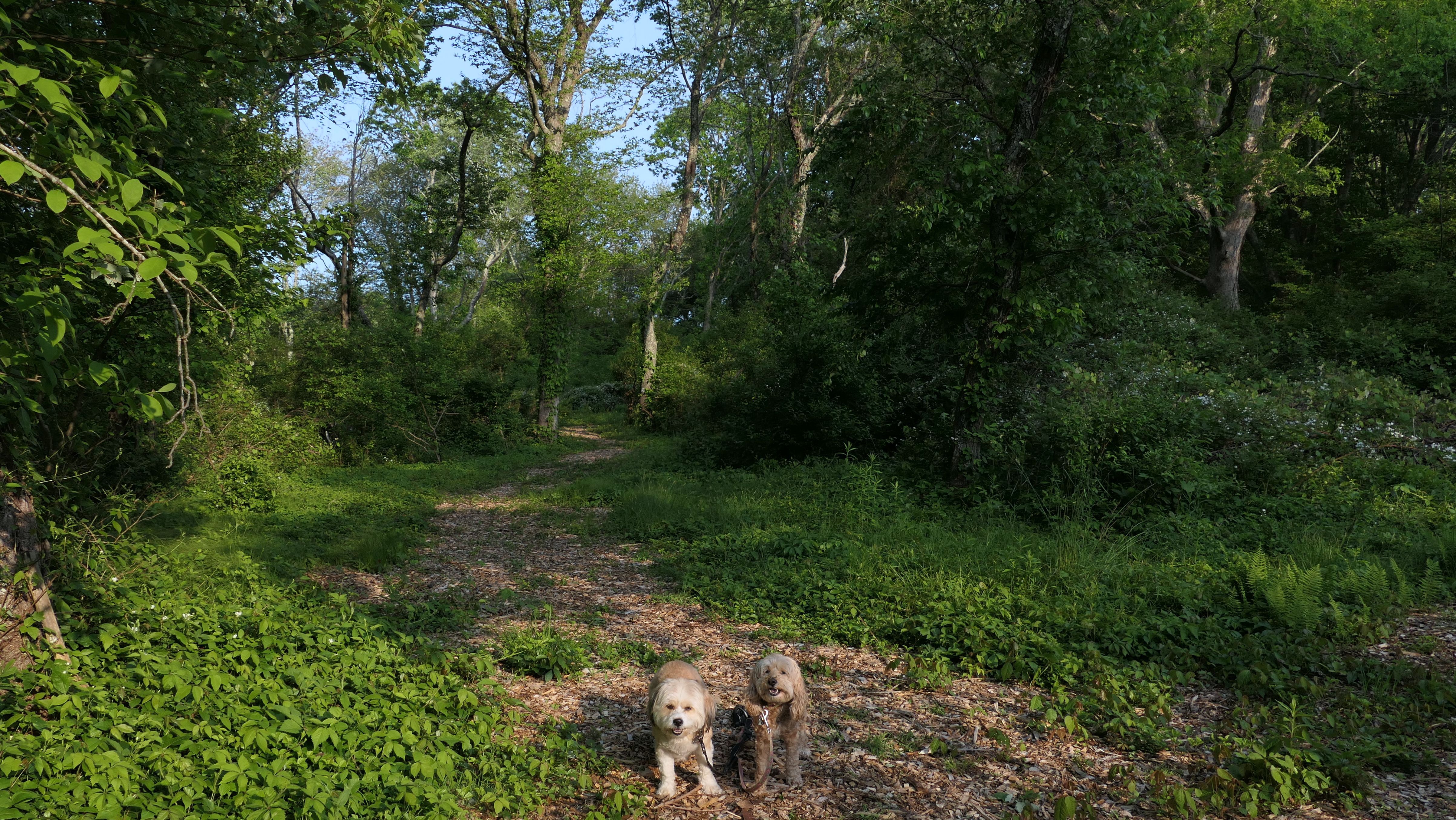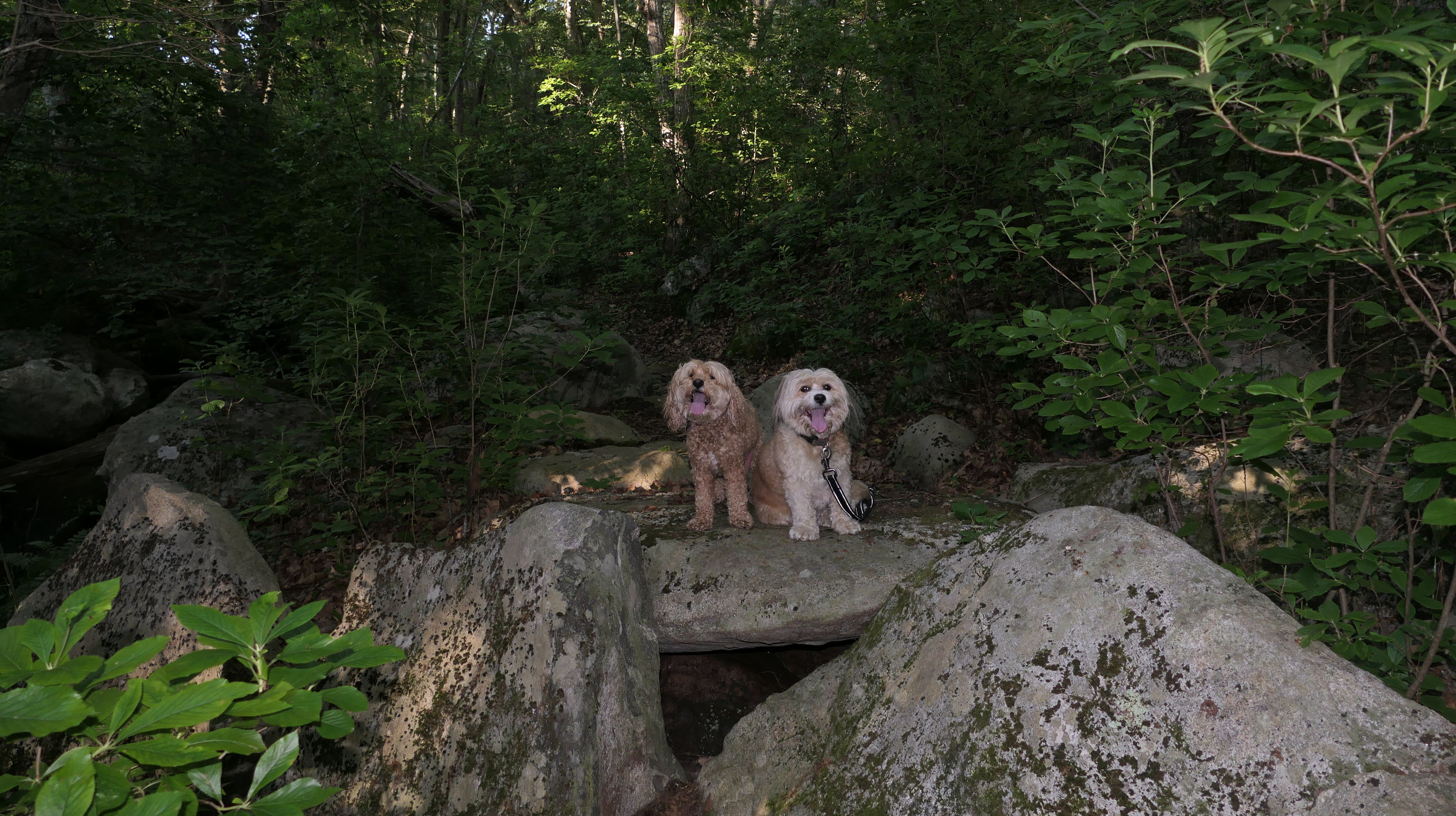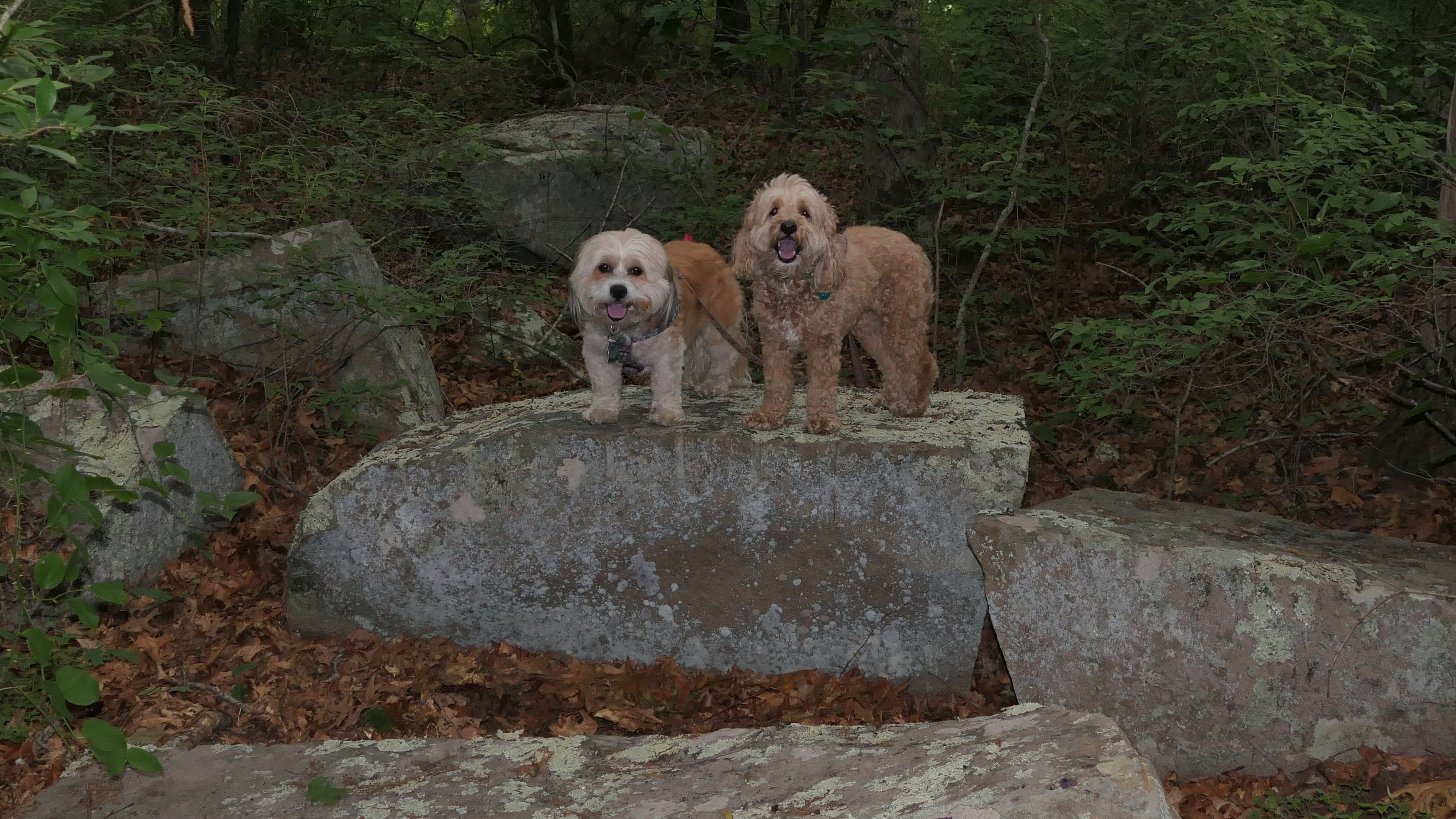 This looks like a nice place, with the stone walls and the cairns, and the salt pond, but this was a rough two mile hike. The trail is in the shape of a three prong fork, with the three prongs going out to the salt pond. The problem was that the kind of trails here need to be mowed, and they haven't been mowed in a while. Most of the trails were overgrown. The first part of the trail, sort of the handle of the fork if you will, is easy enough to traverse, despite the long grass, but each of three prongs caused challenges. The first one was the most overgrown, but the also the driest, with only a little bit of mud. We were able to get the closest to Winnapaug Pond here. The second and third trails were easy at the start, but got muddier and more overgrown the closer to the pond we got. I wound up carrying the dogs over long stretches on the 2nd trail, and we simply turned around when we reached the mud on the 3rd trail. I also had to pull a few ticks off both myself and the dogs when we got back to the car. The long grass is a breeding ground for ticks. While there was only a few ticks on us this time, I wouldn't advise coming here earlier in the season, when tick season is at it's peak. This seems like it could be a wonderful spot, but it needs a bit more maintenance.