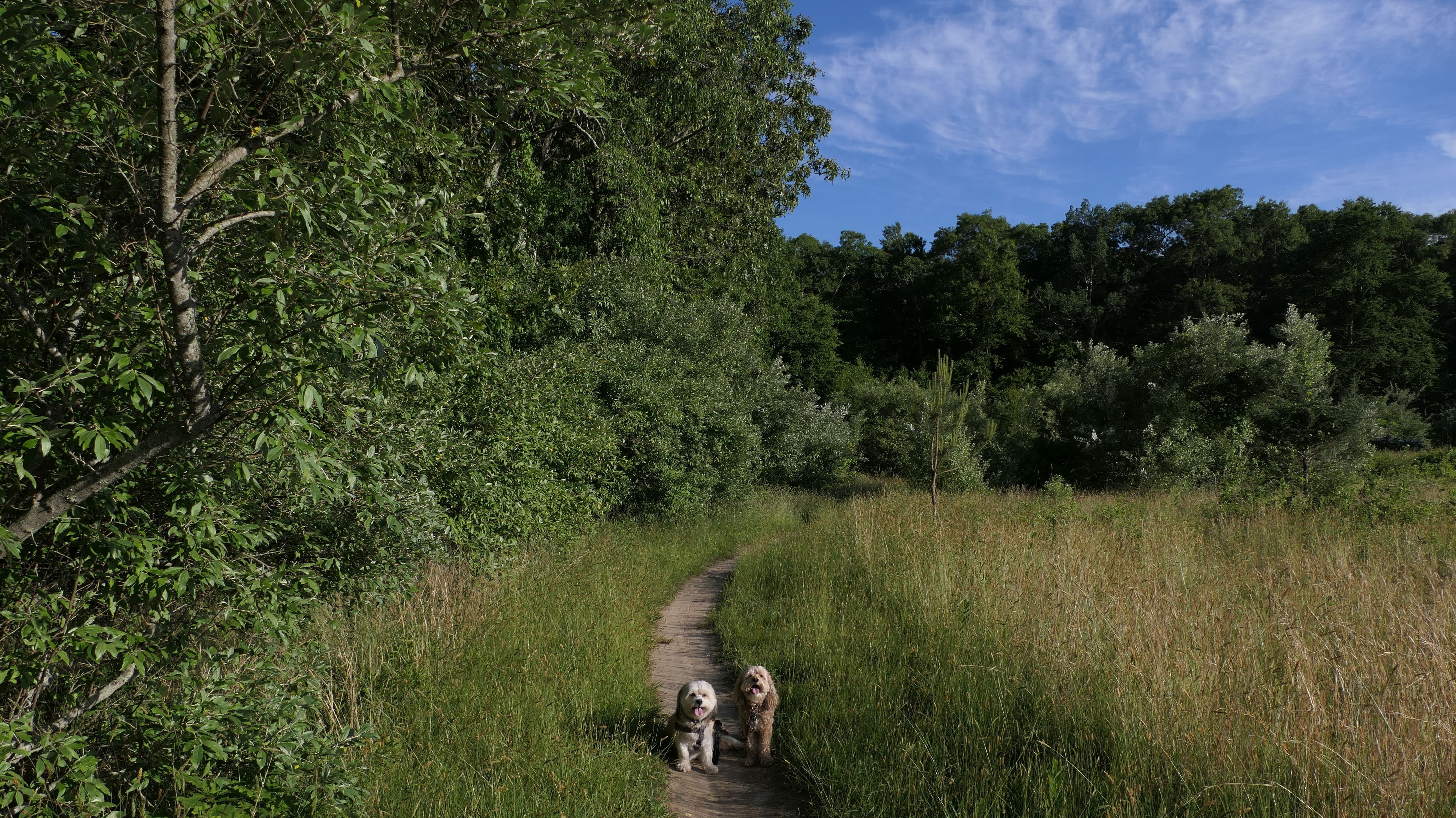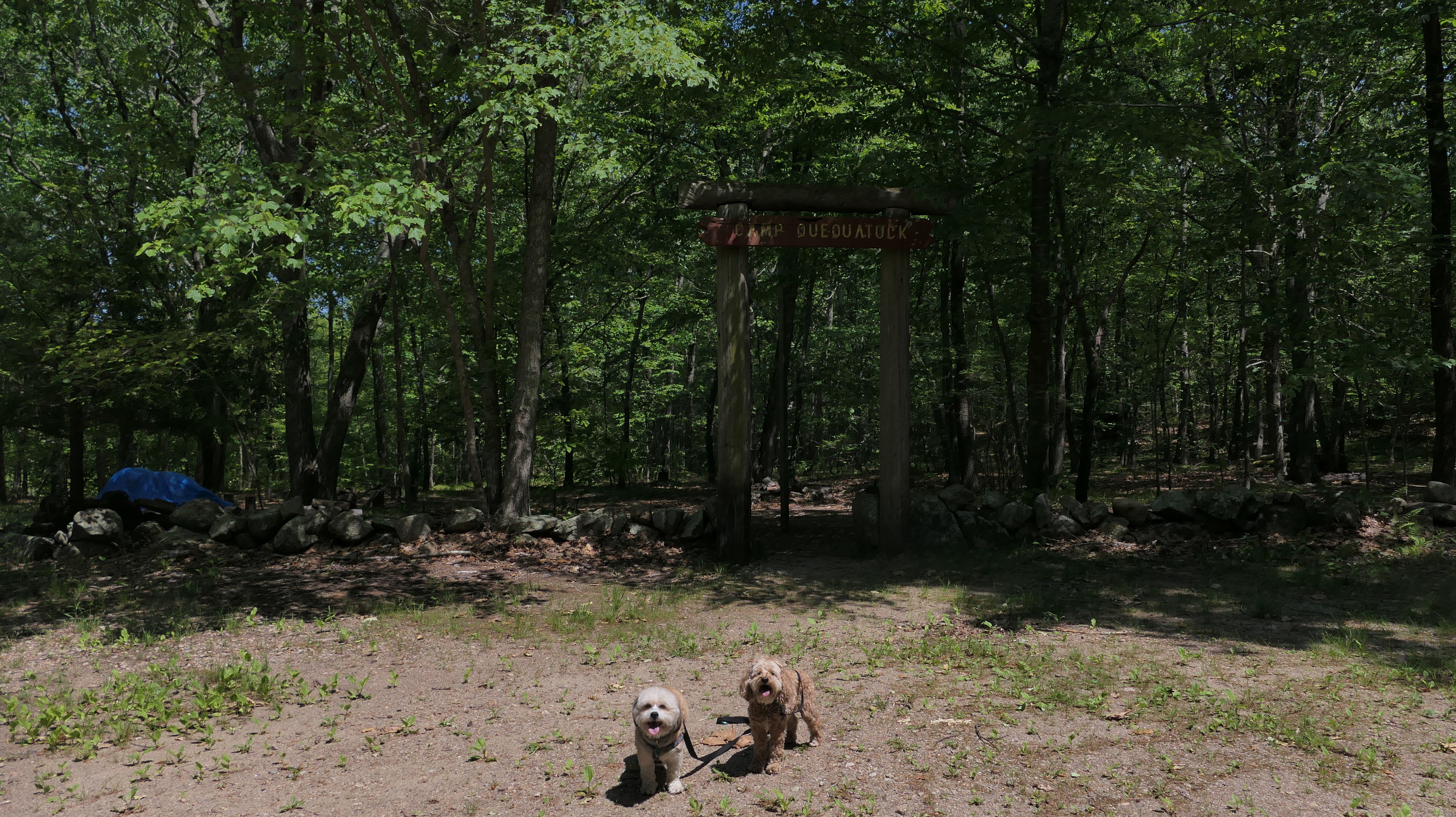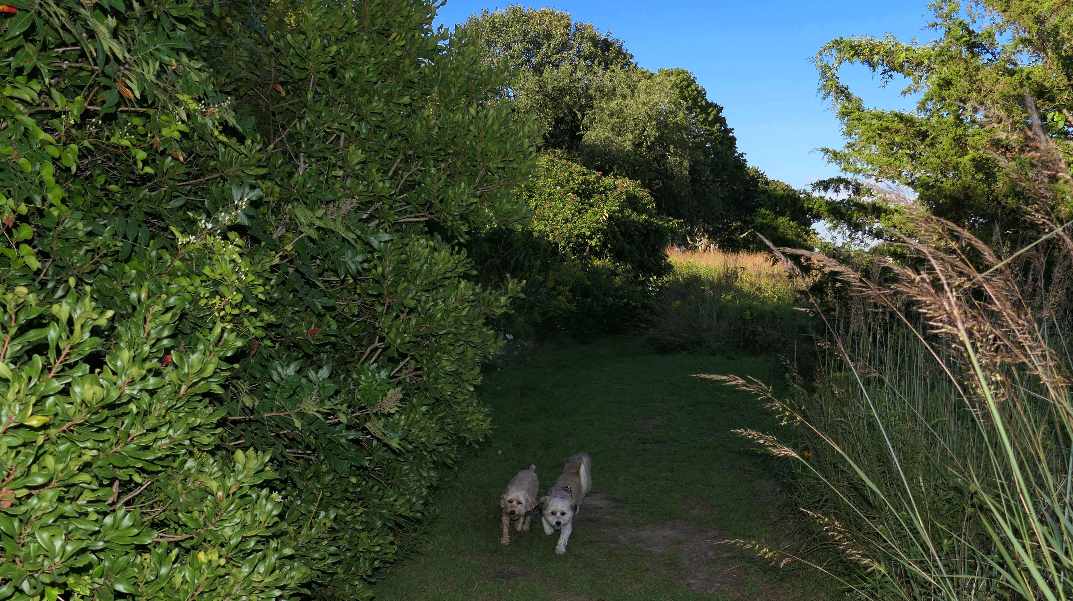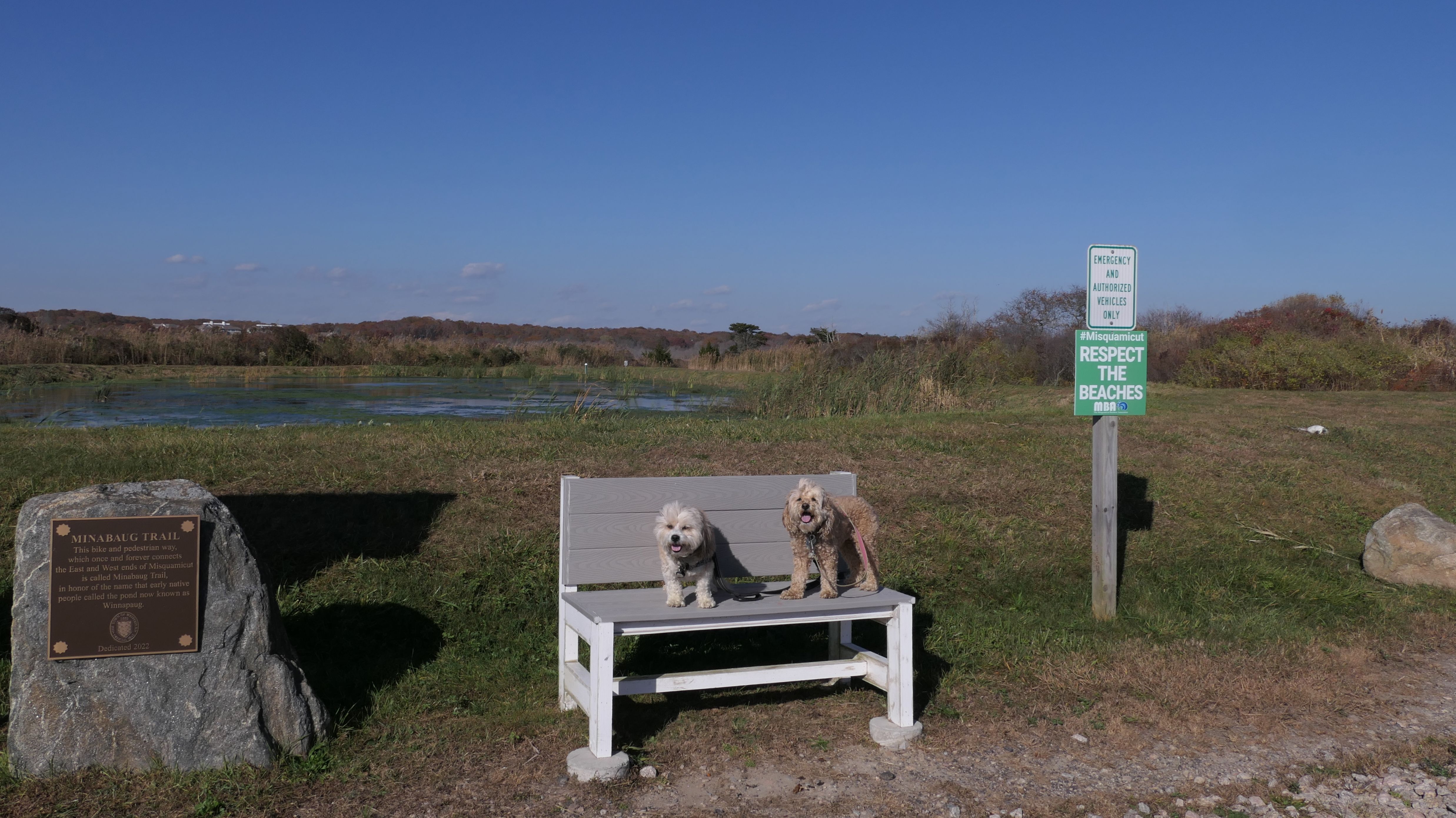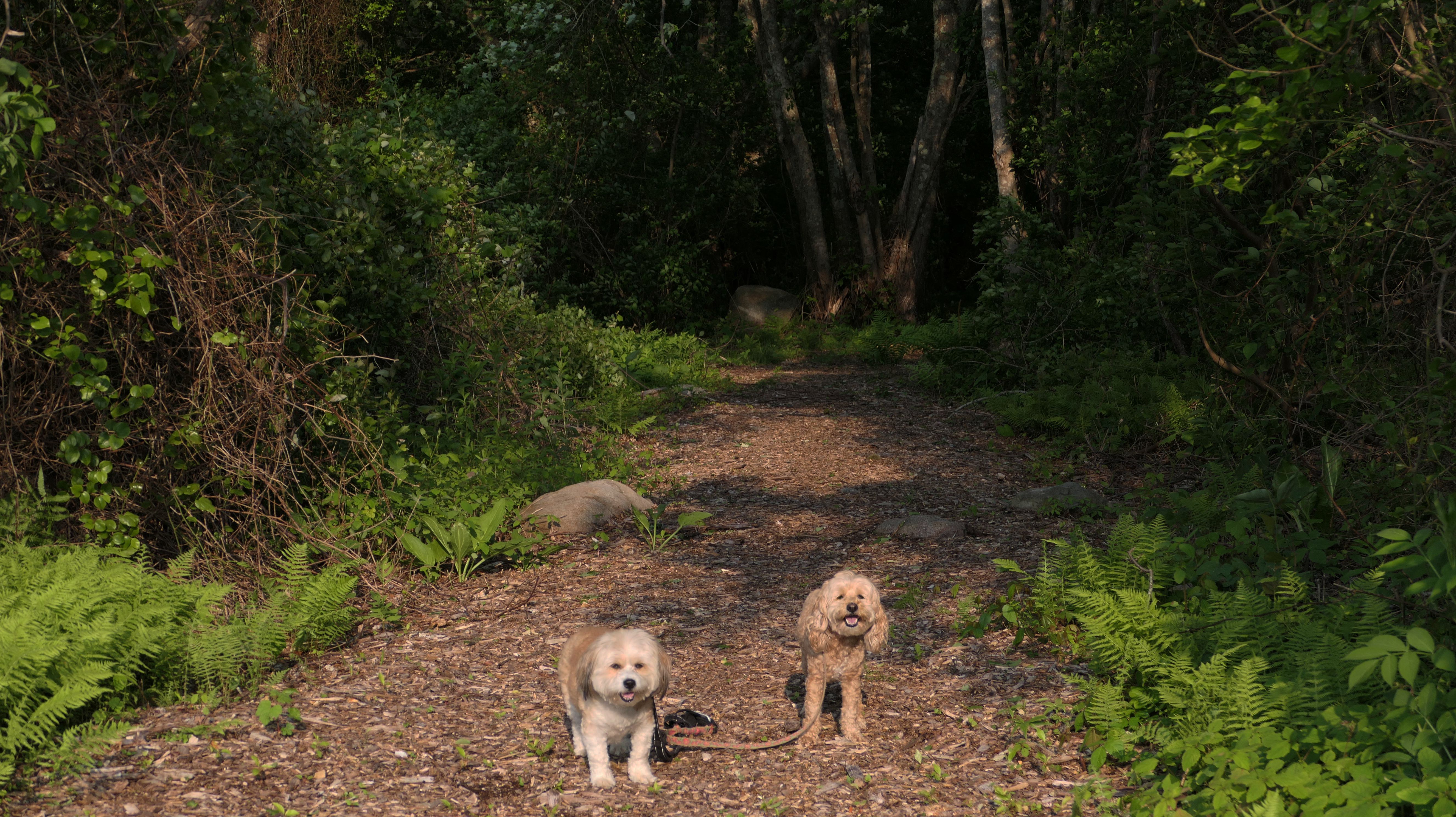 This looks like a nice place, with the stone walls and the cairns, and the salt pond, but this was a rough two mile hike. The trail is in the shape of a three prong fork, with the three prongs going out to the salt pond. The problem was that the kind of trails here need to be mowed, and they haven't been mowed in a while. Most of the trails were overgrown. The first part of the trail, sort of the handle of the fork if you will, is easy enough to traverse, despite the long grass, but each of three prongs caused challenges. The first one was the most overgrown, but the also the driest, with only a little bit of mud. We were able to get the closest to Winnapaug Pond here. The second and third trails were easy at the start, but got muddier and more overgrown the closer to the pond we got. I wound up carrying the dogs over long stretches on the 2nd trail, and we simply turned around when we reached the mud on the 3rd trail. I also had to pull a few ticks off both myself and the dogs when we got back to the car. The long grass is a breeding ground for ticks. While there was only a few ticks on us this time, I wouldn't advise coming here earlier in the season, when tick season is at it's peak. This seems like it could be a wonderful spot, but it needs a bit more maintenance.