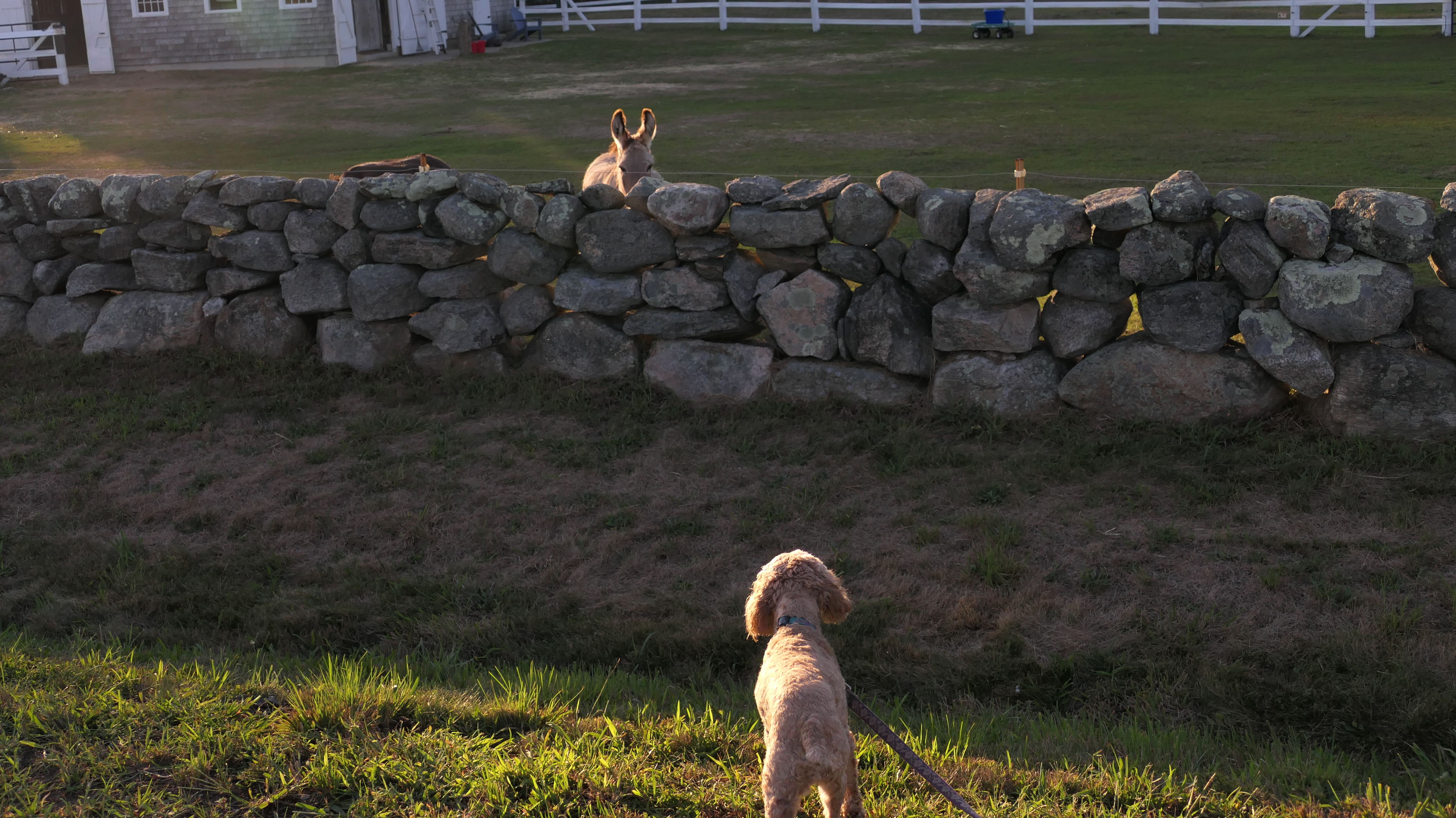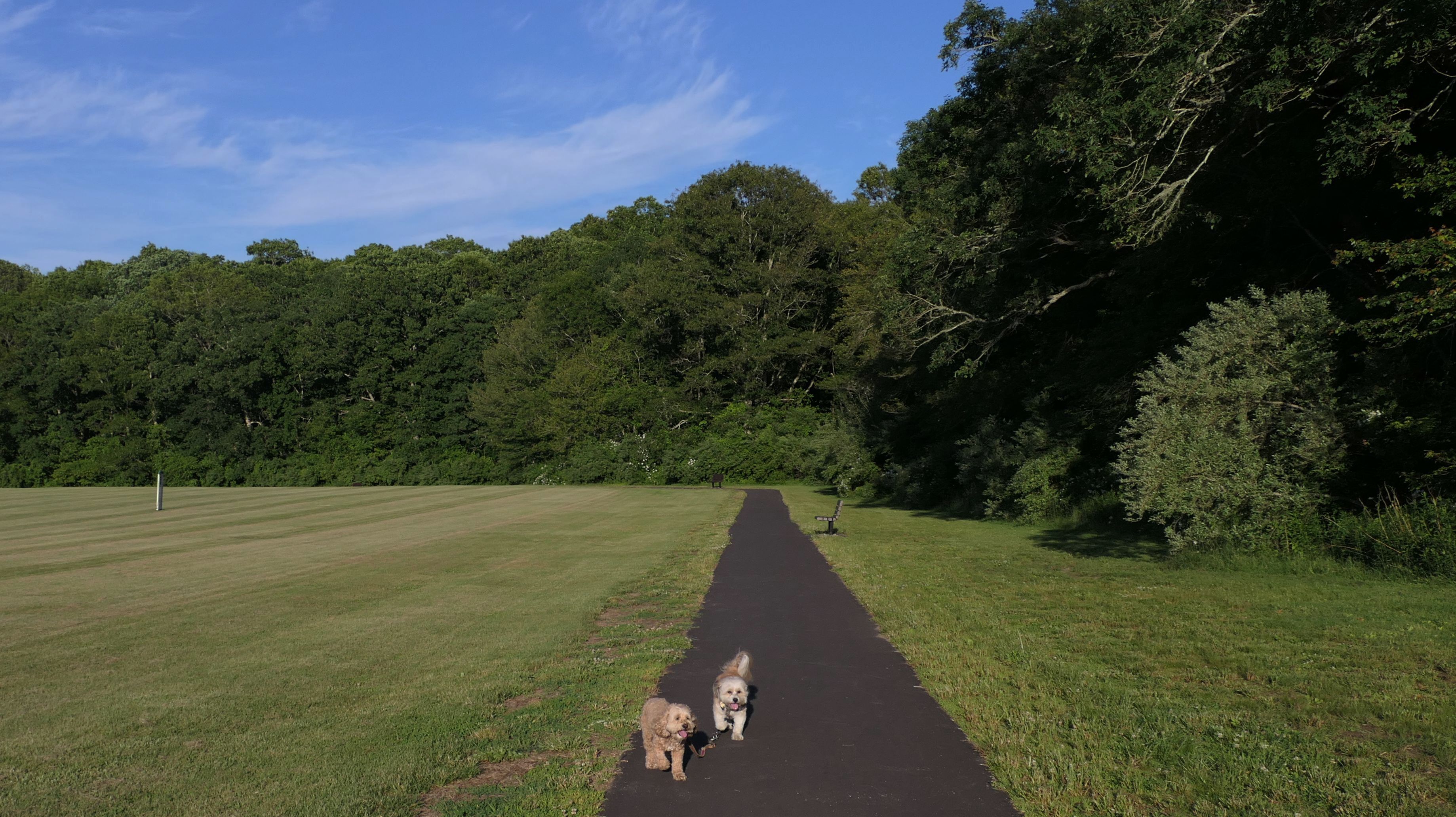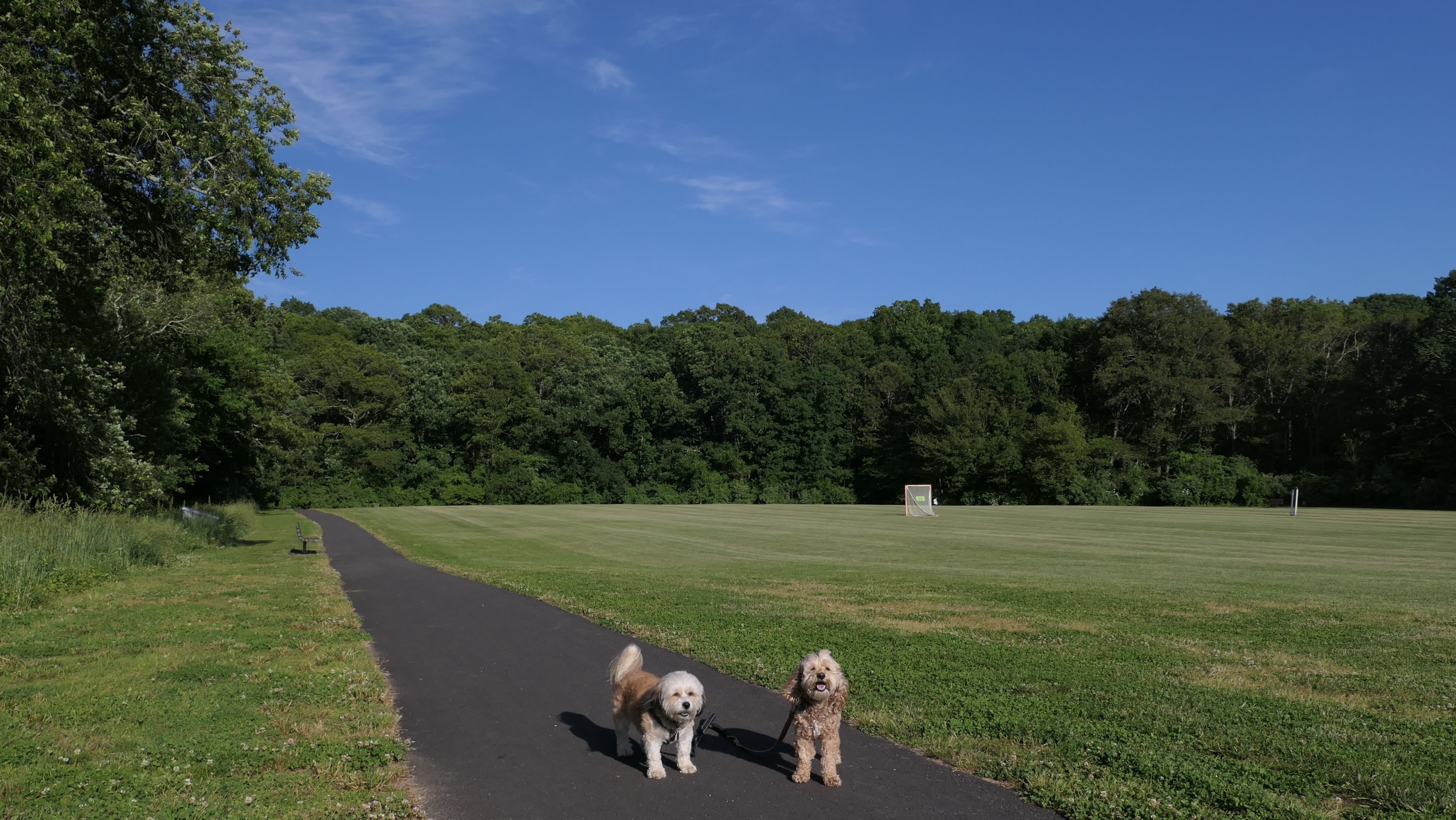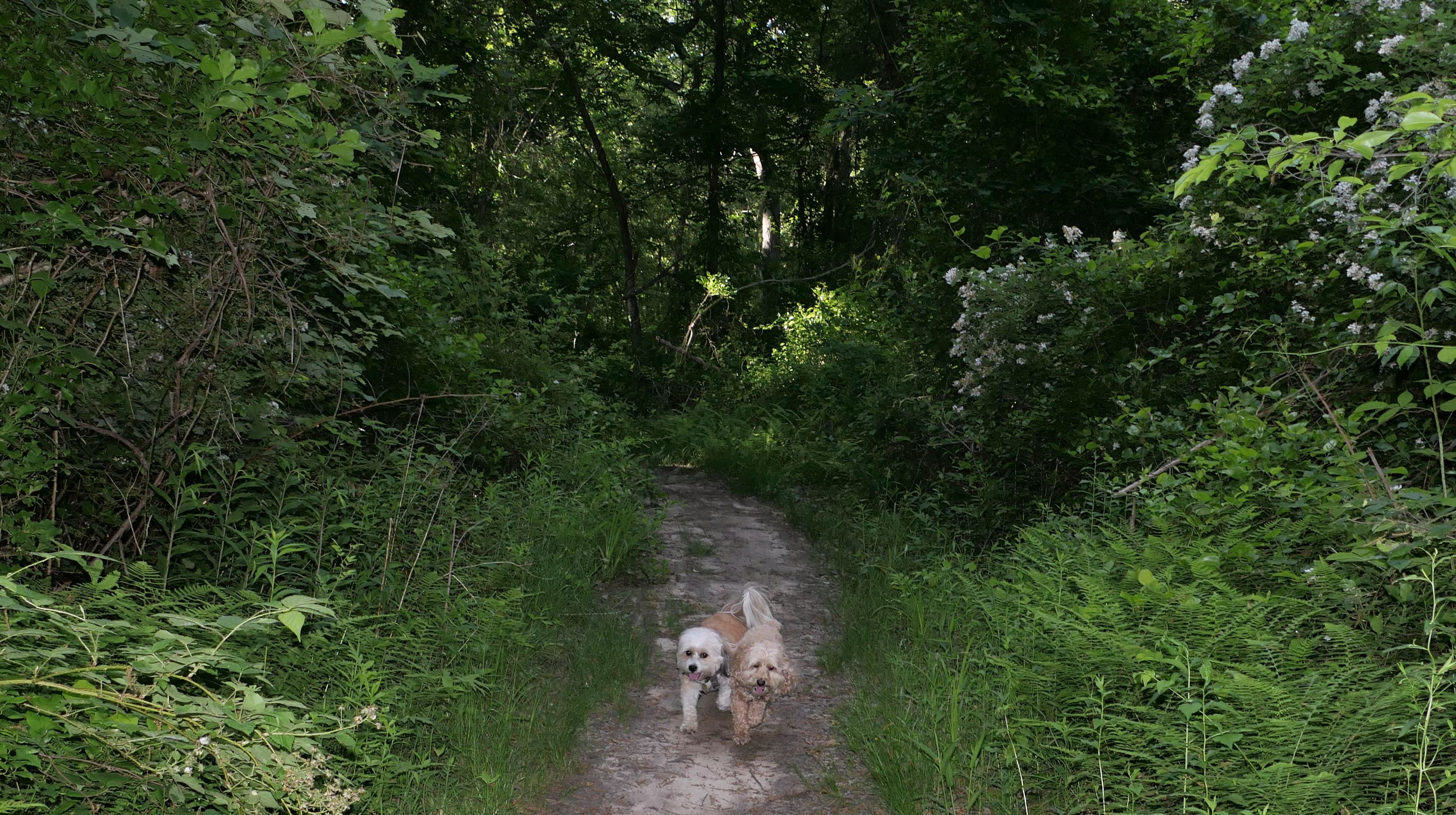 This looks like a nice place, with the stone walls and the cairns, and the salt pond, but this was a rough two mile hike. The trail is in the shape of a three prong fork, with the three prongs going out to the salt pond. The problem was that the kind of trails here need to be mowed, and they haven't been mowed in a while. Most of the trails were overgrown. The first part of the trail, sort of the handle of the fork if you will, is easy enough to traverse, despite the long grass, but each of three prongs caused challenges. The first one was the most overgrown, but the also the driest, with only a little bit of mud. We were able to get the closest to Winnapaug Pond here. The second and third trails were easy at the start, but got muddier and more overgrown the closer to the pond we got. I wound up carrying the dogs over long stretches on the 2nd trail, and we simply turned around when we reached the mud on the 3rd trail. I also had to pull a few ticks off both myself and the dogs when we got back to the car. The long grass is a breeding ground for ticks. While there was only a few ticks on us this time, I wouldn't advise coming here earlier in the season, when tick season is at it's peak. This seems like it could be a wonderful spot, but it needs a bit more maintenance.
