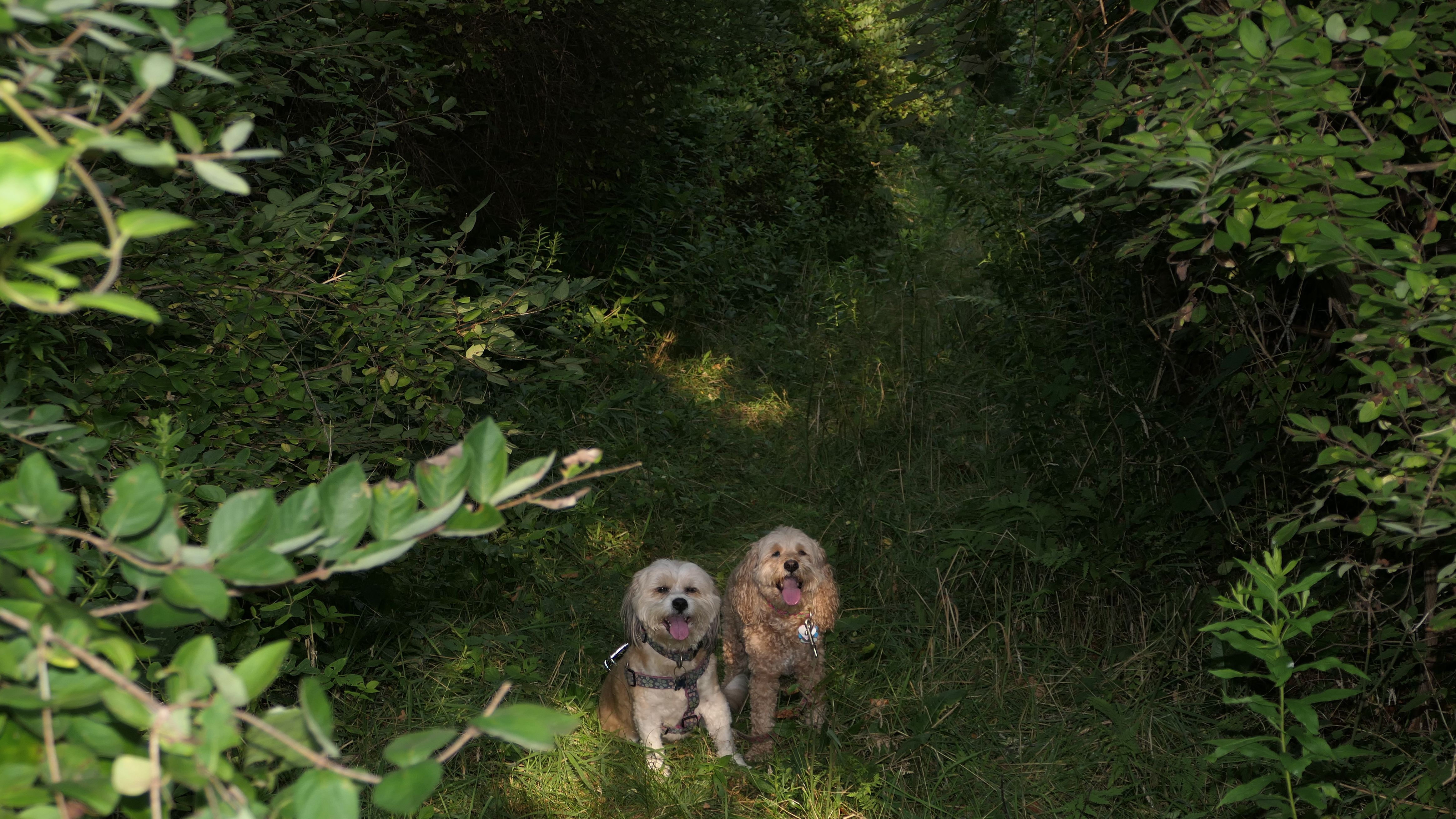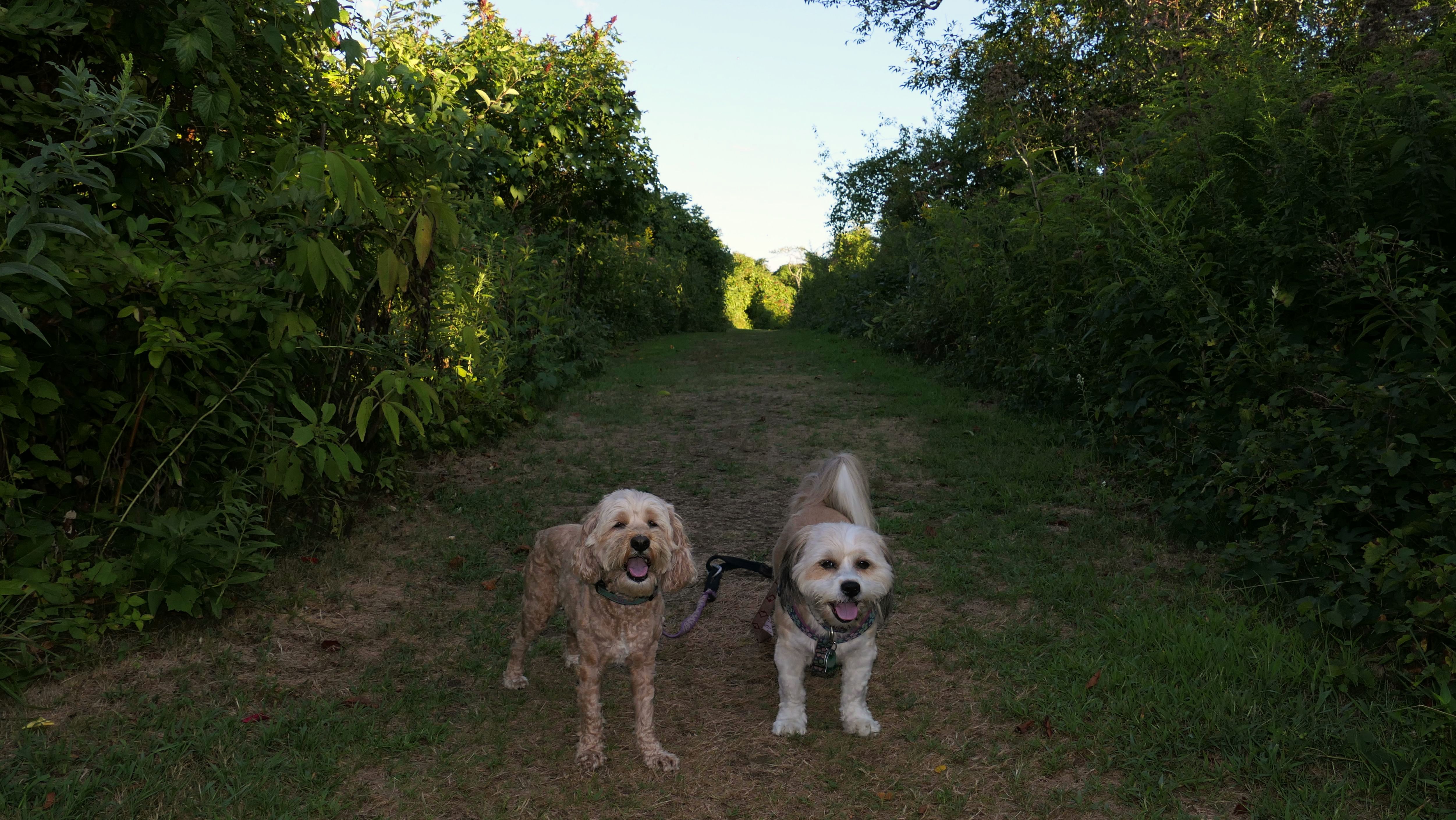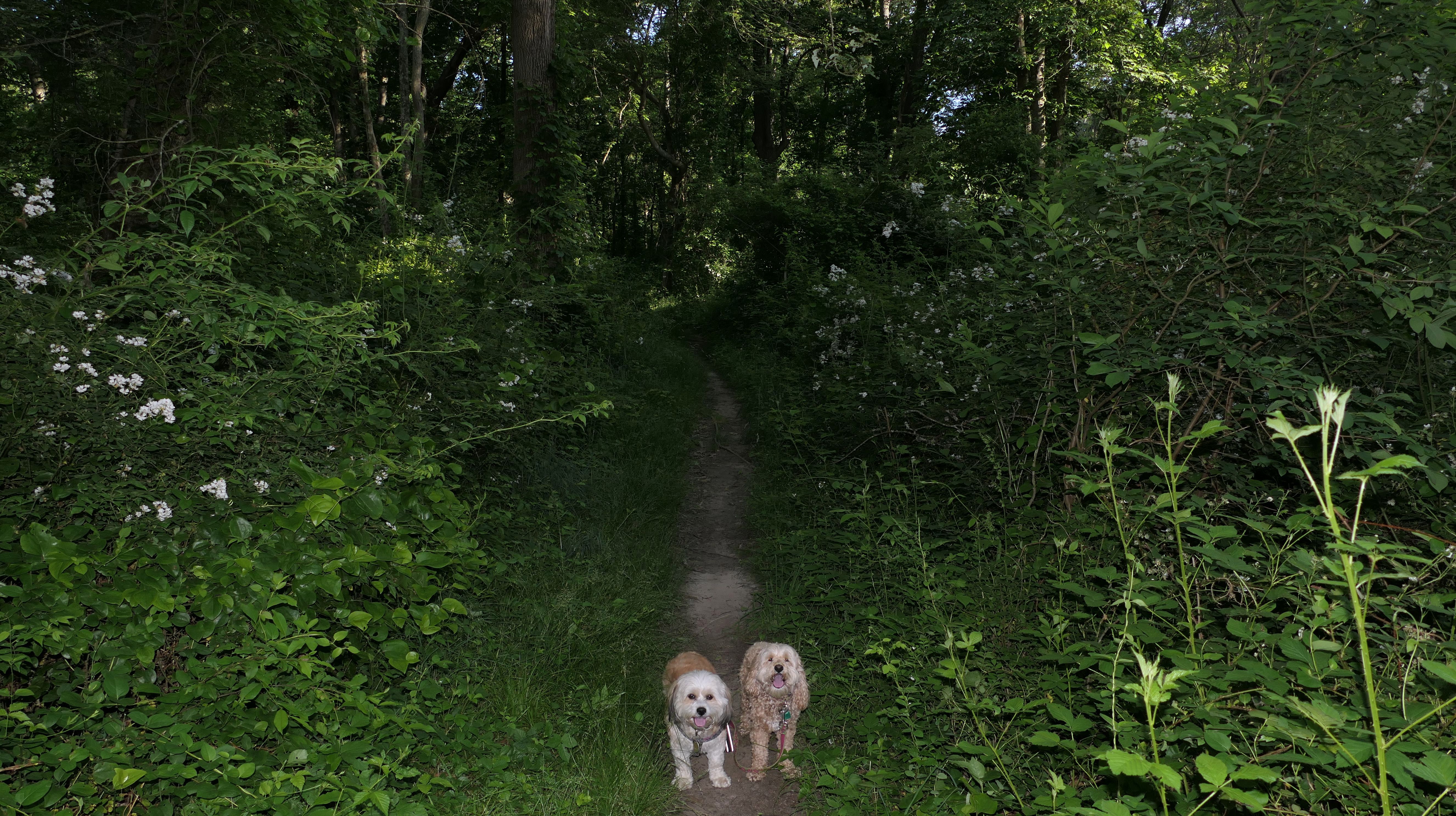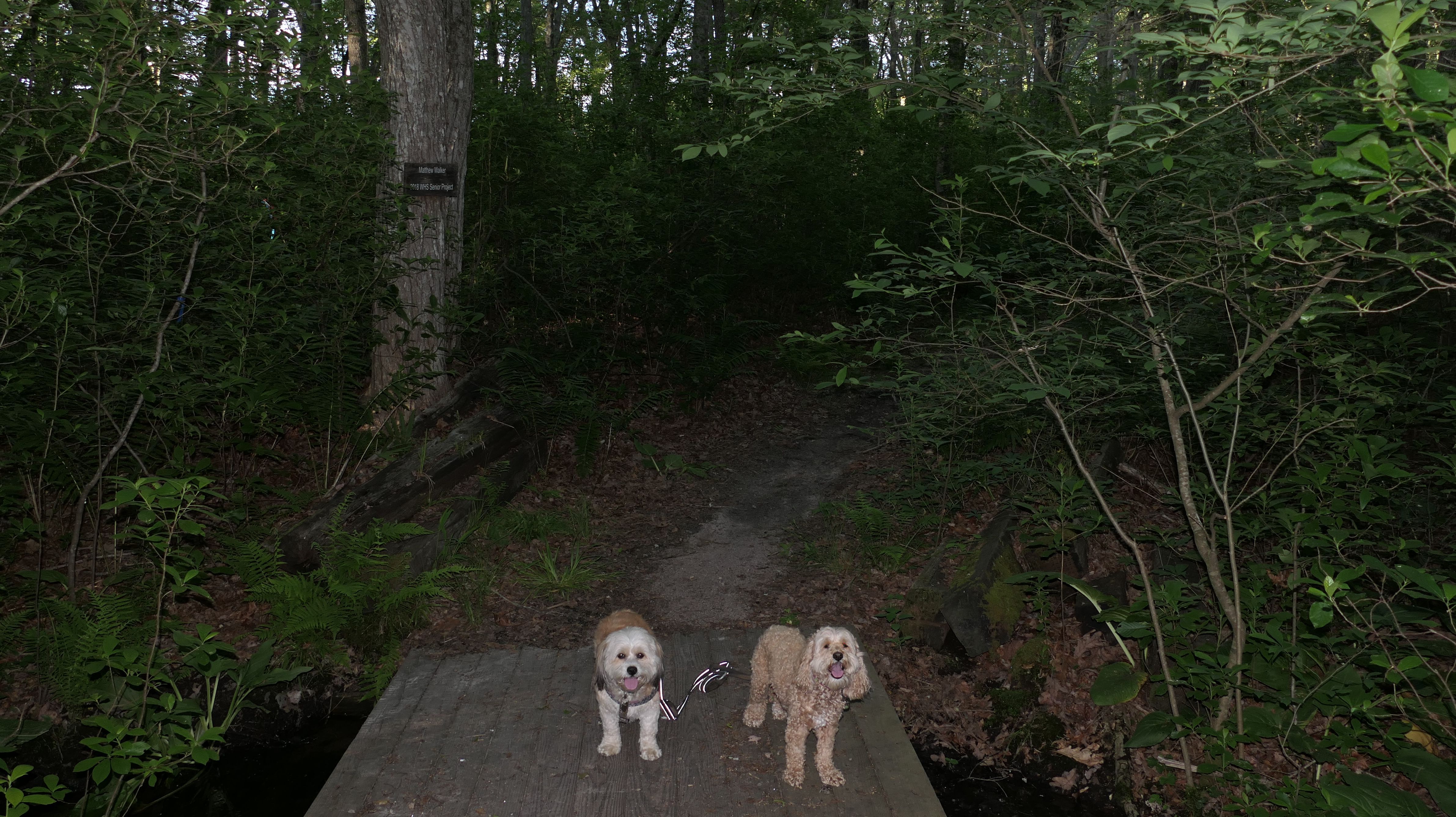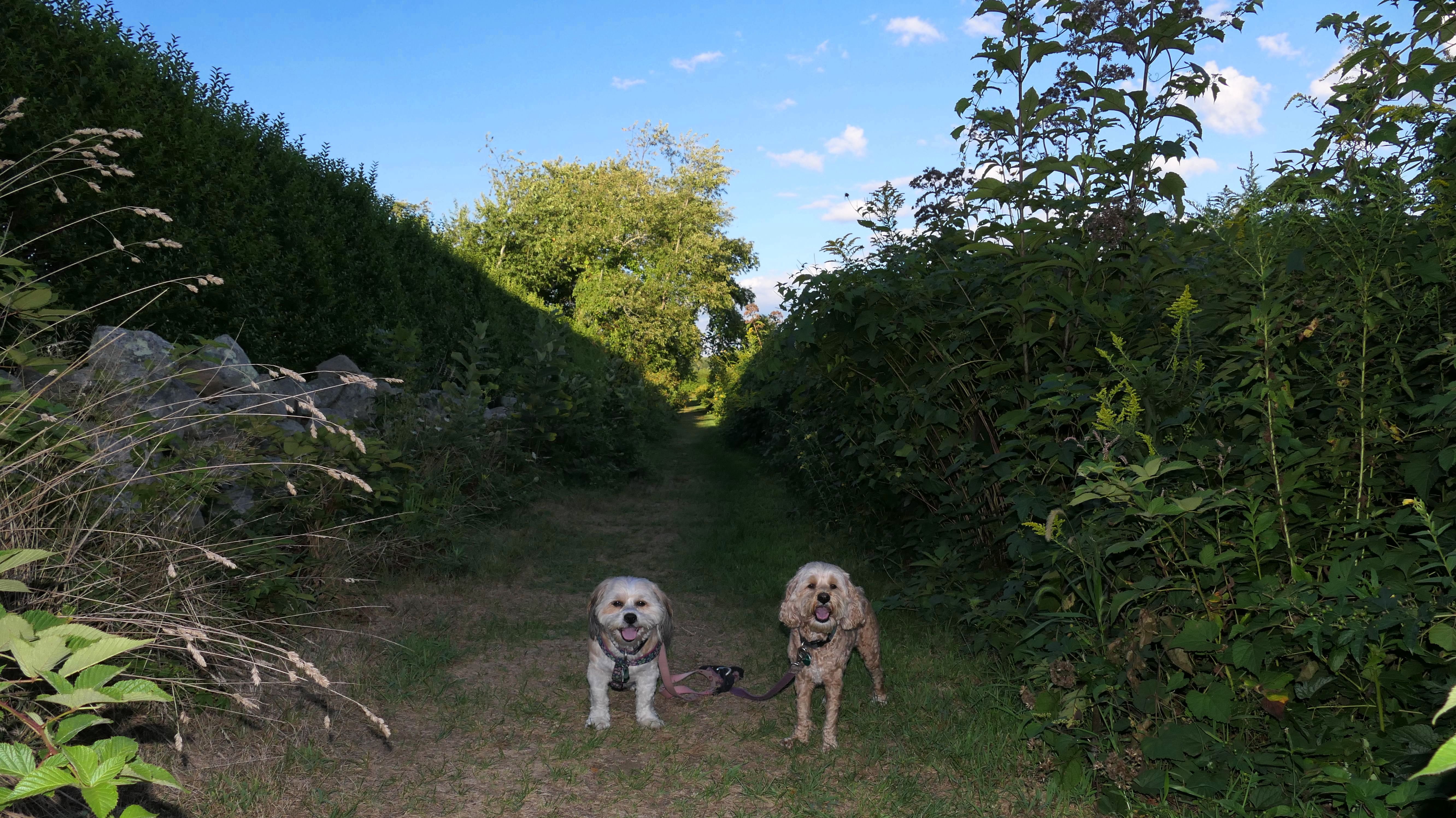 This looks like a nice place, with the stone walls and the cairns, and the salt pond, but this was a rough two mile hike. The trail is in the shape of a three prong fork, with the three prongs going out to the salt pond. The problem was that the kind of trails here need to be mowed, and they haven't been mowed in a while. Most of the trails were overgrown. The first part of the trail, sort of the handle of the fork if you will, is easy enough to traverse, despite the long grass, but each of three prongs caused challenges. The first one was the most overgrown, but the also the driest, with only a little bit of mud. We were able to get the closest to Winnapaug Pond here. The second and third trails were easy at the start, but got muddier and more overgrown the closer to the pond we got. I wound up carrying the dogs over long stretches on the 2nd trail, and we simply turned around when we reached the mud on the 3rd trail. I also had to pull a few ticks off both myself and the dogs when we got back to the car. The long grass is a breeding ground for ticks. While there was only a few ticks on us this time, I wouldn't advise coming here earlier in the season, when tick season is at it's peak. This seems like it could be a wonderful spot, but it needs a bit more maintenance.