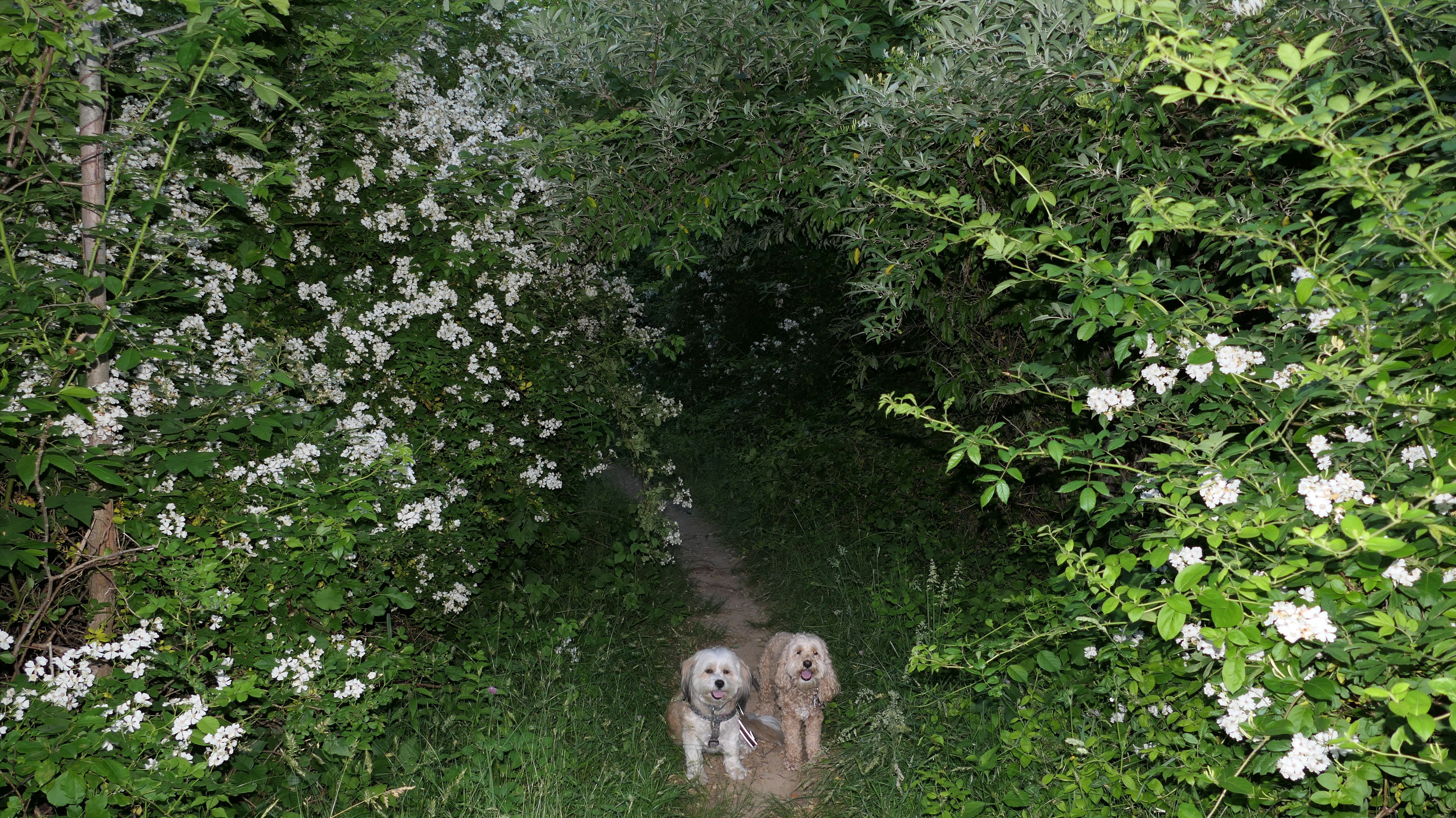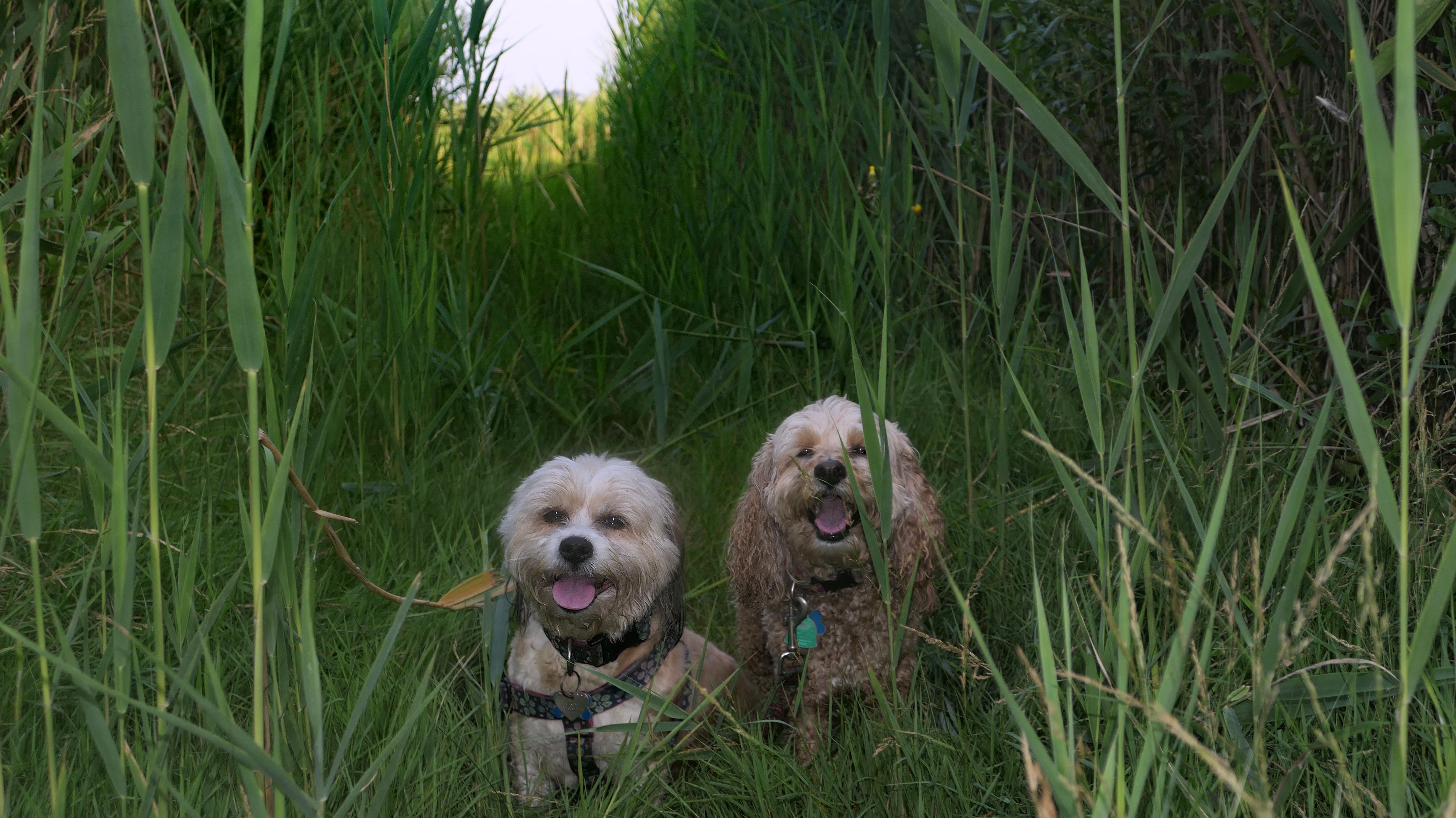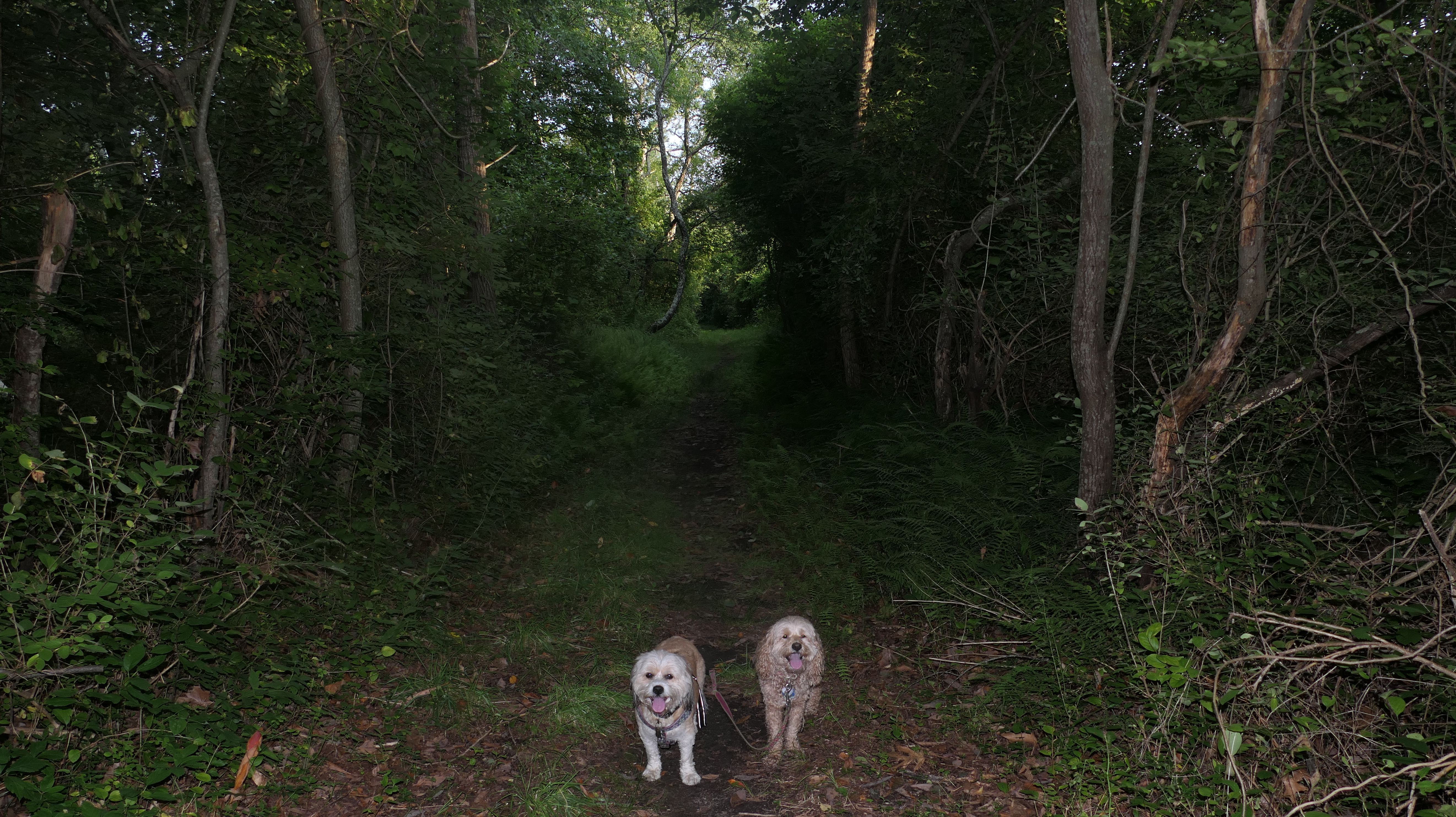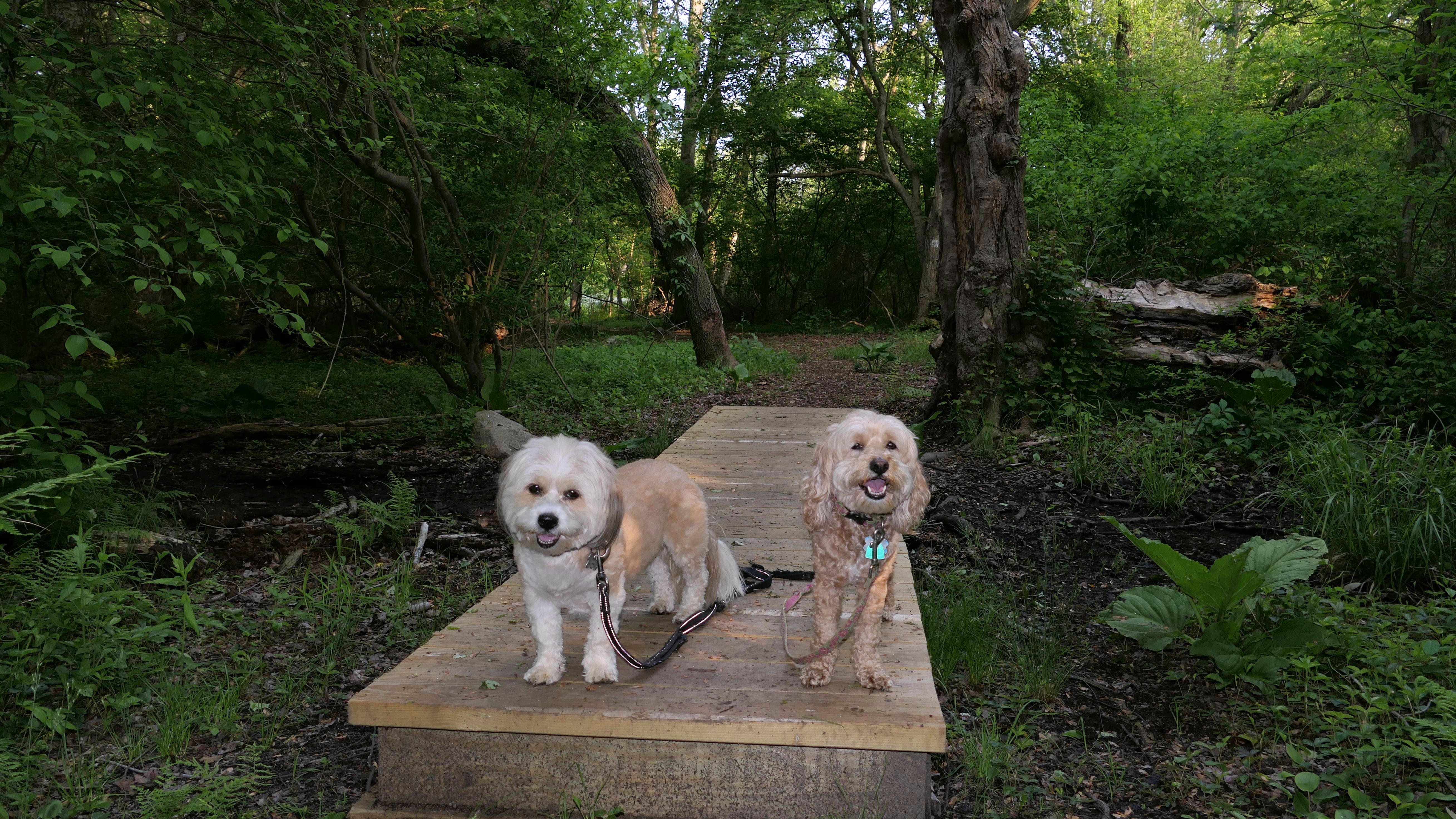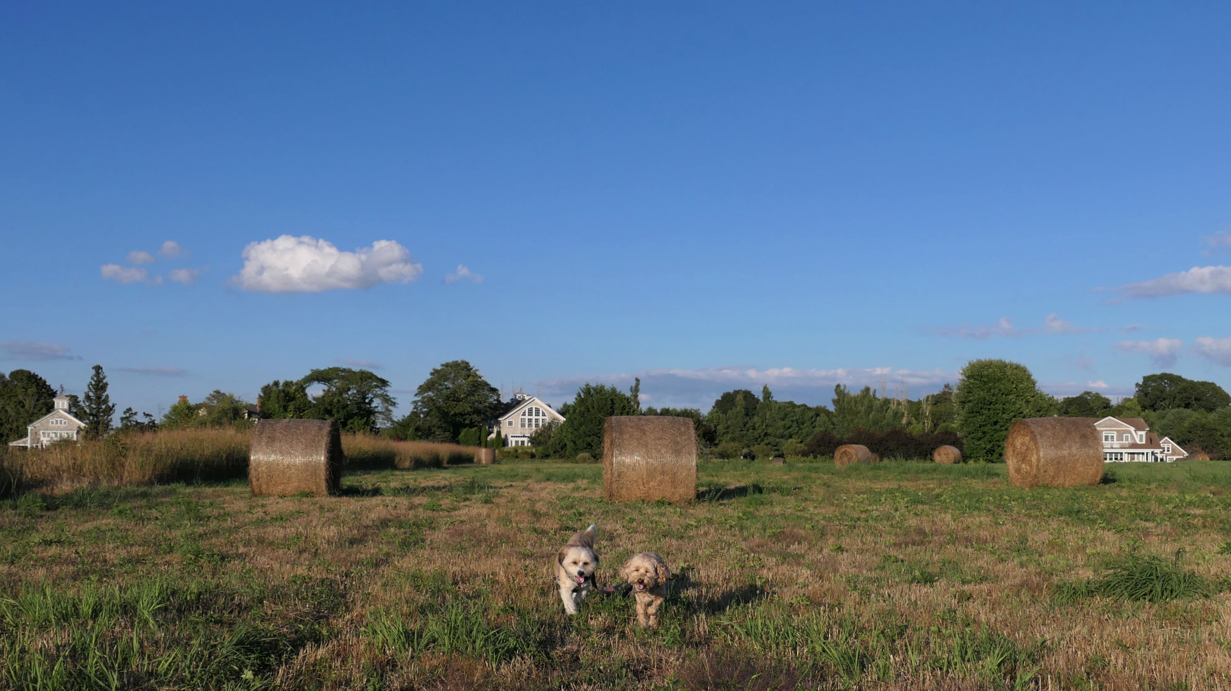 This looks like a nice place, with the stone walls and the cairns, and the salt pond, but this was a rough two mile hike. The trail is in the shape of a three prong fork, with the three prongs going out to the salt pond. The problem was that the kind of trails here need to be mowed, and they haven't been mowed in a while. Most of the trails were overgrown. The first part of the trail, sort of the handle of the fork if you will, is easy enough to traverse, despite the long grass, but each of three prongs caused challenges. The first one was the most overgrown, but the also the driest, with only a little bit of mud. We were able to get the closest to Winnapaug Pond here. The second and third trails were easy at the start, but got muddier and more overgrown the closer to the pond we got. I wound up carrying the dogs over long stretches on the 2nd trail, and we simply turned around when we reached the mud on the 3rd trail. I also had to pull a few ticks off both myself and the dogs when we got back to the car. The long grass is a breeding ground for ticks. While there was only a few ticks on us this time, I wouldn't advise coming here earlier in the season, when tick season is at it's peak. This seems like it could be a wonderful spot, but it needs a bit more maintenance.