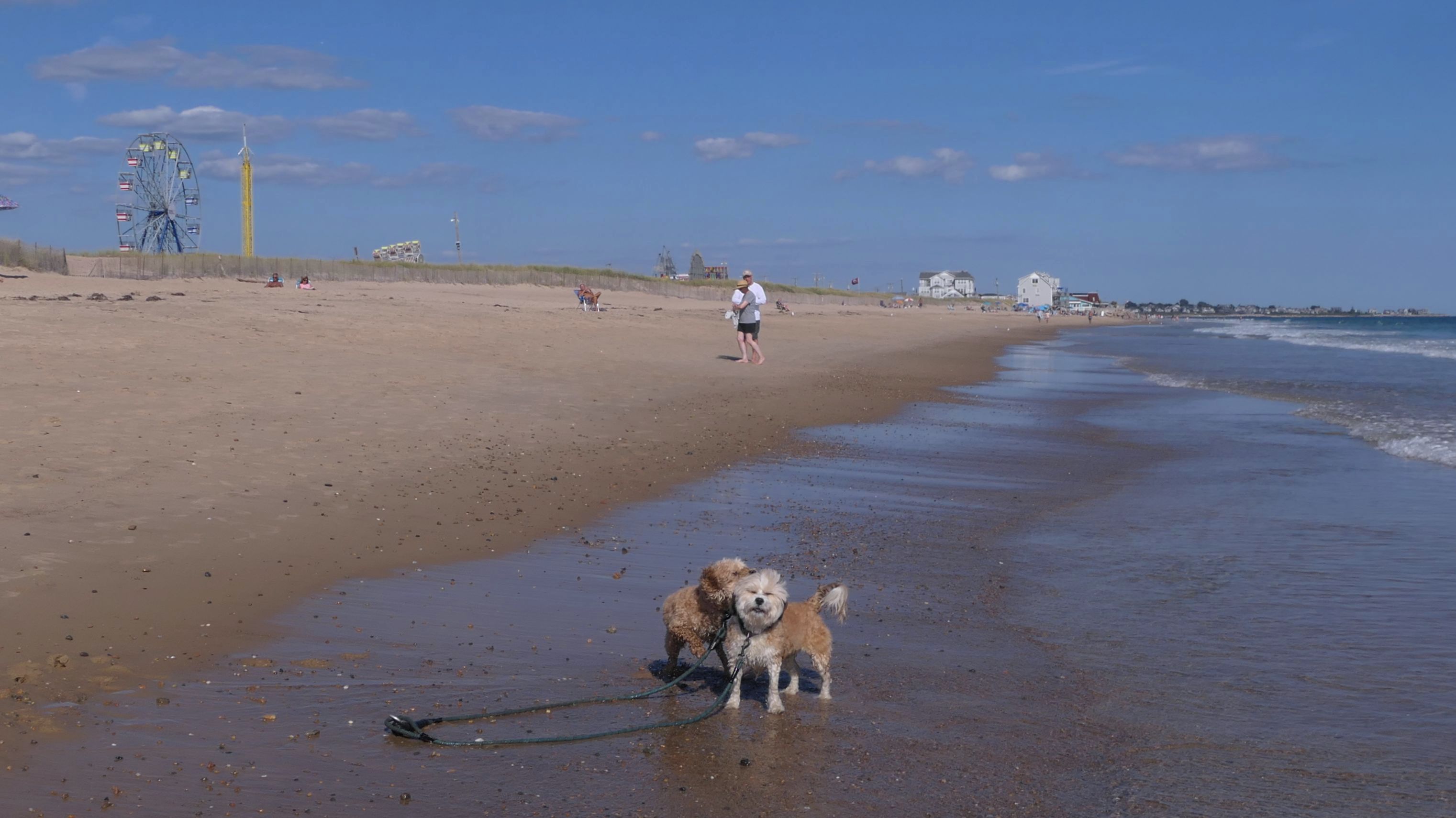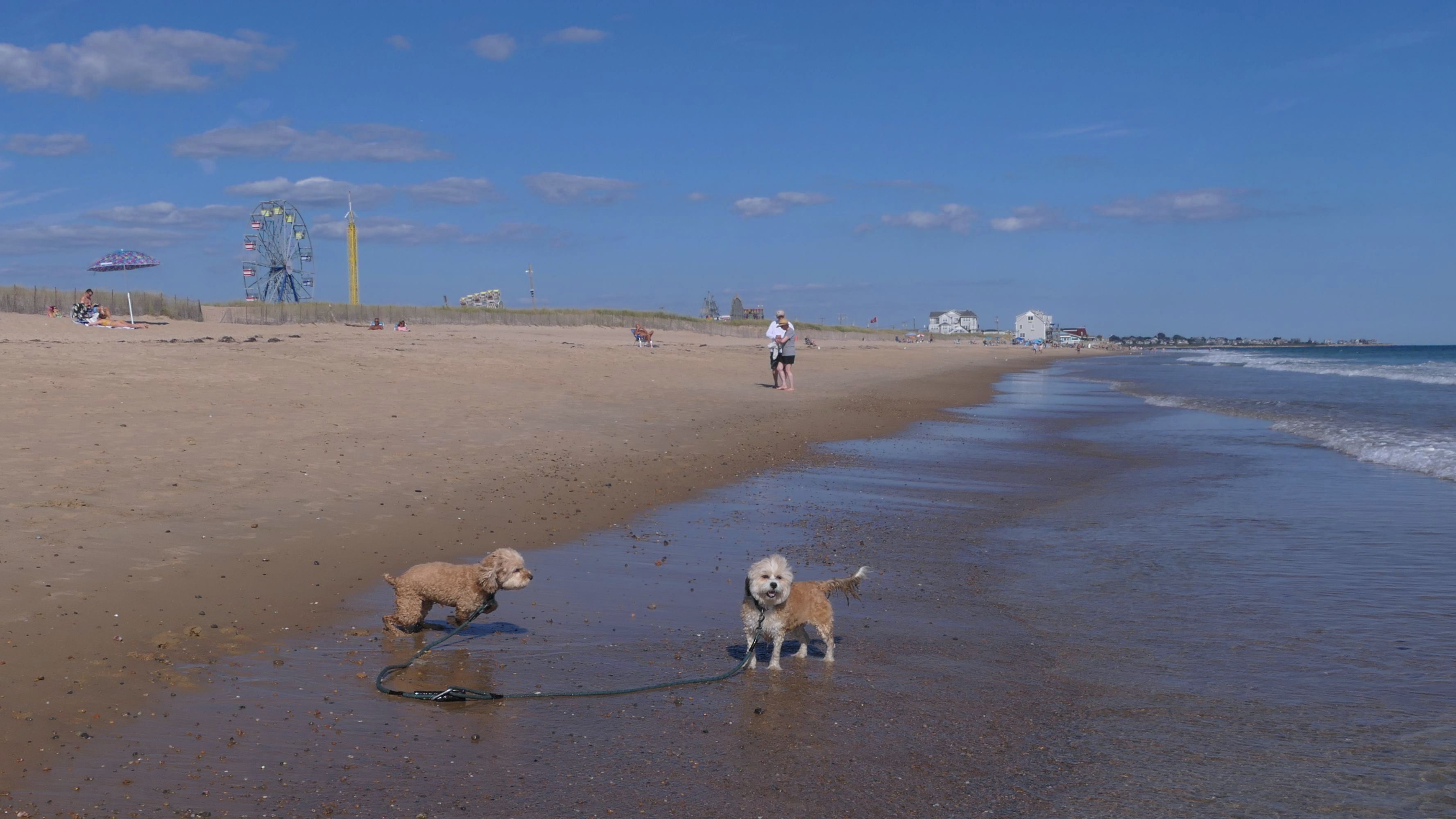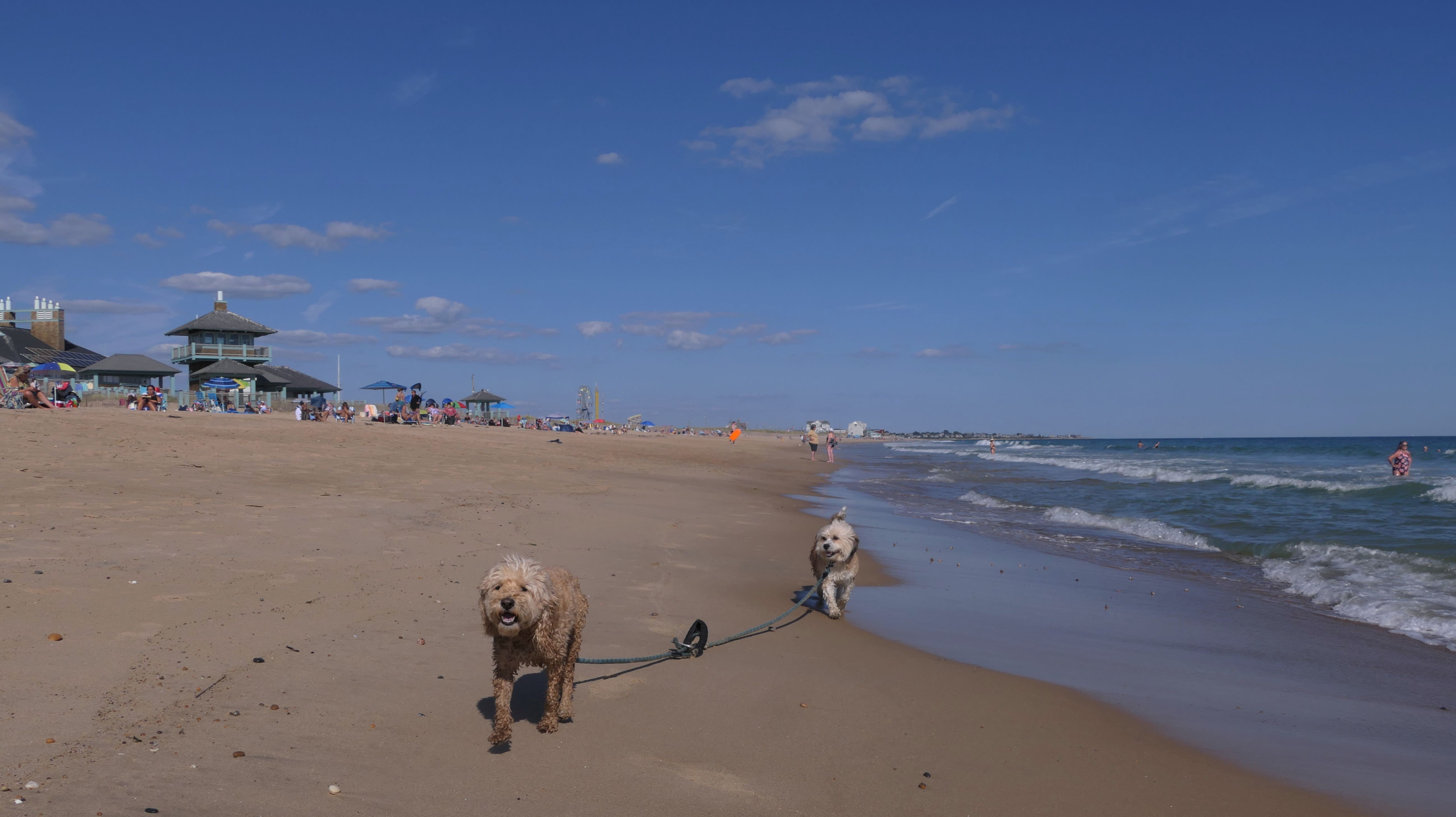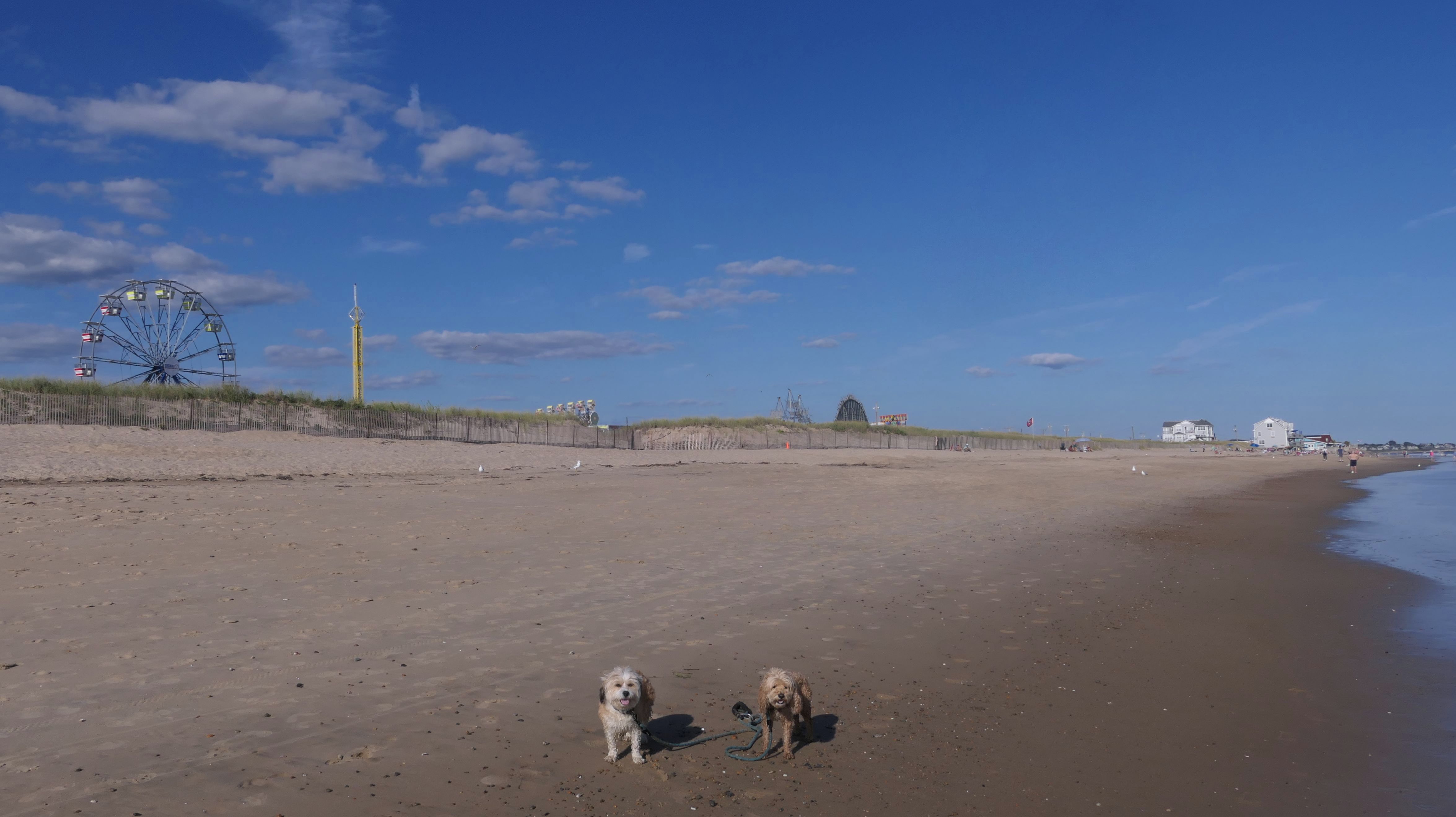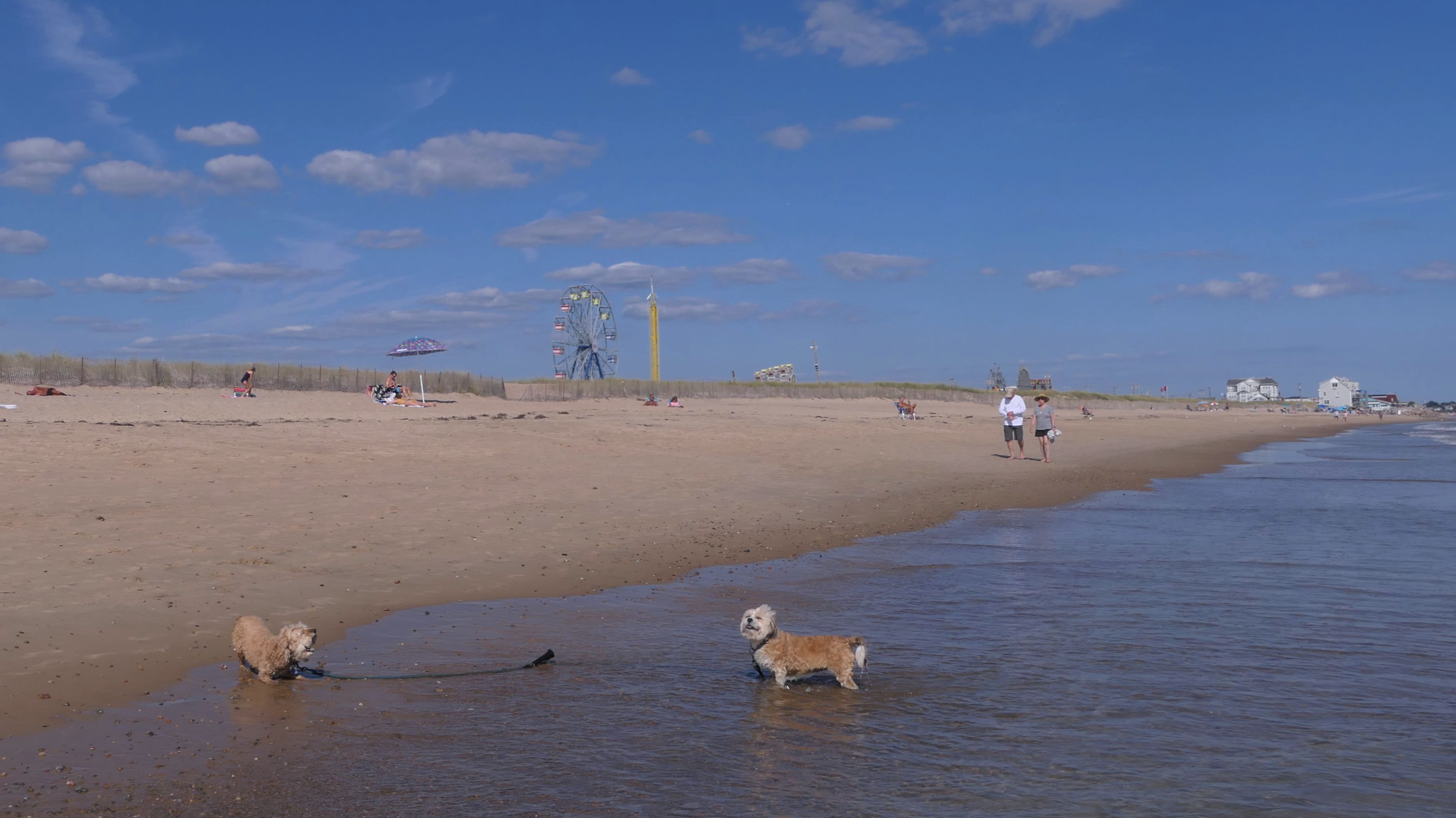 This was a wonderful late summer walk on the beach. Although dogs are technically allowed on the state beach until October, the town beaches on either side allow dogs after Labor Day. It's unclear where the borders are, so we basically just walked from Westerly Town Beach through the main tourist beach, and over to Misquamicut Fire District Beach, and back. The beach was moderately busy. It was a Thursday afternoon during the week, so even though it was a warm day, crowds weren't anything like what you'd see here during the summer peak. There were actually a good deal of people with their dogs here as well. We were here a day before the annual Fall Fest, so you can see the amusement park rides in the background of some of the photos. Lexi tried to get Mandy to play a couple times, but all Mandy wanted to do was relax in the water!