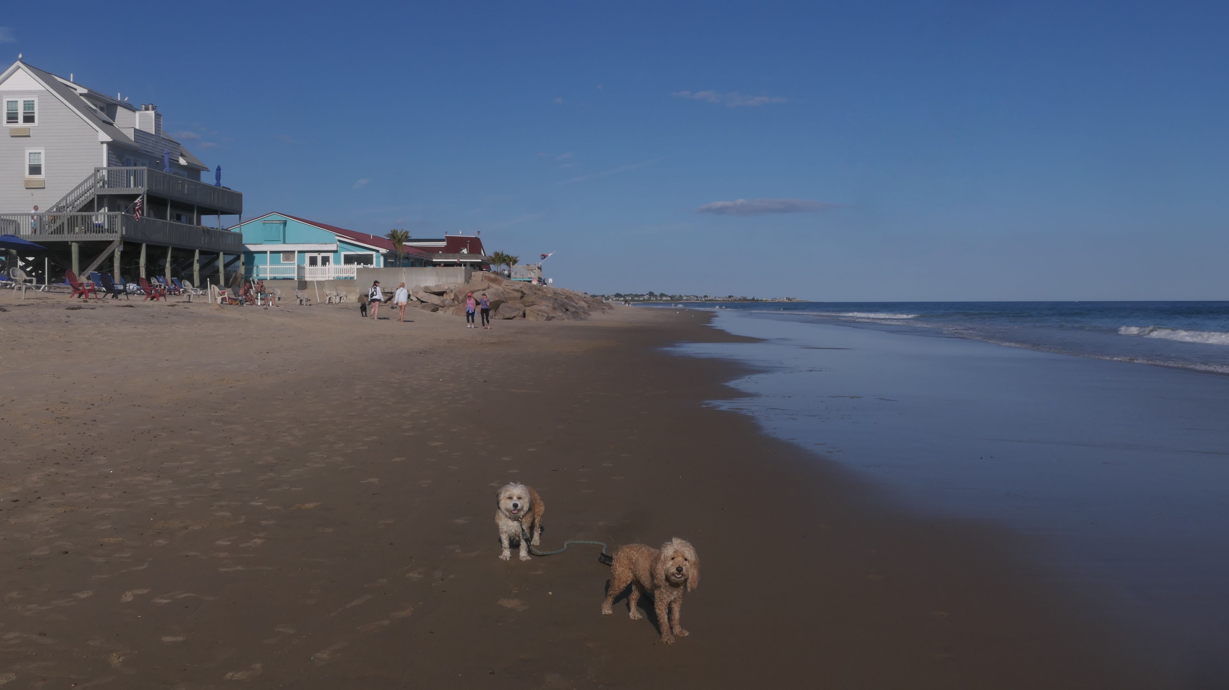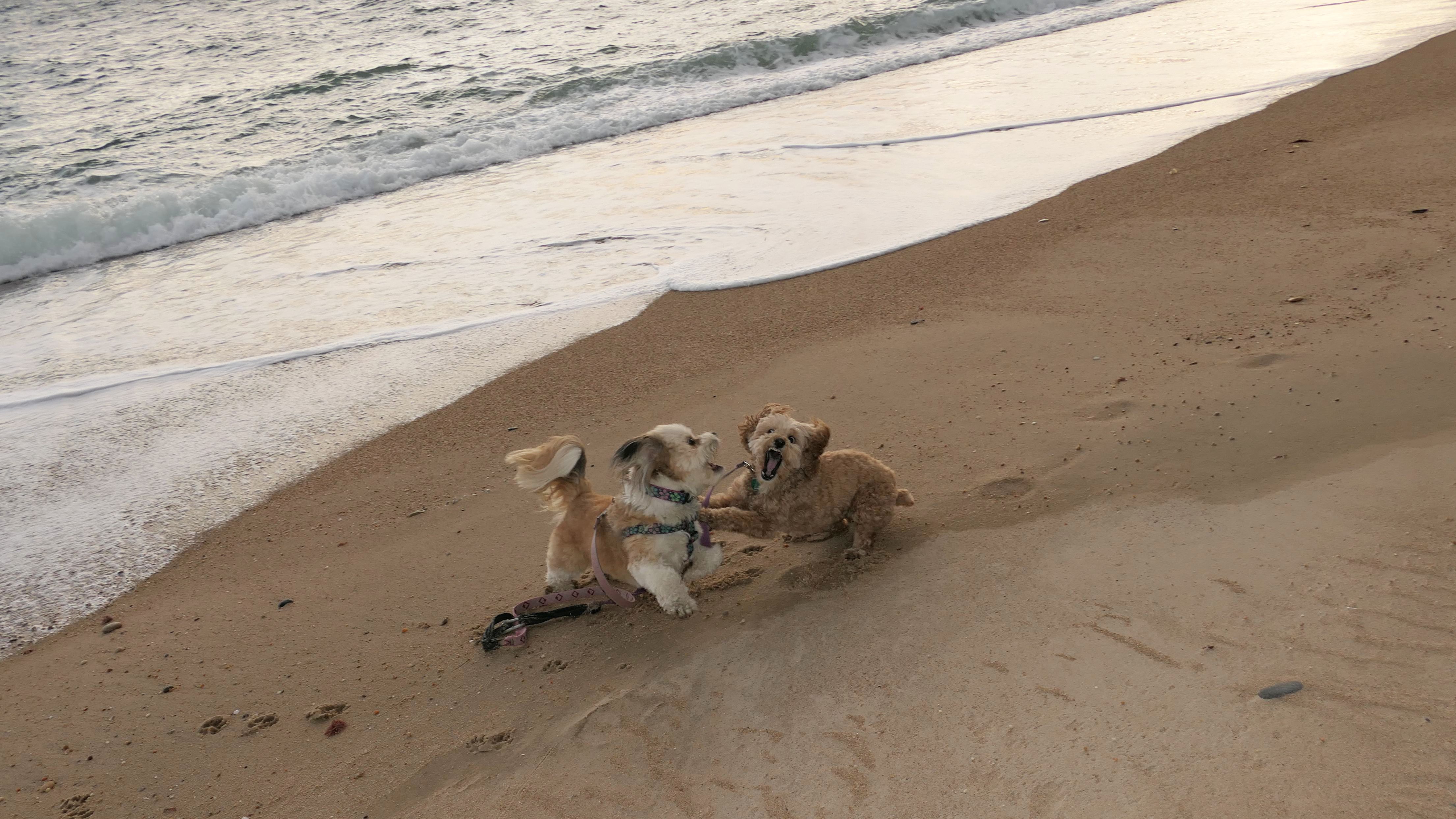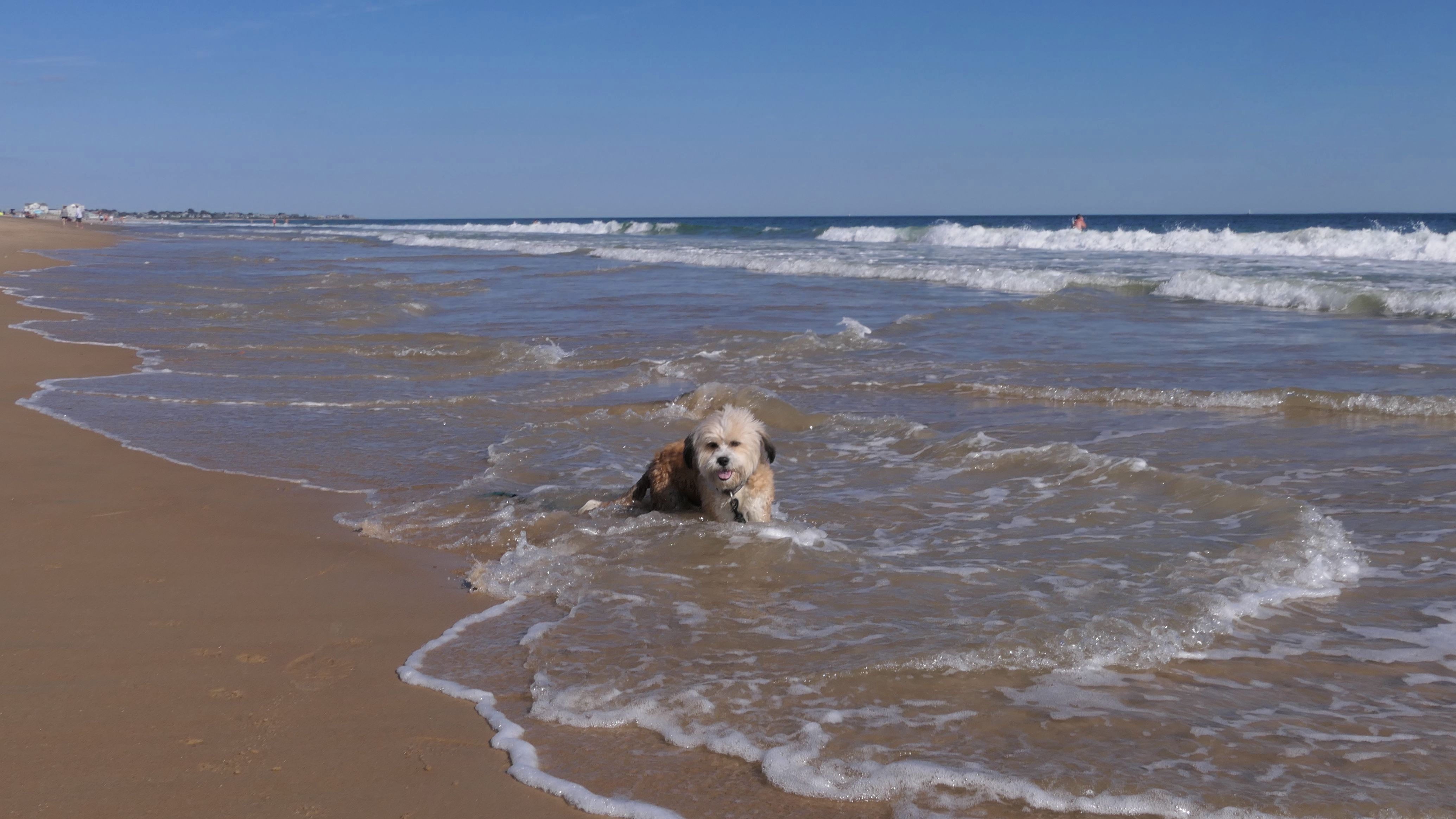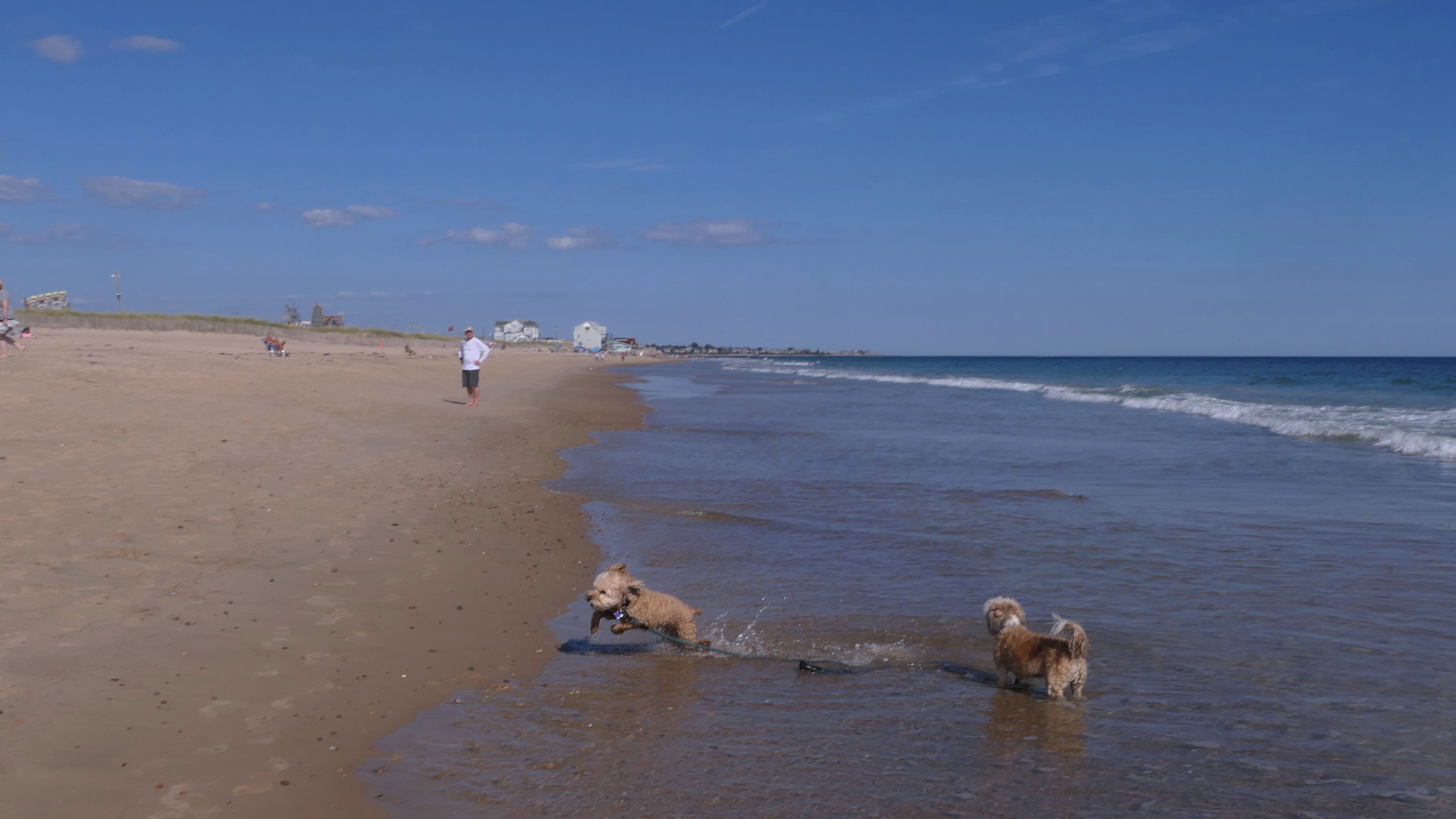 This was a wonderful late summer walk on the beach. Although dogs are technically allowed on the state beach until October, the town beaches on either side allow dogs after Labor Day. It's unclear where the borders are, so we basically just walked from Westerly Town Beach through the main tourist beach, and over to Misquamicut Fire District Beach, and back. The beach was moderately busy. It was a Thursday afternoon during the week, so even though it was a warm day, crowds weren't anything like what you'd see here during the summer peak. There were actually a good deal of people with their dogs here as well. We were here a day before the annual Fall Fest, so you can see the amusement park rides in the background of some of the photos. Lexi tried to get Mandy to play a couple times, but all Mandy wanted to do was relax in the water!