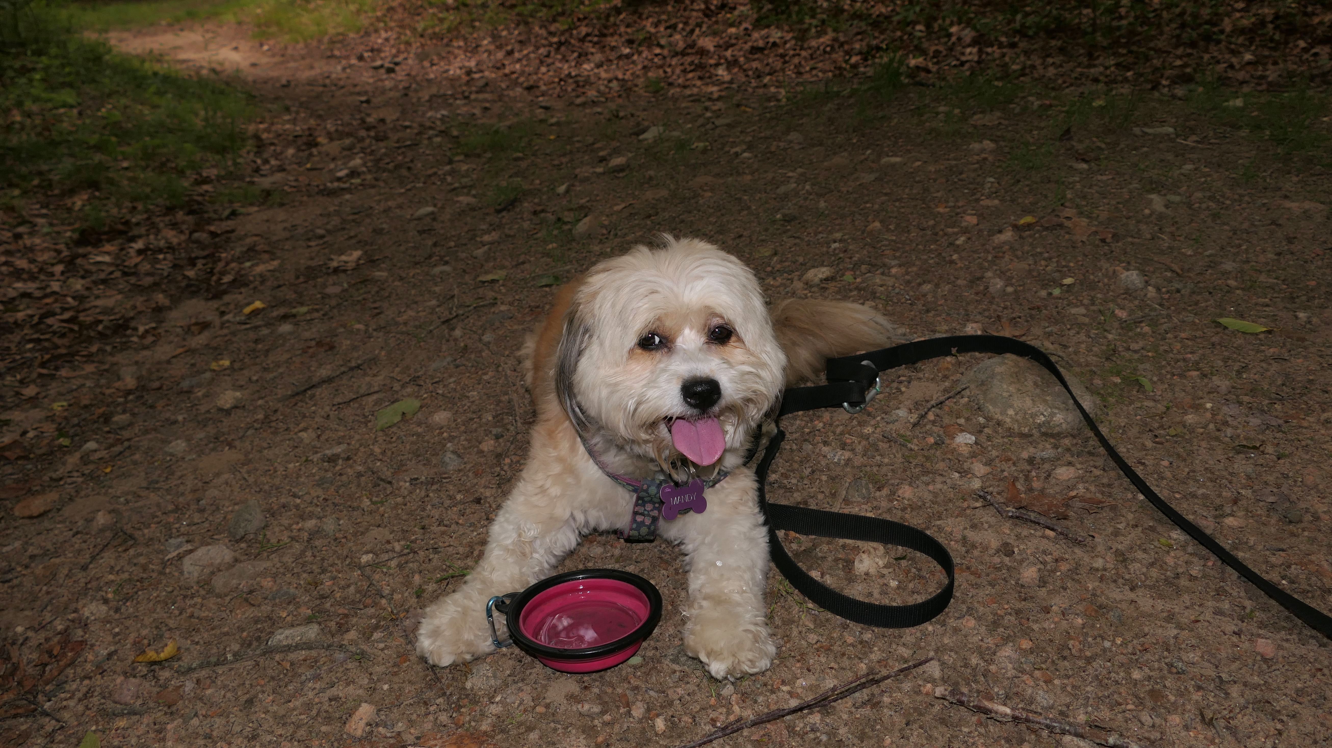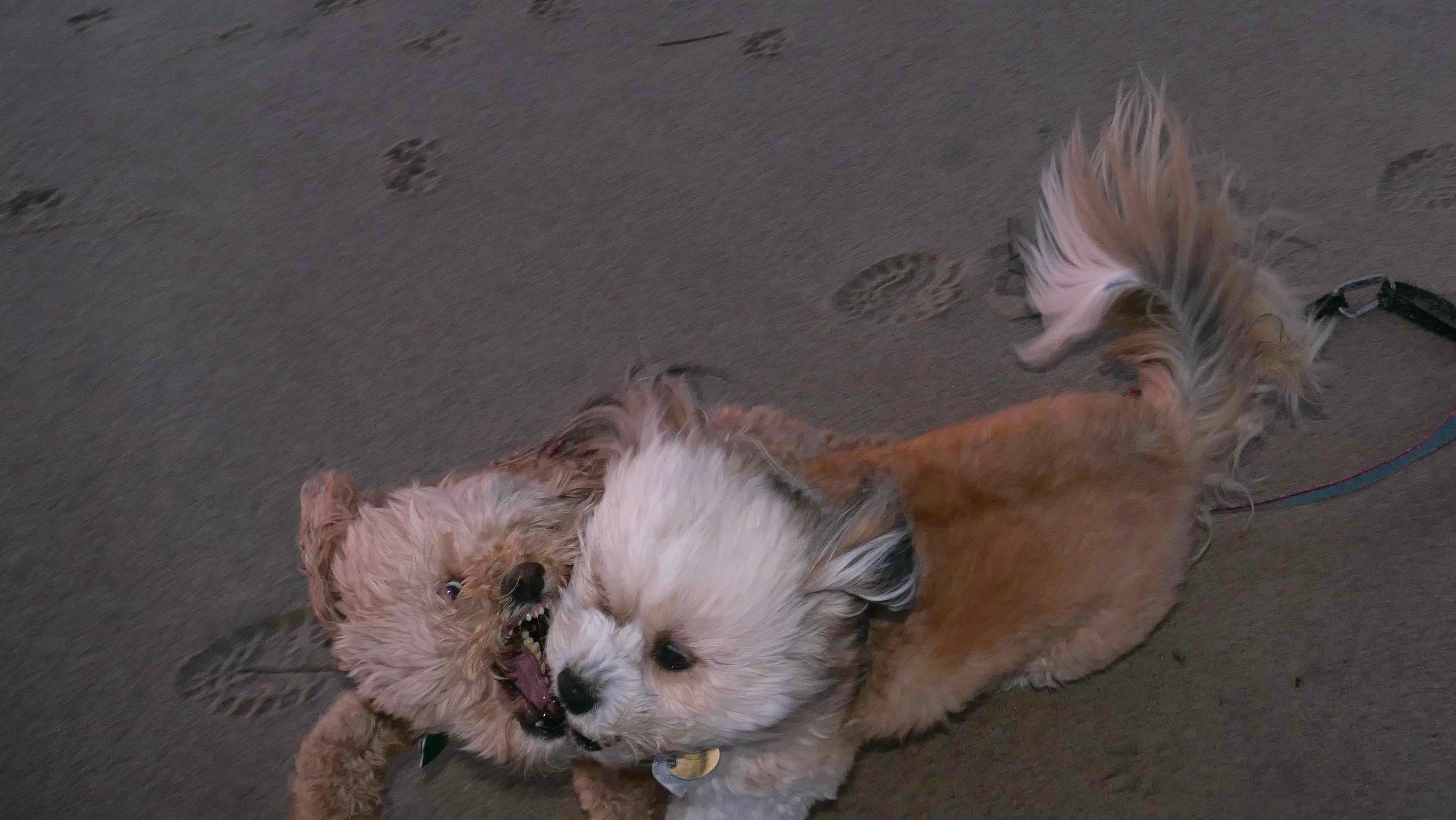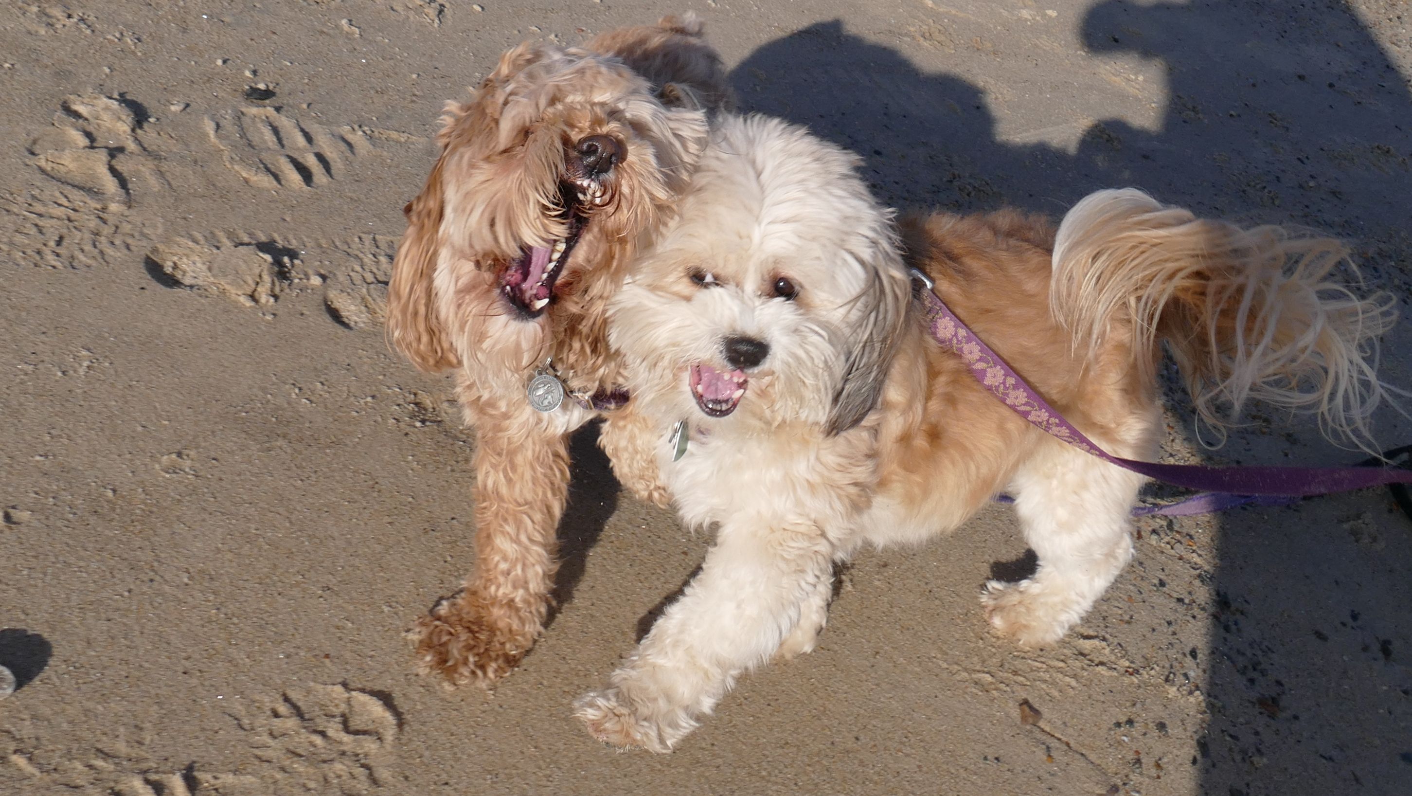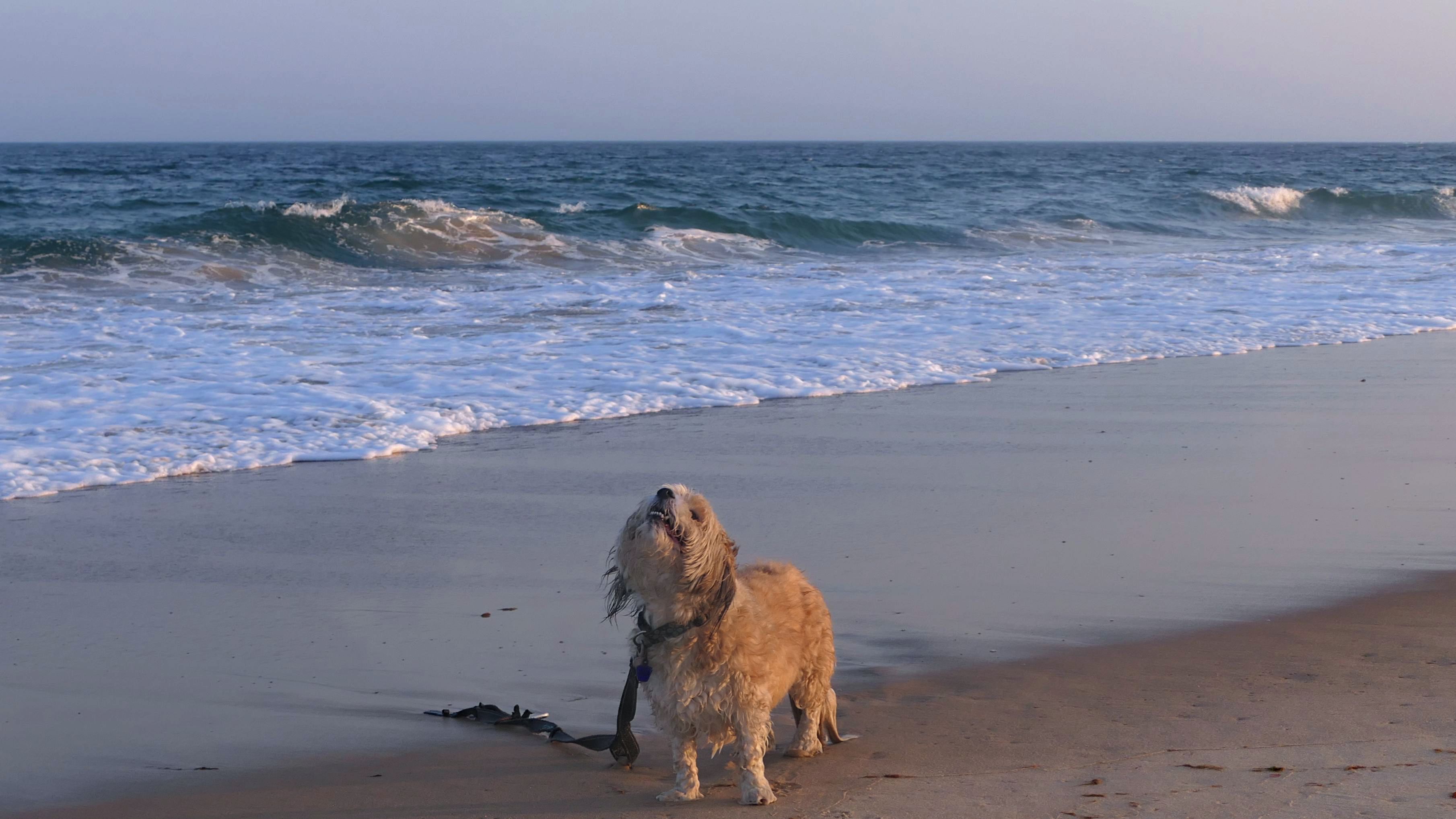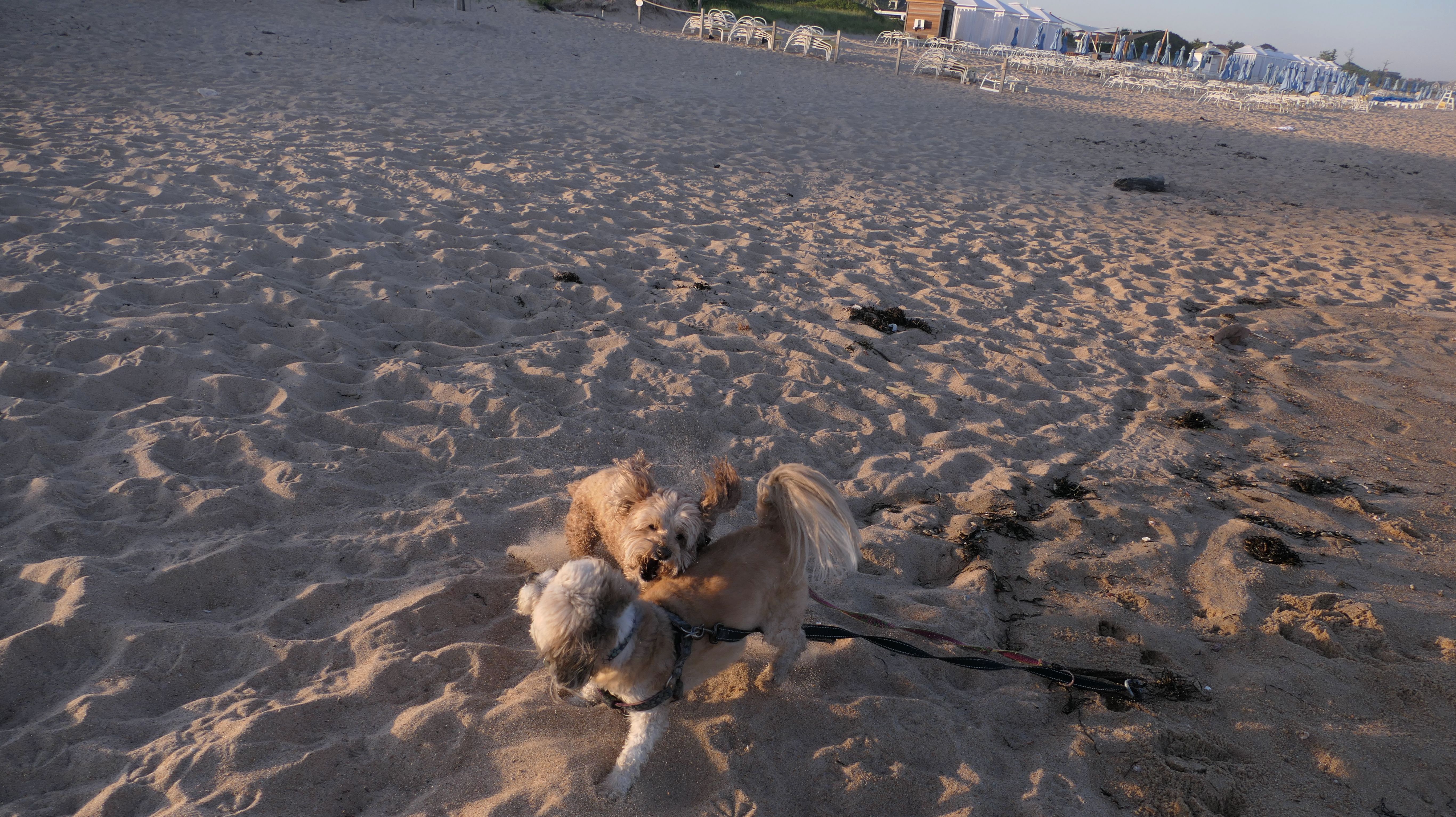 This was a wonderful late summer walk on the beach. Although dogs are technically allowed on the state beach until October, the town beaches on either side allow dogs after Labor Day. It's unclear where the borders are, so we basically just walked from Westerly Town Beach through the main tourist beach, and over to Misquamicut Fire District Beach, and back. The beach was moderately busy. It was a Thursday afternoon during the week, so even though it was a warm day, crowds weren't anything like what you'd see here during the summer peak. There were actually a good deal of people with their dogs here as well. We were here a day before the annual Fall Fest, so you can see the amusement park rides in the background of some of the photos. Lexi tried to get Mandy to play a couple times, but all Mandy wanted to do was relax in the water!