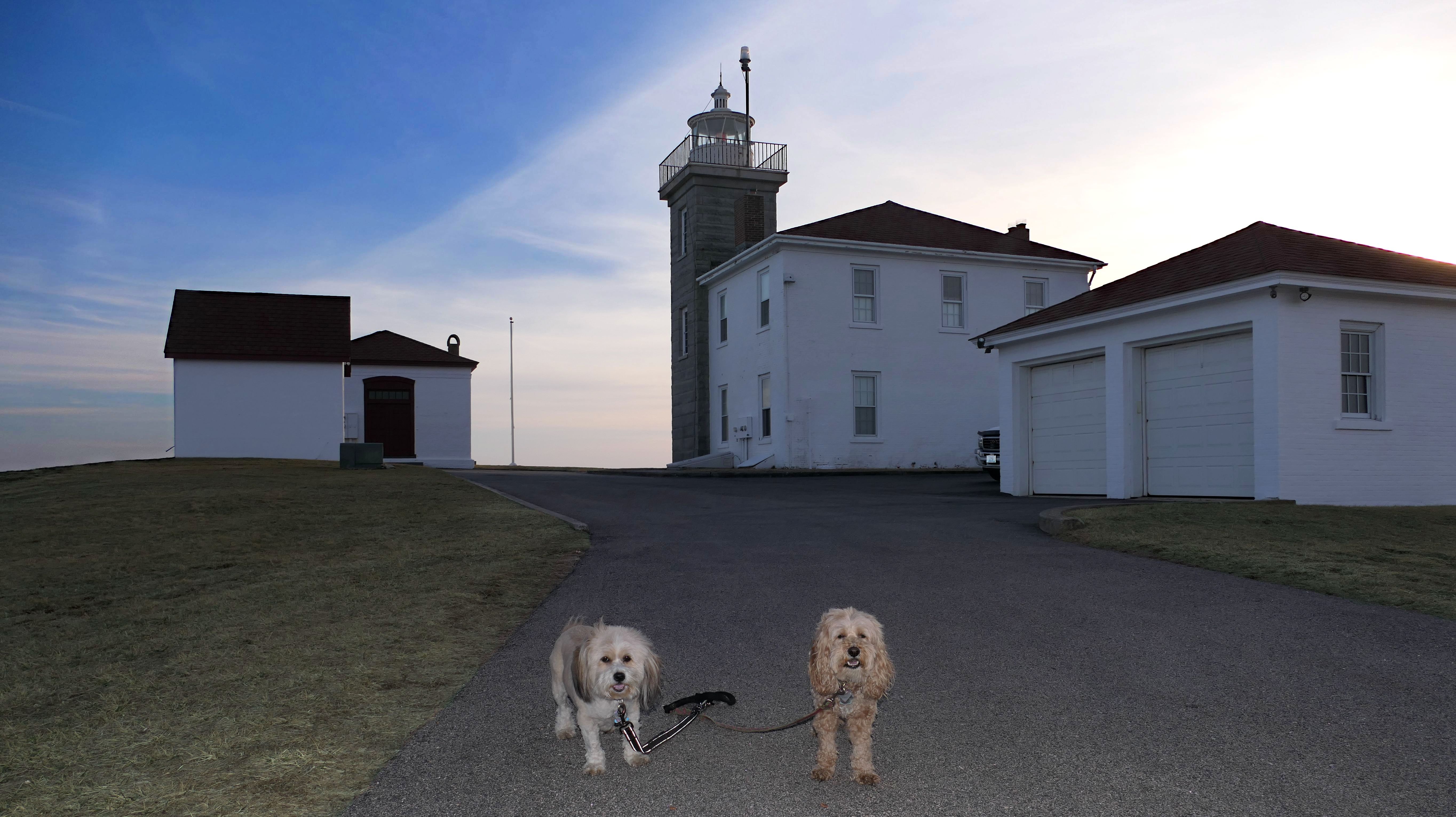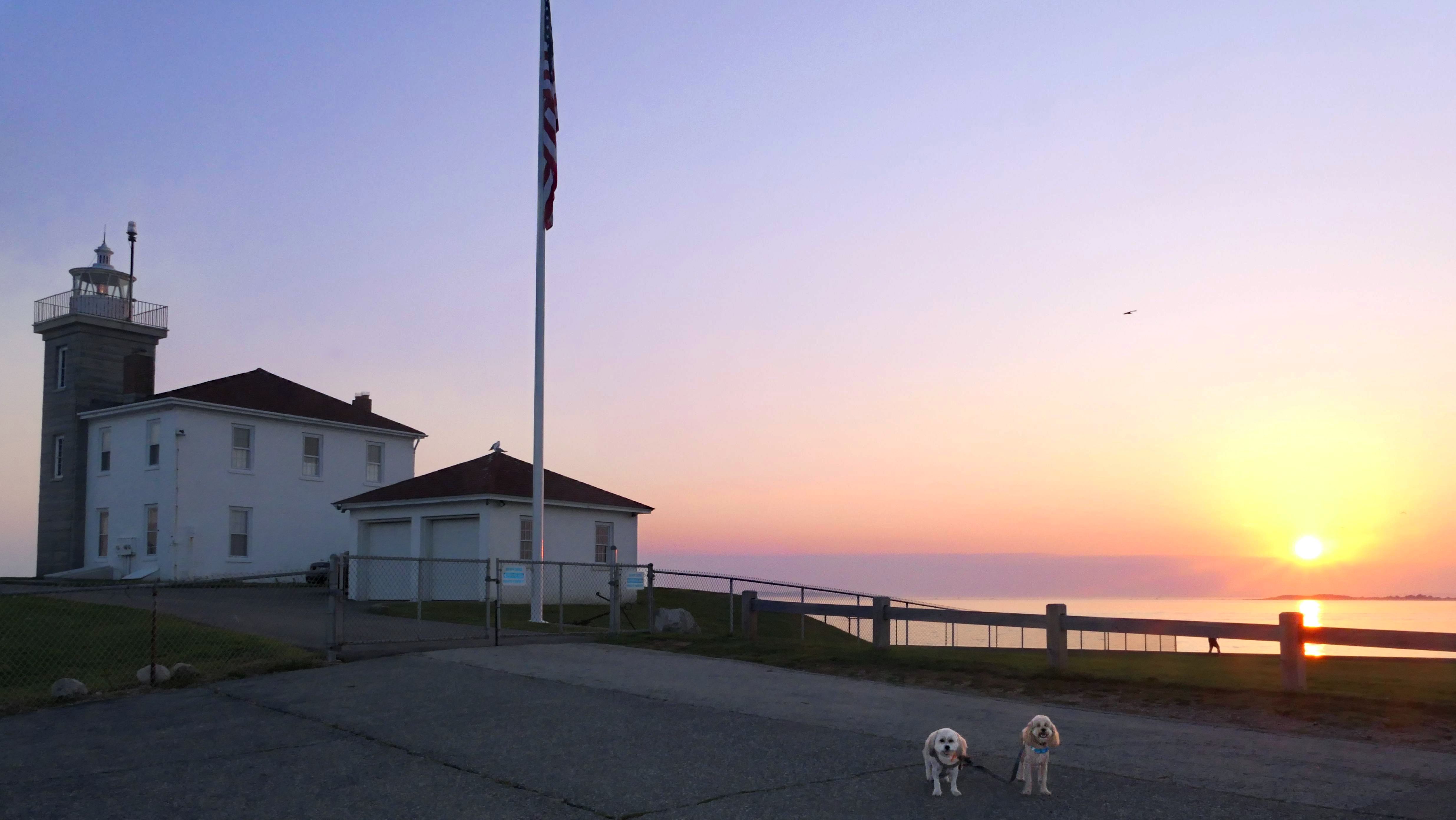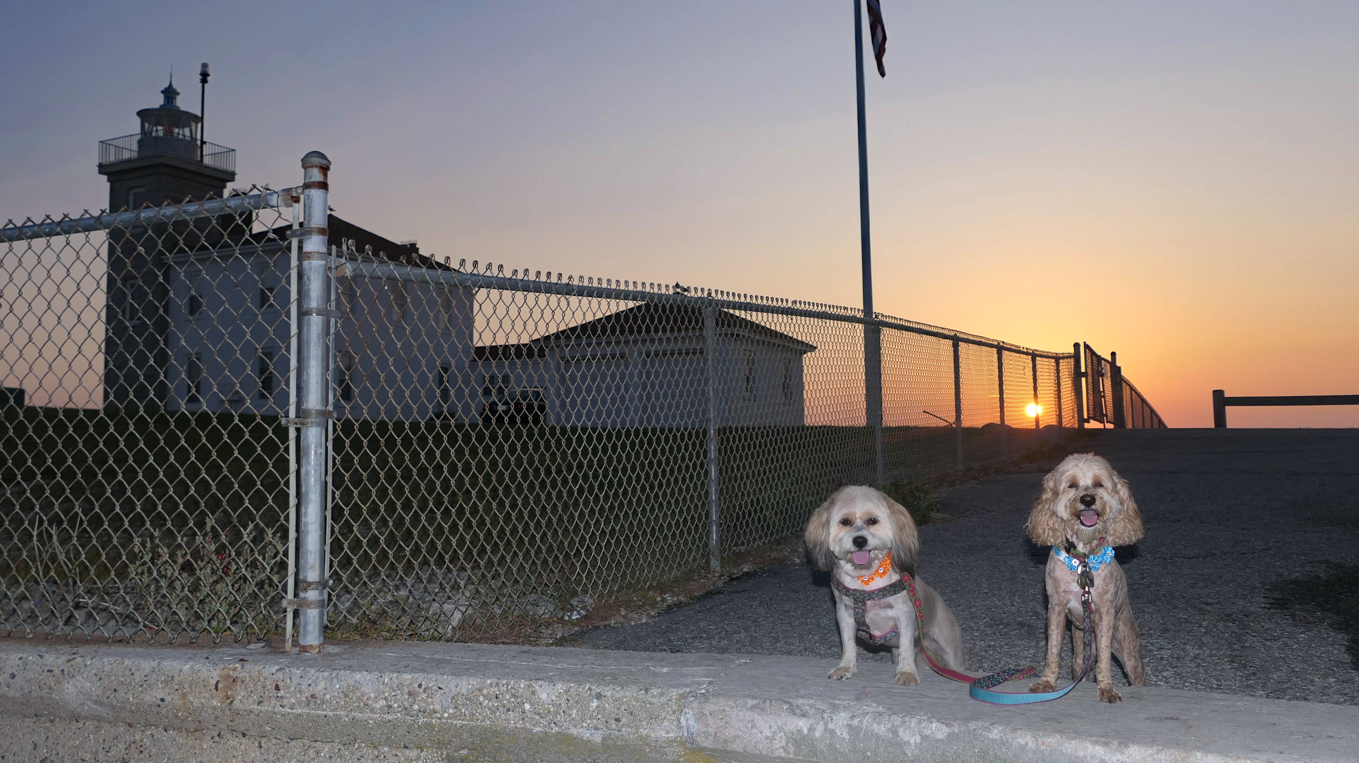 We came back a third time on a very hot and humid early September day. Like always, it was cooler here than the inland areas. We arrived late because the dogs were at the dog groomers getting cleaned up. The sun had already started to set by the time we walked down the road to the lighthouse. I had the idea in my head to get a picture of the sunset behind the lighthouse with the dogs in front of it, but the chain link fence around the lighthouse itself makes it impossible to get close enough to the lighthouse to do that. I did get a couple photos with both the lighthouse and the sunset in the same shot, so it wasn't a total loss!