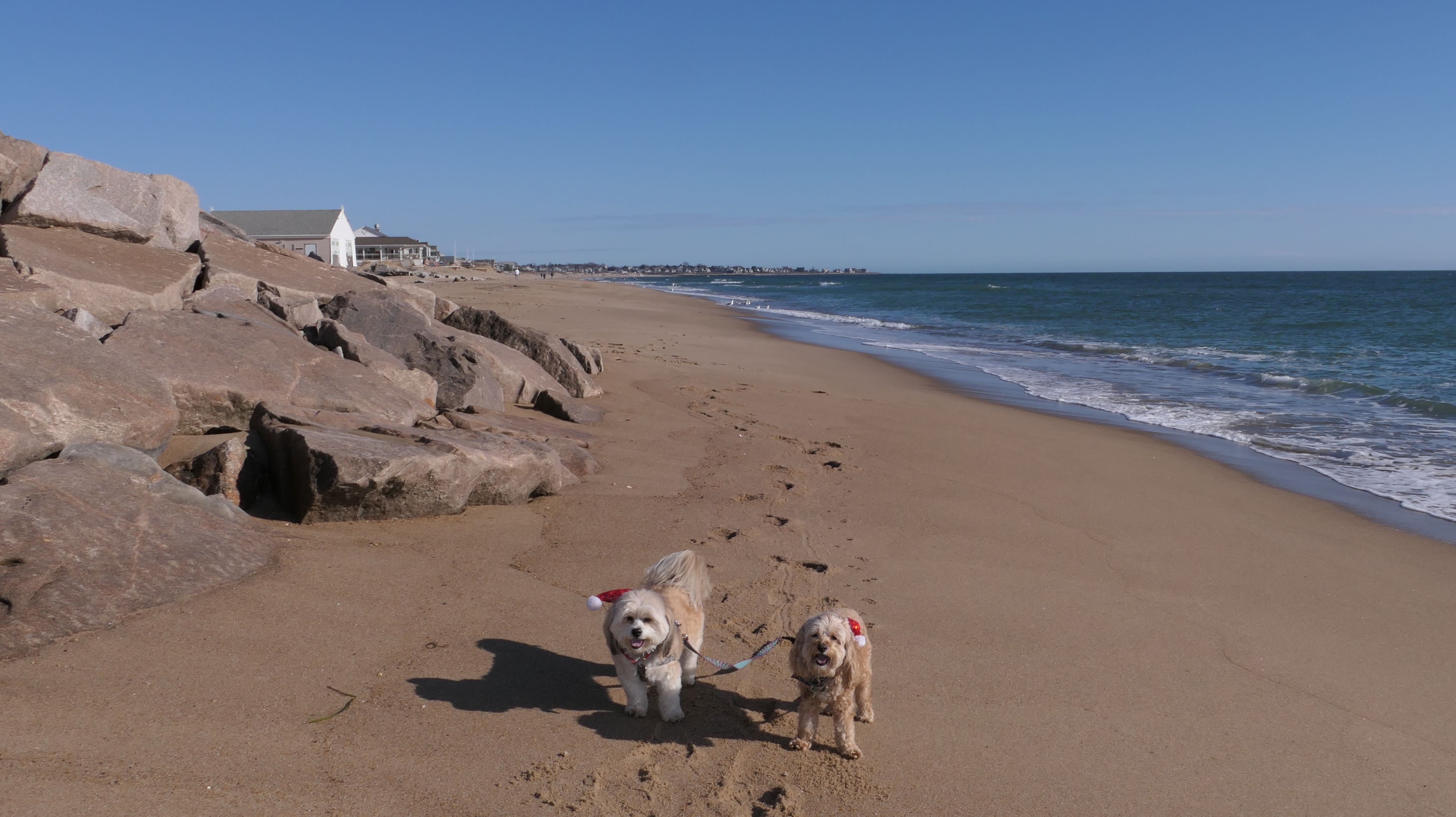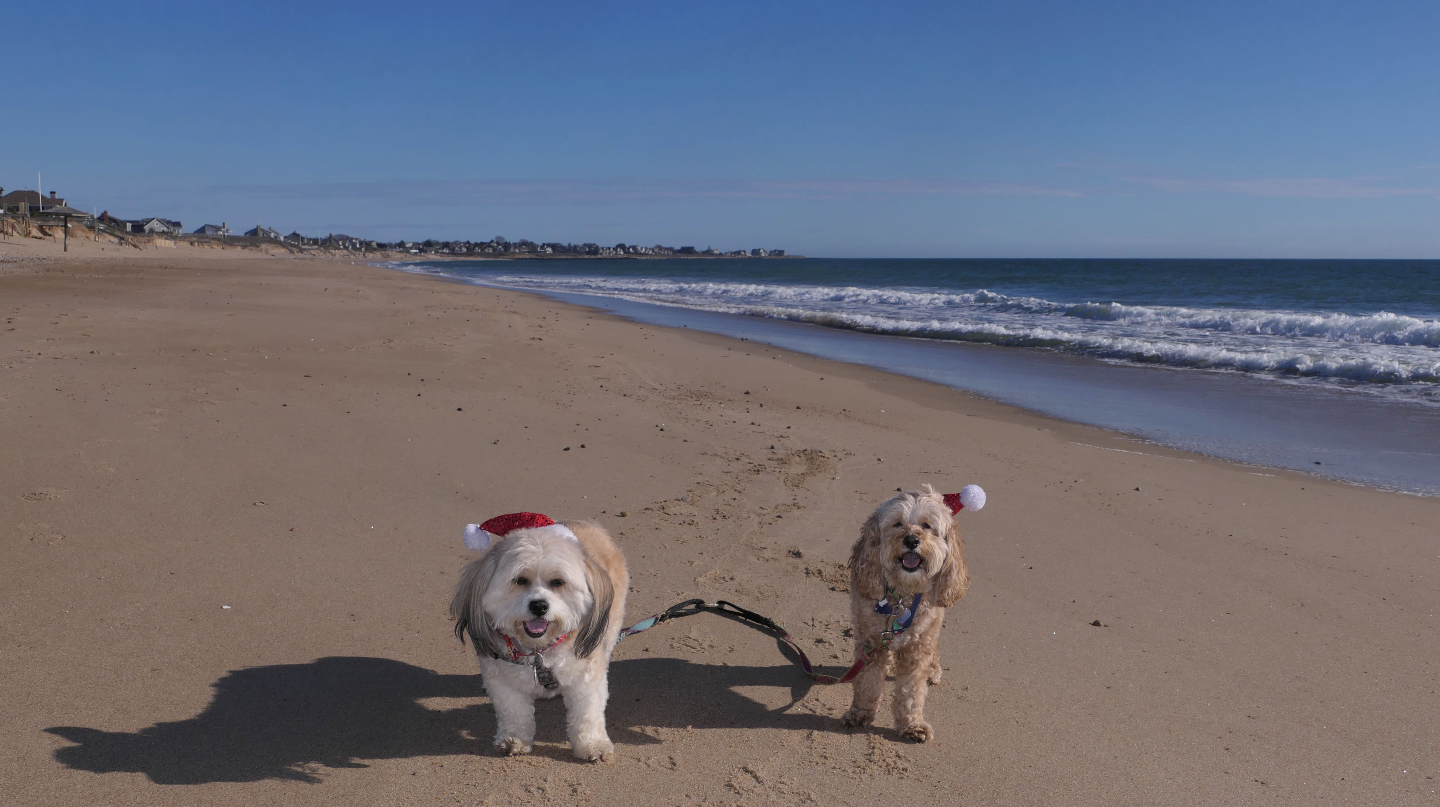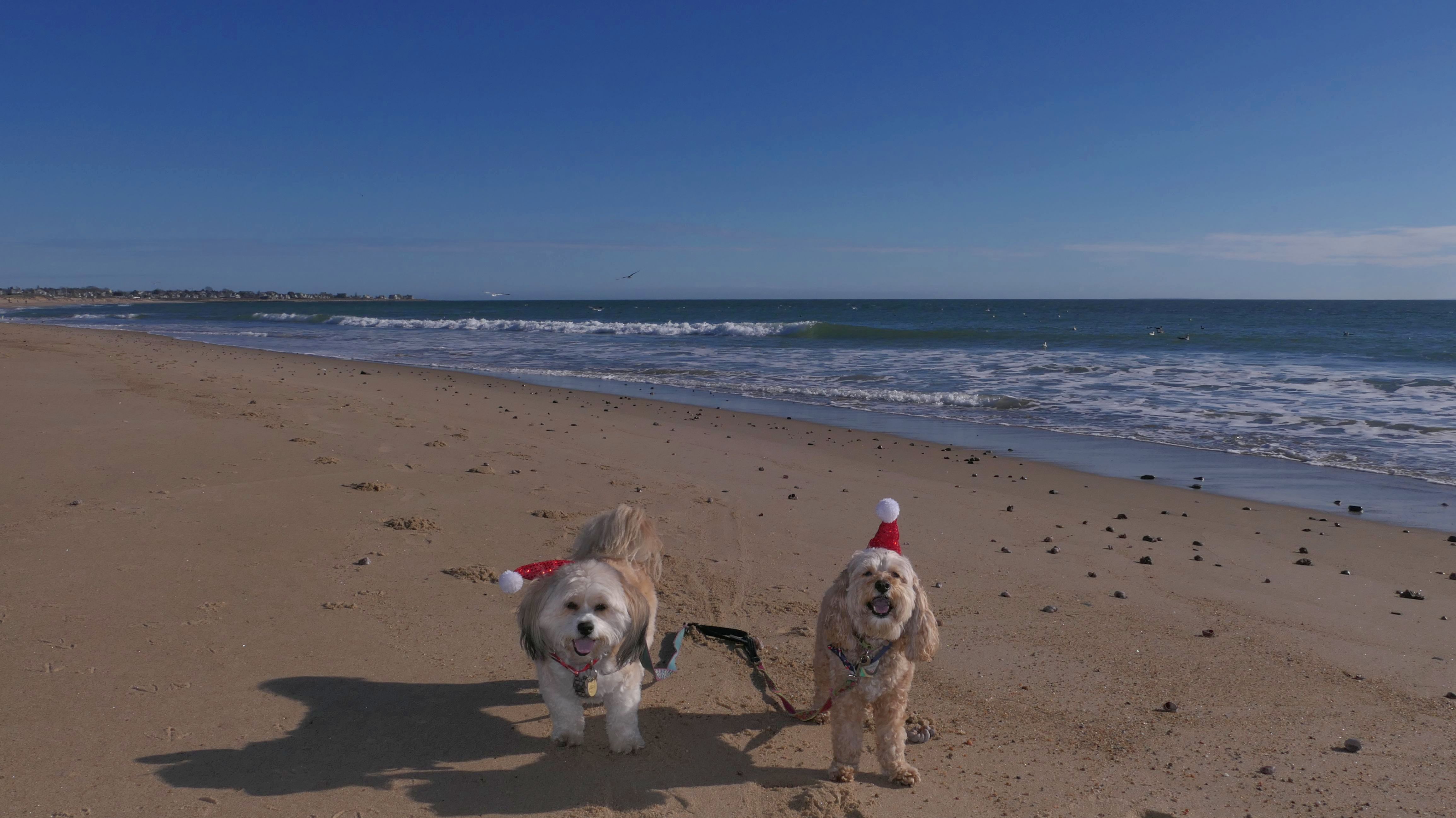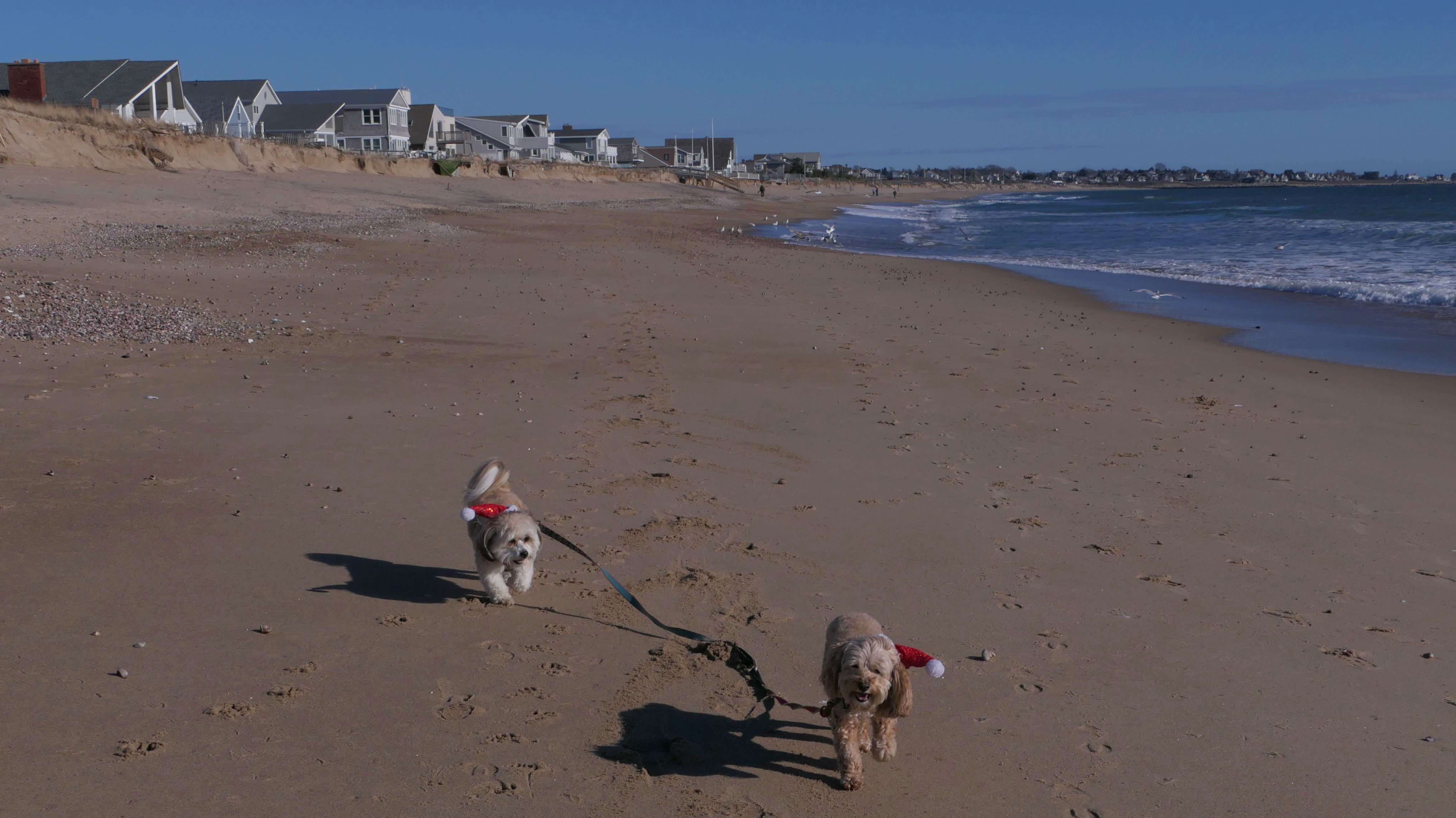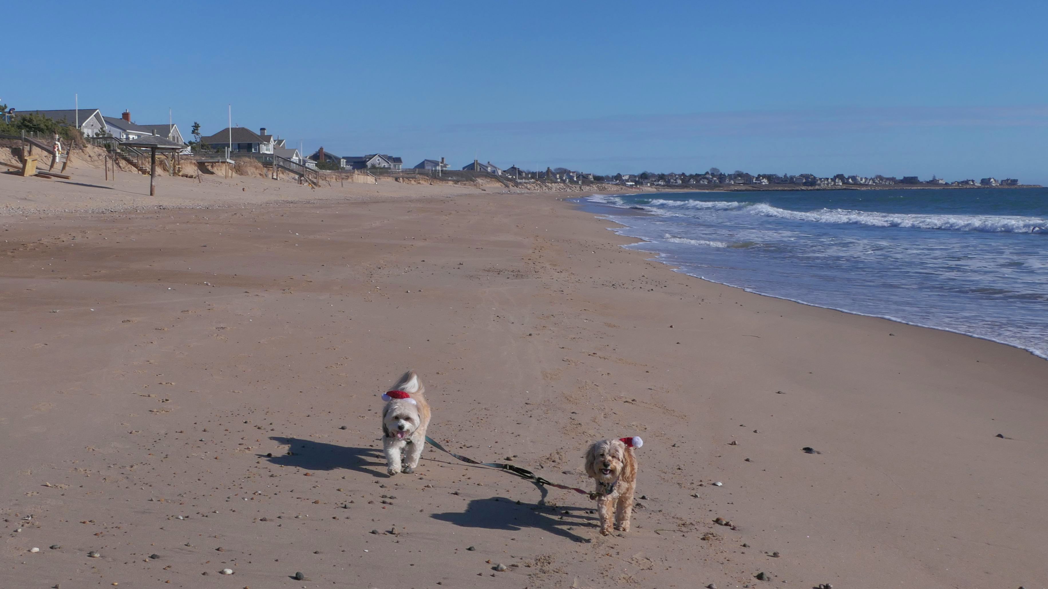 Nothing says Christmas in New England like a trip to the beach! We had a great four mile walk on Christmas Morning. It was damp, dreary, cloudy and foggy in the Hartford Connecticut area, but sunny and near 60 in Westerly. We couldn't park at the main lot since Atlantic Avenue was still flooded from the storm the week before. We parked at Dunes Park just to the west of the breachway, and walked west along the beach. Our route overlapped a bit with a section of the beach we we walked when we were at Misquamicut last year. The dogs were great sports with their Santa hats! And with the hats, we can tell these photos were taken on Christmas and not some day in July!