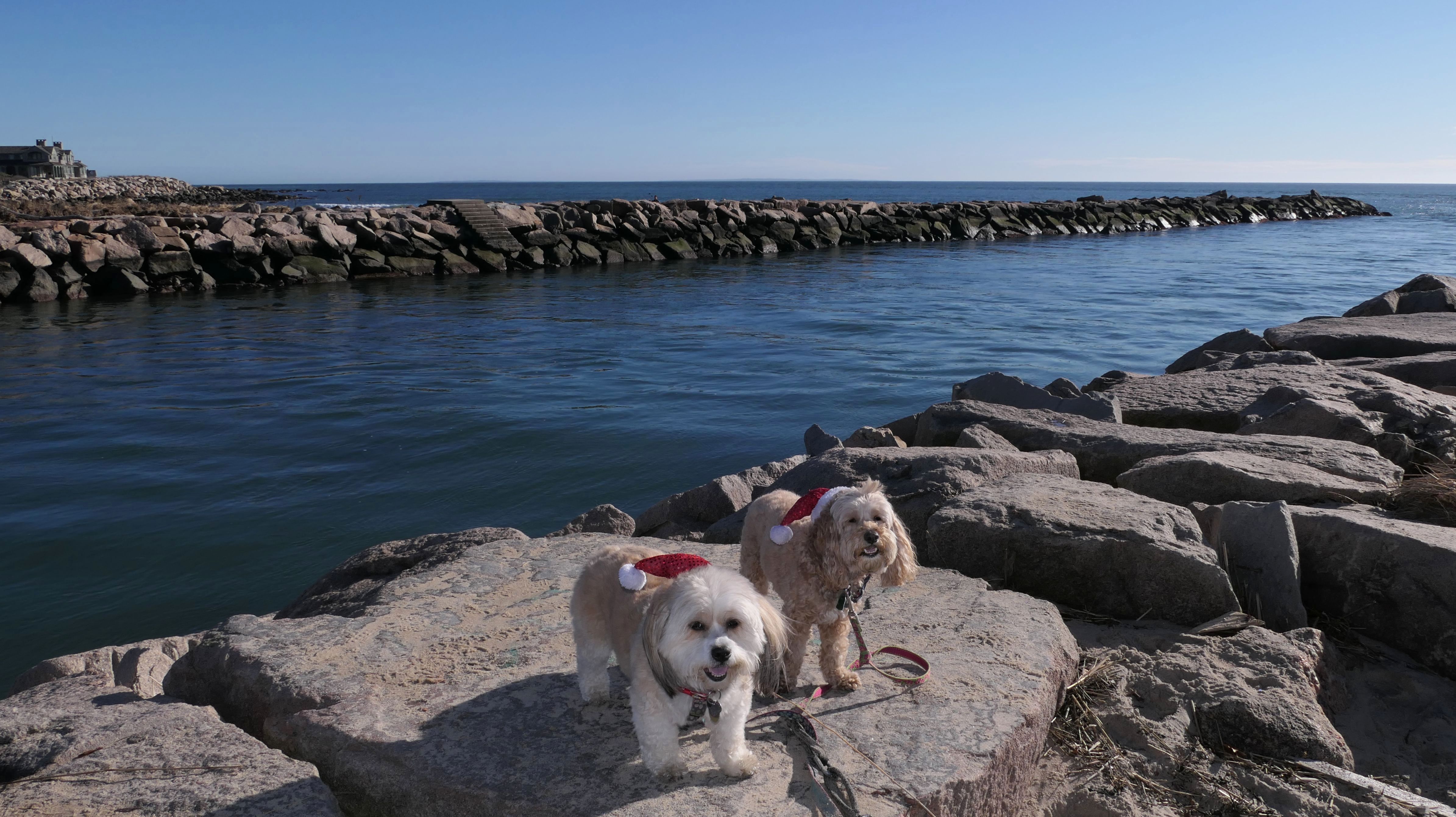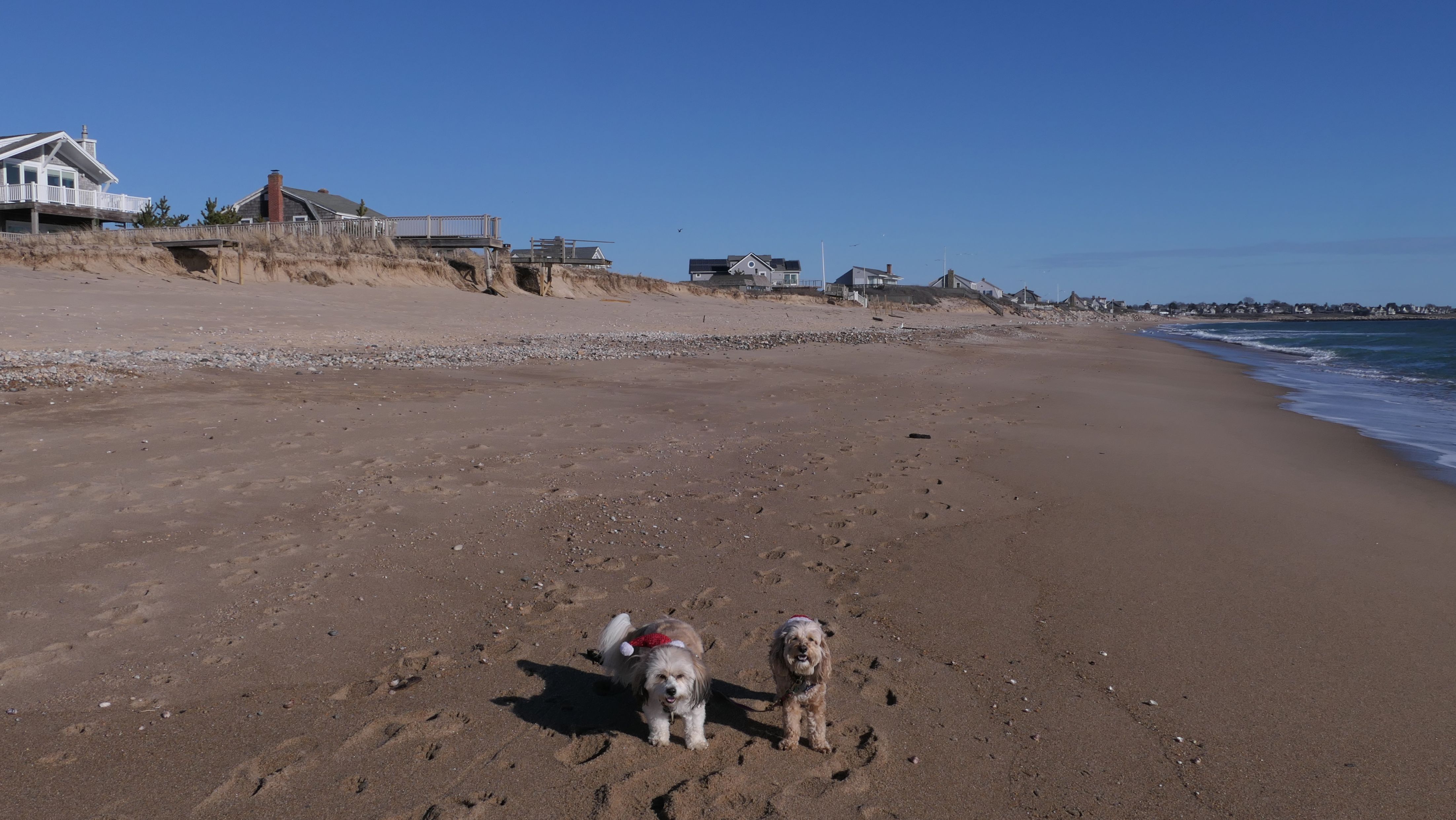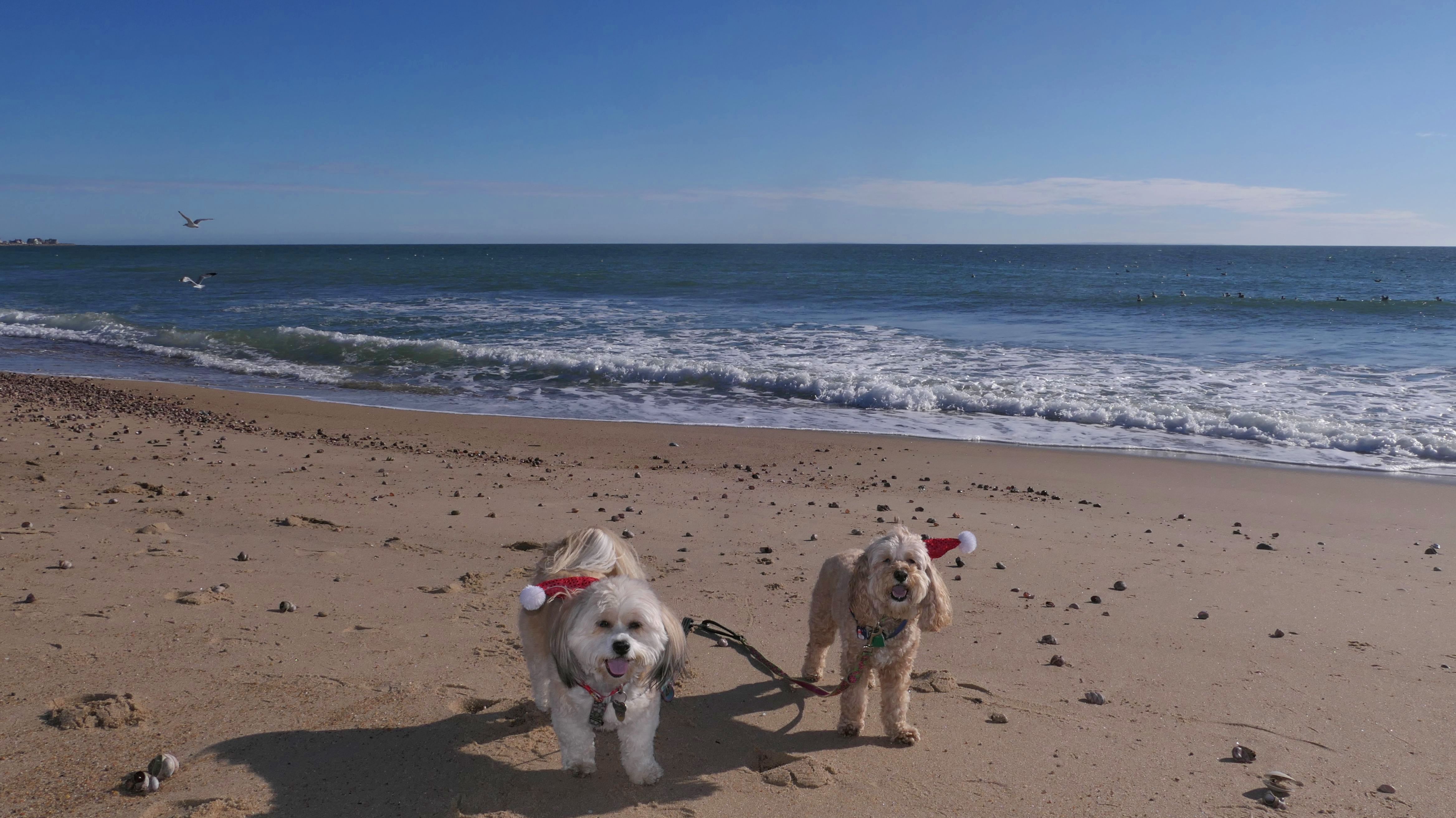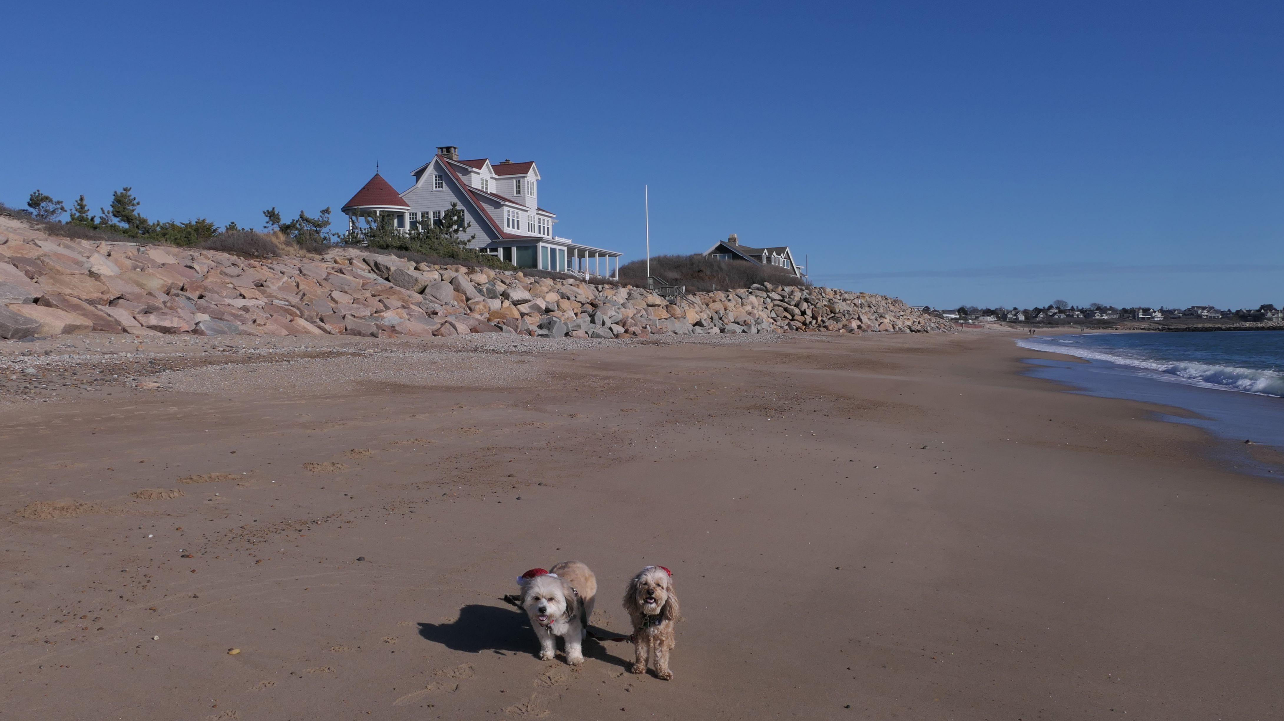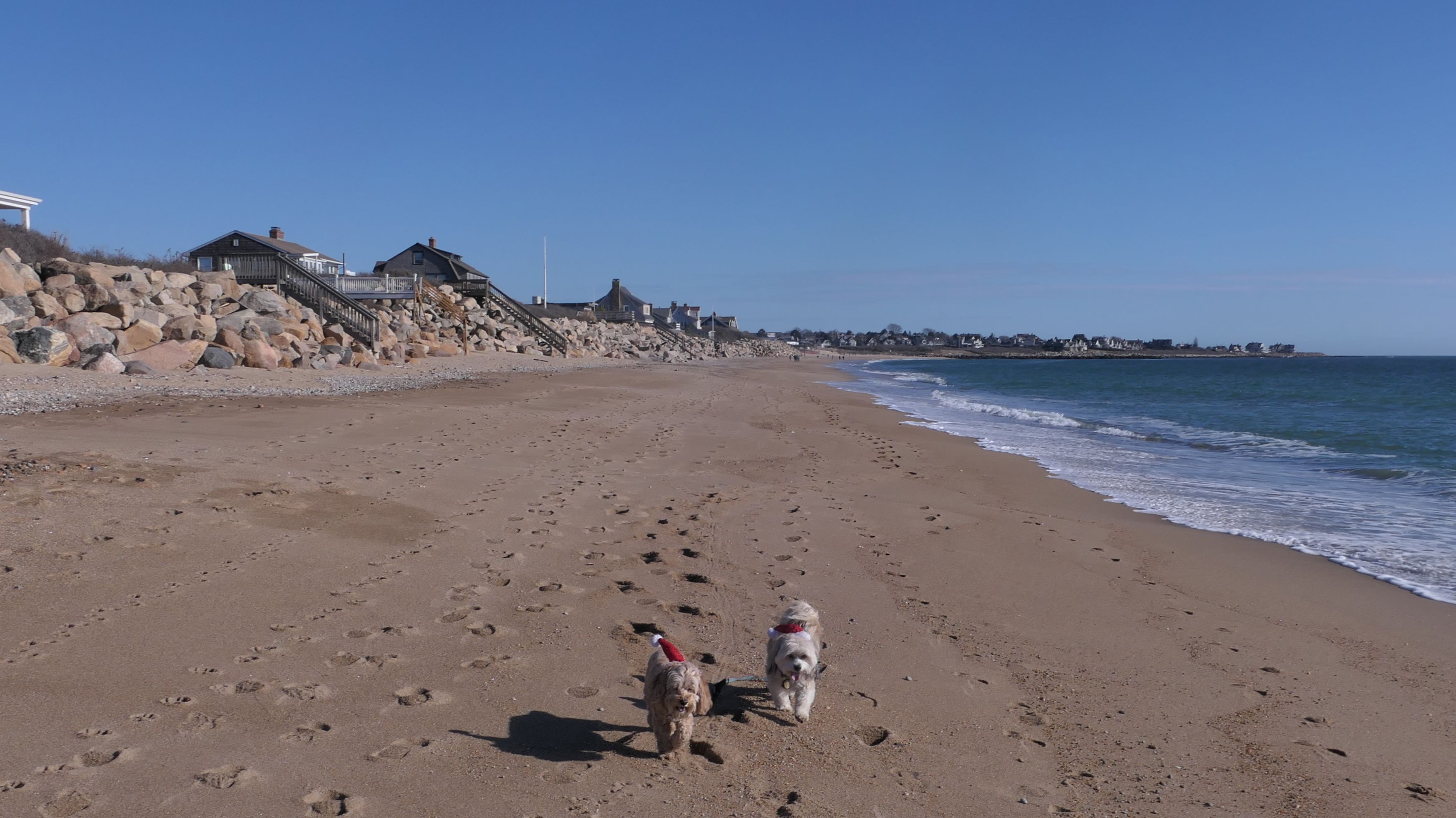 Nothing says Christmas in New England like a trip to the beach! We had a great four mile walk on Christmas Morning. It was damp, dreary, cloudy and foggy in the Hartford Connecticut area, but sunny and near 60 in Westerly. We couldn't park at the main lot since Atlantic Avenue was still flooded from the storm the week before. We parked at Dunes Park just to the west of the breachway, and walked west along the beach. Our route overlapped a bit with a section of the beach we we walked when we were at Misquamicut last year. The dogs were great sports with their Santa hats! And with the hats, we can tell these photos were taken on Christmas and not some day in July!
