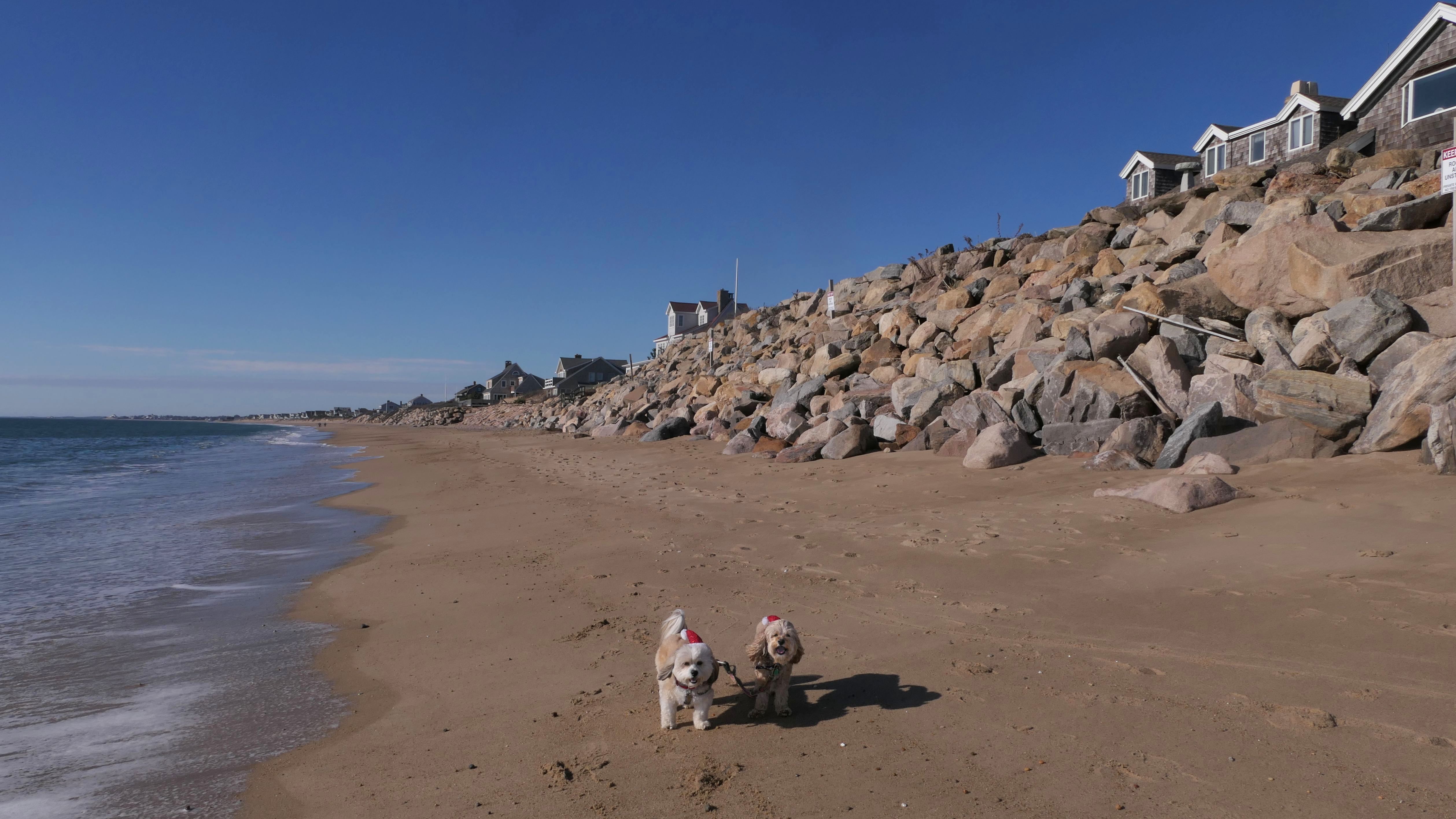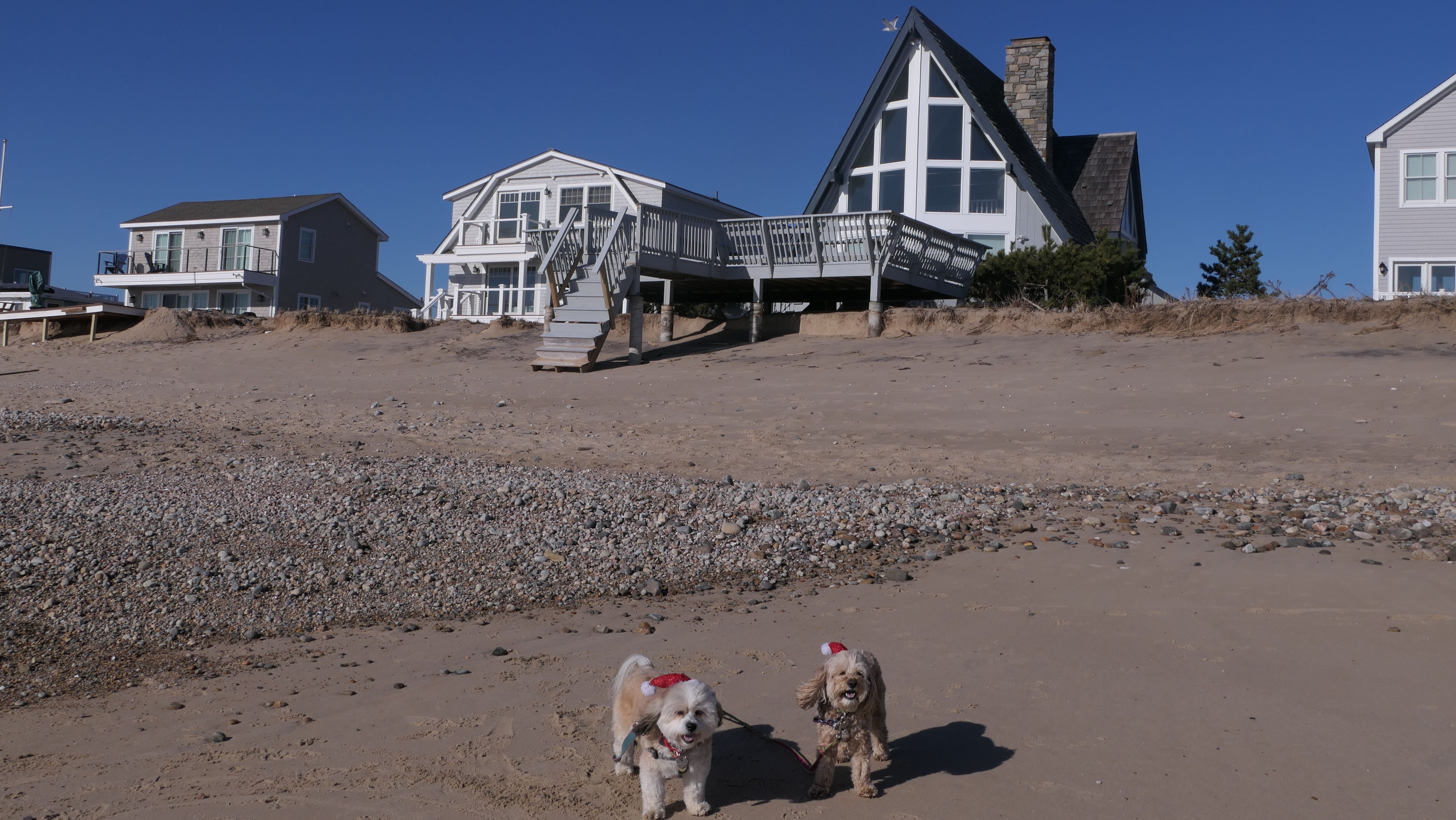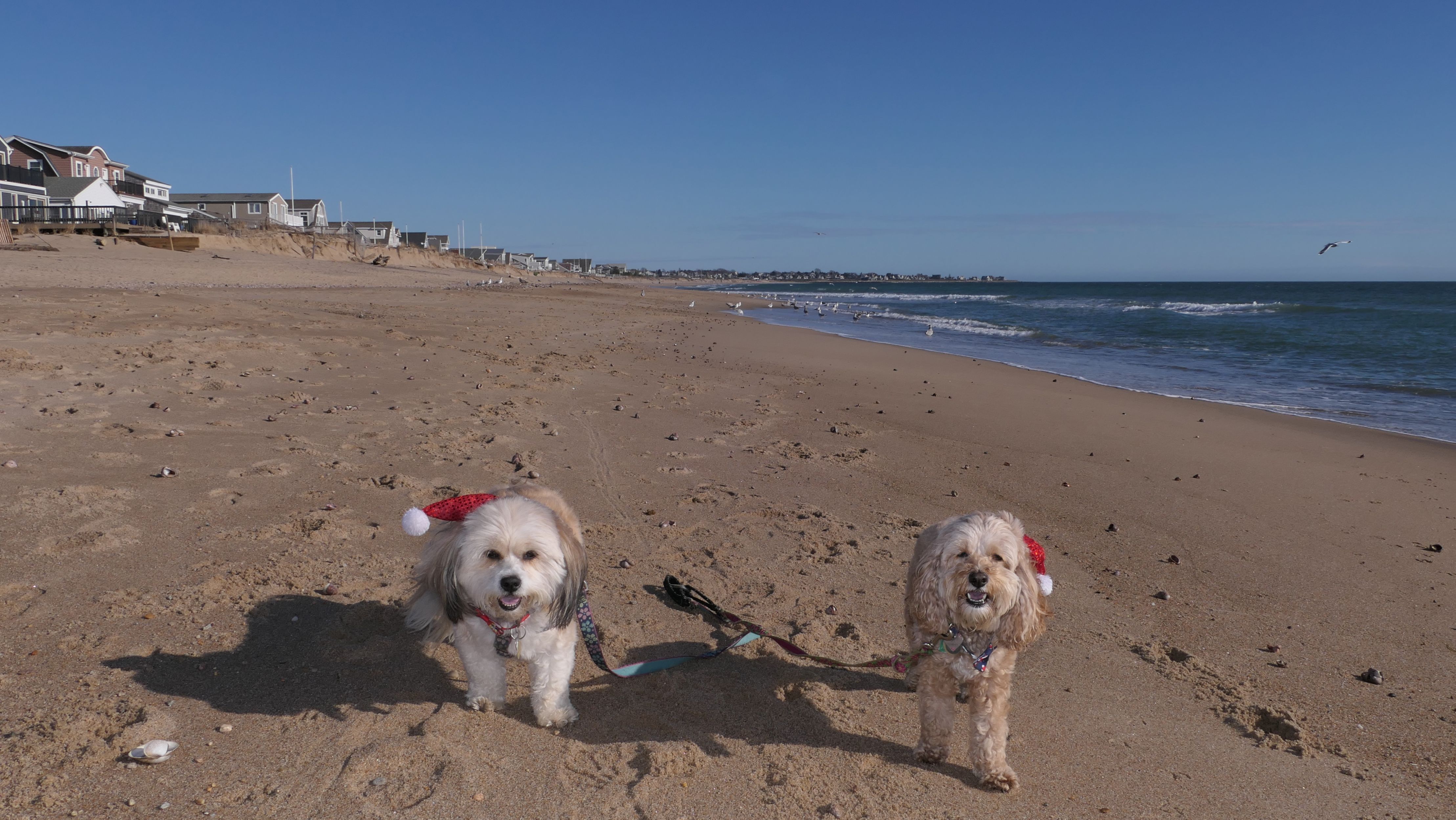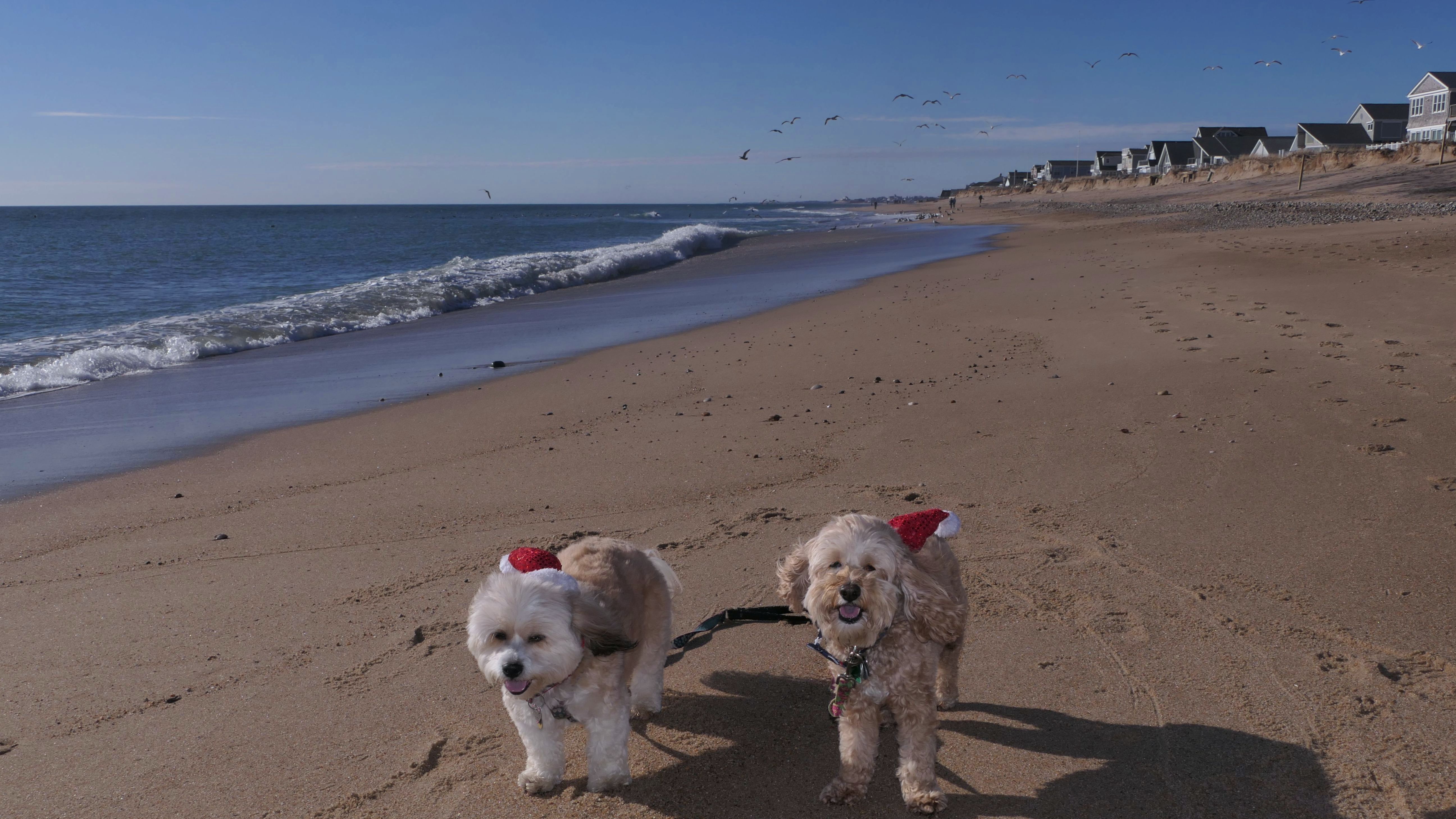 Nothing says Christmas in New England like a trip to the beach! We had a great four mile walk on Christmas Morning. It was damp, dreary, cloudy and foggy in the Hartford Connecticut area, but sunny and near 60 in Westerly. We couldn't park at the main lot since Atlantic Avenue was still flooded from the storm the week before. We parked at Dunes Park just to the west of the breachway, and walked west along the beach. Our route overlapped a bit with a section of the beach we we walked when we were at Misquamicut last year. The dogs were great sports with their Santa hats! And with the hats, we can tell these photos were taken on Christmas and not some day in July!