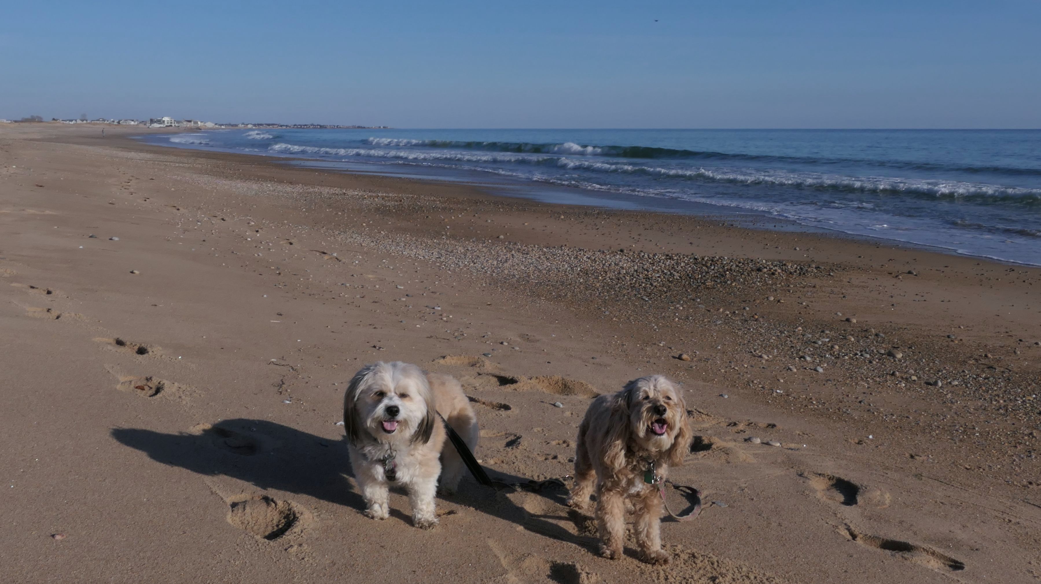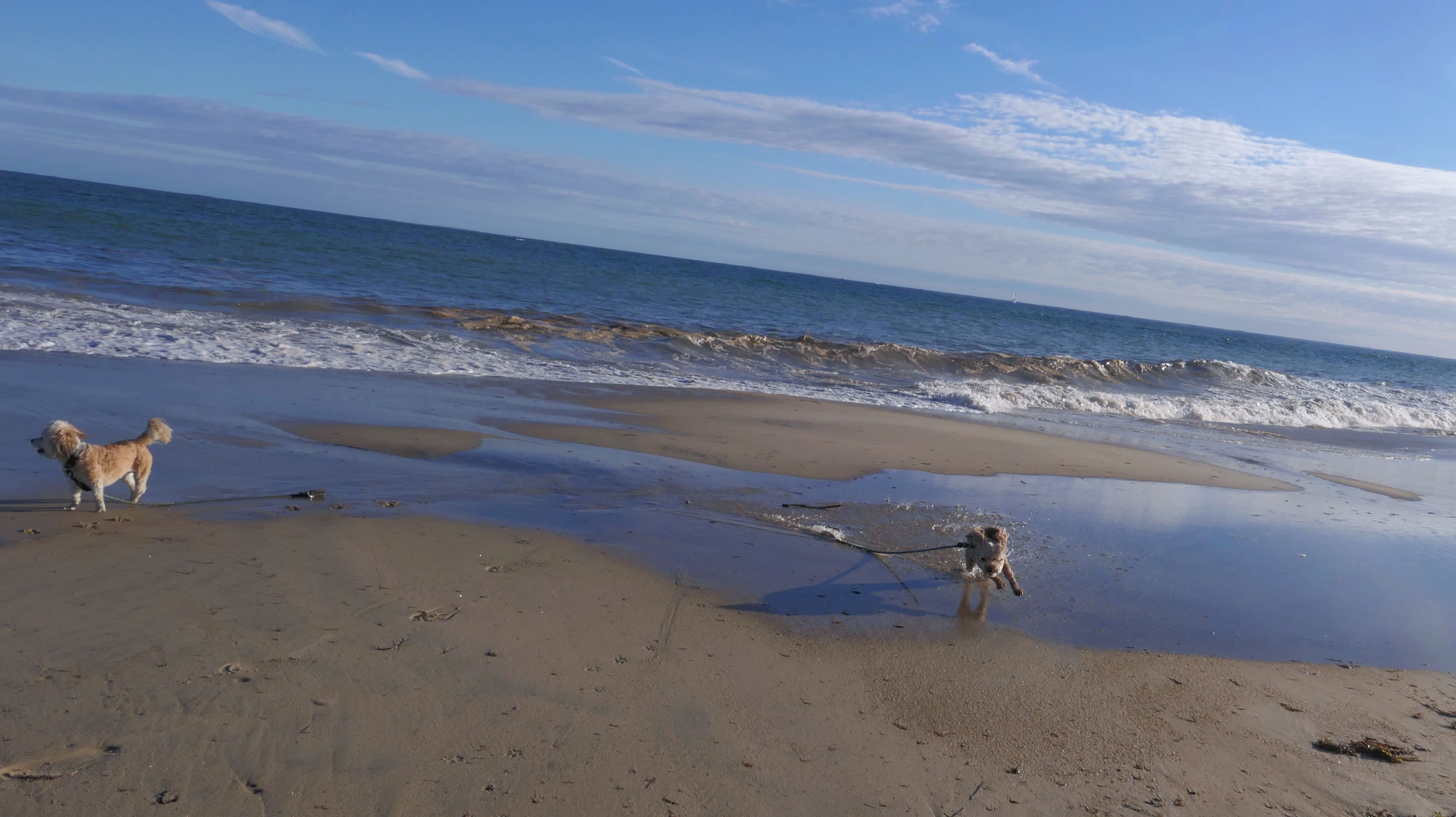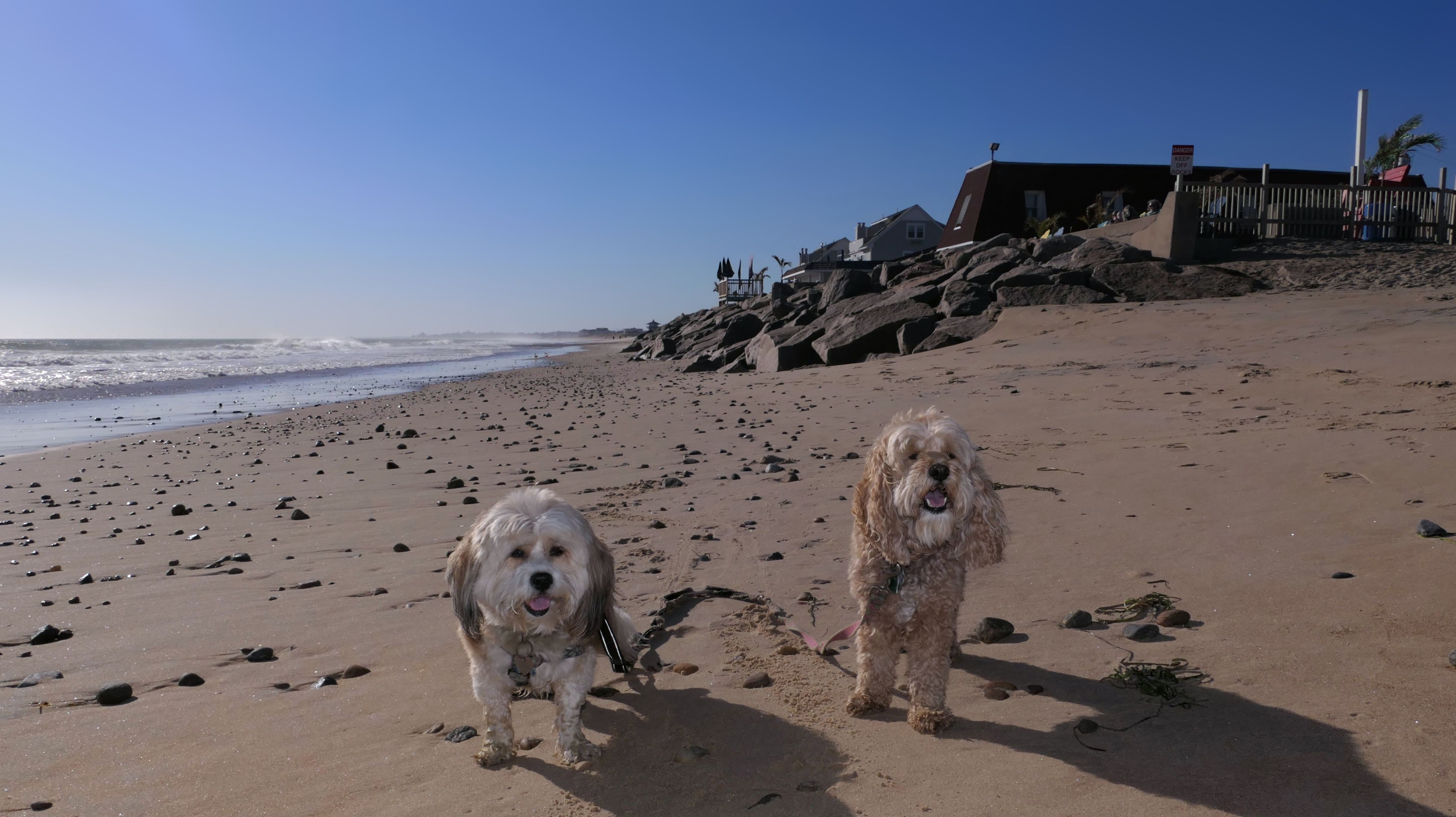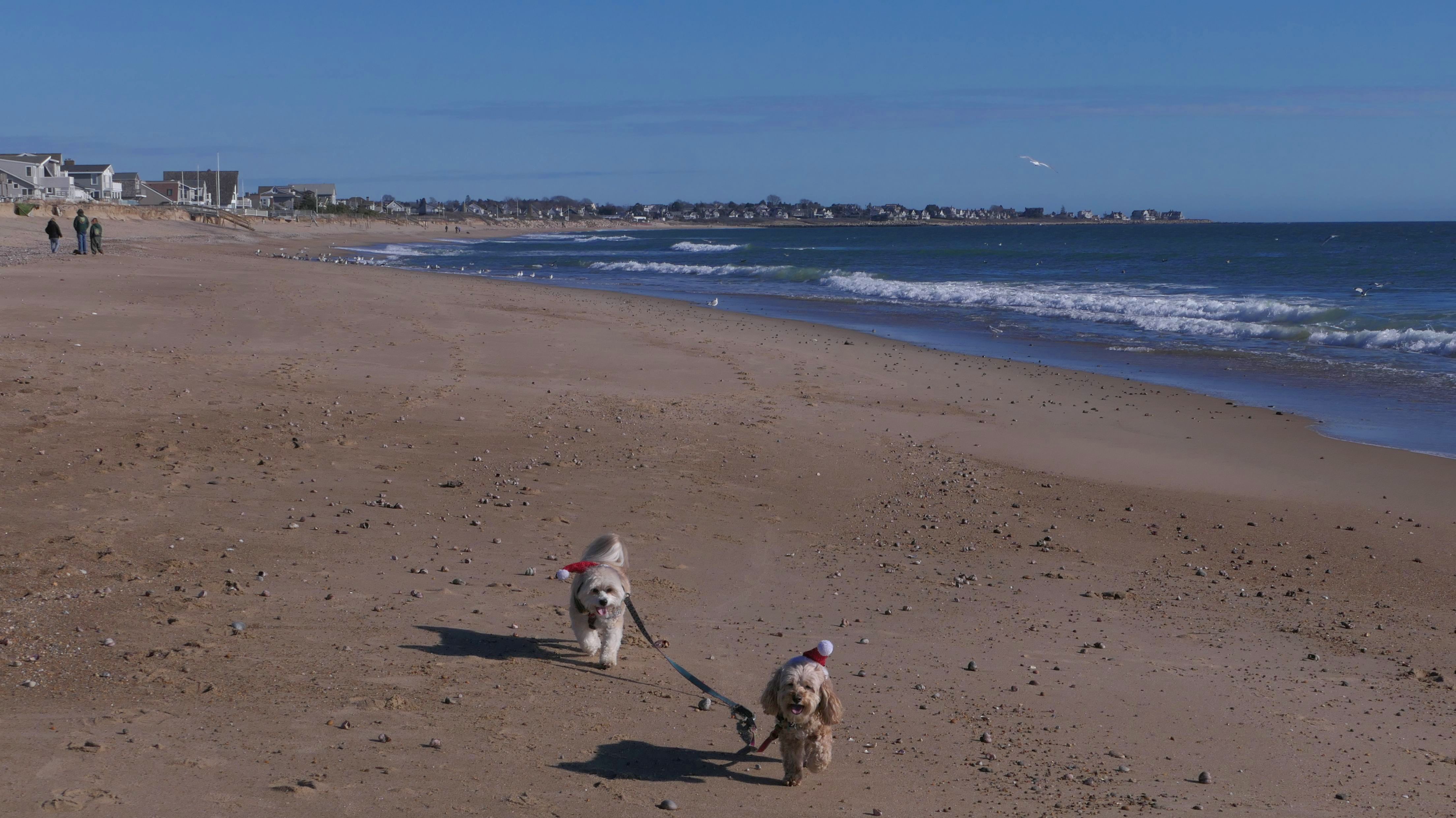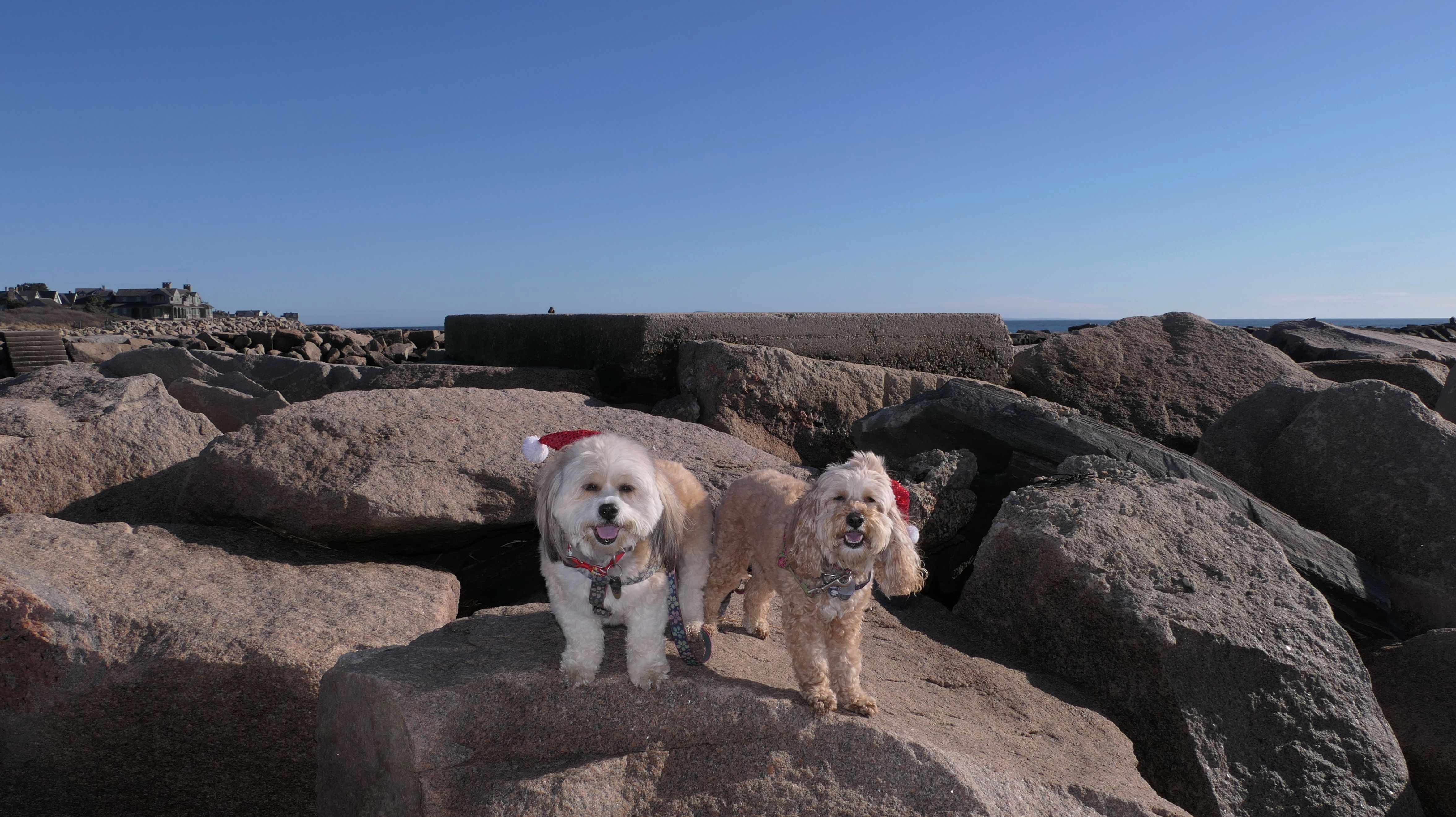 Nothing says Christmas in New England like a trip to the beach! We had a great four mile walk on Christmas Morning. It was damp, dreary, cloudy and foggy in the Hartford Connecticut area, but sunny and near 60 in Westerly. We couldn't park at the main lot since Atlantic Avenue was still flooded from the storm the week before. We parked at Dunes Park just to the west of the breachway, and walked west along the beach. Our route overlapped a bit with a section of the beach we we walked when we were at Misquamicut last year. The dogs were great sports with their Santa hats! And with the hats, we can tell these photos were taken on Christmas and not some day in July!