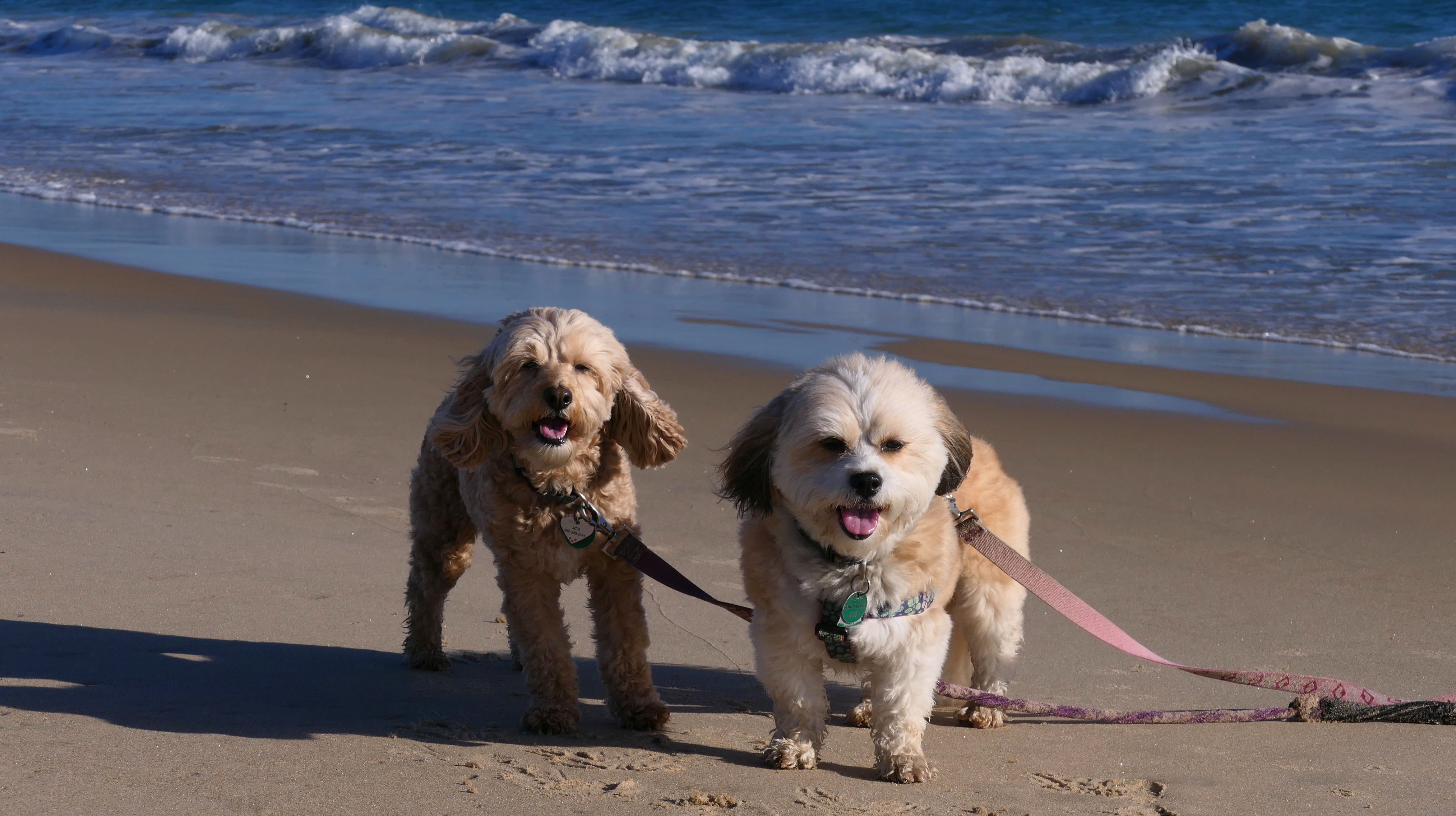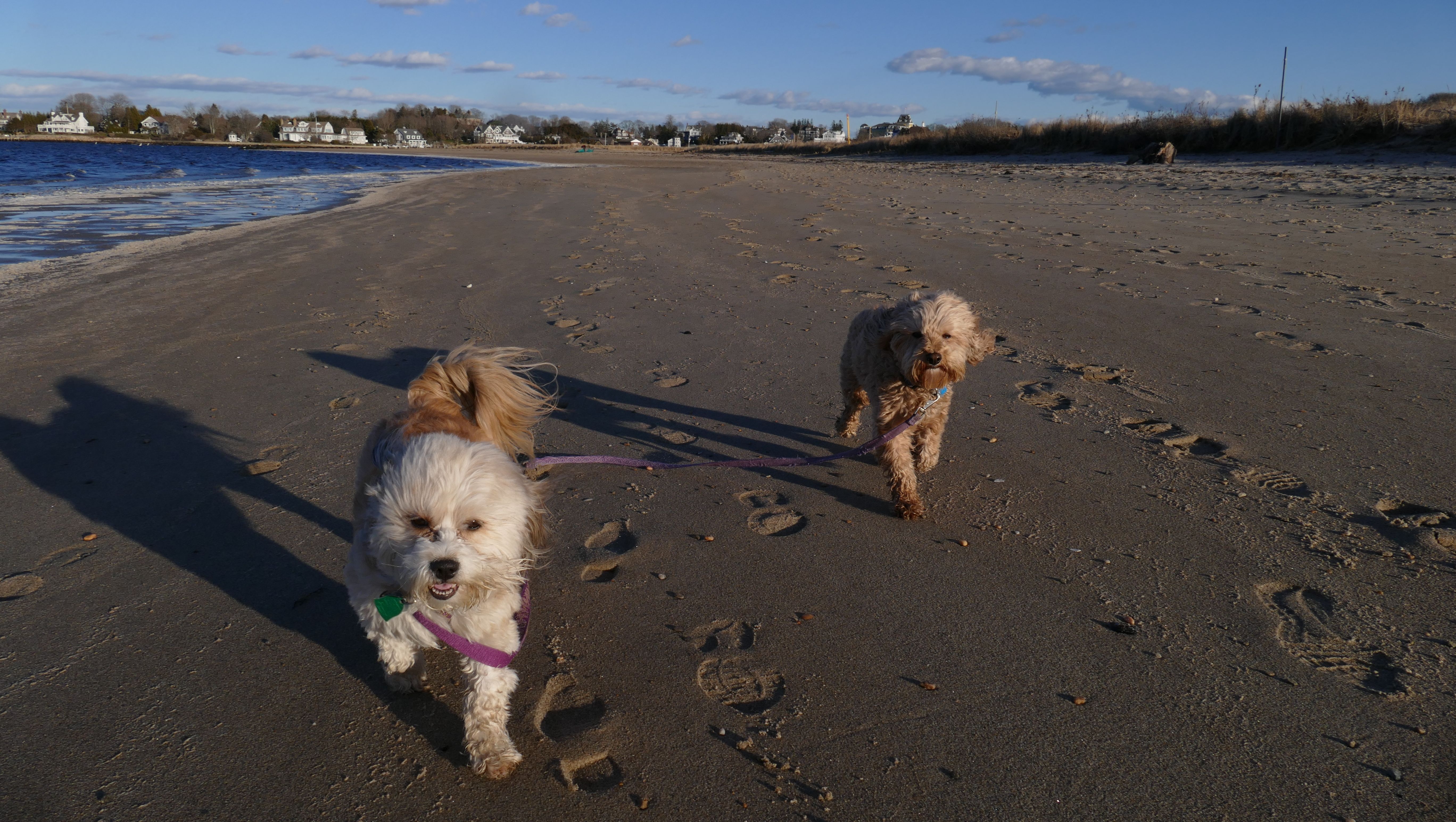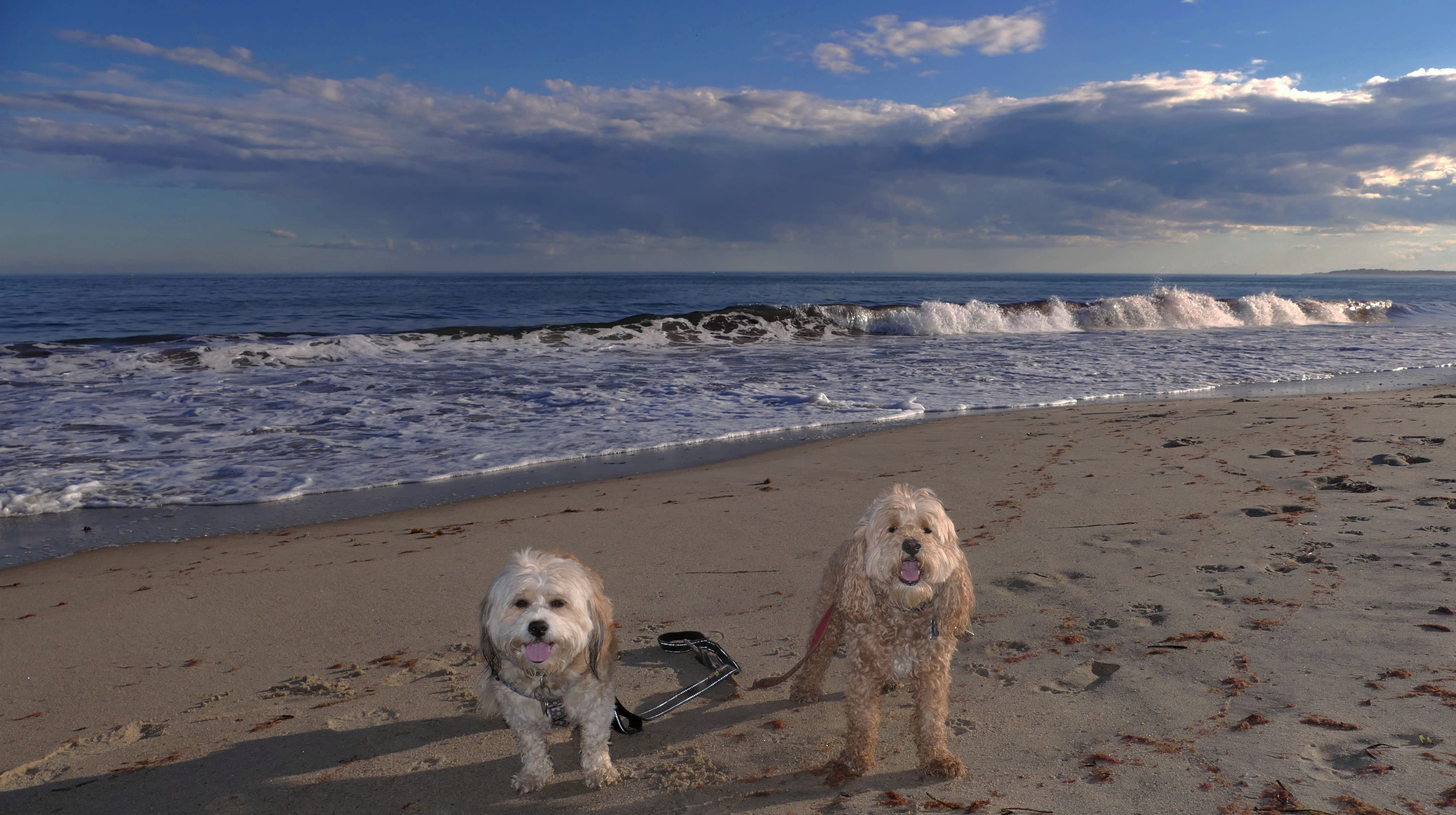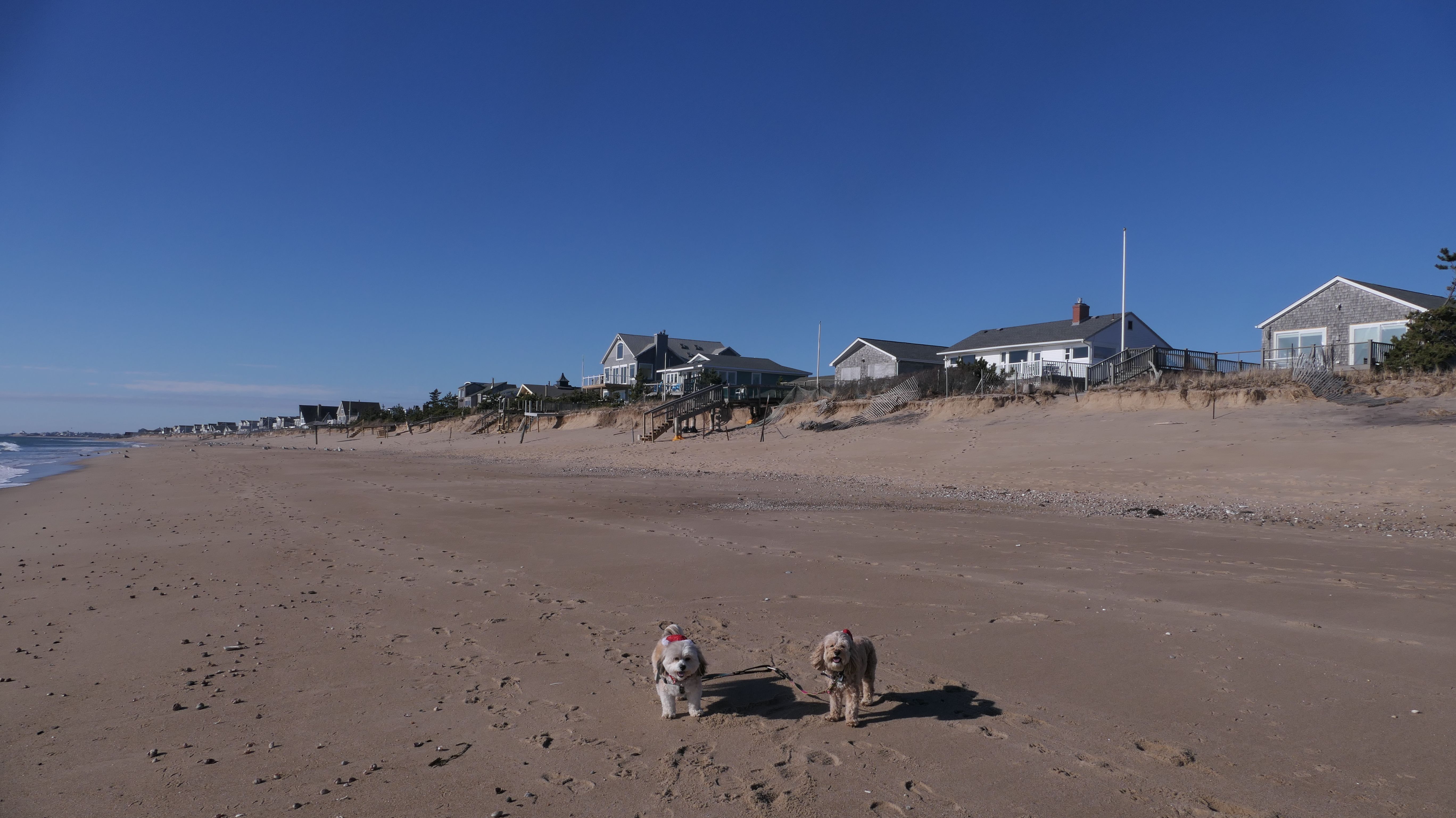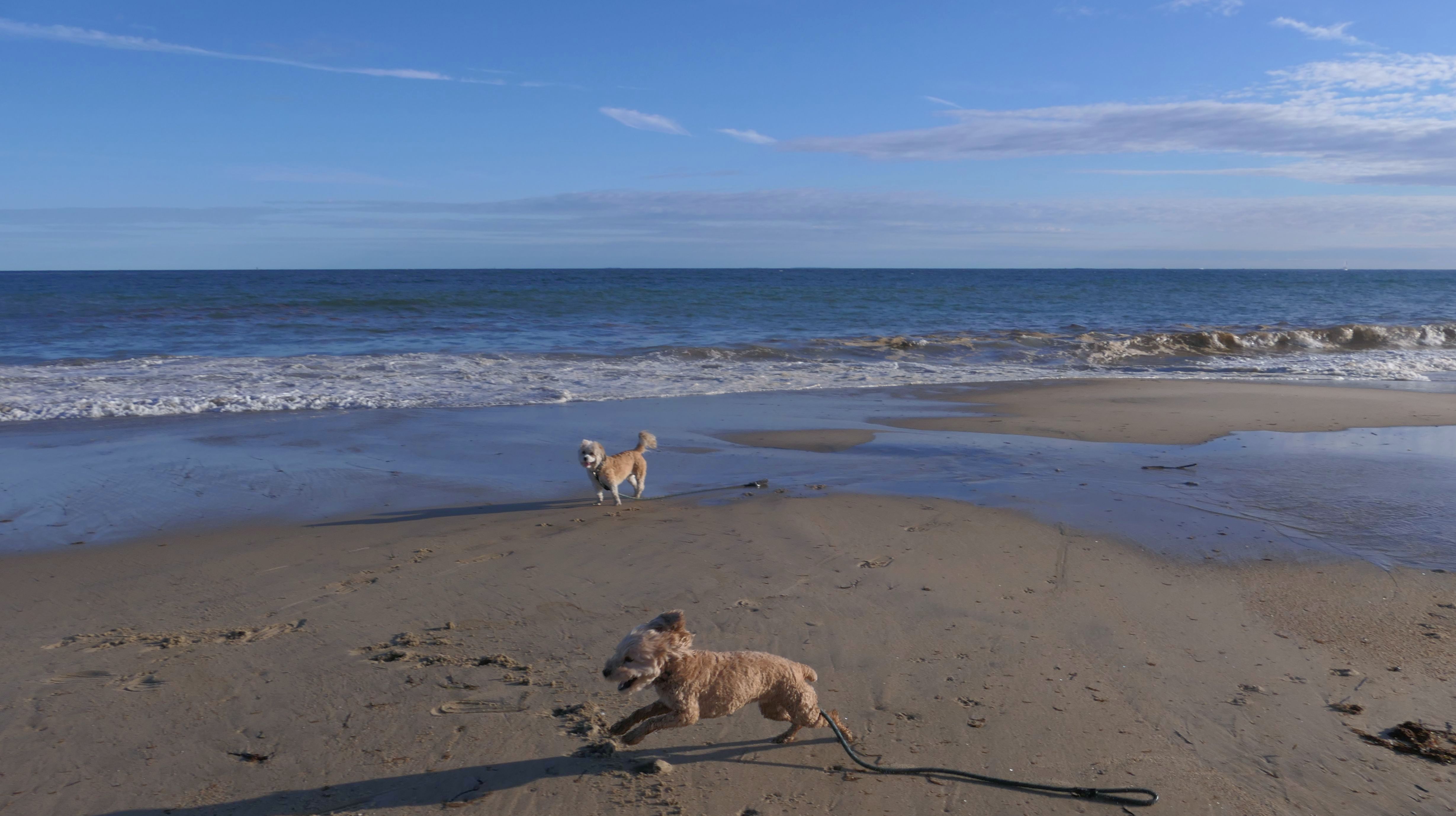 Nothing says Christmas in New England like a trip to the beach! We had a great four mile walk on Christmas Morning. It was damp, dreary, cloudy and foggy in the Hartford Connecticut area, but sunny and near 60 in Westerly. We couldn't park at the main lot since Atlantic Avenue was still flooded from the storm the week before. We parked at Dunes Park just to the west of the breachway, and walked west along the beach. Our route overlapped a bit with a section of the beach we we walked when we were at Misquamicut last year. The dogs were great sports with their Santa hats! And with the hats, we can tell these photos were taken on Christmas and not some day in July!