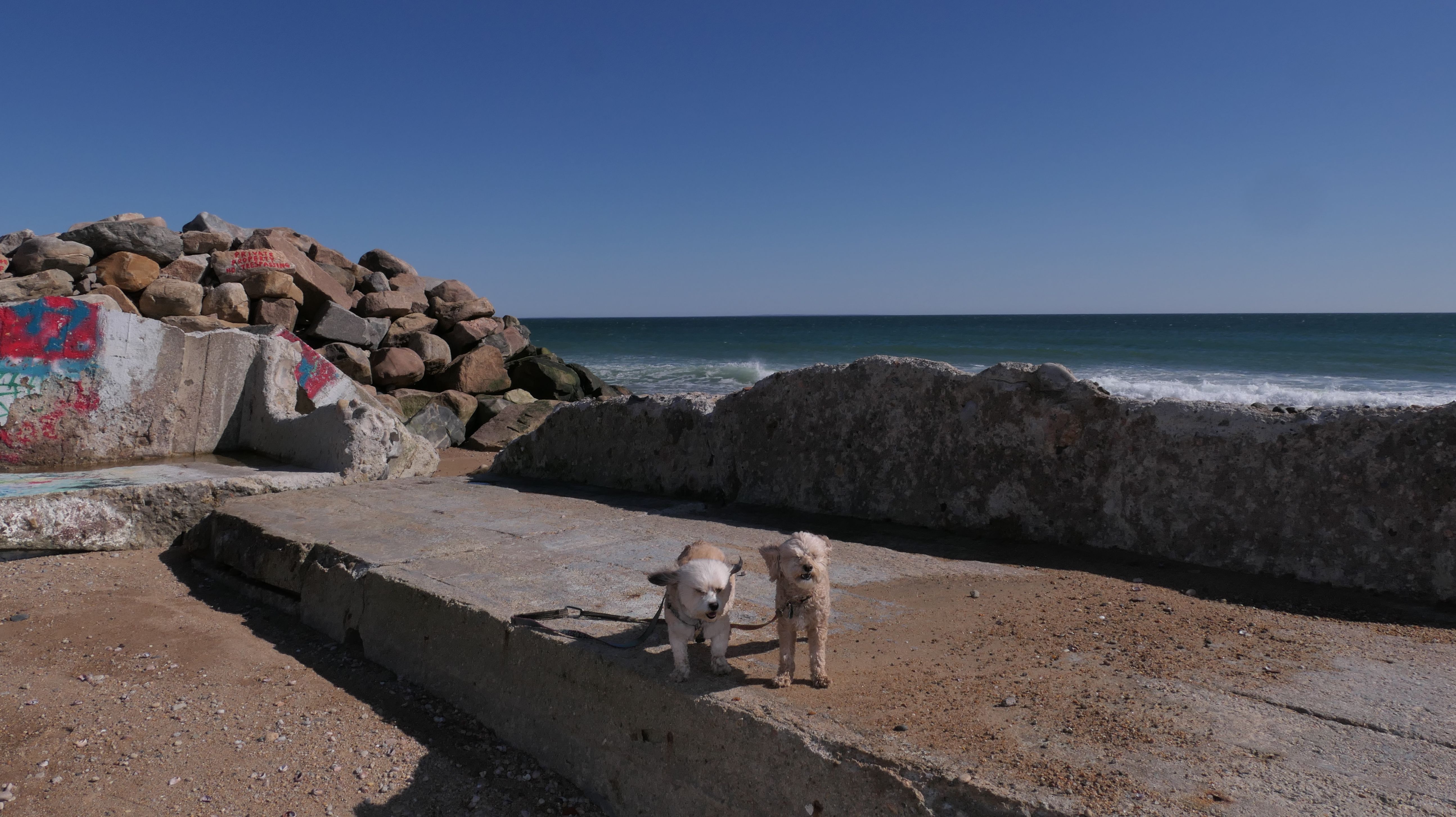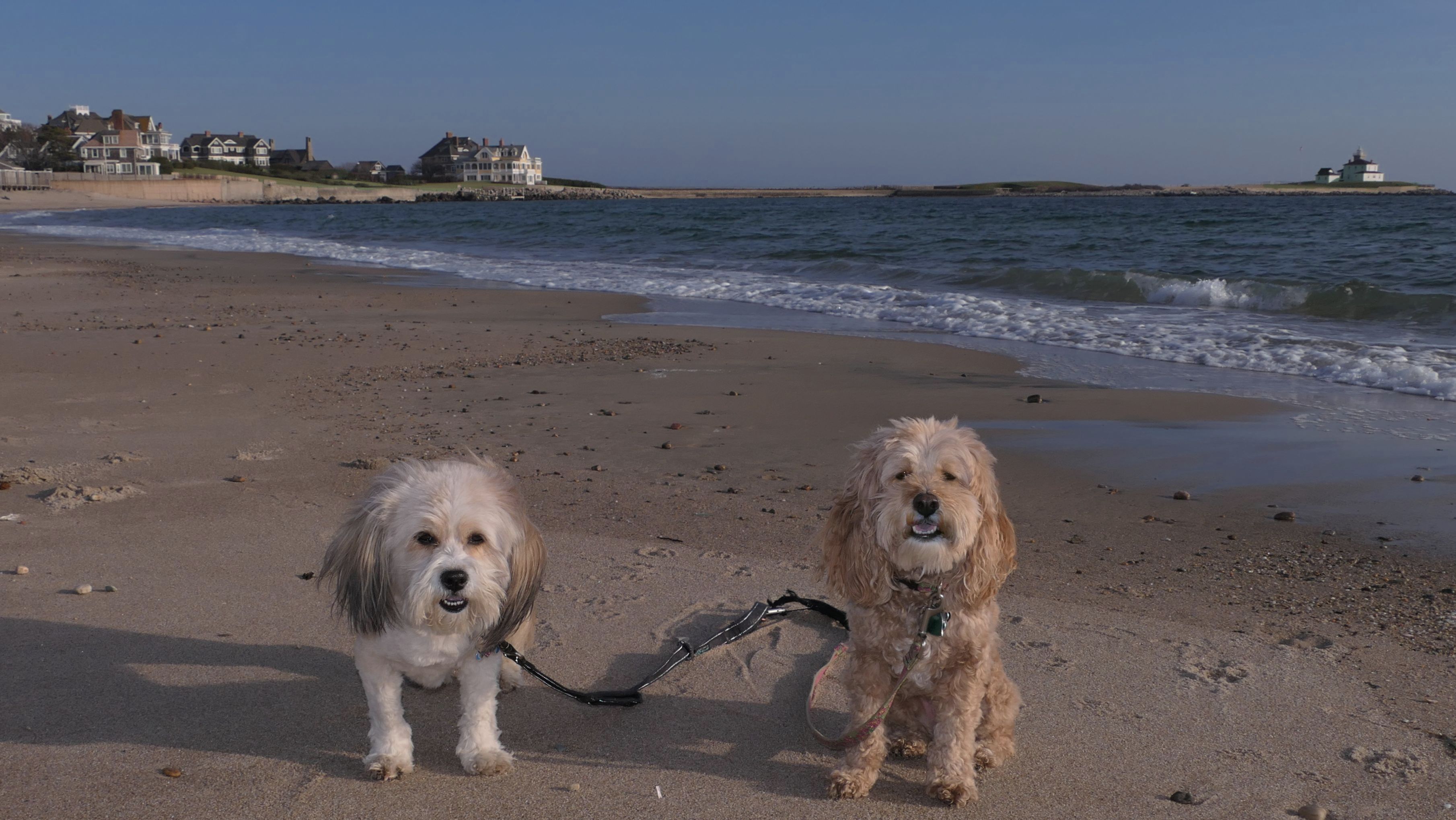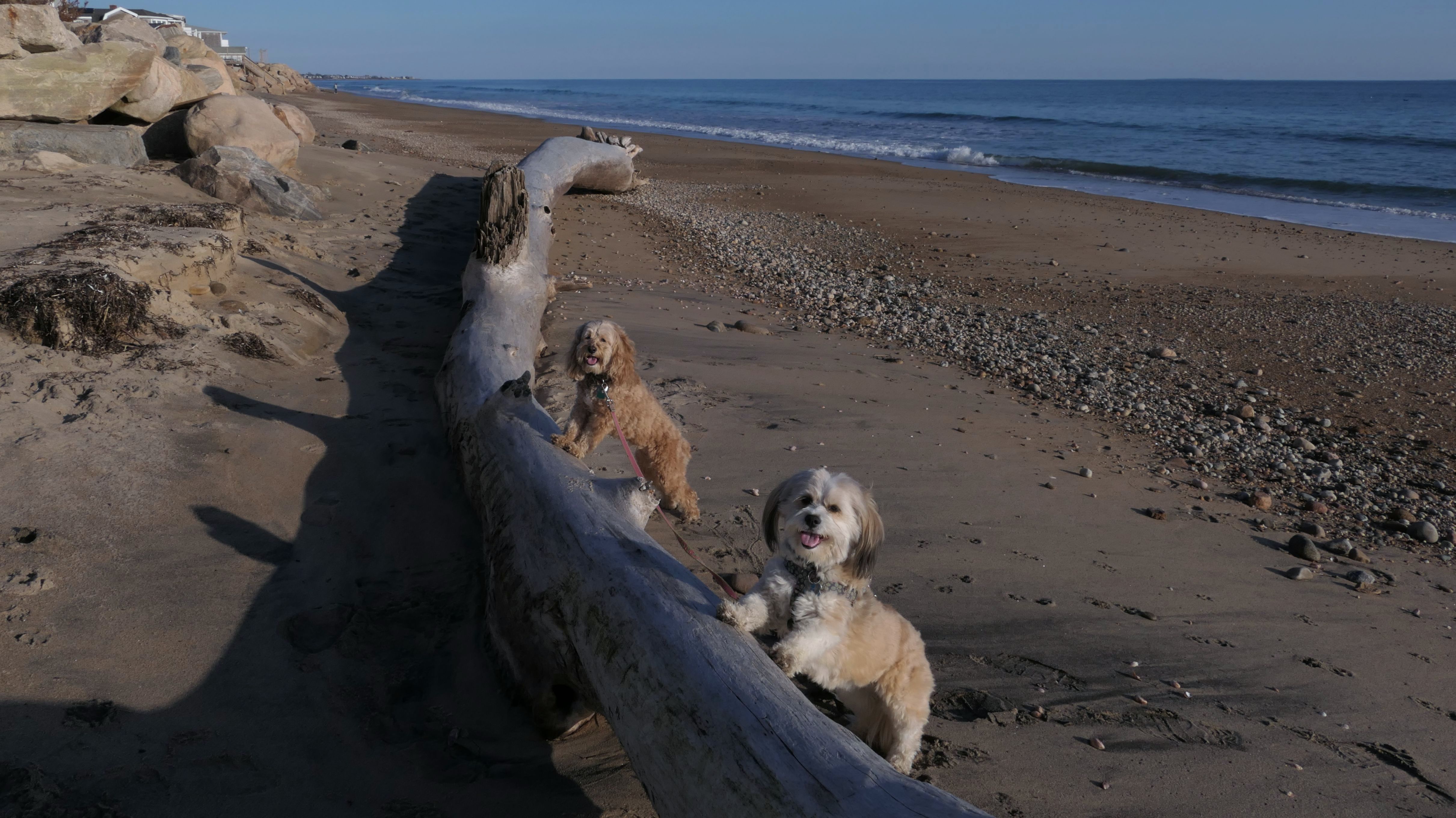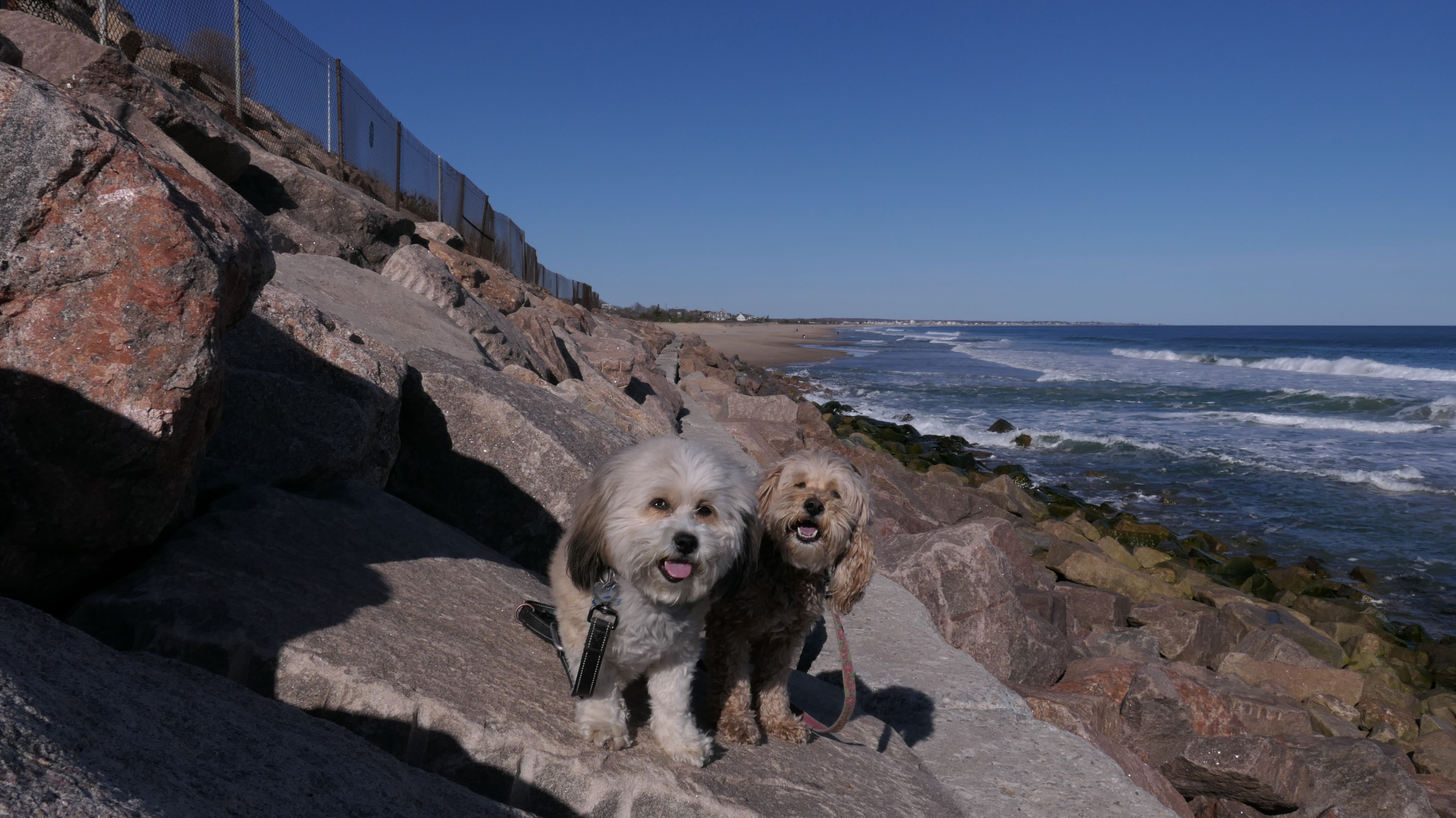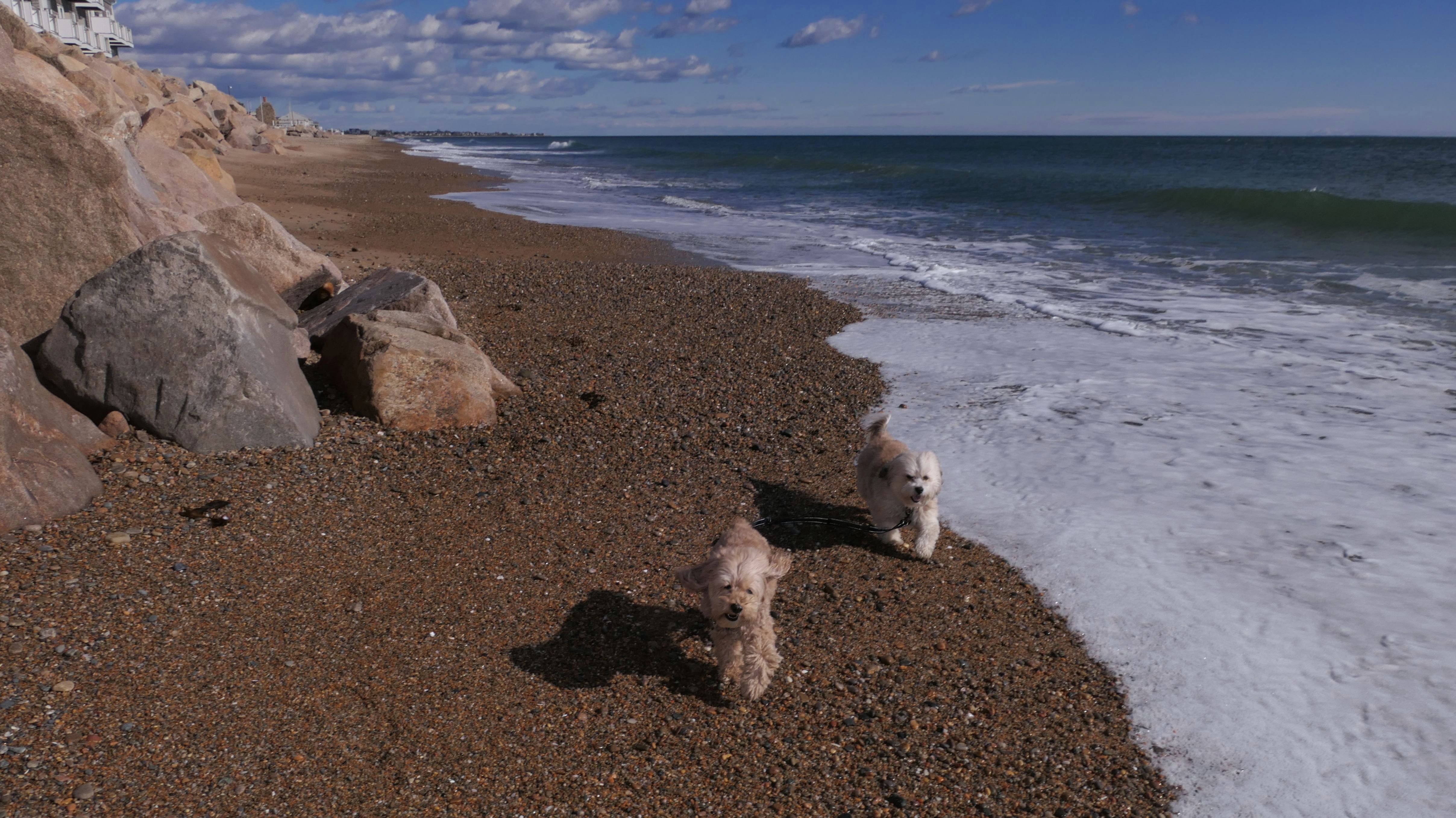 We had record temperatures inland, approaching the mid-80's, so we of course went to a beach! I didn't feel like driving to New Jersey for the 3rd straight day, so we made a return visit to Misquamicut. It wasn't as warm here, probably low to mid 70's, but very breezy. I suspect the wind kept people away. We explored some of the surrounding area before walking the beach. The waves were really ripping here. Mandy kept trying to walk in the water, but Lexi would pull her away. It was a fun adventure, despite the windy conditions.