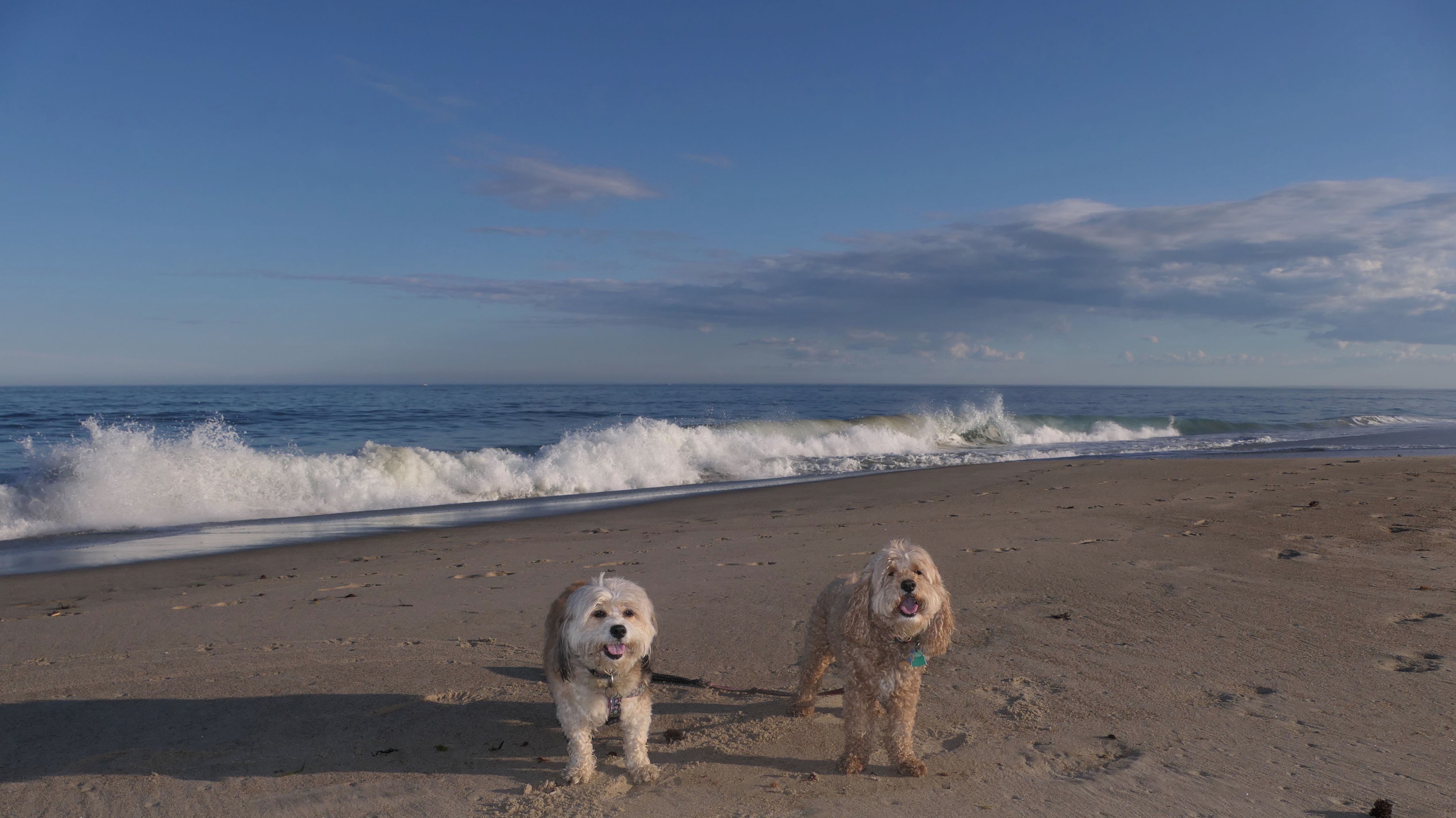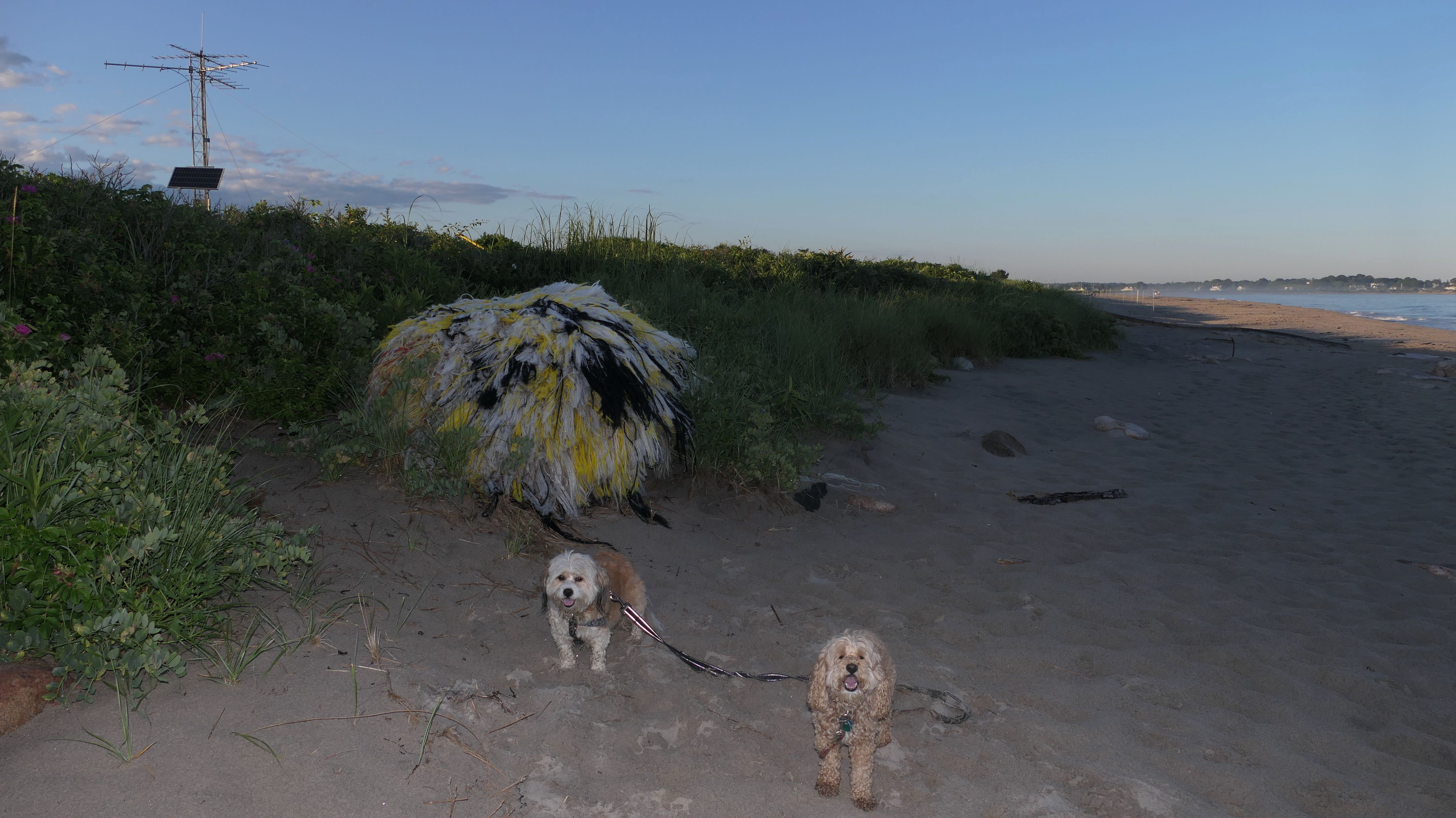 It was a beautiful evening, so we couldn't resist another walk on the beach. This is actually a series of different connected town beaches, but we started near Dunes Park, so that's the category I'm using for these photos. We actually parked at the fisherman's lot just to the west of the breachway, and headed west, most likely overlapping with Westerly Town Beach. Dogs are allowed on the Westerly town beaches after 6PM during the summer months, and we arrived about 20 minutes after 6. It was actually breezy, and felt kind of cool on the beach, despite it being a hot day. There were a lot of kids playing on the beach, and a number of them asked to pet Mandy and Lexi, who were more than happy to oblige! The waves were crazy this evening. Mandy walked through the edge of the waves a few times, but Lexi avoided them for the most part. We walked about a half mile, before turning around and heading back.