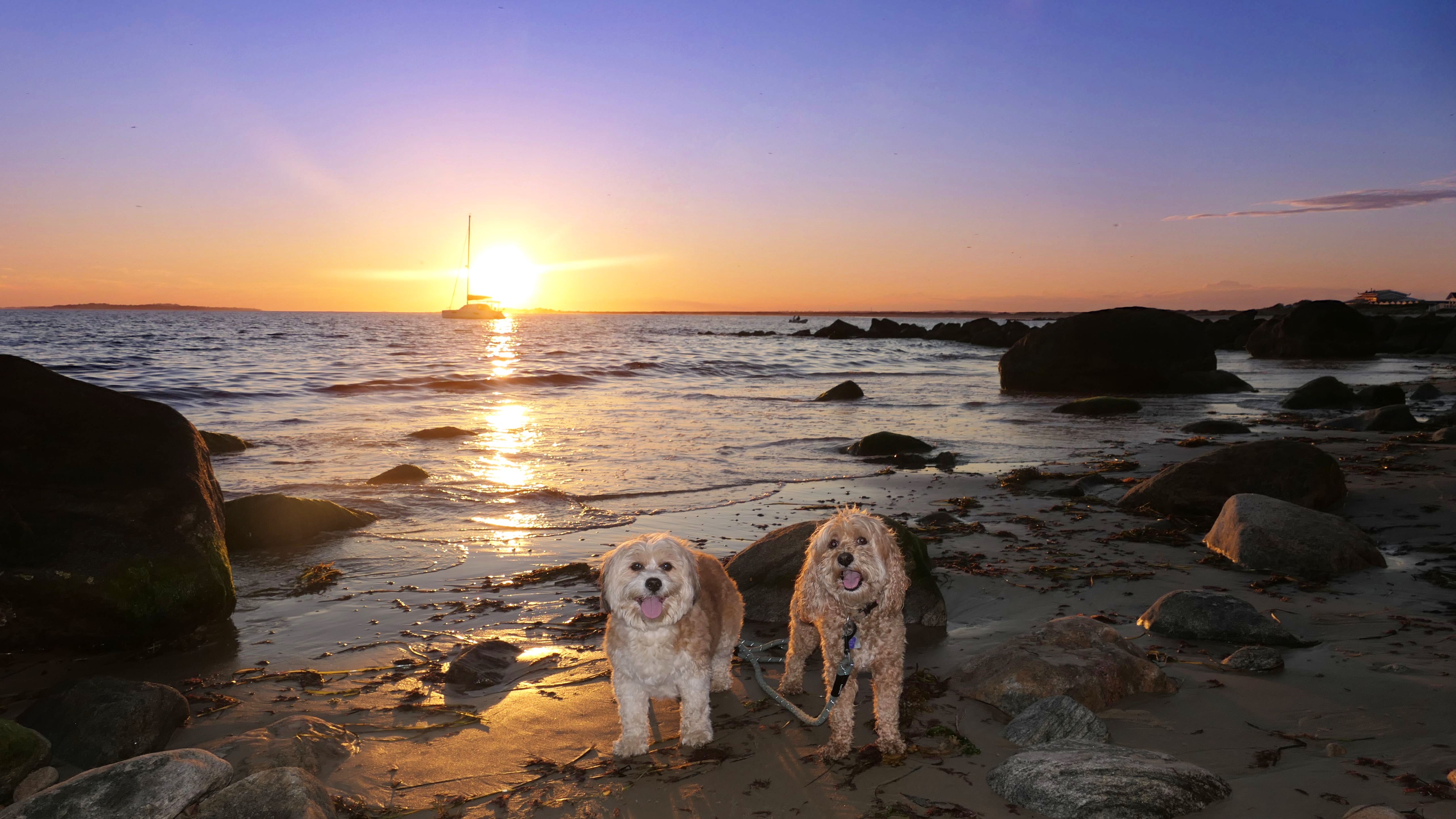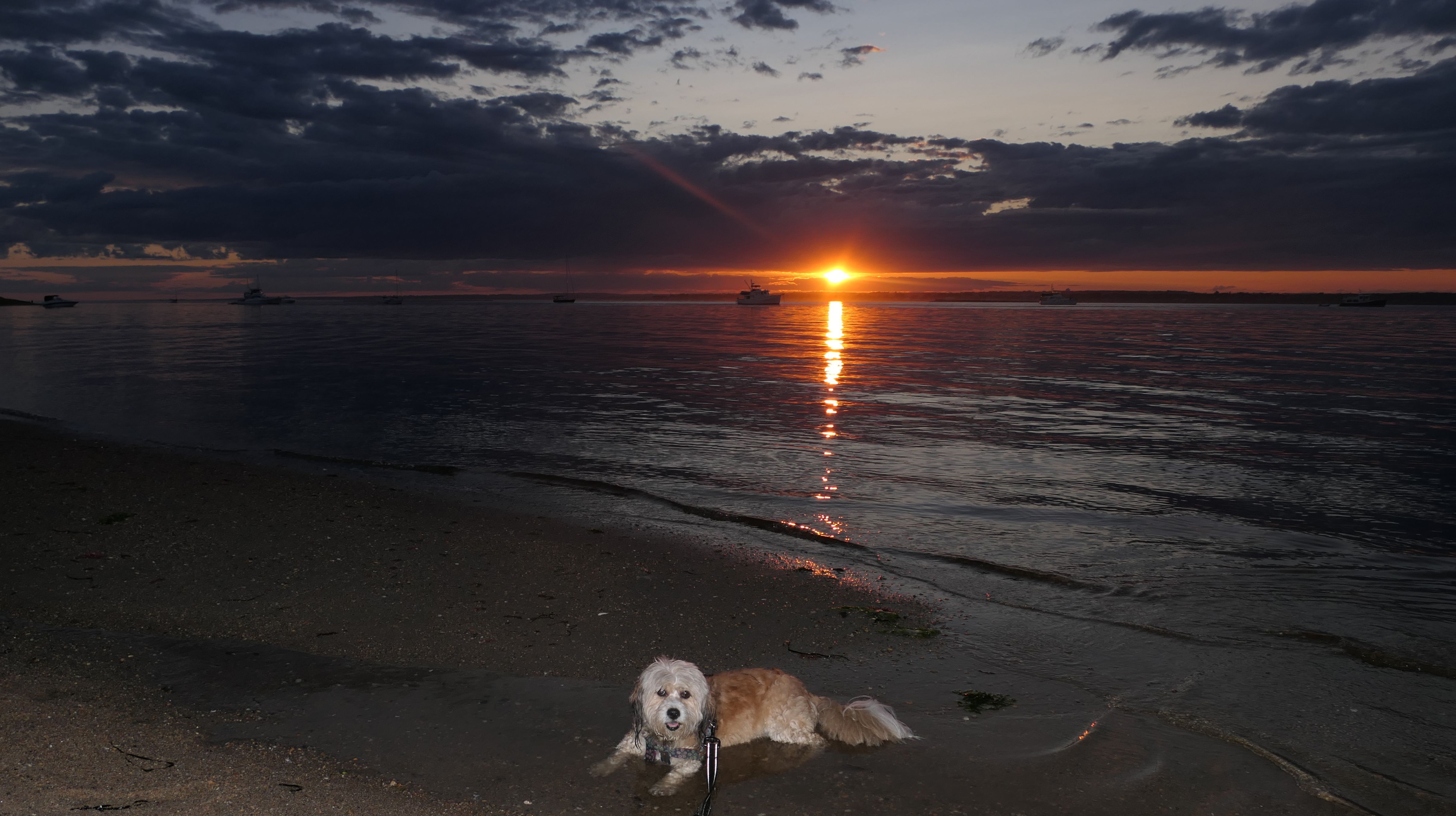 Since it had been three and a half years since the last time we walked the full loop here, it seemed like a good time to revisit this fantastic spot. The first time it was 30 degrees in December, so I thought going in the middle of summer might be a nice change! Dogs are allowed here in the summer time after 6PM, and we got started around 6:15PM, shortly after a considerable rain storm had moved through the area. Napatree Point is a small peninsula that sticks out of the southwest end of Westerly, blocking Stonington, CT from the open waters of the Atlantic. We started on the ocean side, which is pretty must just a nice walk on the beach. It was just after high tide, and the waves were pretty strong. Once we got to the rocks at the tip of the peninsula, there wasn't a way I could find to safely get to the other side of the point. There are a few cross-over trails along the way, but they were roped off due to piping plovers nesting, so we couldn't walk the same loop that we did back in December of 2020. We had to head back along the beach the way we came, and cross over to the bay side much closer to our starting point. We made it just in time for the sunset, which was barely visible between the few clouds that had moved through. Since the waves are tame on the bay side, the dogs enjoy the water much more on this side! This was a wonderful evening hike, even if we couldn't walk the entire route as planned.