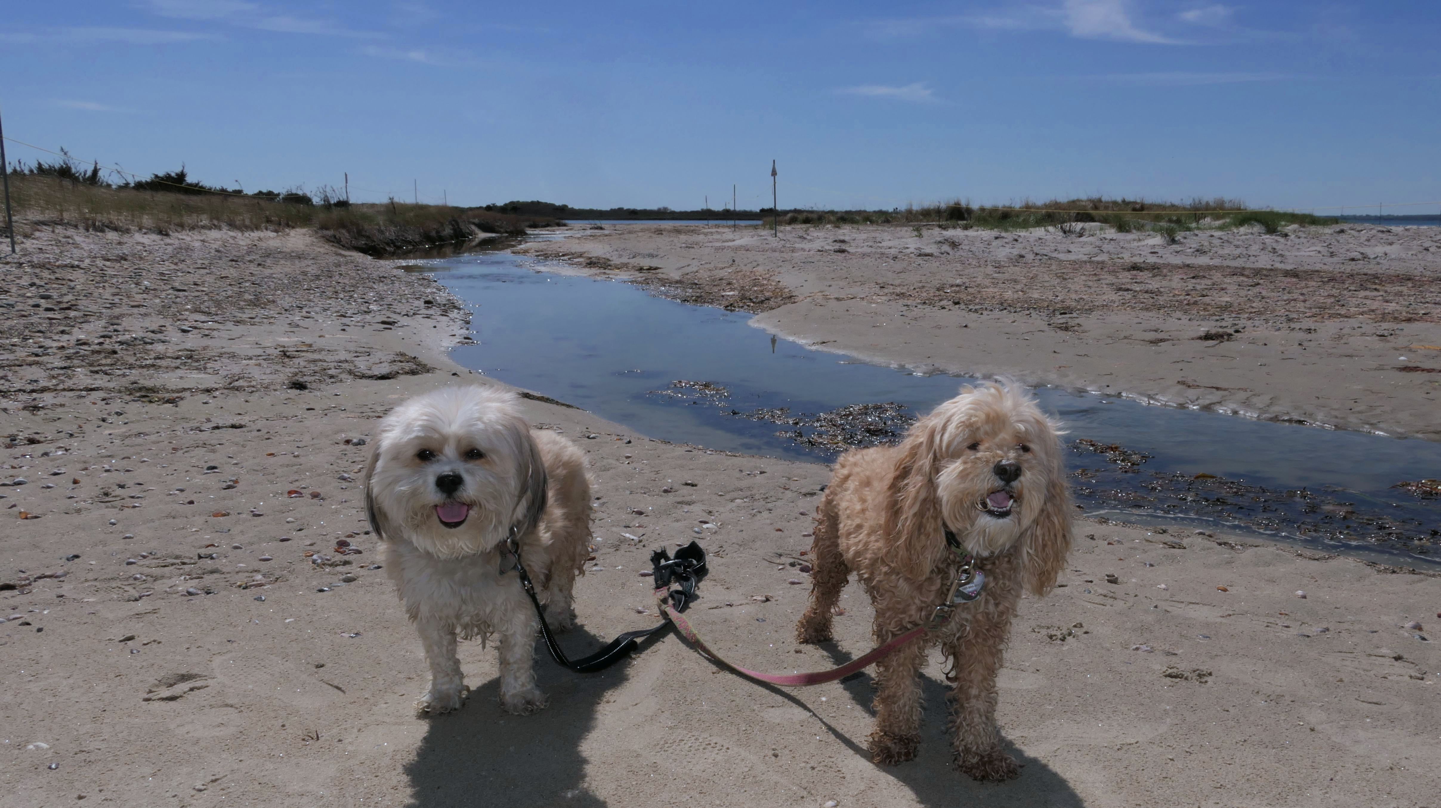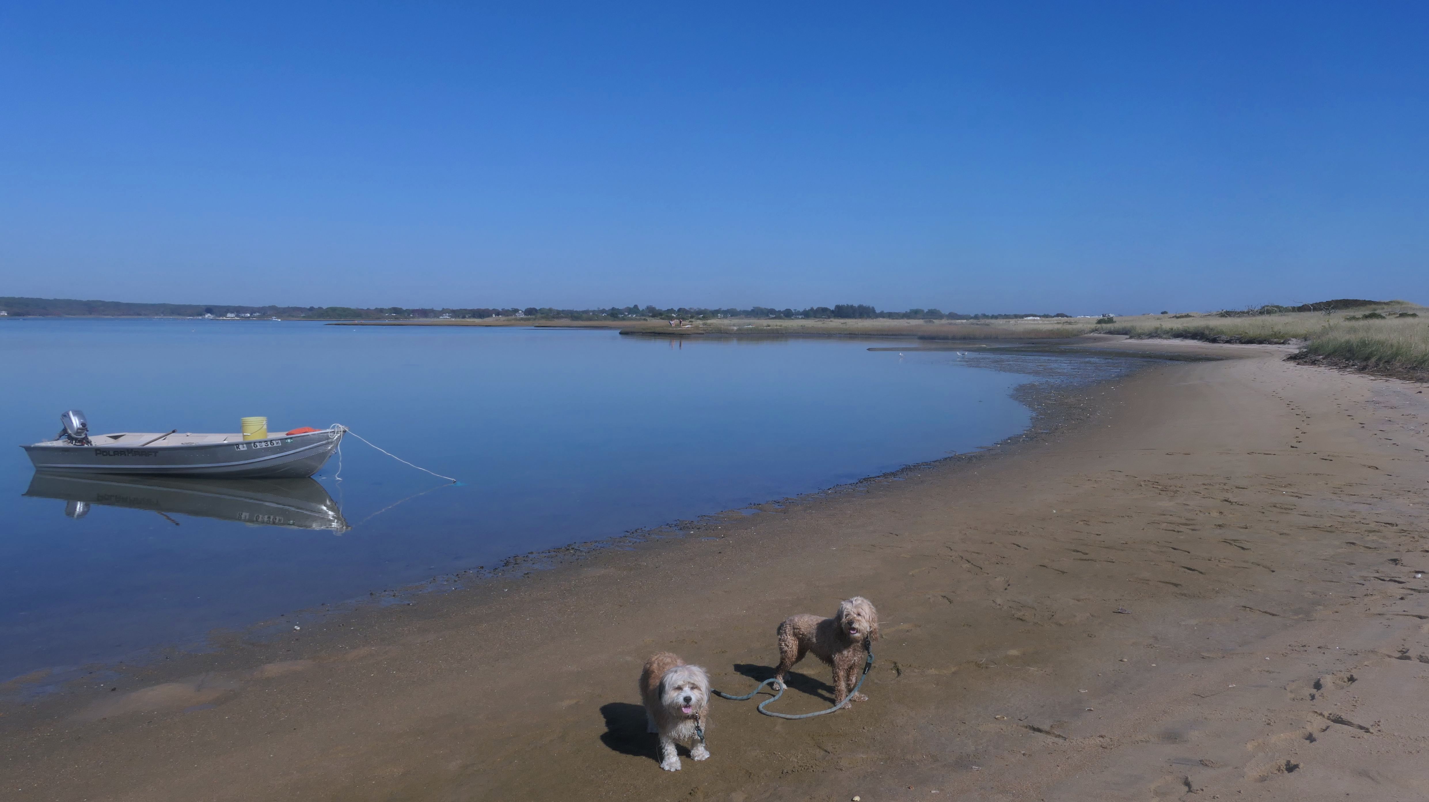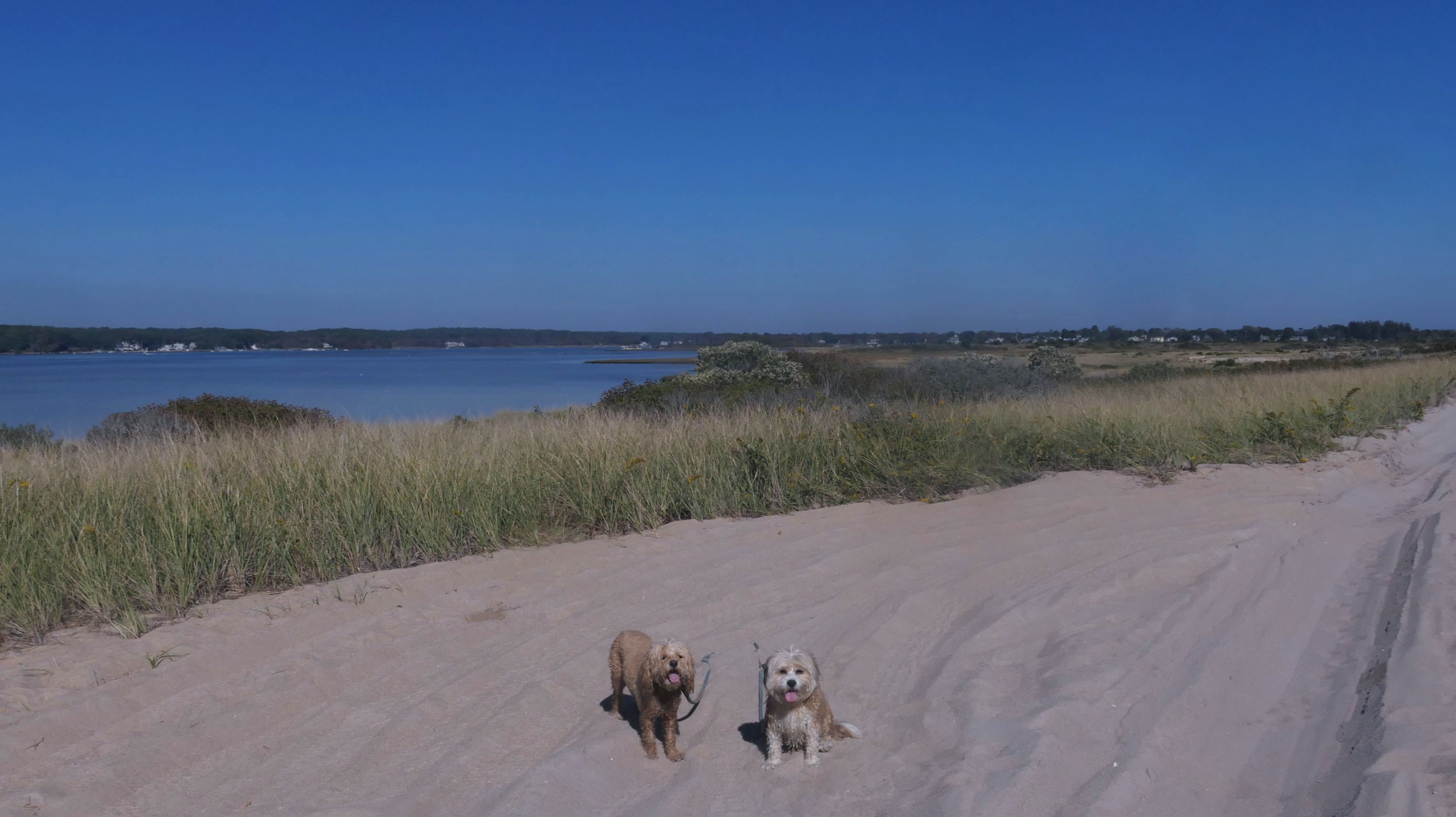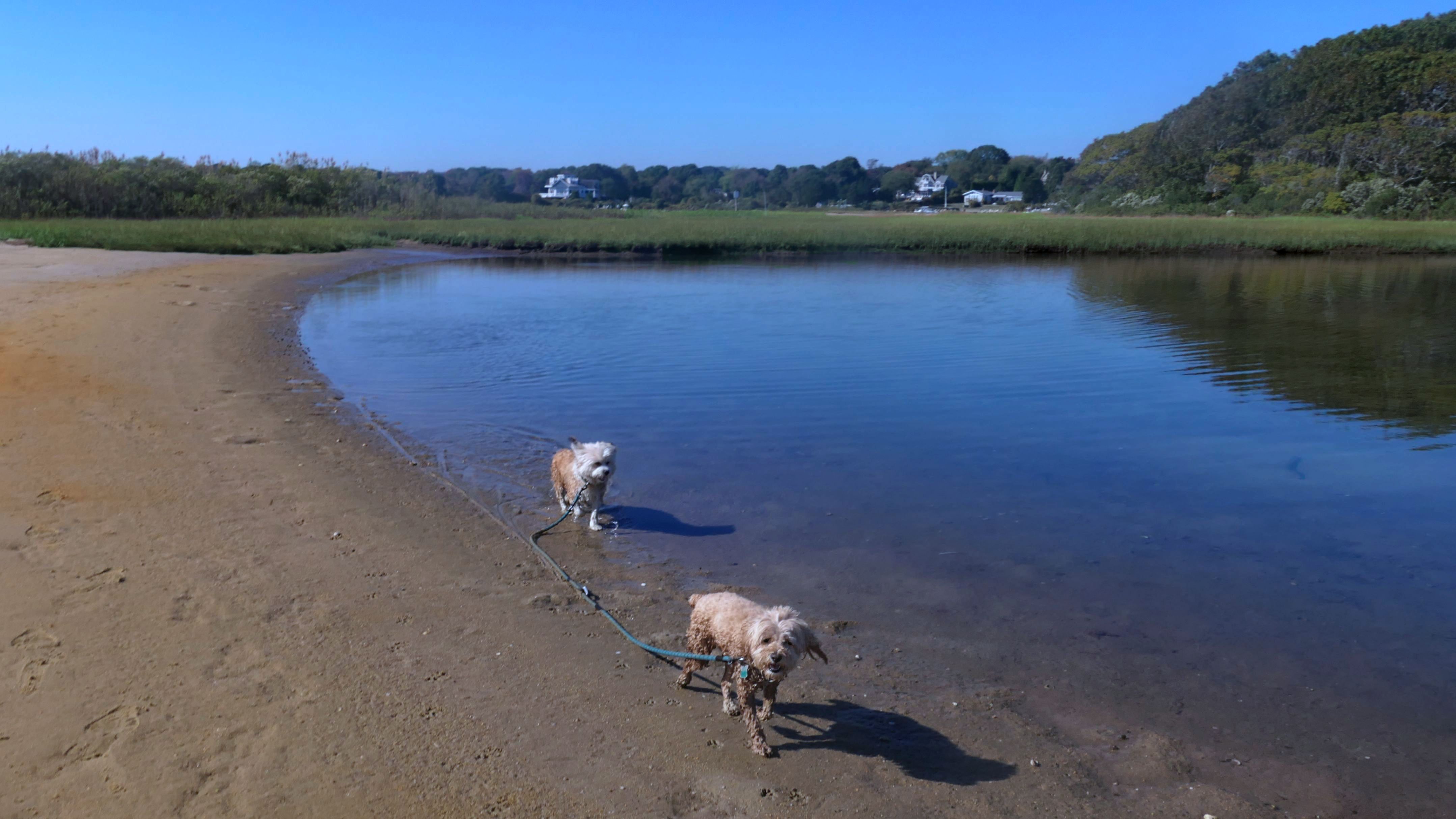 We arrived here right at high tide. Even though Hurricane Erin was still far away, it was already starting to causing higher than normal tides in Southern New England. We actually had to walk through water just to get to the beach. Even on the bay side where the entrance to the conservation area is, water had overtaken most of the sand. Not only that, the parking lot was flooding as well. Of course, that didn't stop Mandy & Lexi from playing on the beach! The tides are only supposed to get worse the next few days, but at least the dogs got to run around and play on this day.
