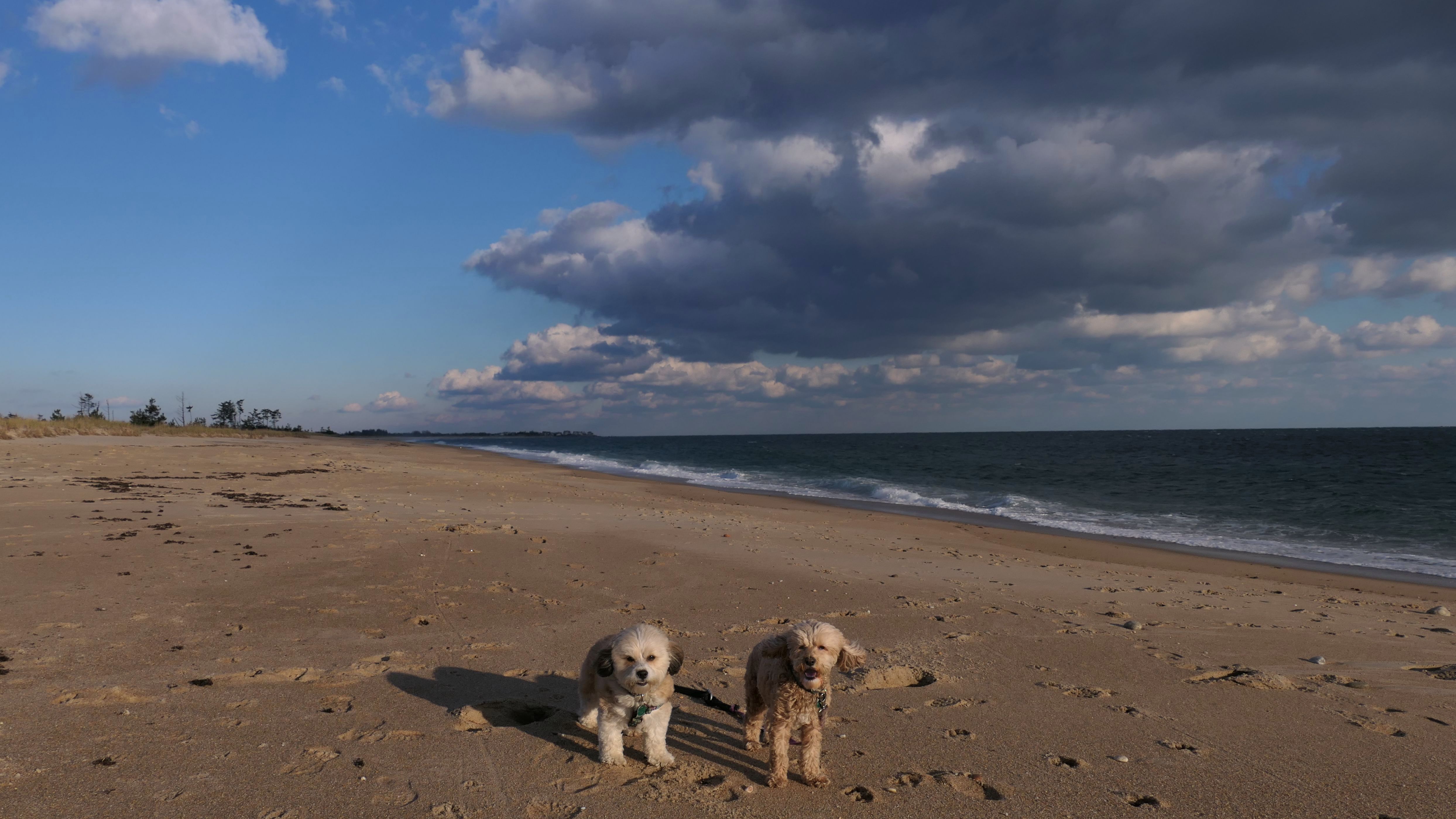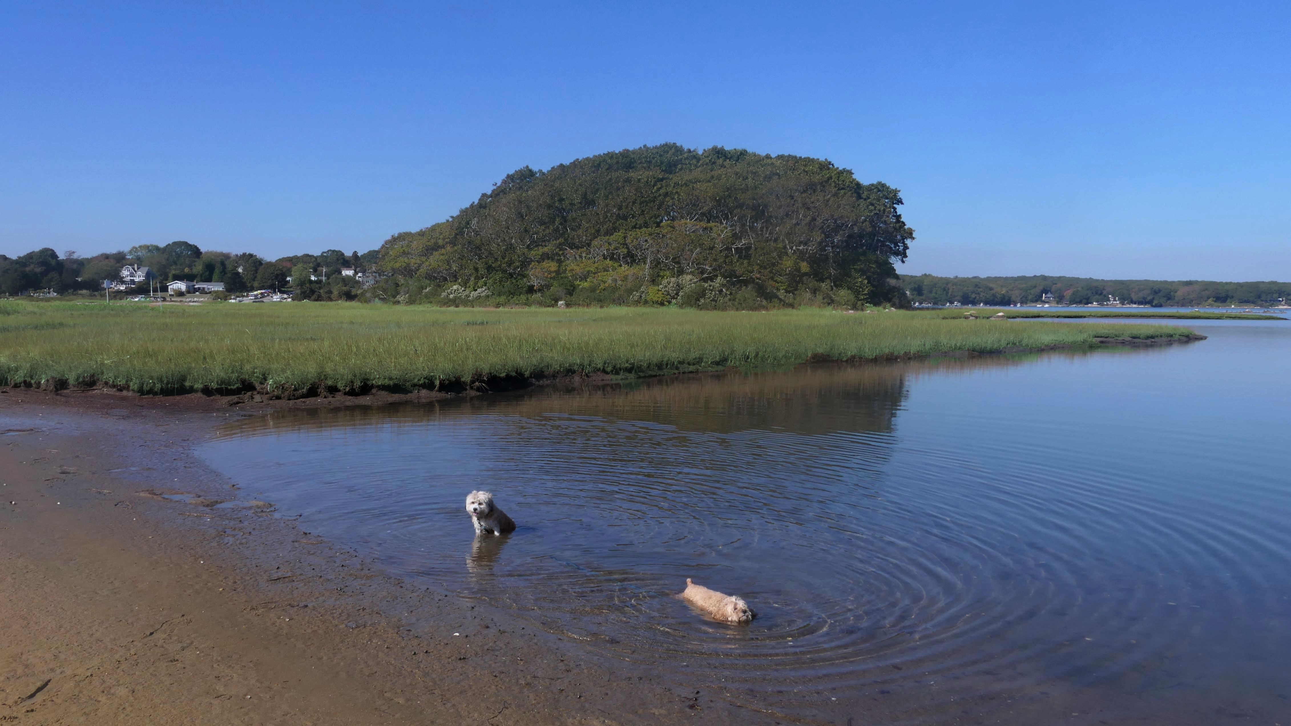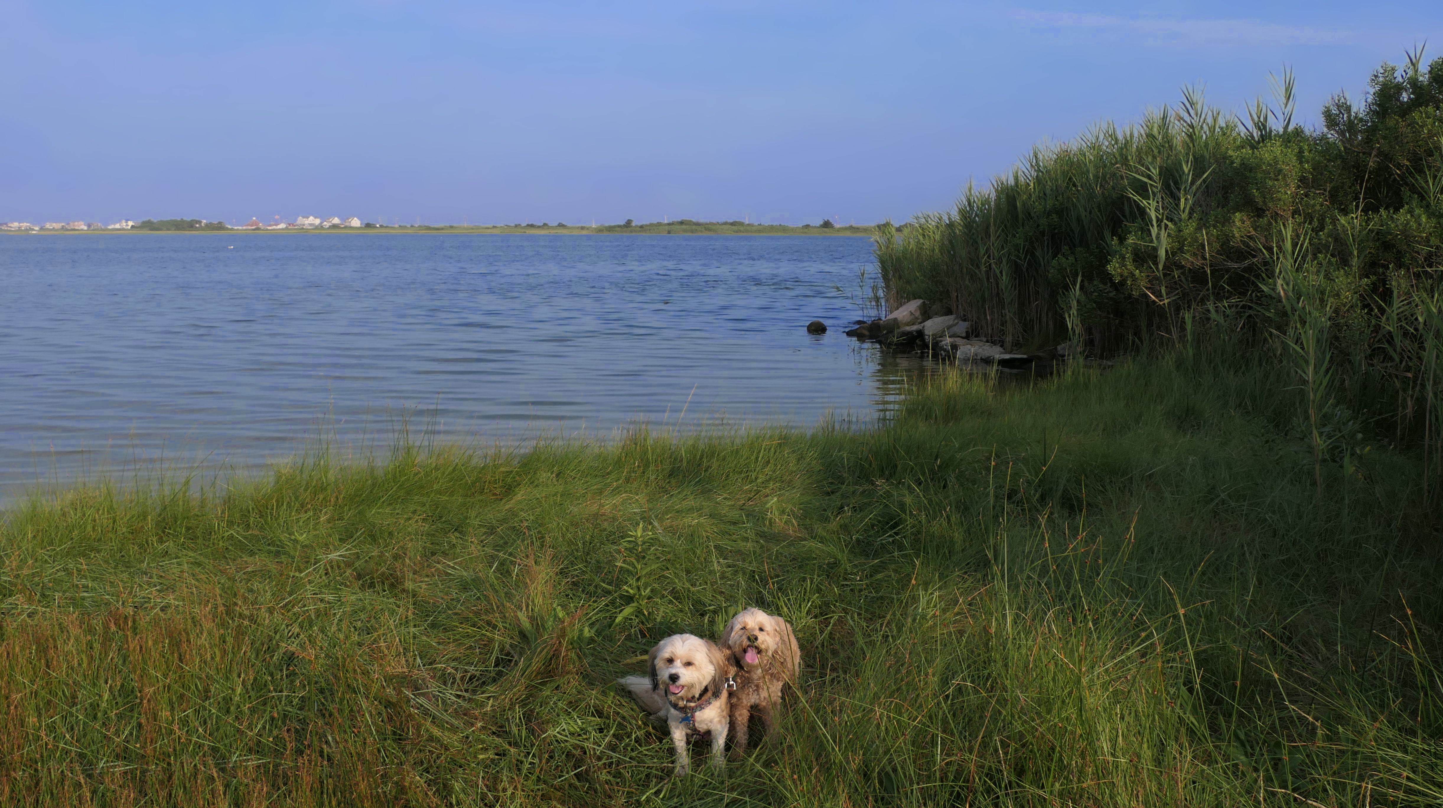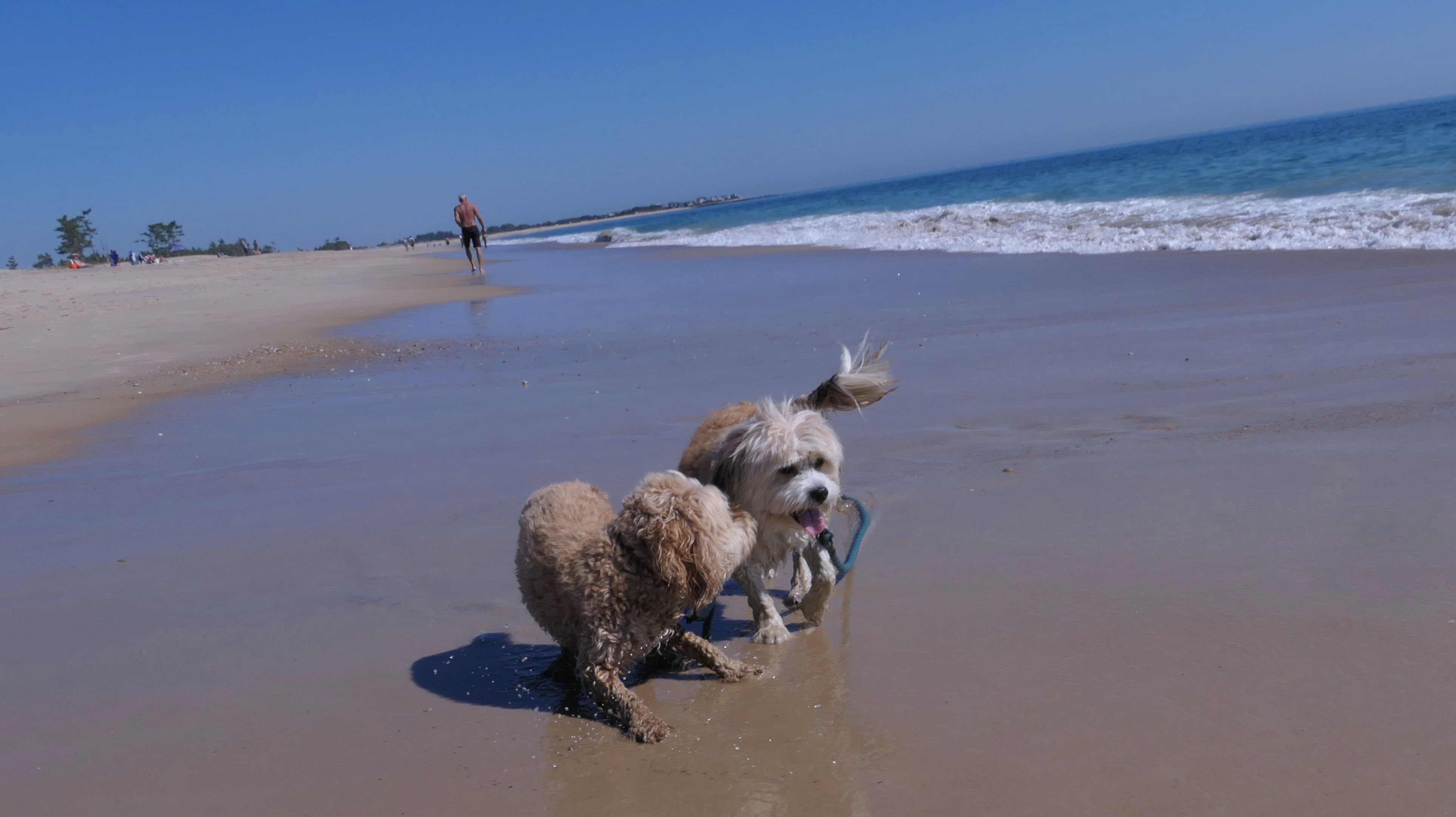 We arrived here right at high tide. Even though Hurricane Erin was still far away, it was already starting to causing higher than normal tides in Southern New England. We actually had to walk through water just to get to the beach. Even on the bay side where the entrance to the conservation area is, water had overtaken most of the sand. Not only that, the parking lot was flooding as well. Of course, that didn't stop Mandy & Lexi from playing on the beach! The tides are only supposed to get worse the next few days, but at least the dogs got to run around and play on this day.