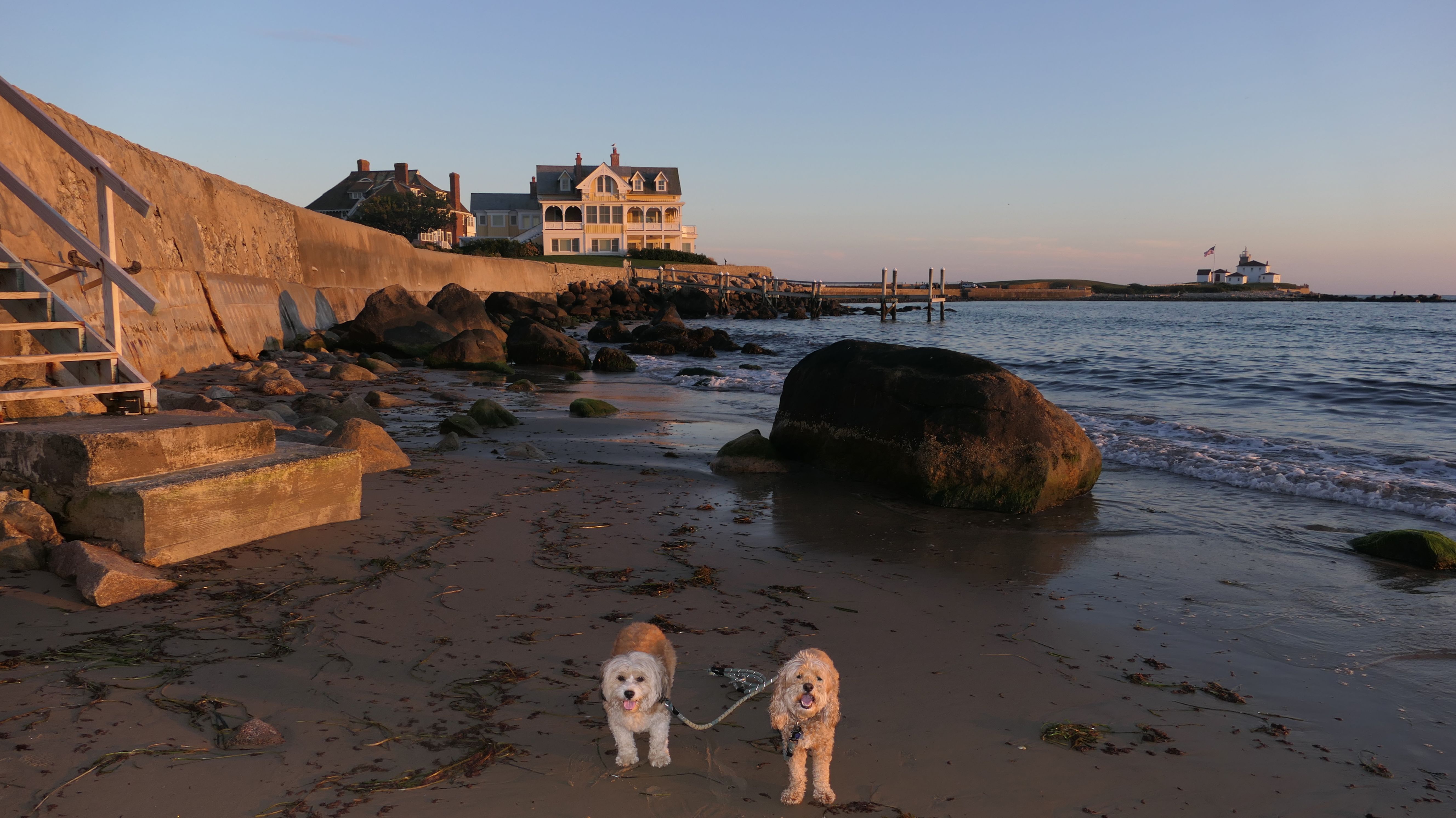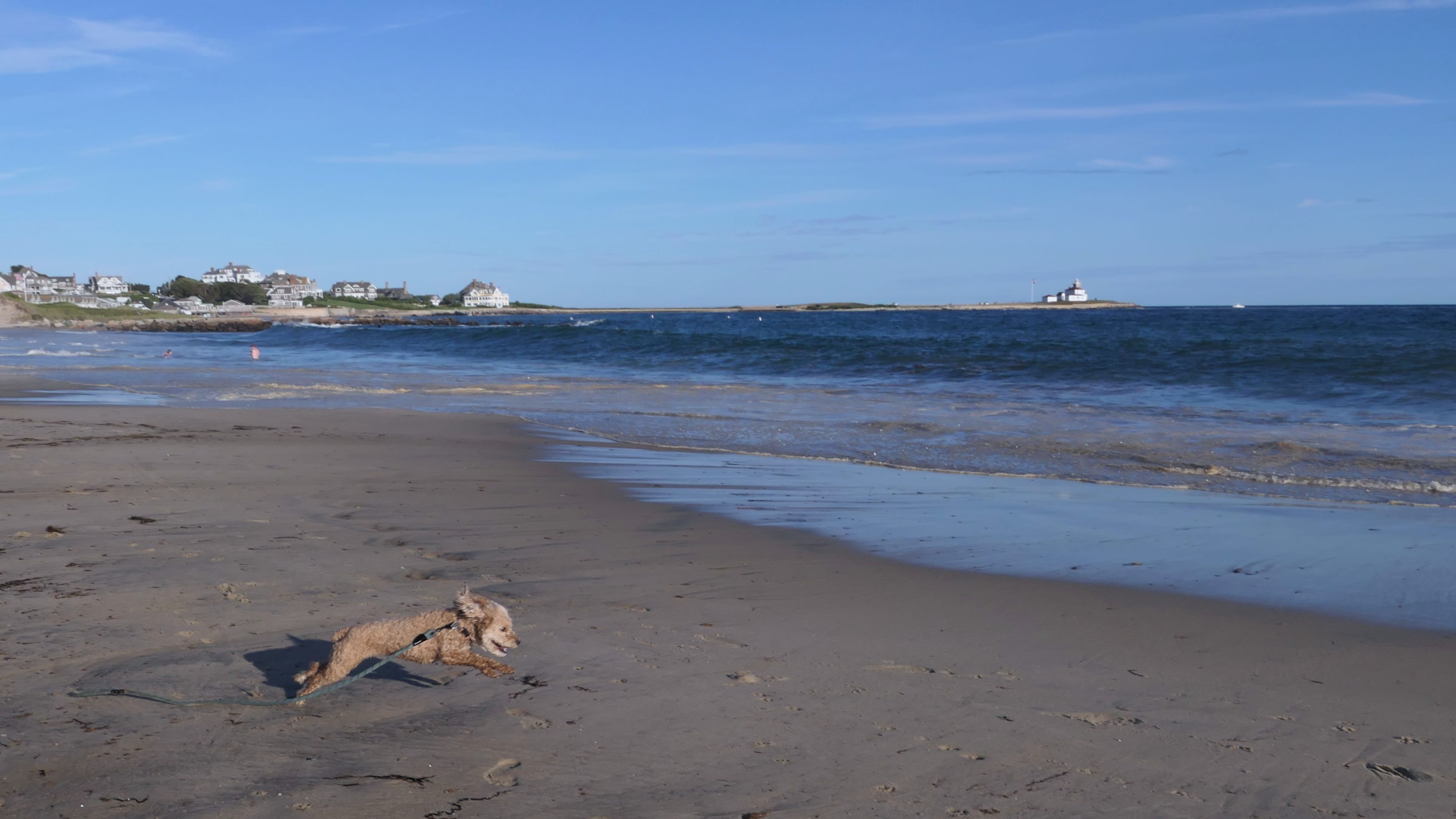 We were in the area after our trip to Rotary Park, so we had to stop at a beach! We've been to this one many times before. It's one of my favorites. Dogs are allowed on Westerly town beaches after 6PM on the summer. This time, there was actually a sandy area in front of the famous person's house. Usually, the water goes right up to the rocks. This is the first time I ever saw that much of a beach present! We were able to walk all the way past the house on the beach, and take some photos of the lighthouse from a new angle. We also did our standard beach walk, with Mandy enjoying walking through the edge of the waves.
