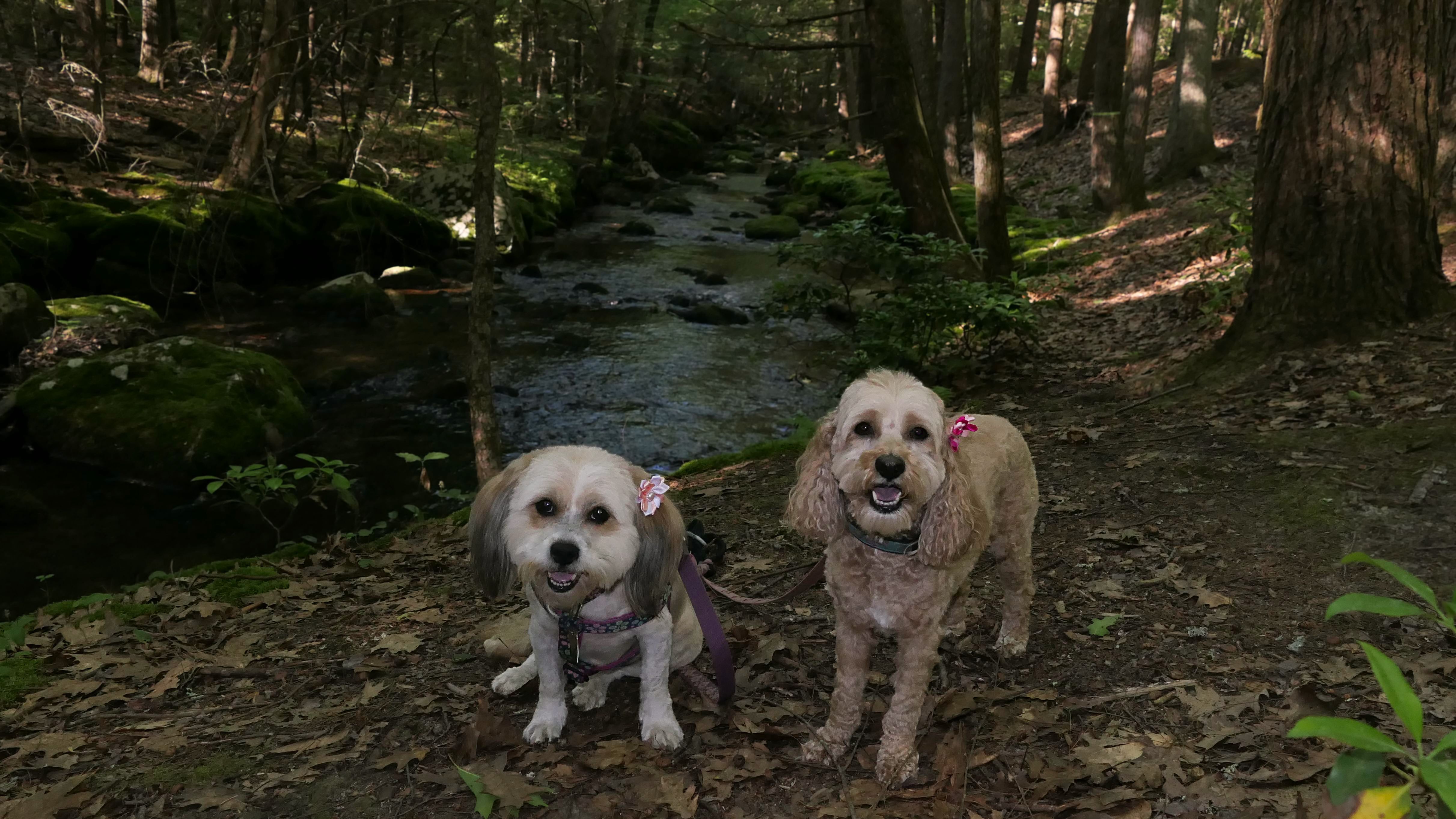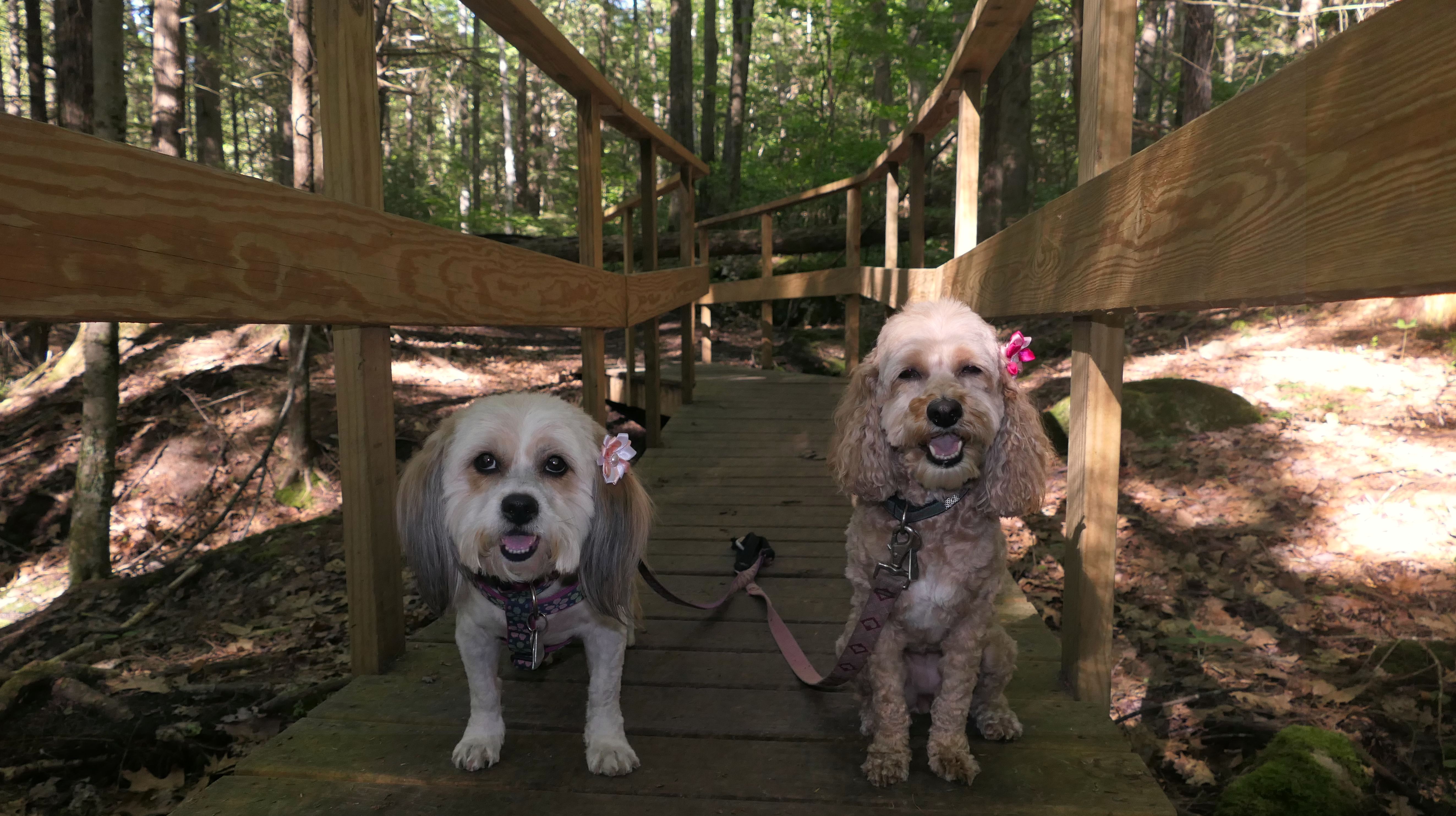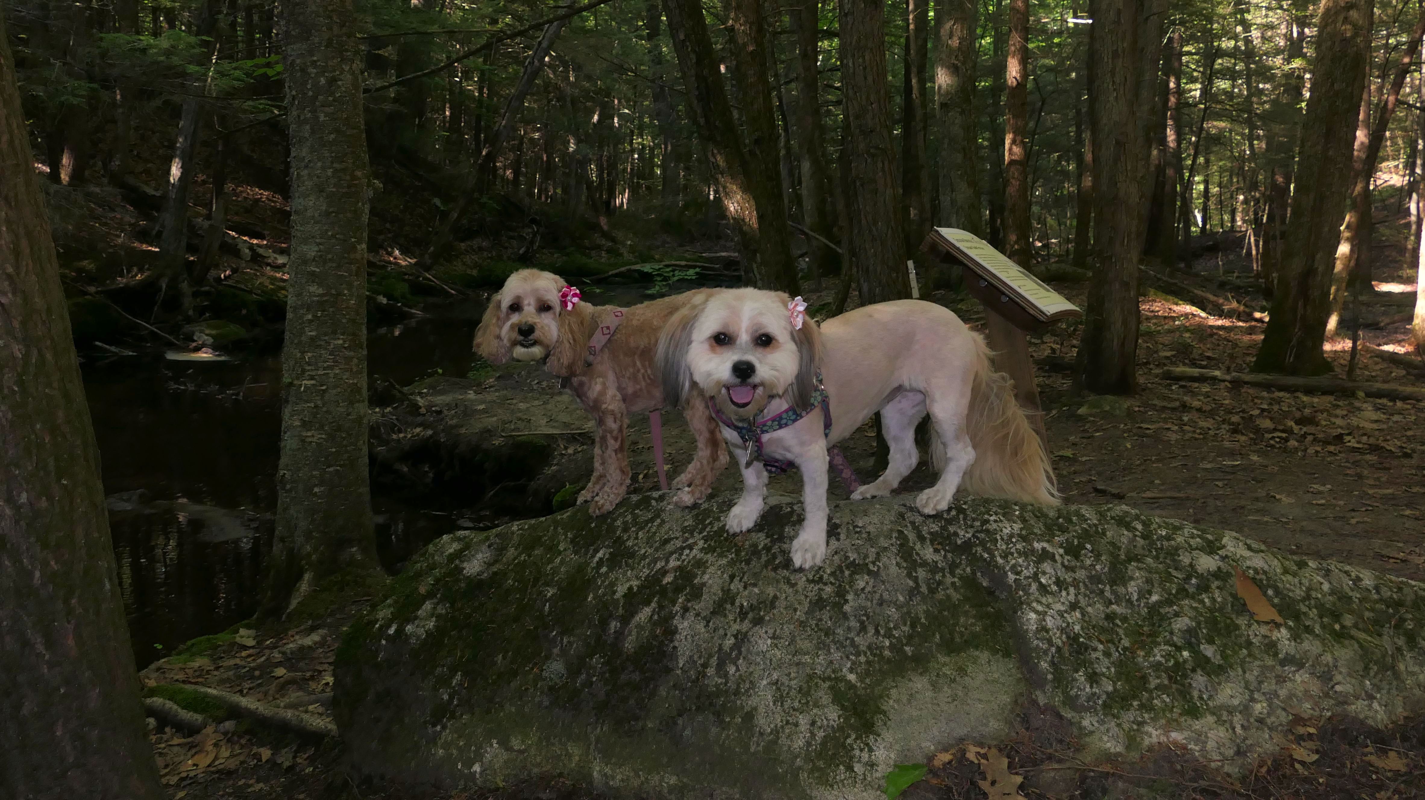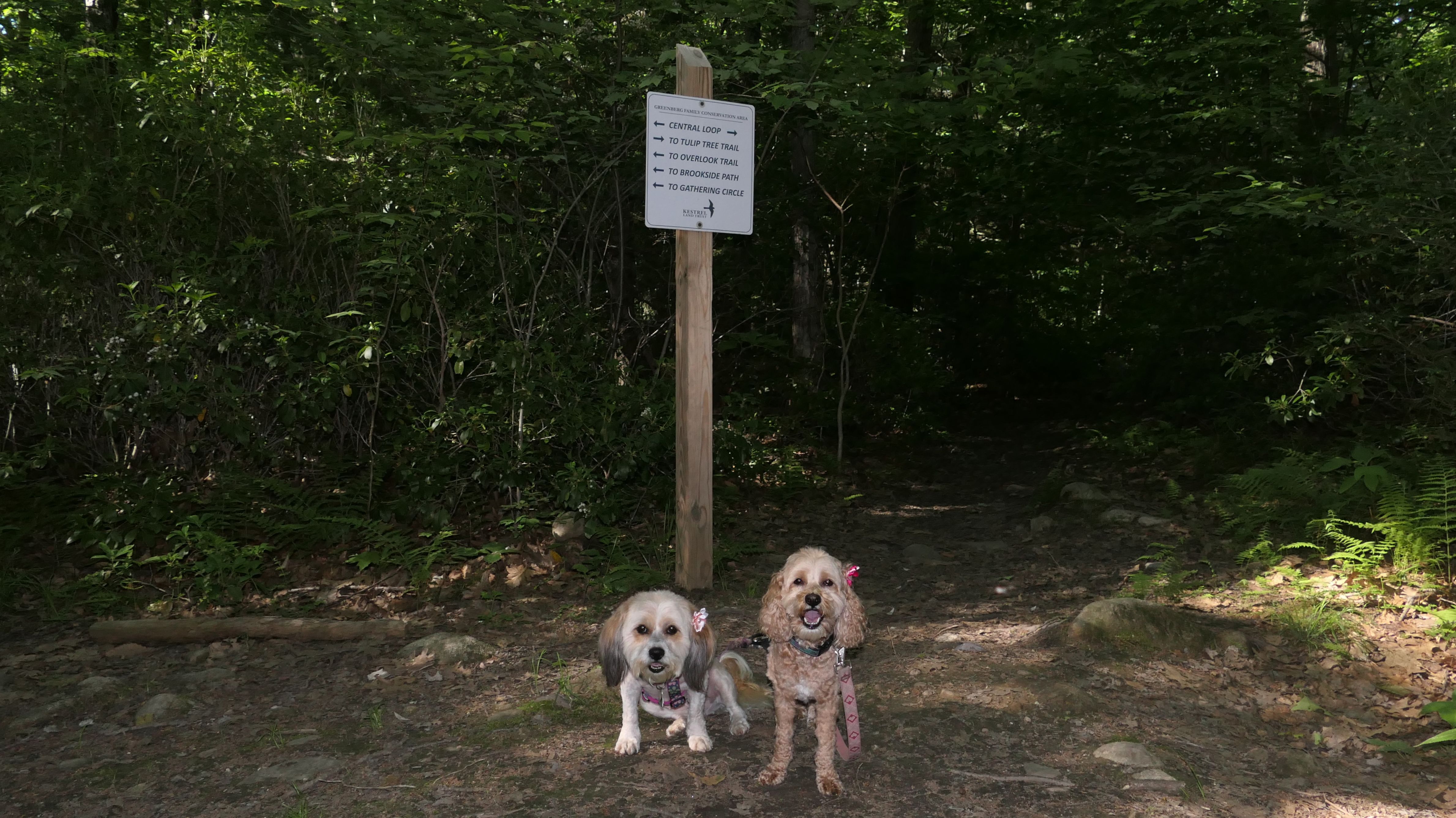 We've been to Northampton, Southampton, and Easthampton, and now we made it to Westhampton! This is a really nice spot. We hiked a 1.8 mile loop that included portions of the yellow blazed Central Loop, the red blazed Overlook Trail, the white blazed Brookside Path, and the blue blazed Tulip Tree Trail. The trail is well marked, and very well maintained. It's a popular spot for dog walking. There are multiple signs reminding you to keep the dogs on a leash. The Kestrel Land Trust website even has a PDF download entitled "Good Dog Guide for Pets & Their People". Speaking of dogs, Mandy and Lexi were freshly groomed, so luckily the trail wasn't muddy at all. This was a very pleasant late afternoon hike.