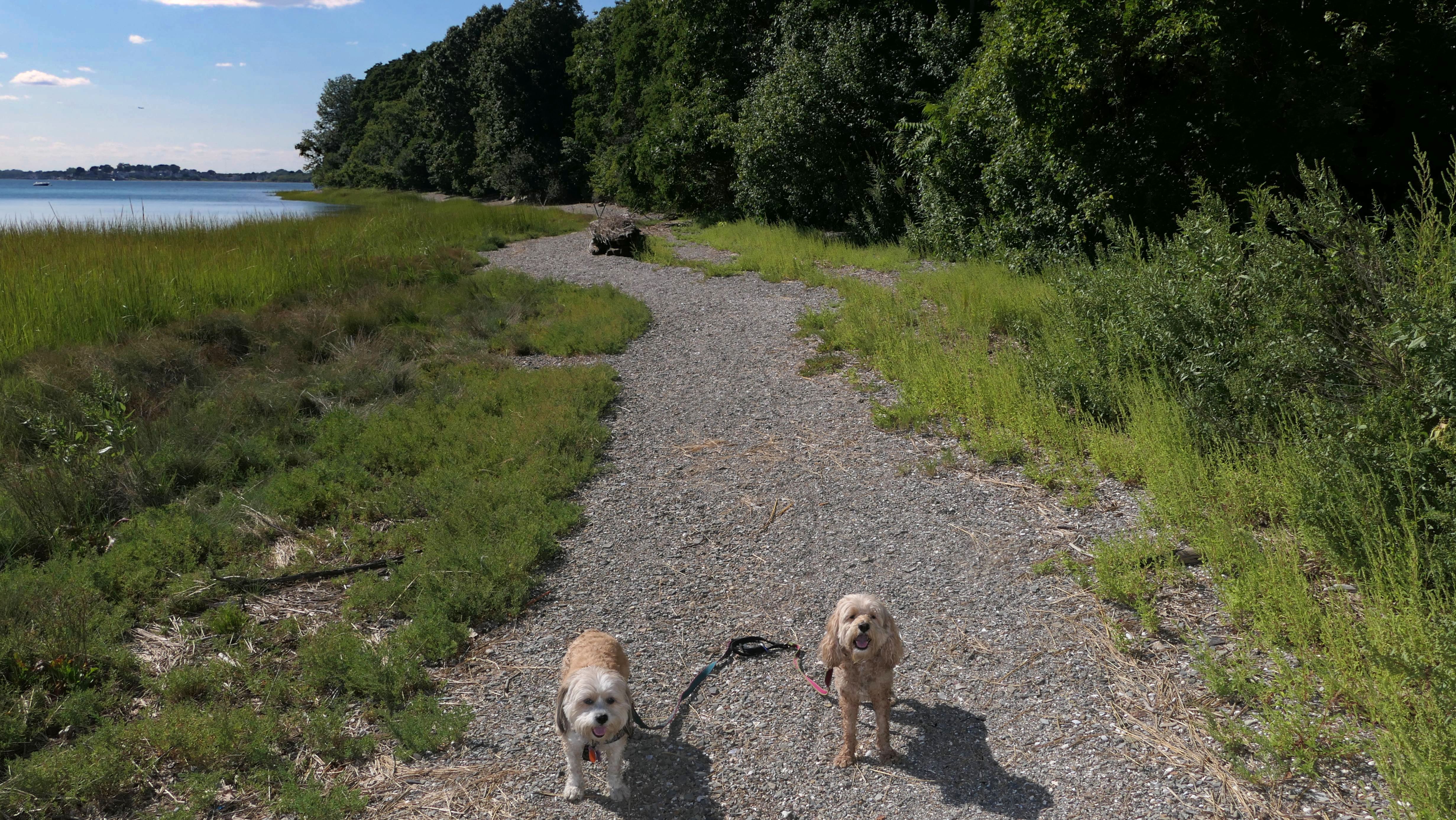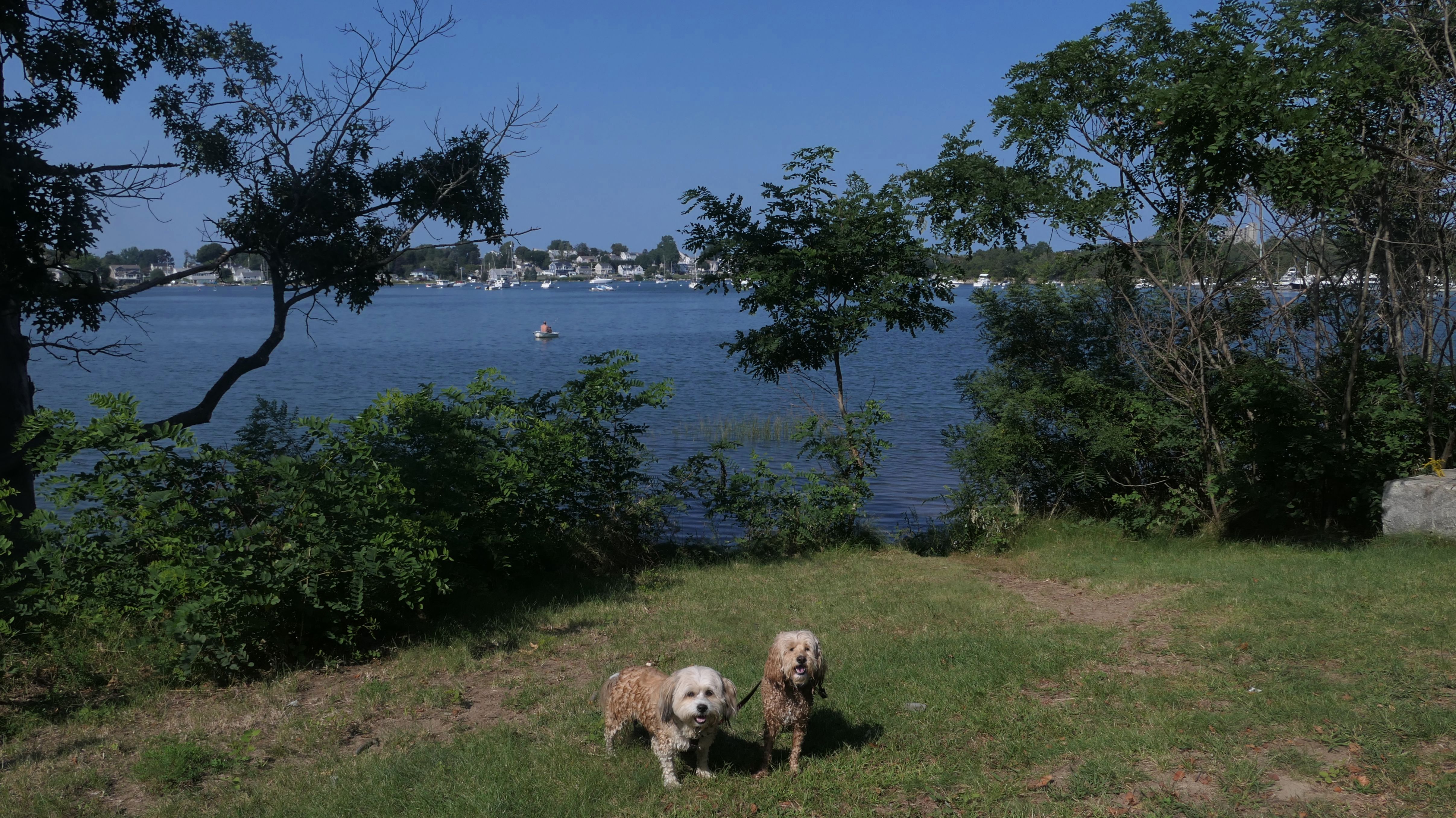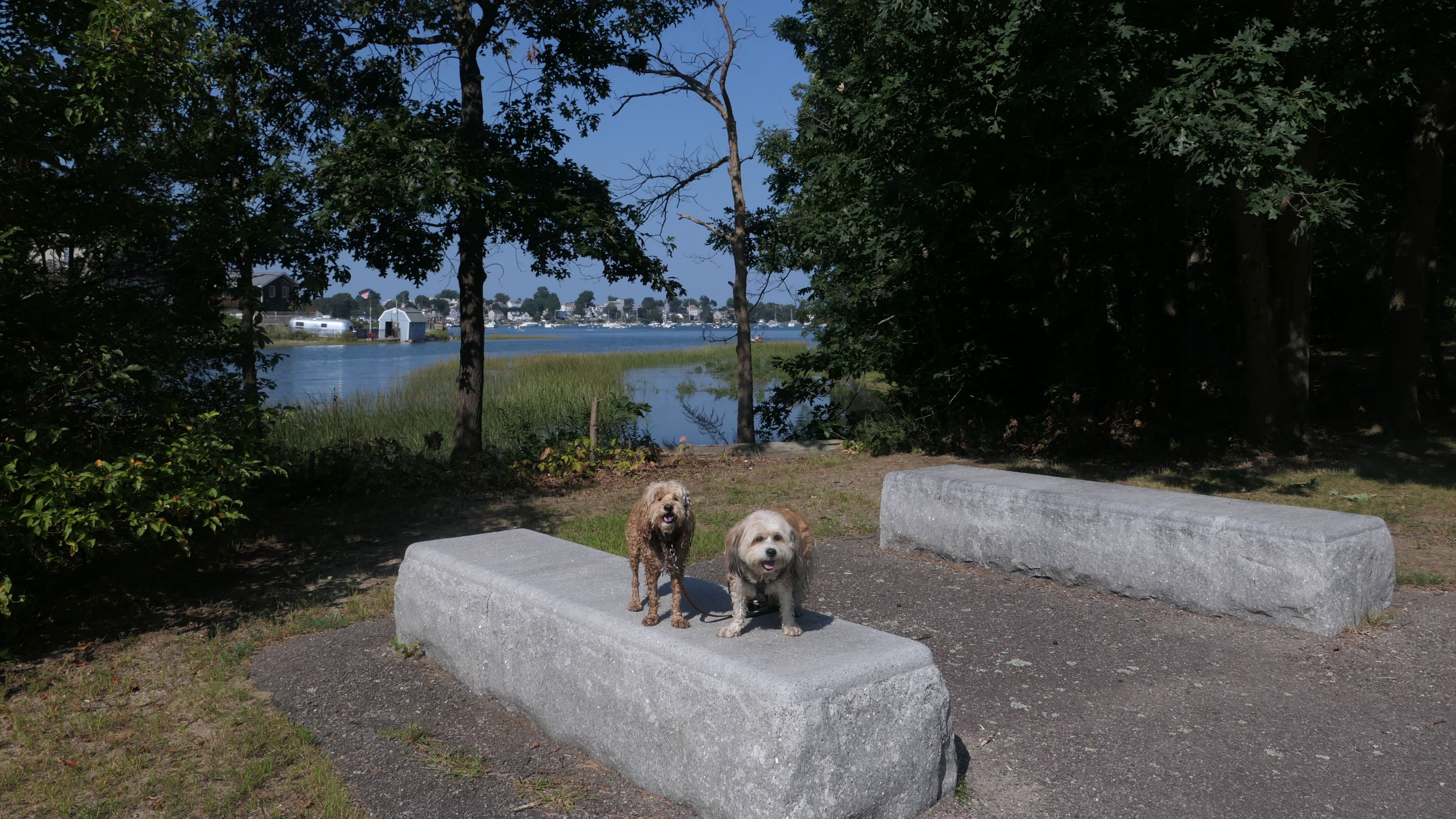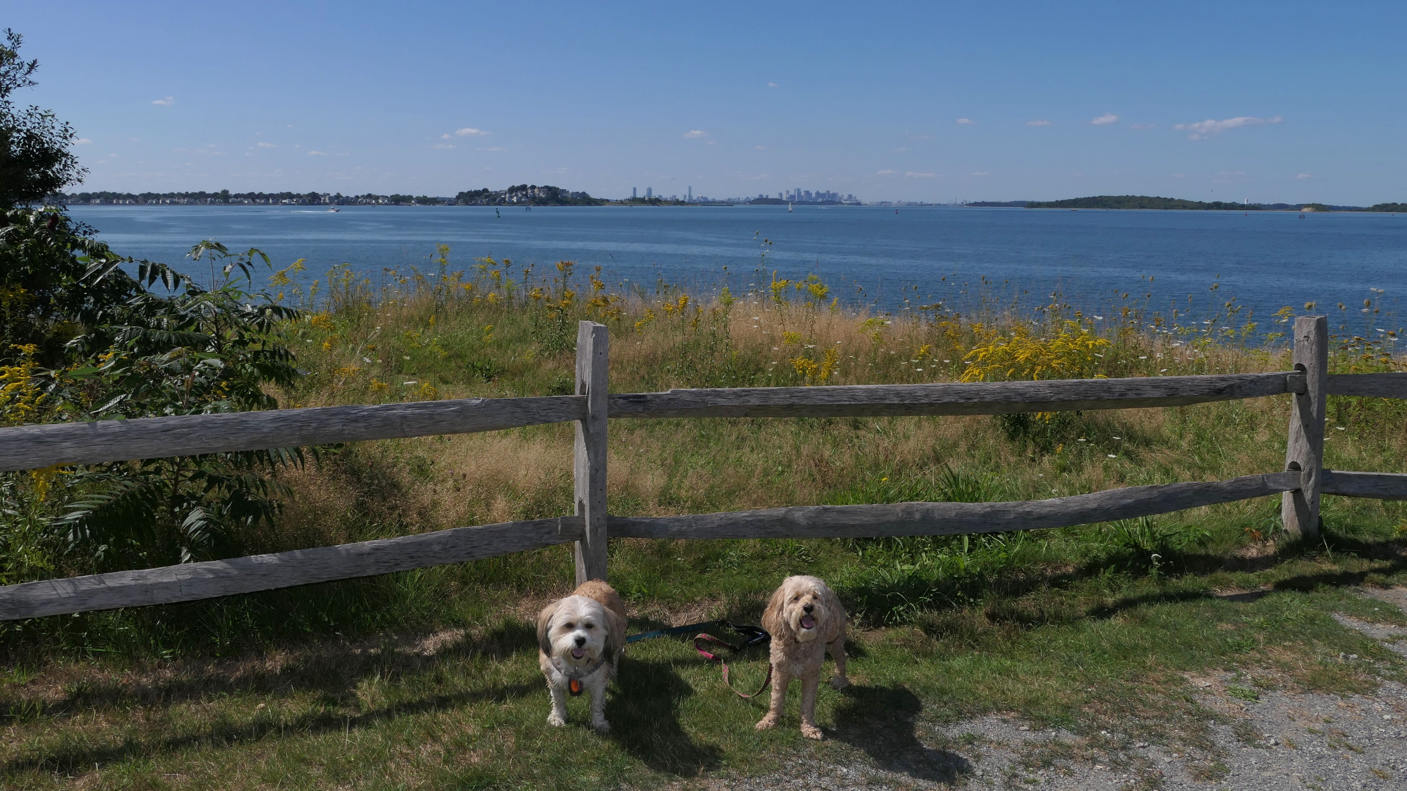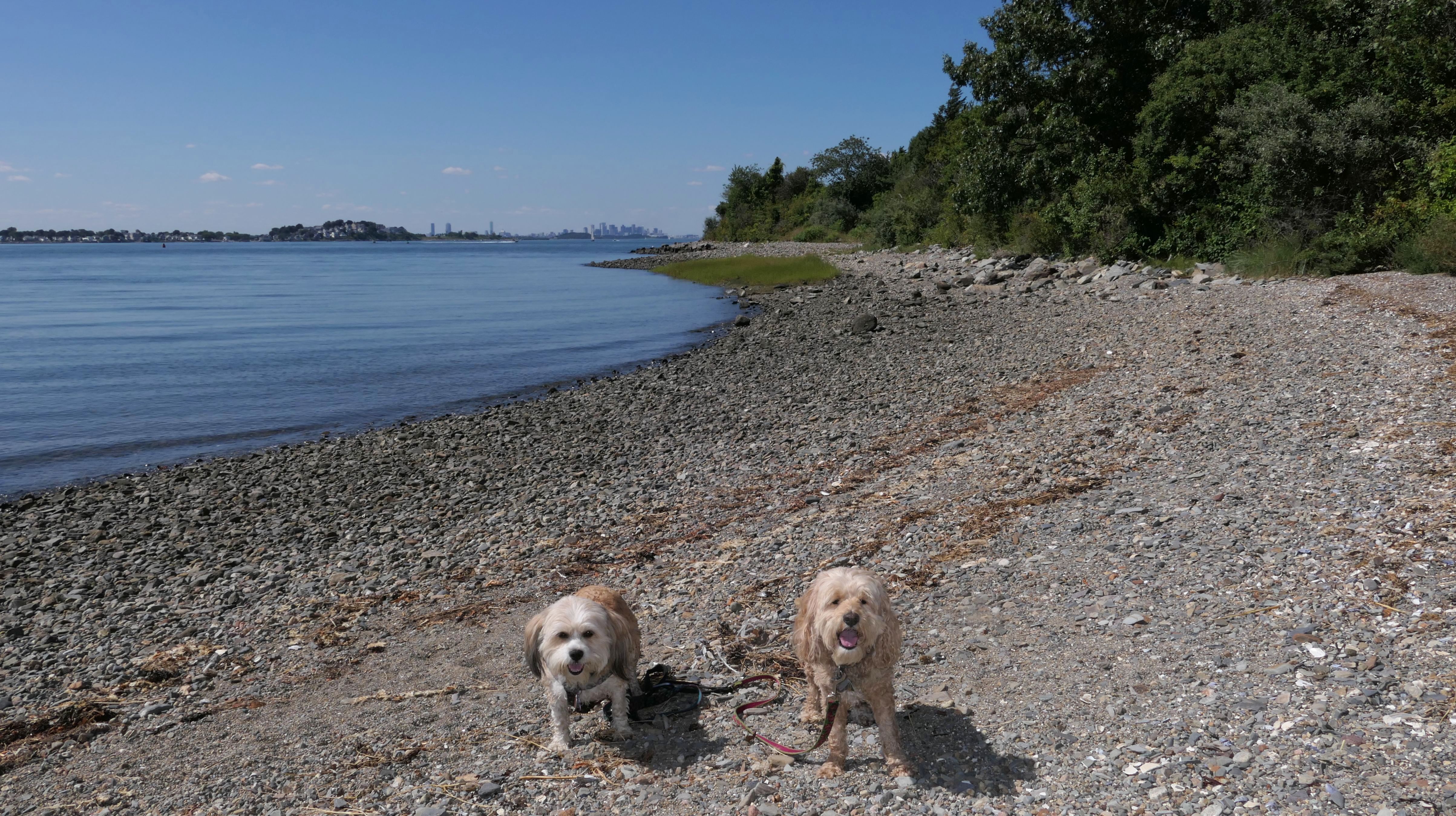 This is one of the best places we've visited in Massachusetts. The state park is on a peninsula that extends into Hingham Bay, and is located on a former Nike missle site. There's an easy stone dust loop trail that runs for about two miles, as well as a mowed meadow area, and rocky beaches along the perimiter of the peninsula. In addition to the trail, we explored the entire rocky beach. One side of the peninsula offers views of the Boston skyline. There are also views of many boats, yachts, and ships that use the bay. There are plenty places for the dogs to cool off in the water. There's a picnic area, as well as other picnic tables throughout the park. It's a great place to bring dogs for a walk. The weather was perfect, so this was a really fun trip!