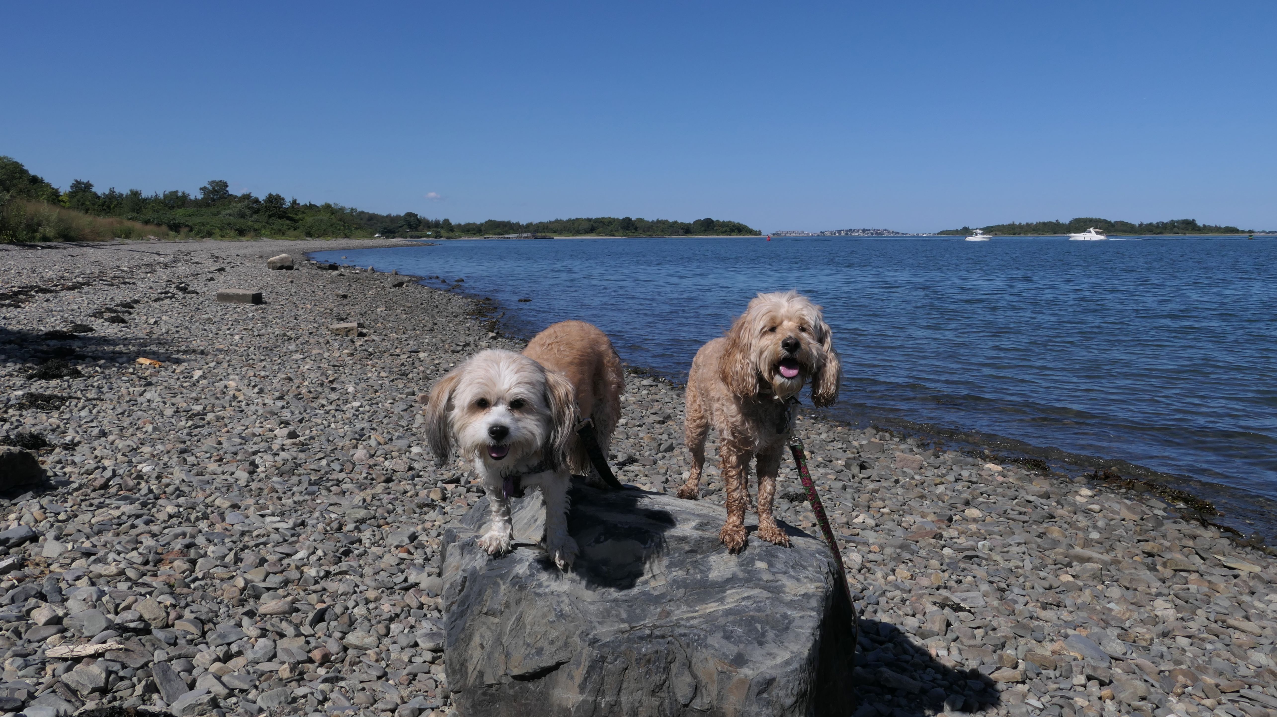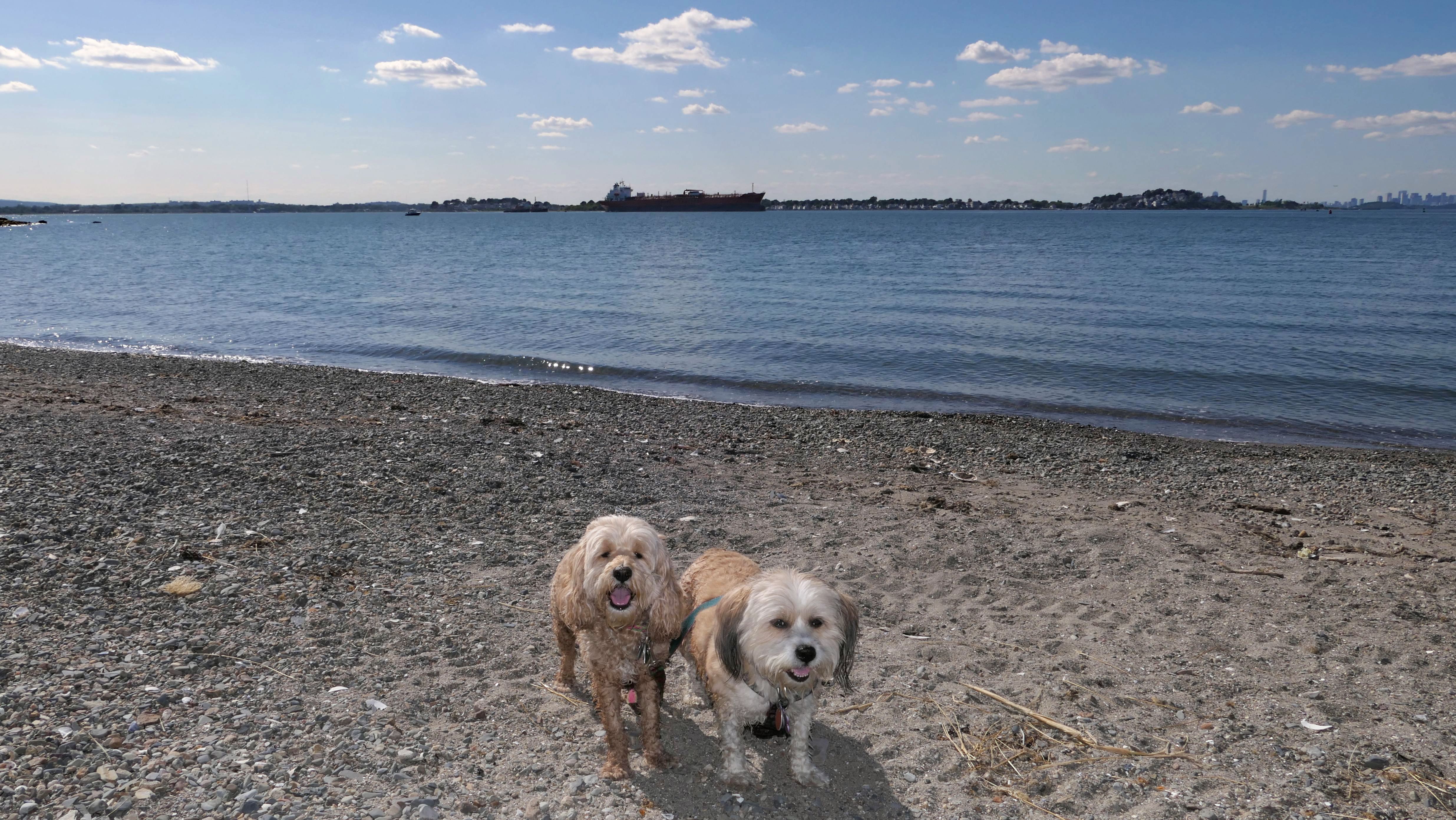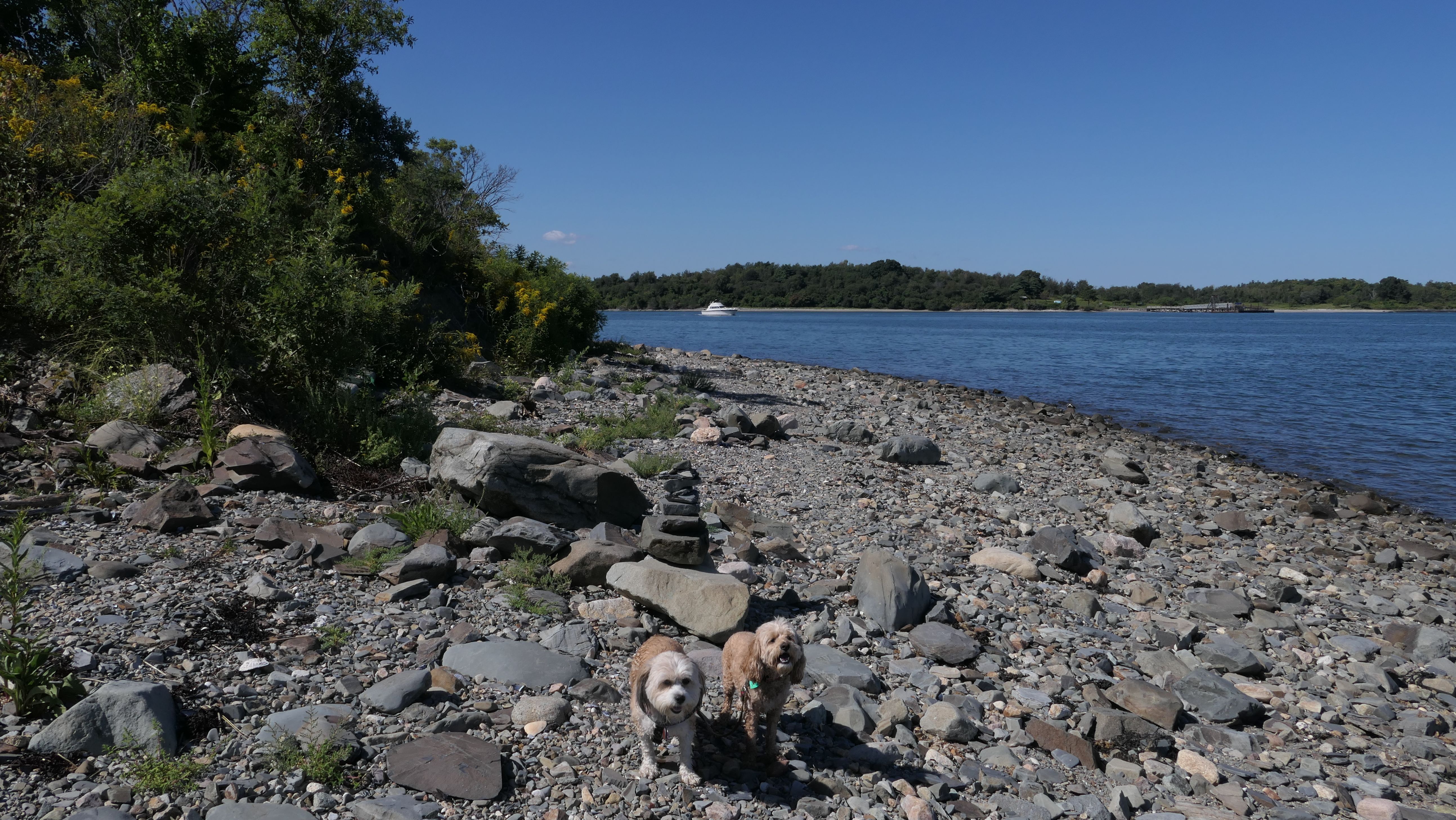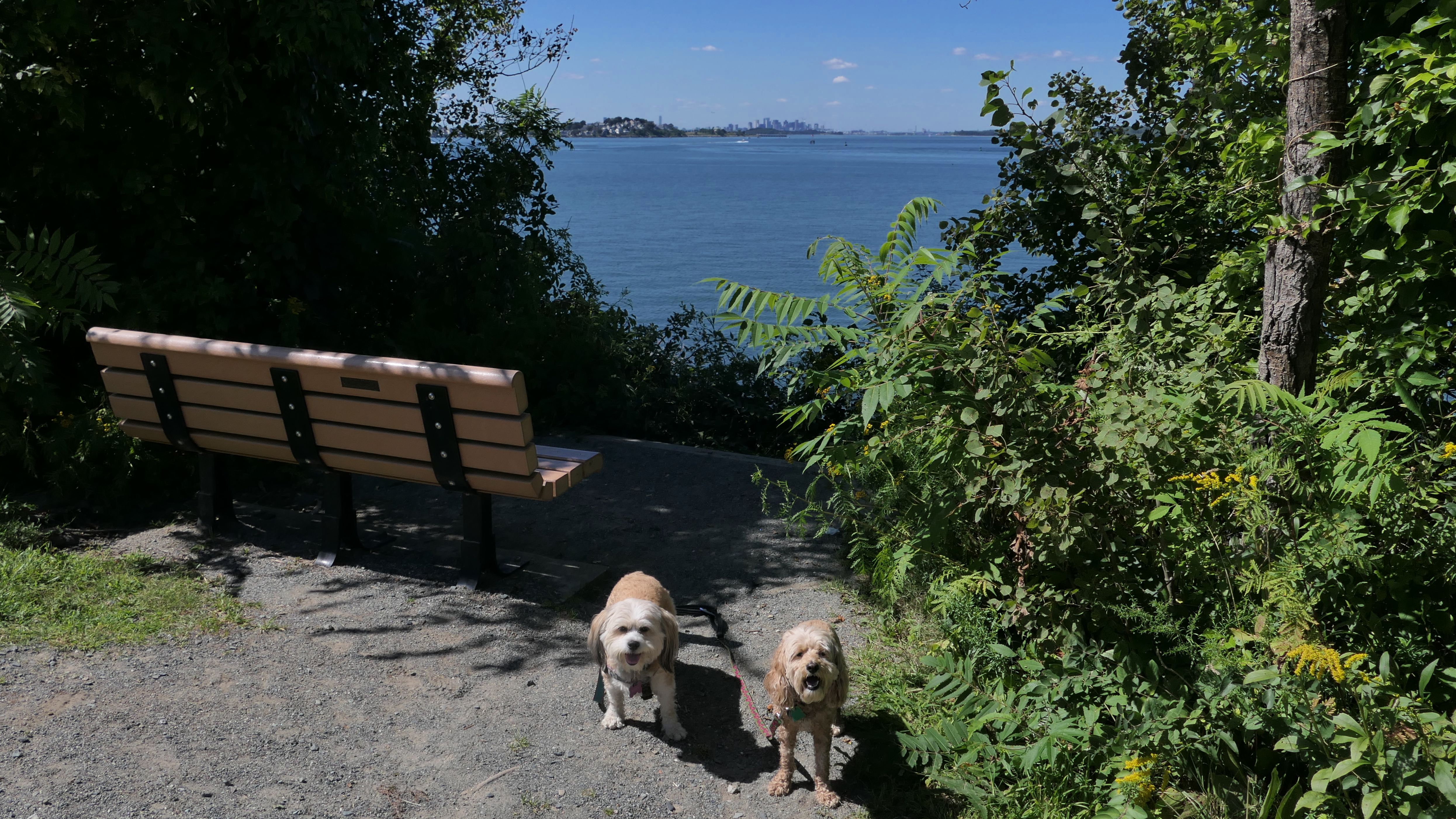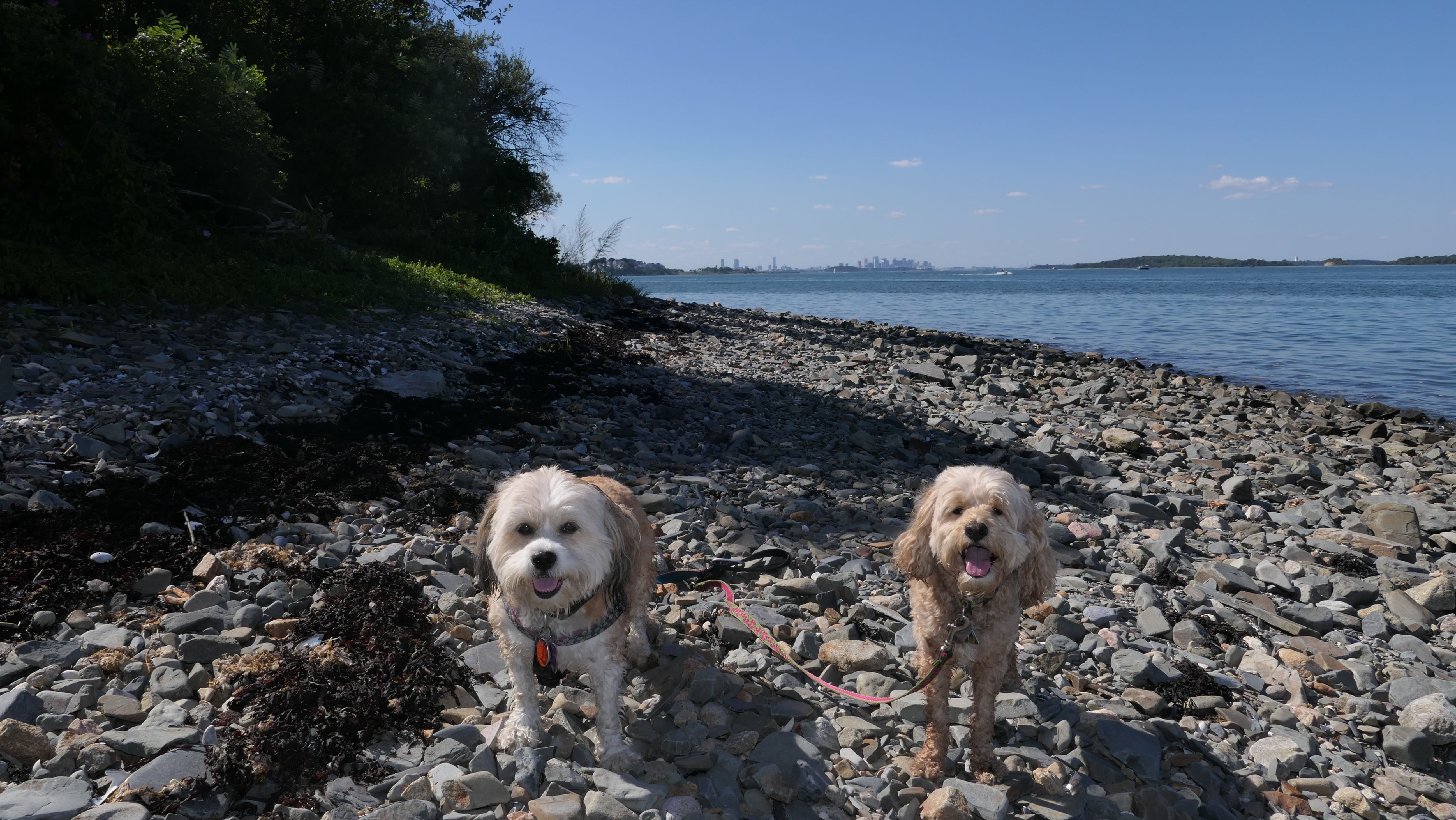 This is one of the best places we've visited in Massachusetts. The state park is on a peninsula that extends into Hingham Bay, and is located on a former Nike missle site. There's an easy stone dust loop trail that runs for about two miles, as well as a mowed meadow area, and rocky beaches along the perimiter of the peninsula. In addition to the trail, we explored the entire rocky beach. One side of the peninsula offers views of the Boston skyline. There are also views of many boats, yachts, and ships that use the bay. There are plenty places for the dogs to cool off in the water. There's a picnic area, as well as other picnic tables throughout the park. It's a great place to bring dogs for a walk. The weather was perfect, so this was a really fun trip!