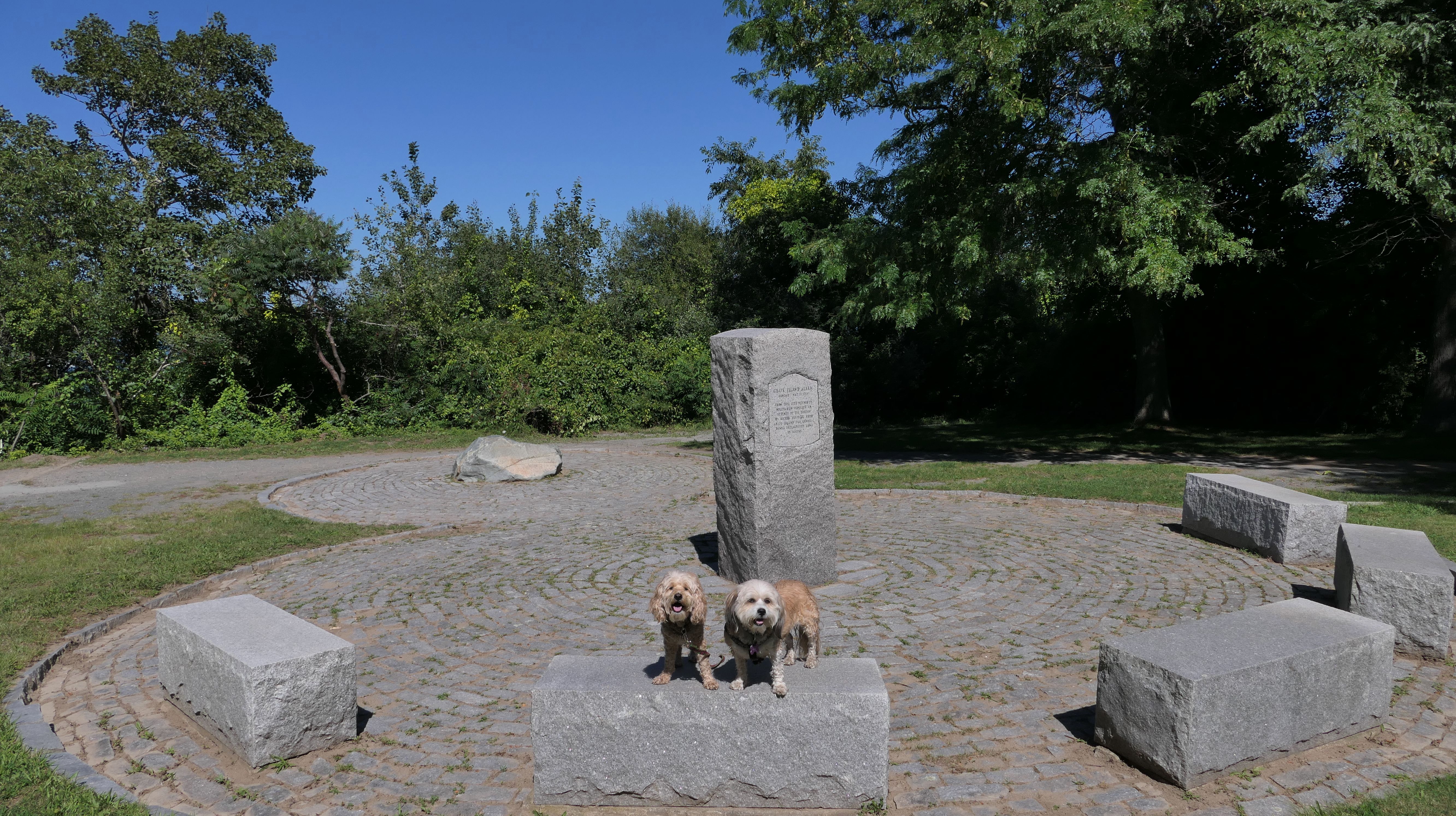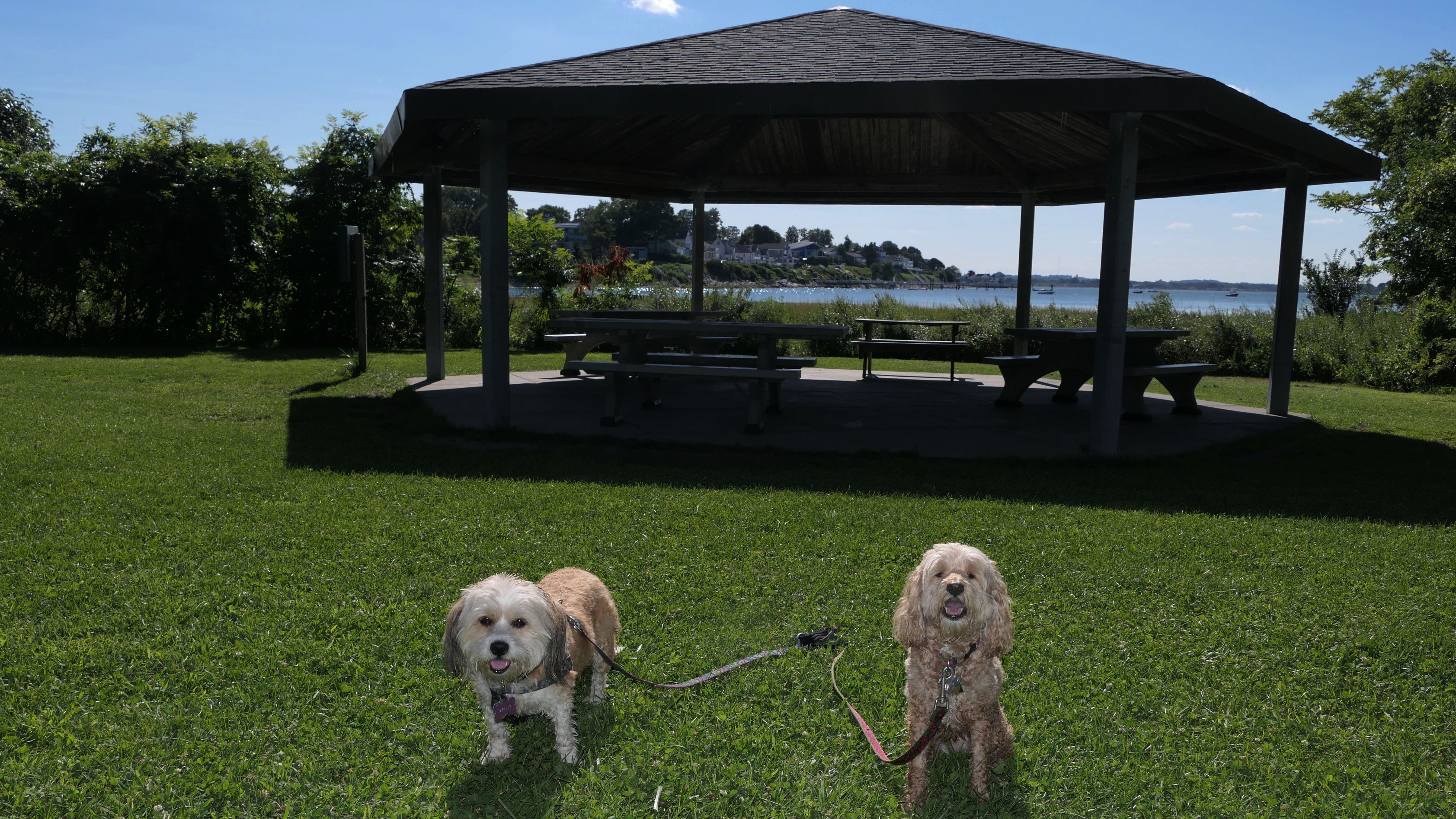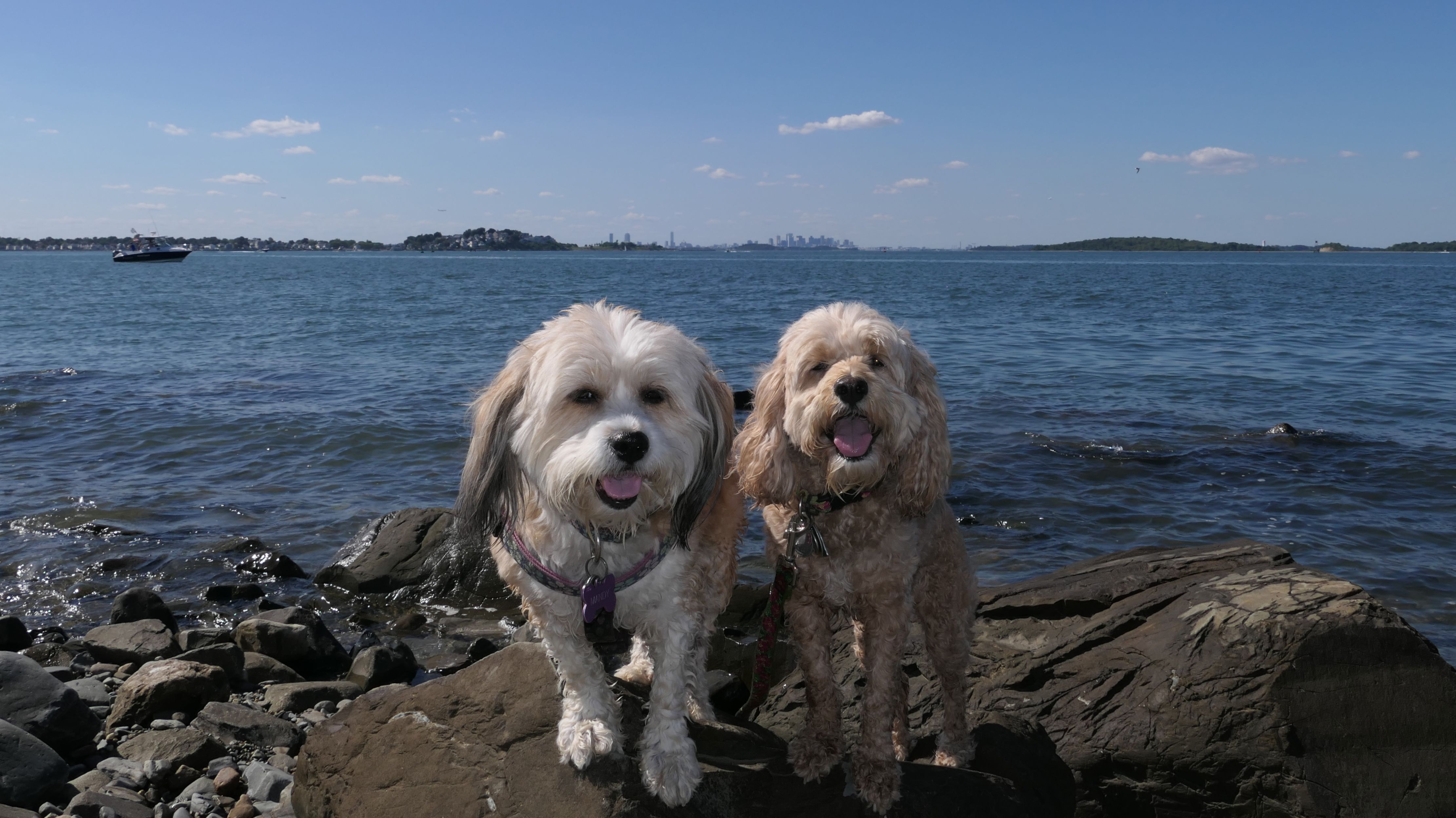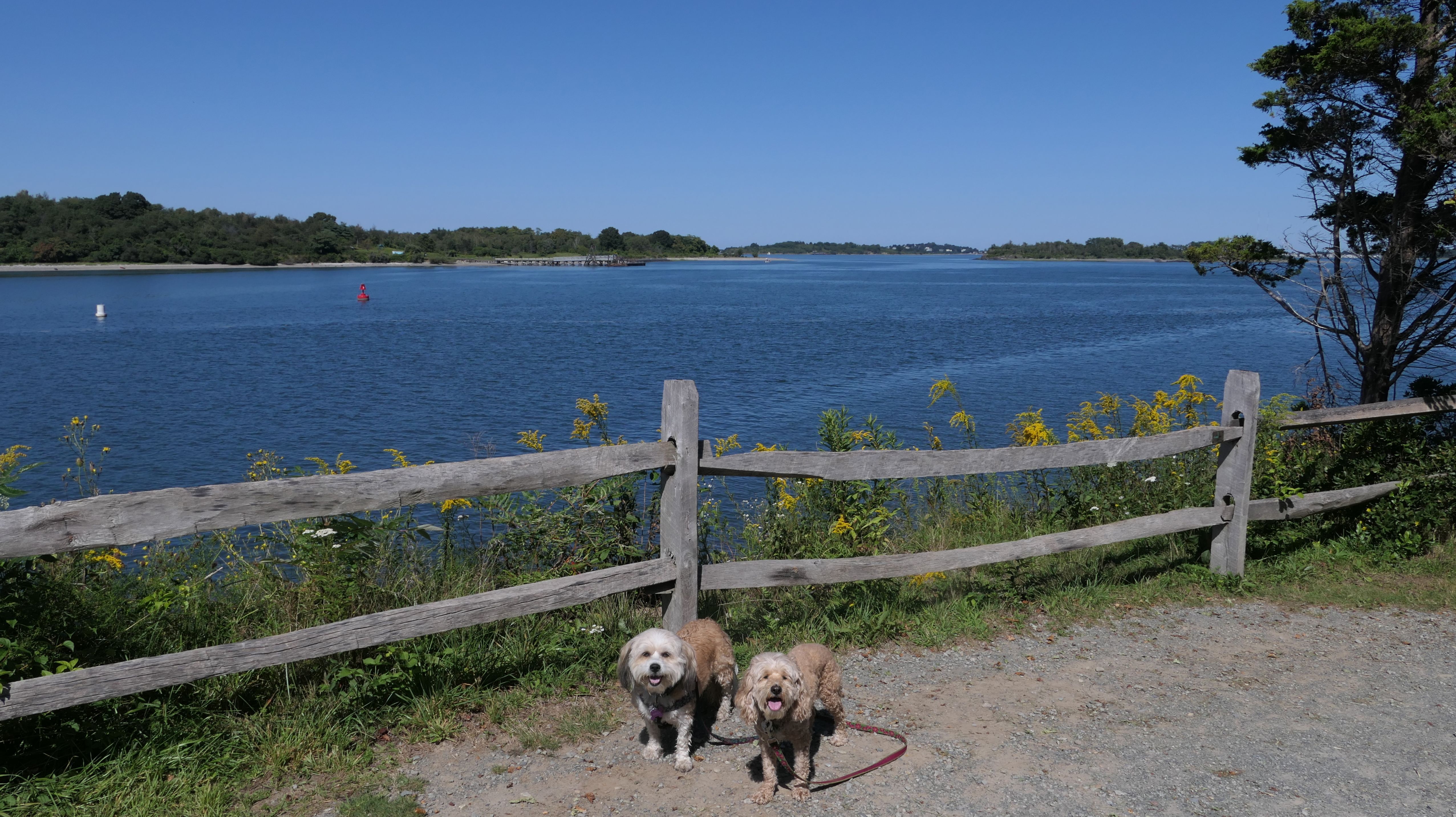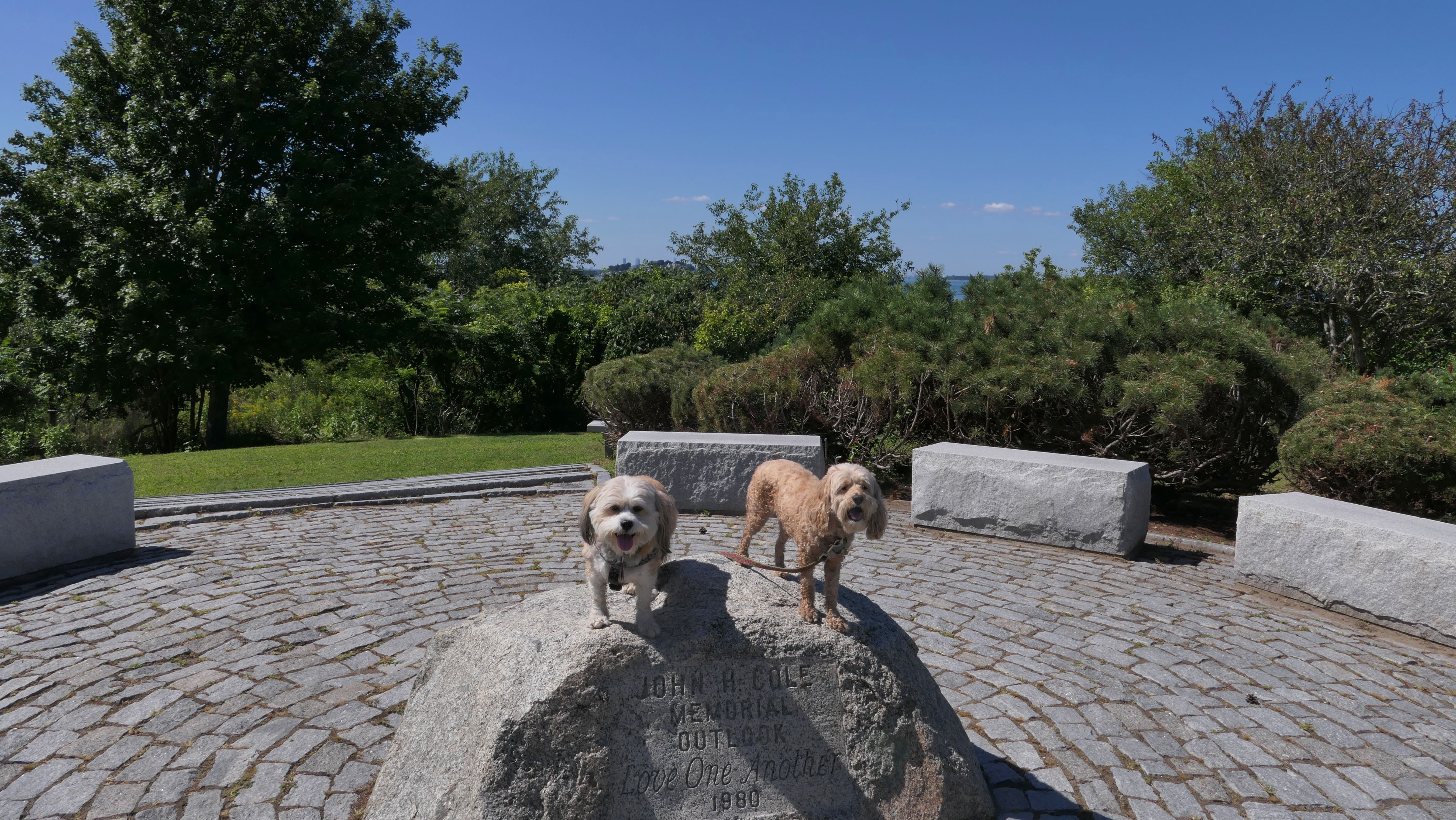 This is one of the best places we've visited in Massachusetts. The state park is on a peninsula that extends into Hingham Bay, and is located on a former Nike missle site. There's an easy stone dust loop trail that runs for about two miles, as well as a mowed meadow area, and rocky beaches along the perimiter of the peninsula. In addition to the trail, we explored the entire rocky beach. One side of the peninsula offers views of the Boston skyline. There are also views of many boats, yachts, and ships that use the bay. There are plenty places for the dogs to cool off in the water. There's a picnic area, as well as other picnic tables throughout the park. It's a great place to bring dogs for a walk. The weather was perfect, so this was a really fun trip!