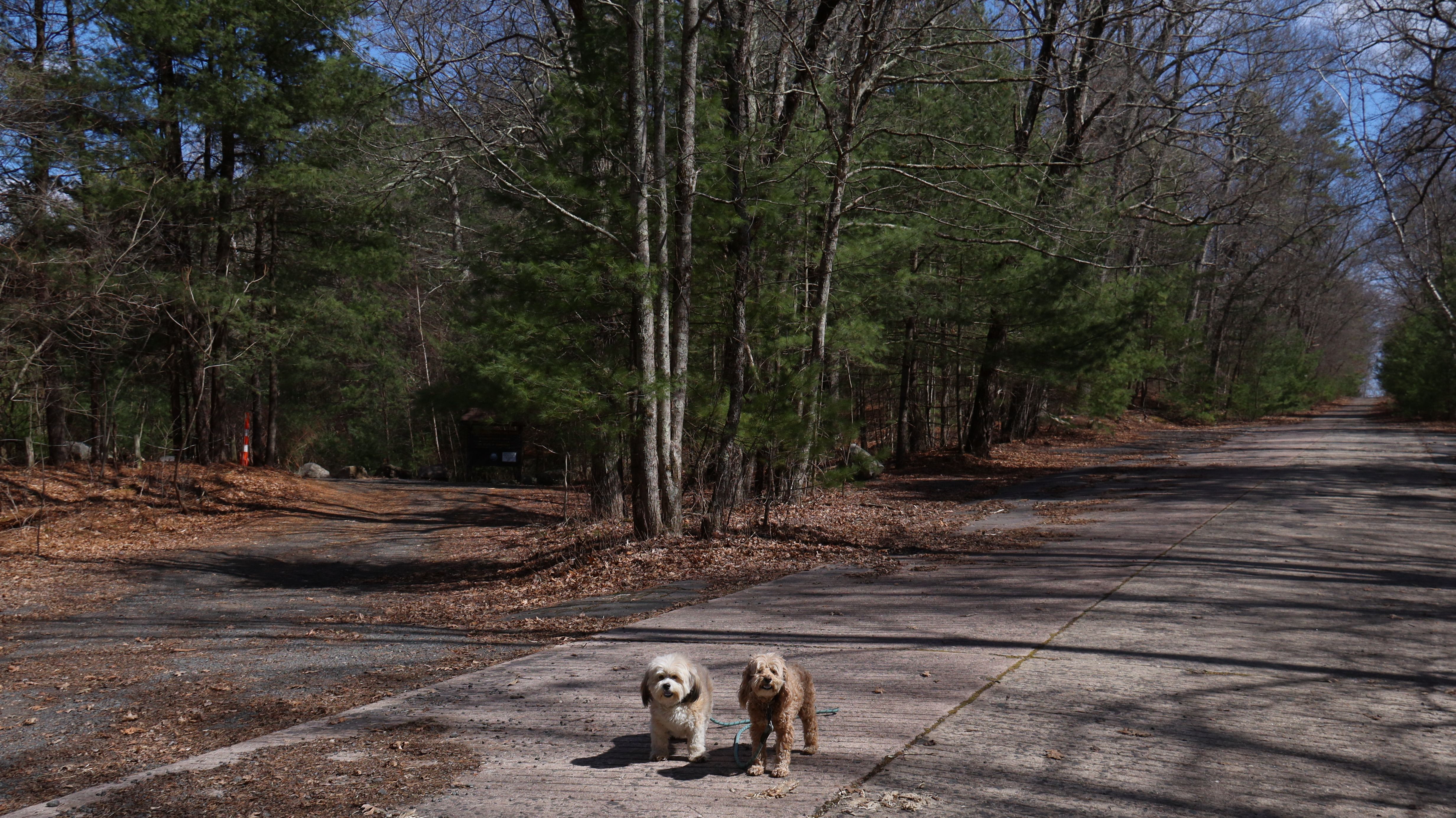 We hiked what is Google Maps calls "North Mesh Trail", that runs through the northern part of the forest. We went out about one and half miles before turning around. The trail is pretty well maintained, and there are a number of side trails that you can take to make it longer if you want. Portions of the trail run along the old New London Turnpike, and alternate between a gravel and cement surface, before turing into a dirt trail. A couple things to be aware of...the trail passes a gun range. Luckily nobody was using it when we were there. There was a number of downed trees and some muddy spots, but we were able to navigate around them without too much trouble. There is also a fair amount of highway noise as the trail runs pretty close to Route 2 for a good portion of the hike. One of the connecting trails leads under route two through a tunnel, but it's sort of a stream now so you would need to wade through it to get to the other side, and we didn't want to do that with the dogs.