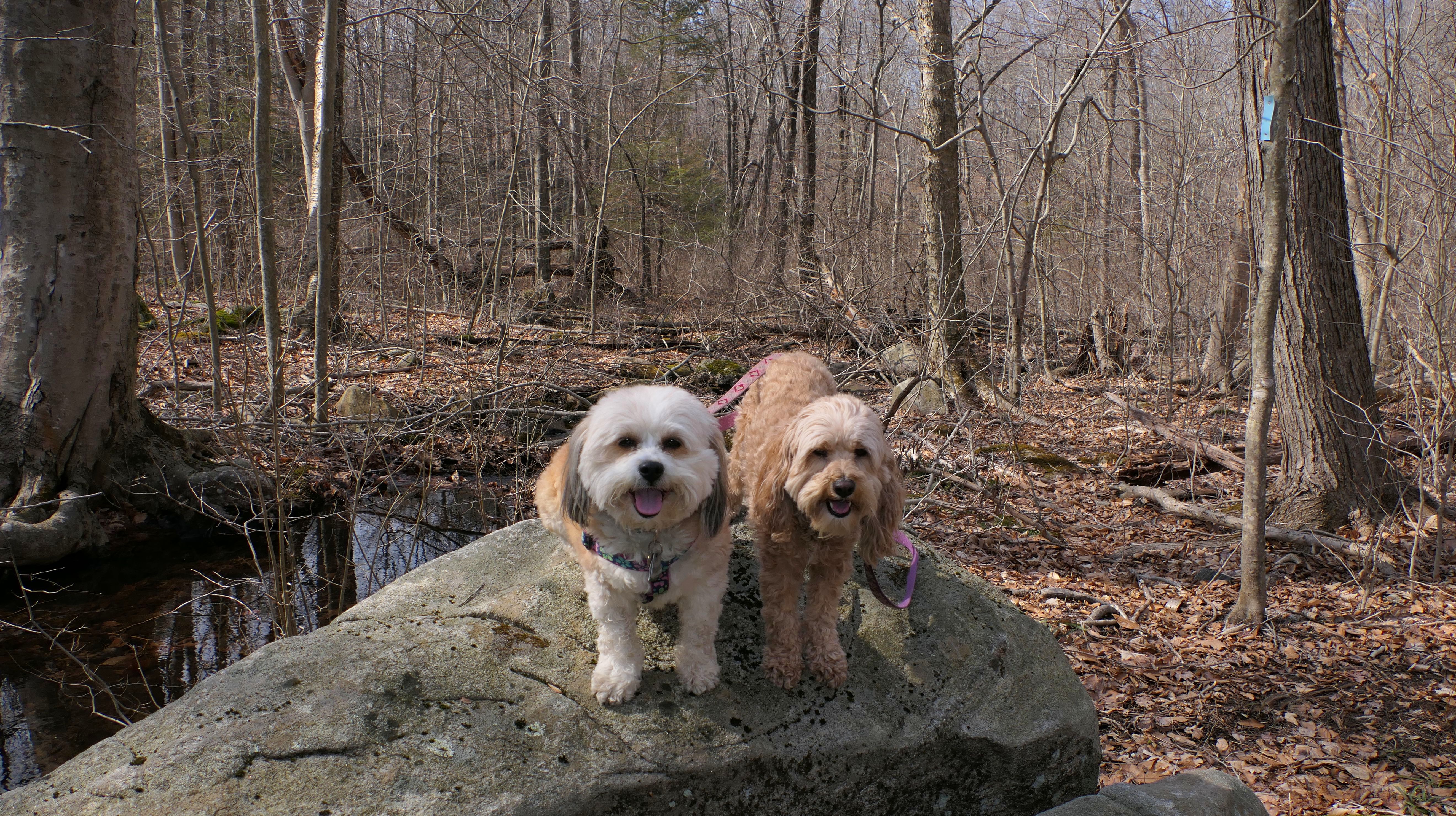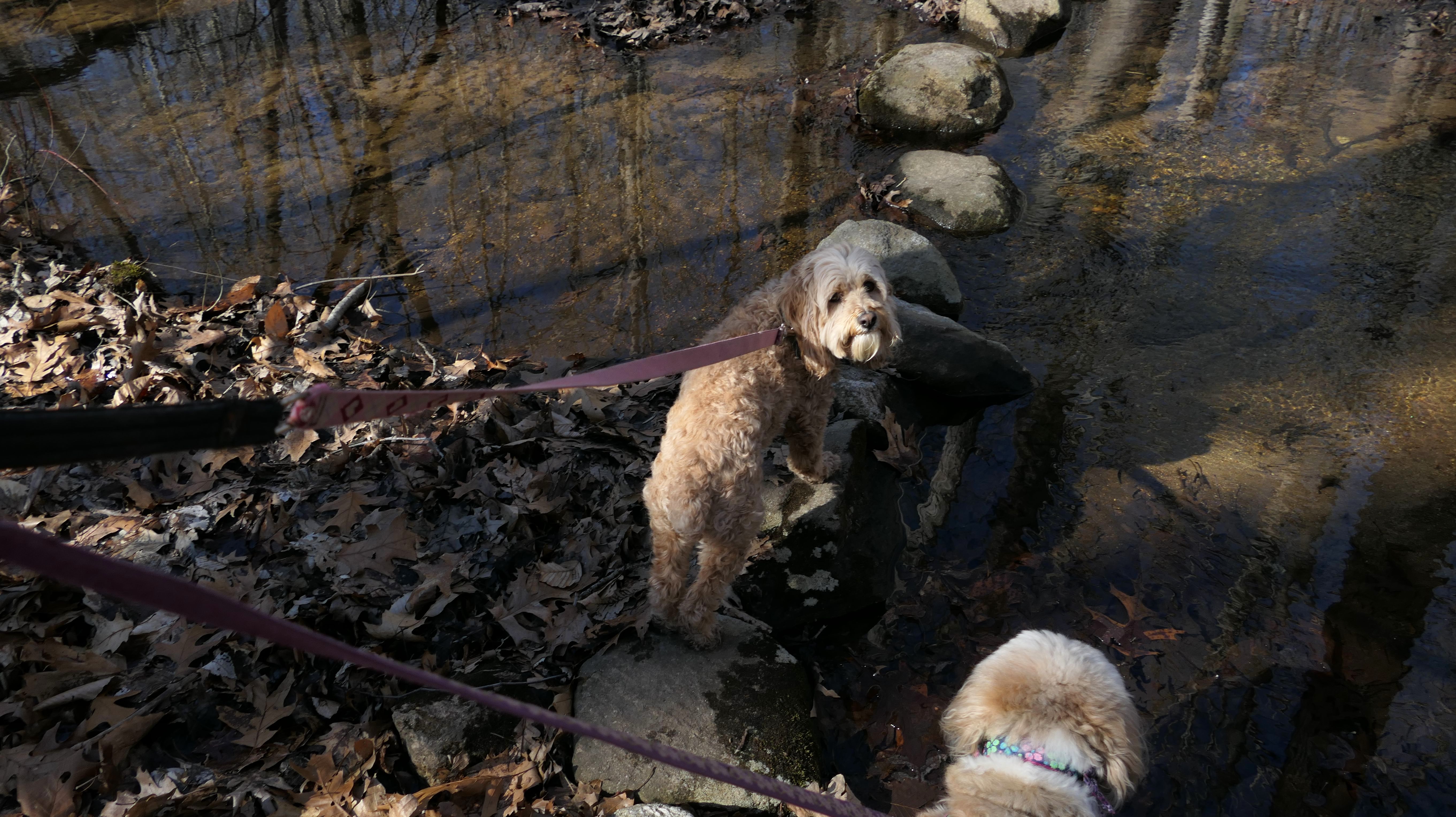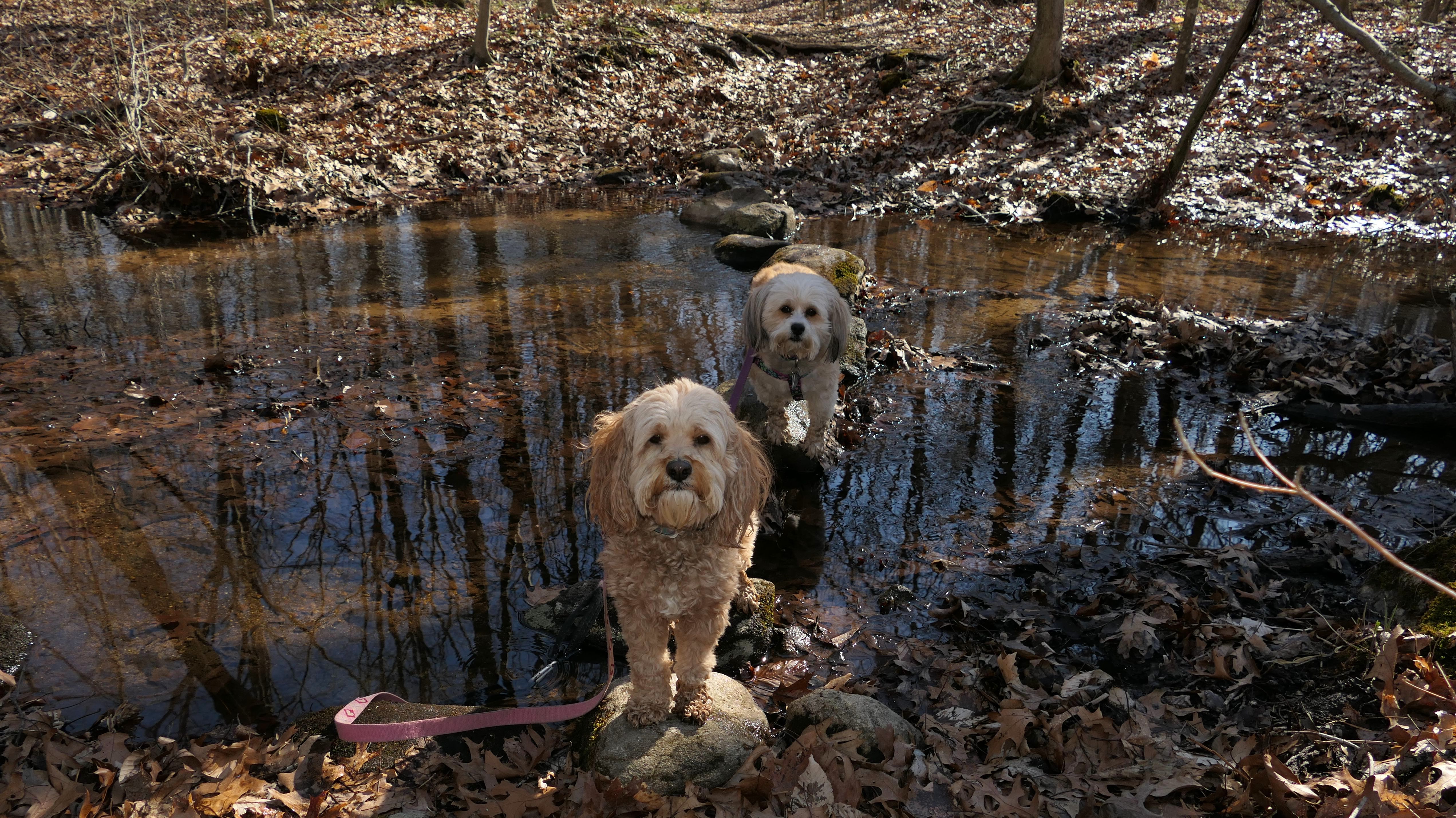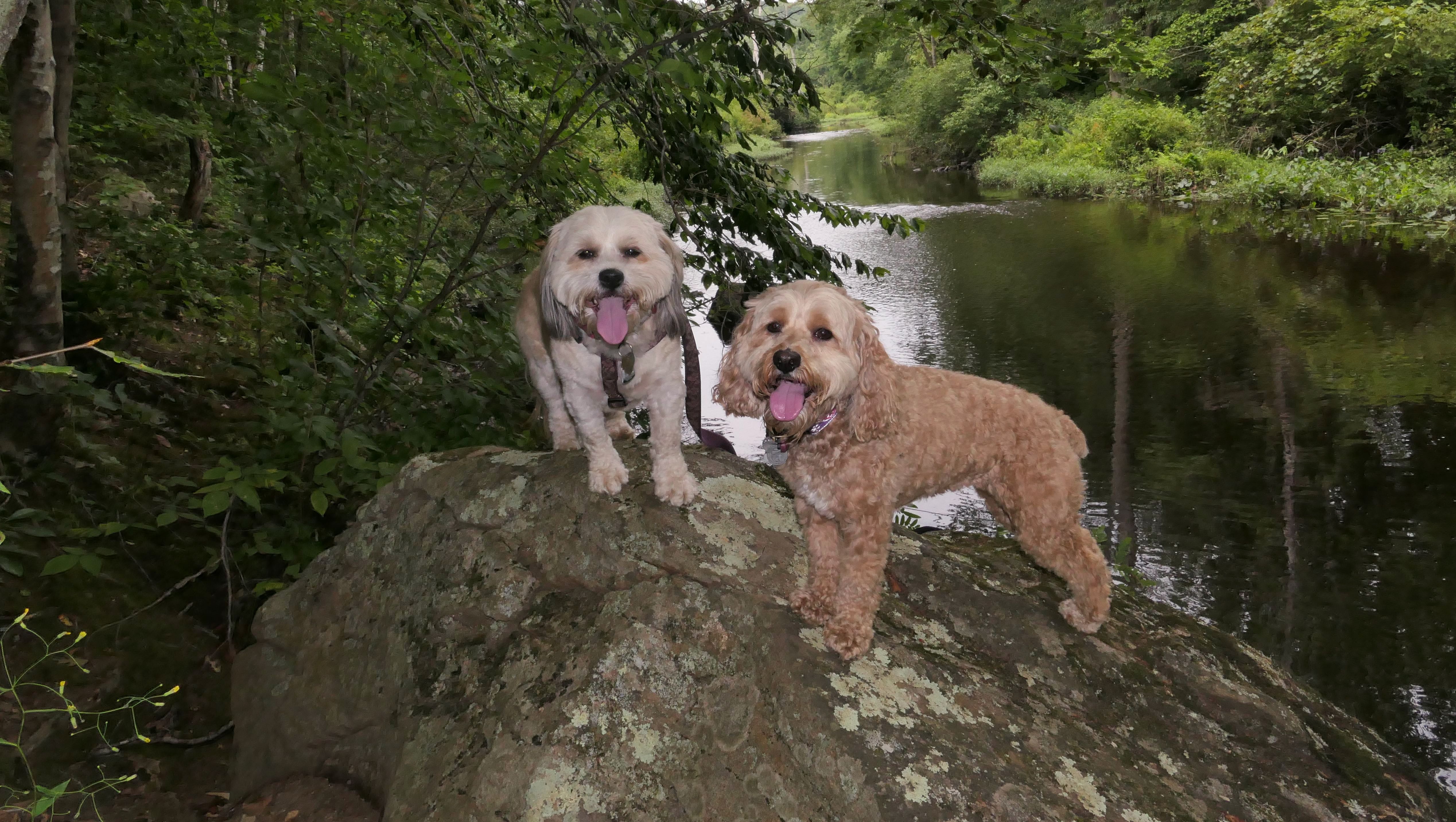 The Paper Mill Trail resides on Madison Land Trust property that once was the site of an old paper mill (hence the name). The ruins of the paper mill are at the beginning of the trail. There are remnants of a stone dam and a concrete dam that "breached." The dams were on the Hammonasset River, which also serves as the border between Madison and Killingworth. It's possible the dogs are in Killingsworth in some of the pictures below, at least the ones where they are in the middle of the river. The trail follows the river for about a mile, and then veers off from the river and loops around very near to some backyards. This part of the trail is rather ordinary.