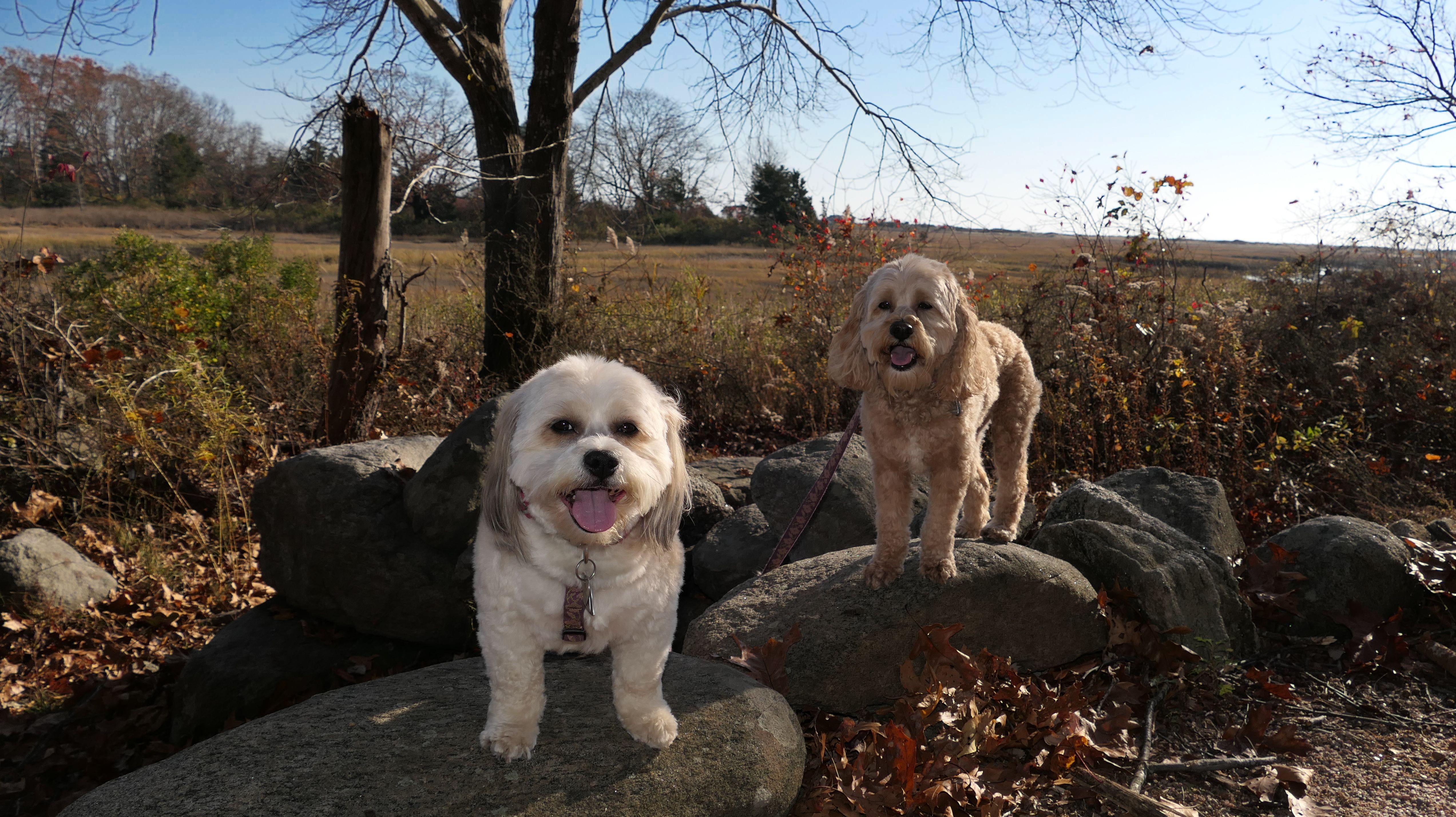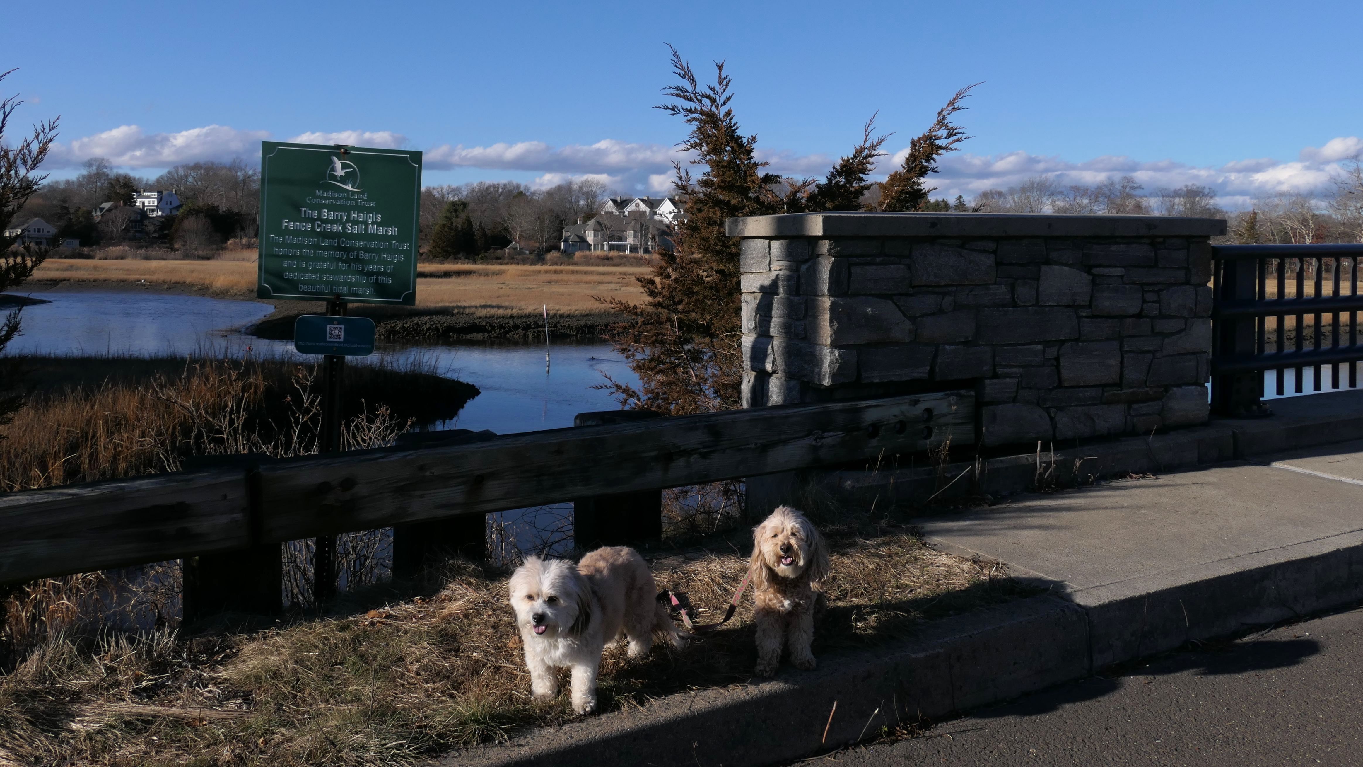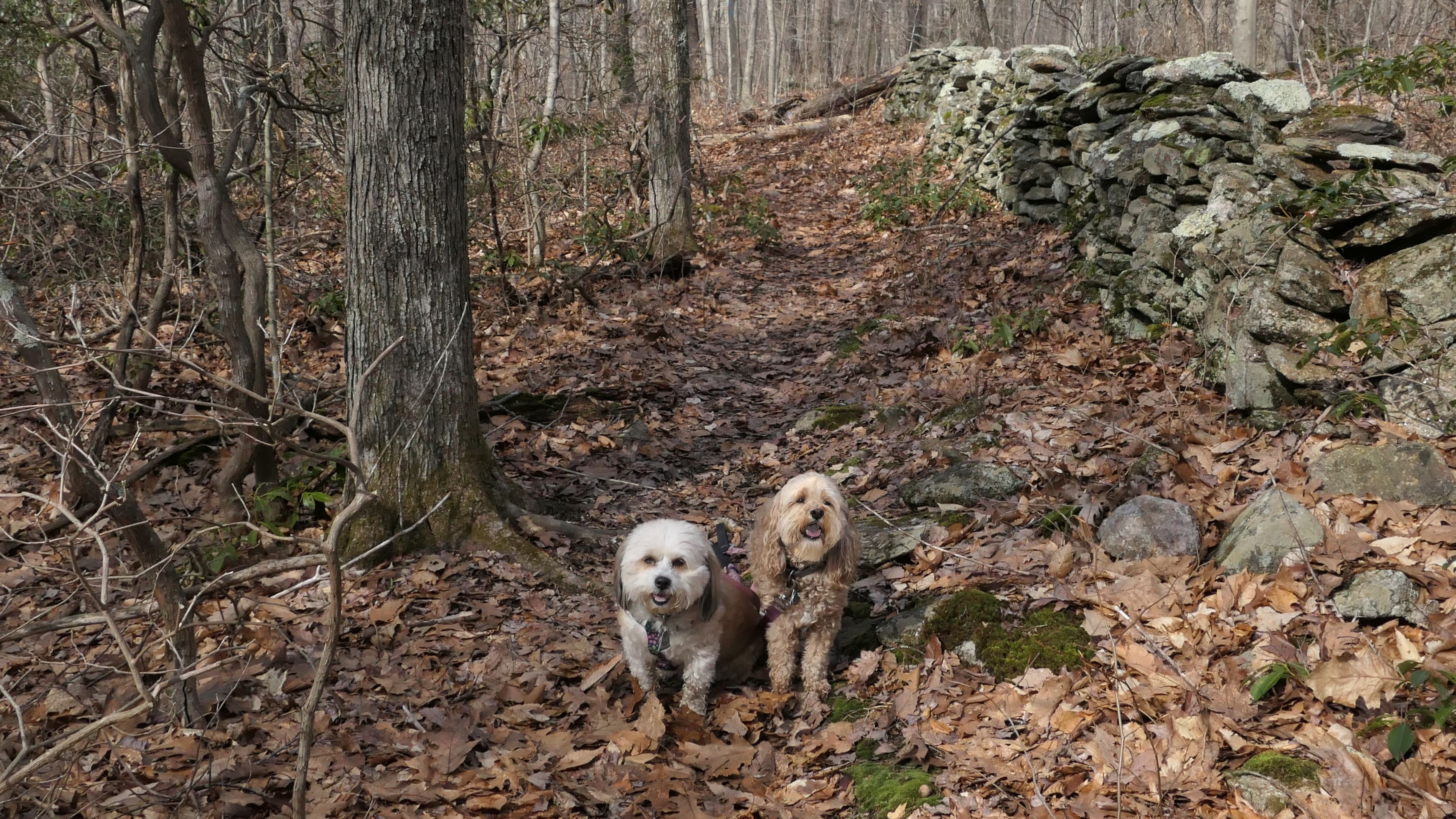 The Paper Mill Trail resides on Madison Land Trust property that once was the site of an old paper mill (hence the name). The ruins of the paper mill are at the beginning of the trail. There are remnants of a stone dam and a concrete dam that "breached." The dams were on the Hammonasset River, which also serves as the border between Madison and Killingworth. It's possible the dogs are in Killingsworth in some of the pictures below, at least the ones where they are in the middle of the river. The trail follows the river for about a mile, and then veers off from the river and loops around very near to some backyards. This part of the trail is rather ordinary.