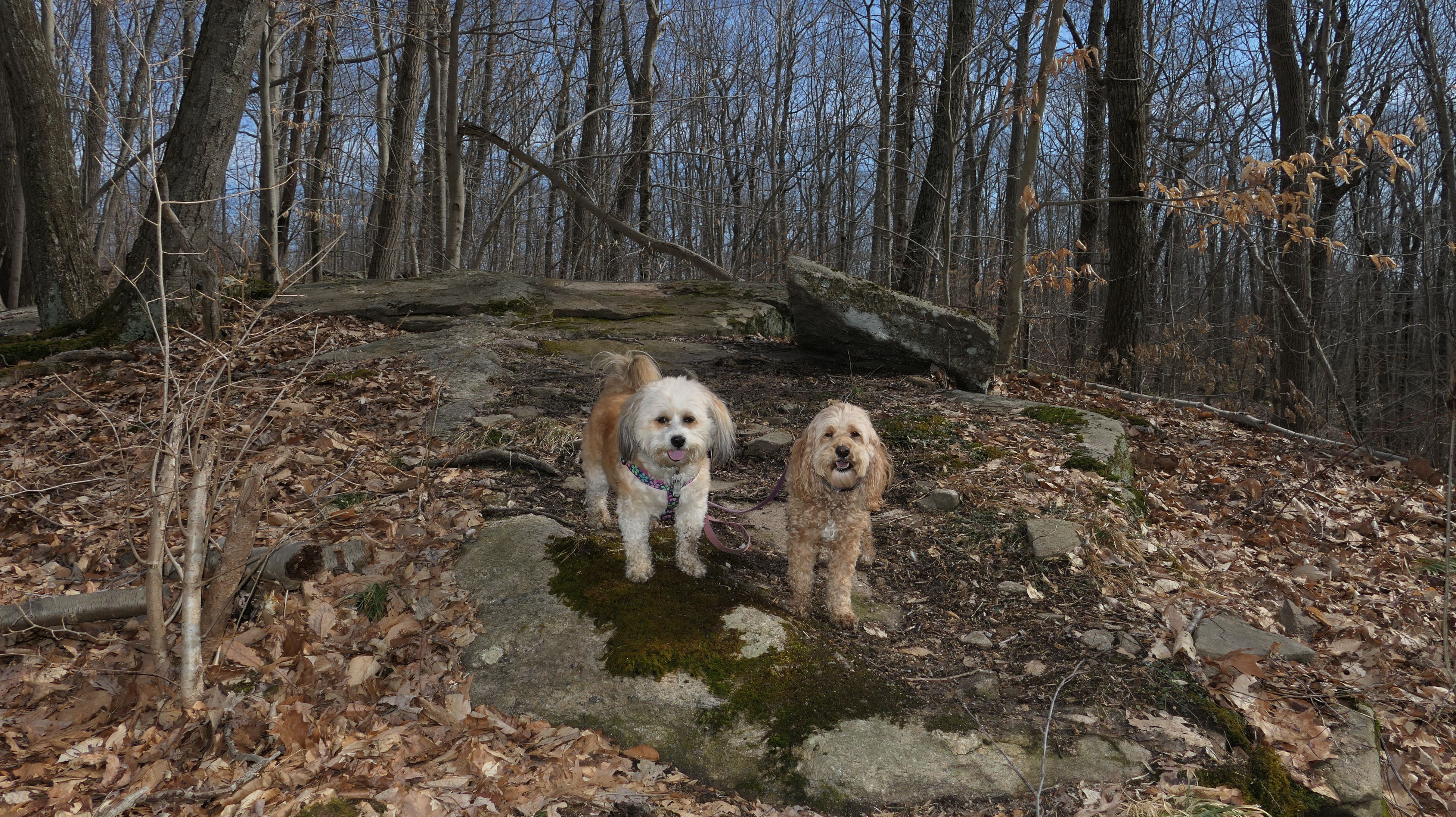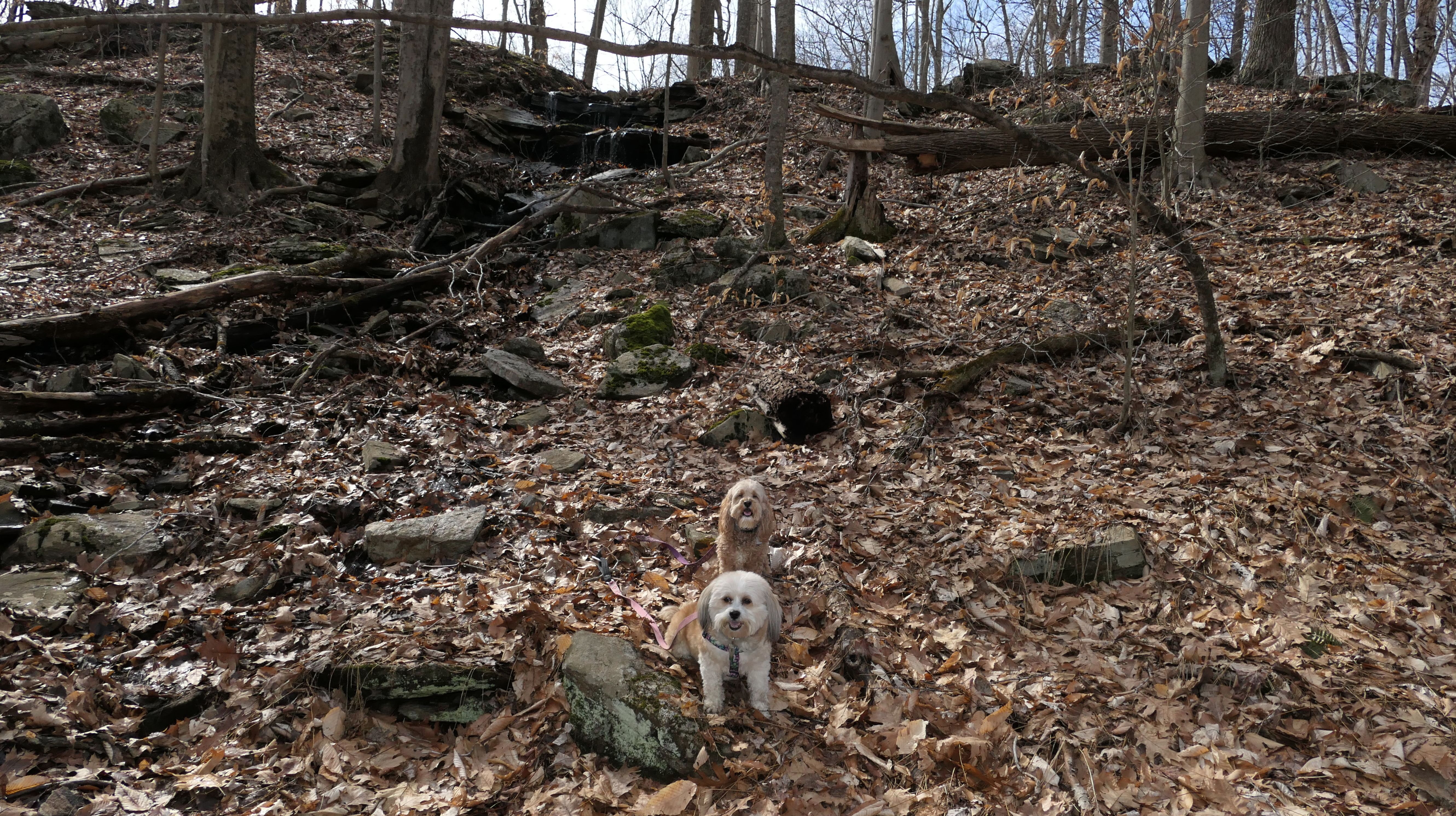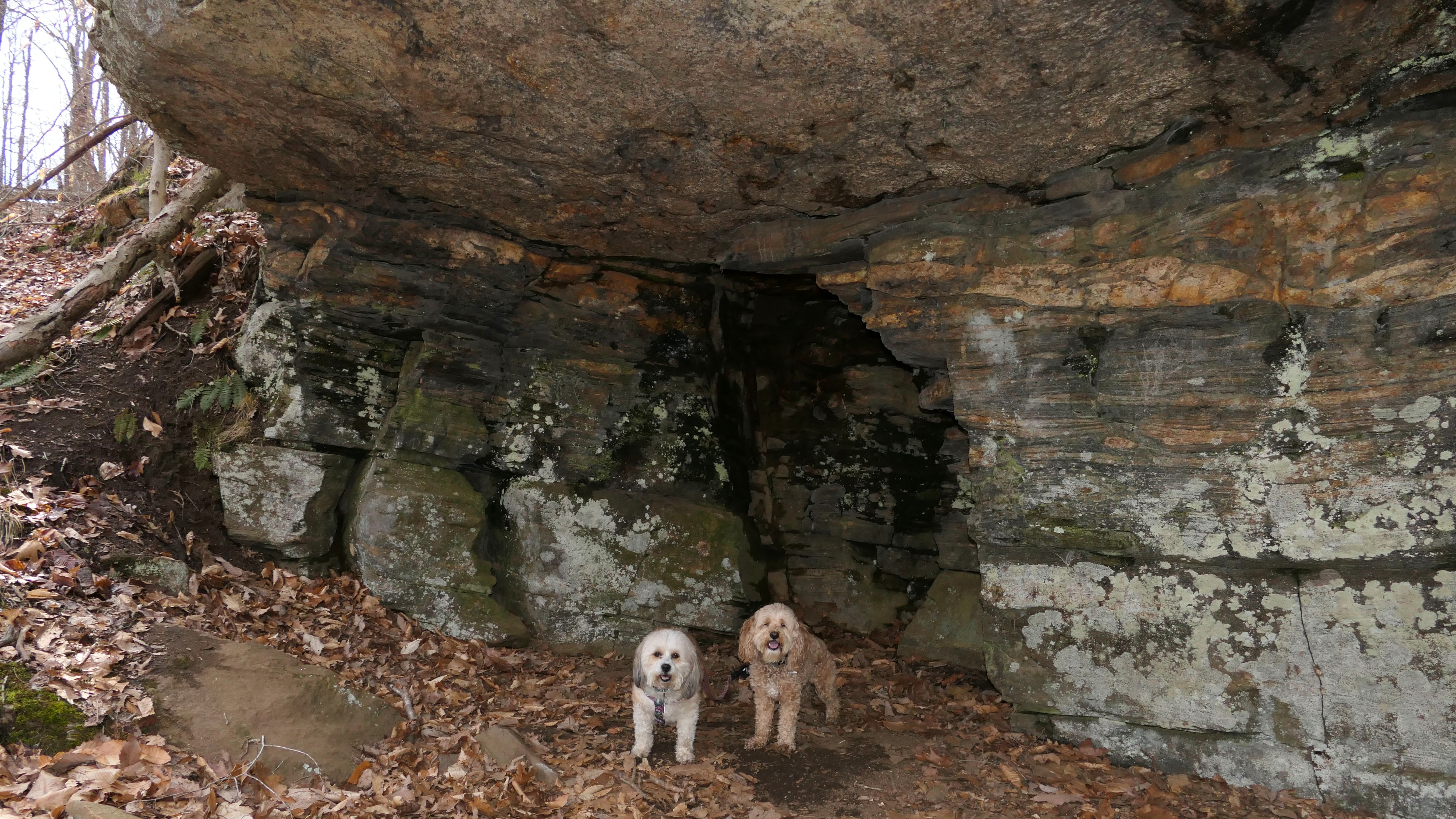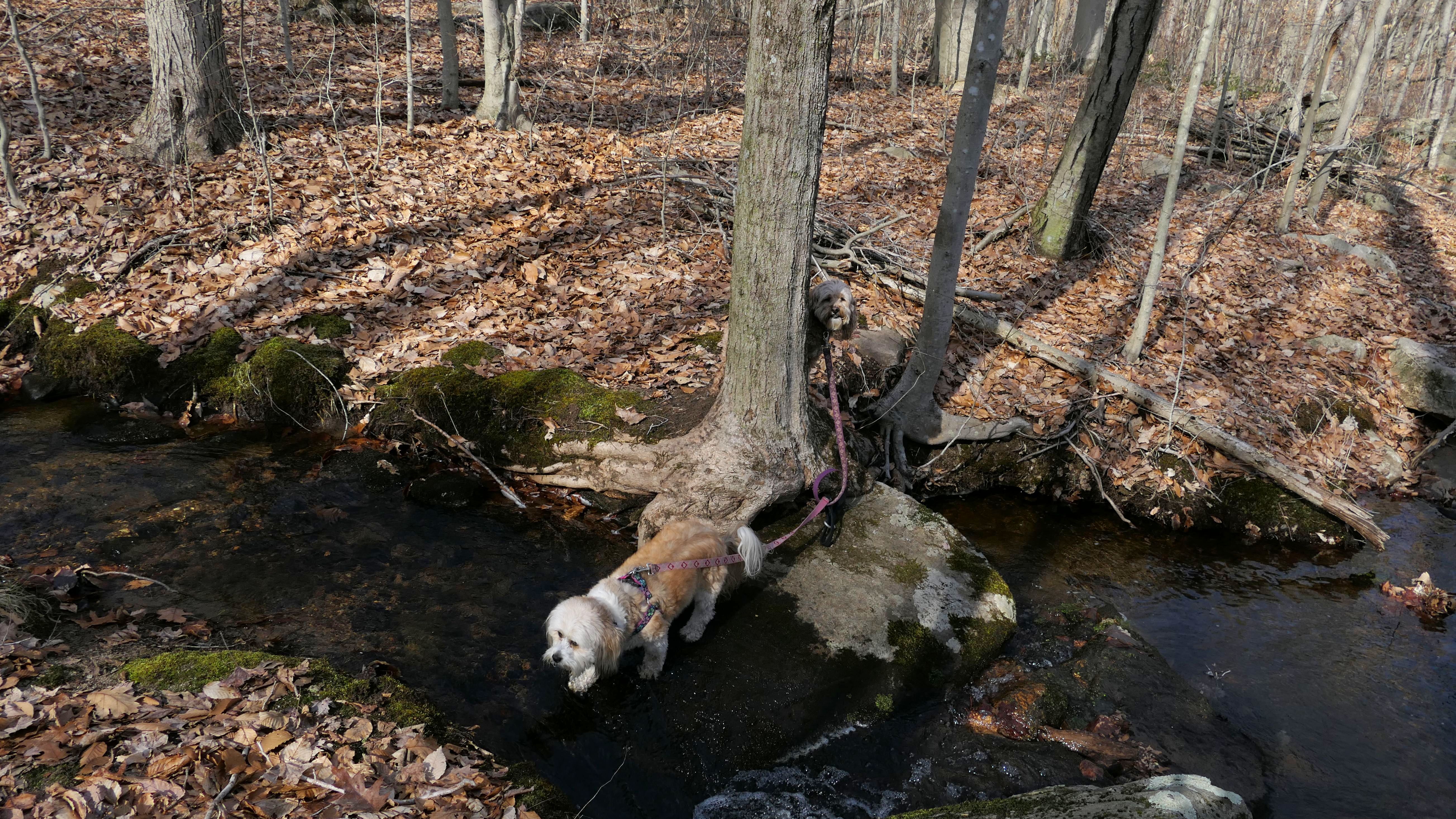 This is the first of two Madison Land Conservation Trust Trails we hiked on this day. Both were similar, and if my camera wasn't automatically geotagging the photos, I might have trouble figuring out which place each photo was from. We hiked a loop that was about a mile and a half long. The highlight of this one was the "Indian Rock Shelters" of course. Those are pretty much large rock formations, with some small caves. The trail itself is not very steep, but it is rocky. It was suprisingly not too muddy, but there were stream crossings with only rocks availble to cross. Of course the dogs just walked through the streams instead of balancing on the rocks.