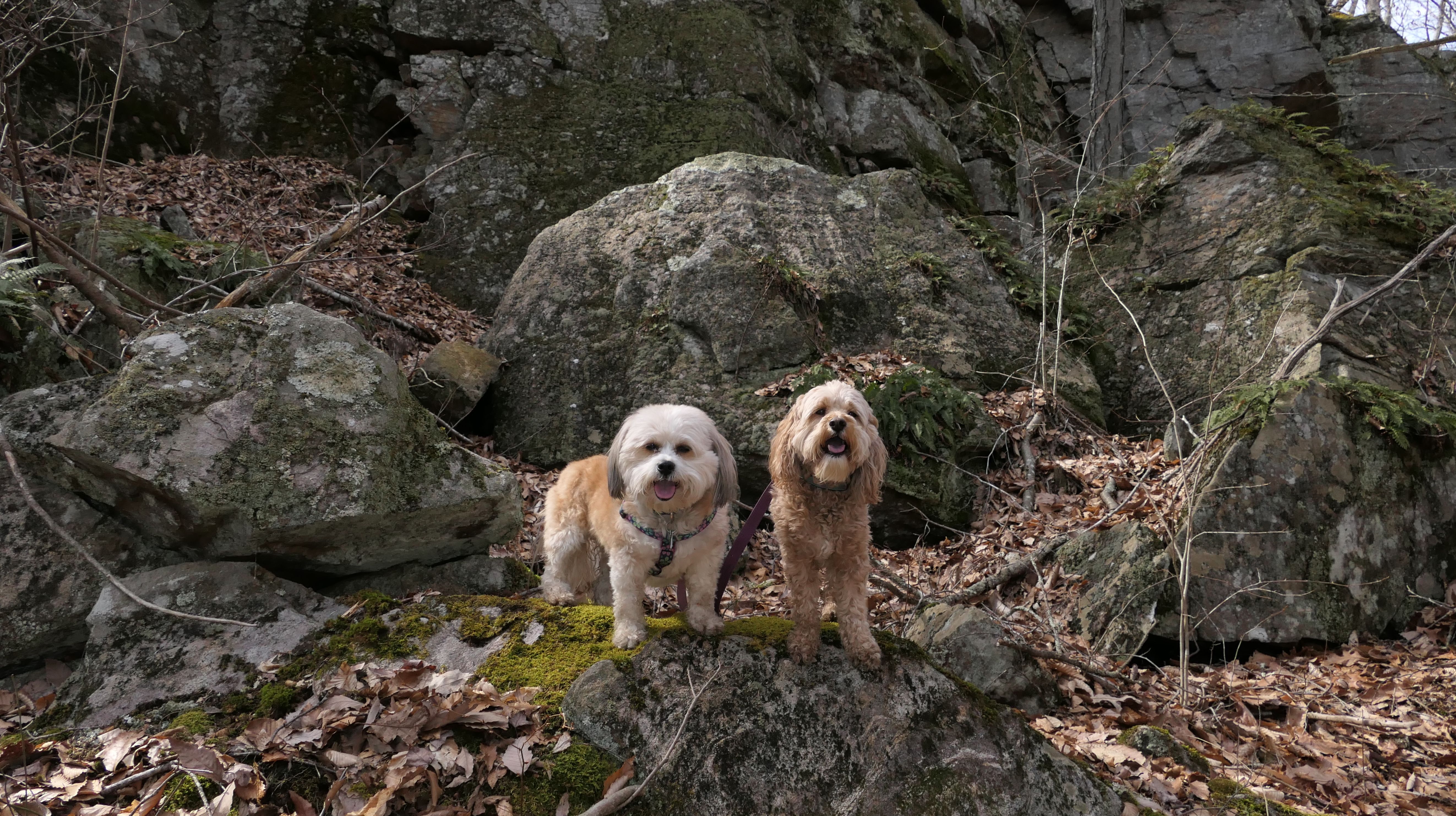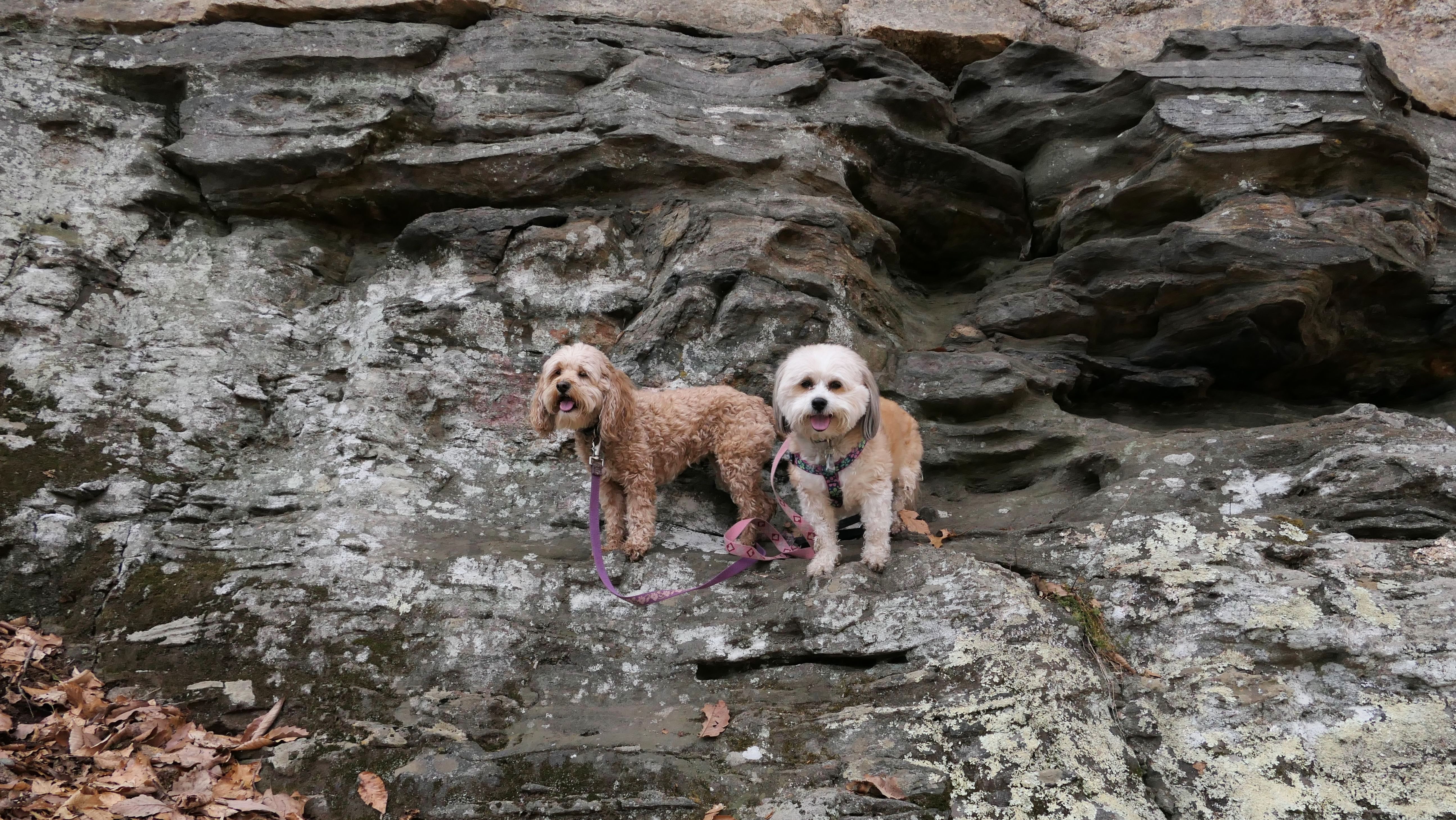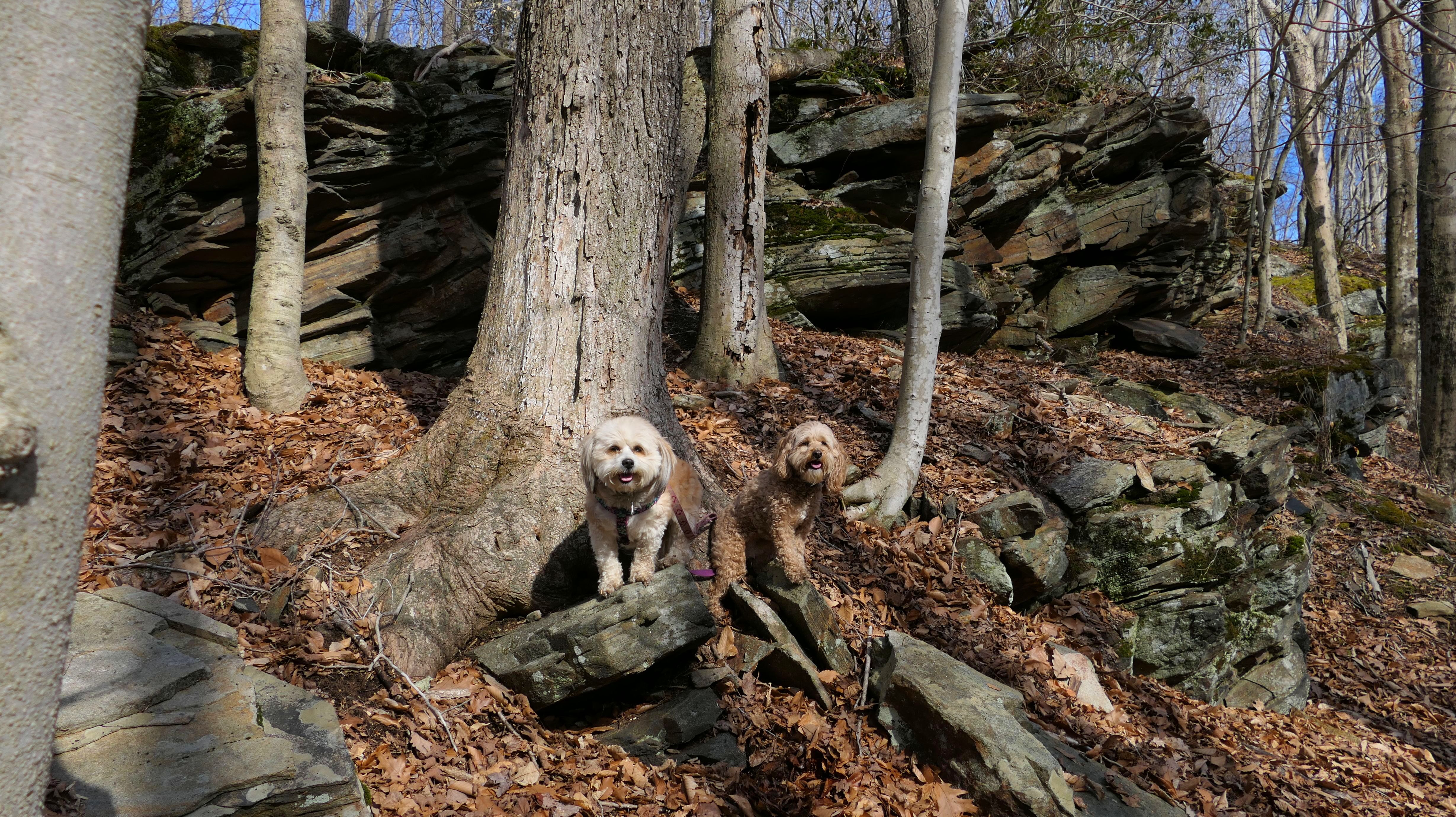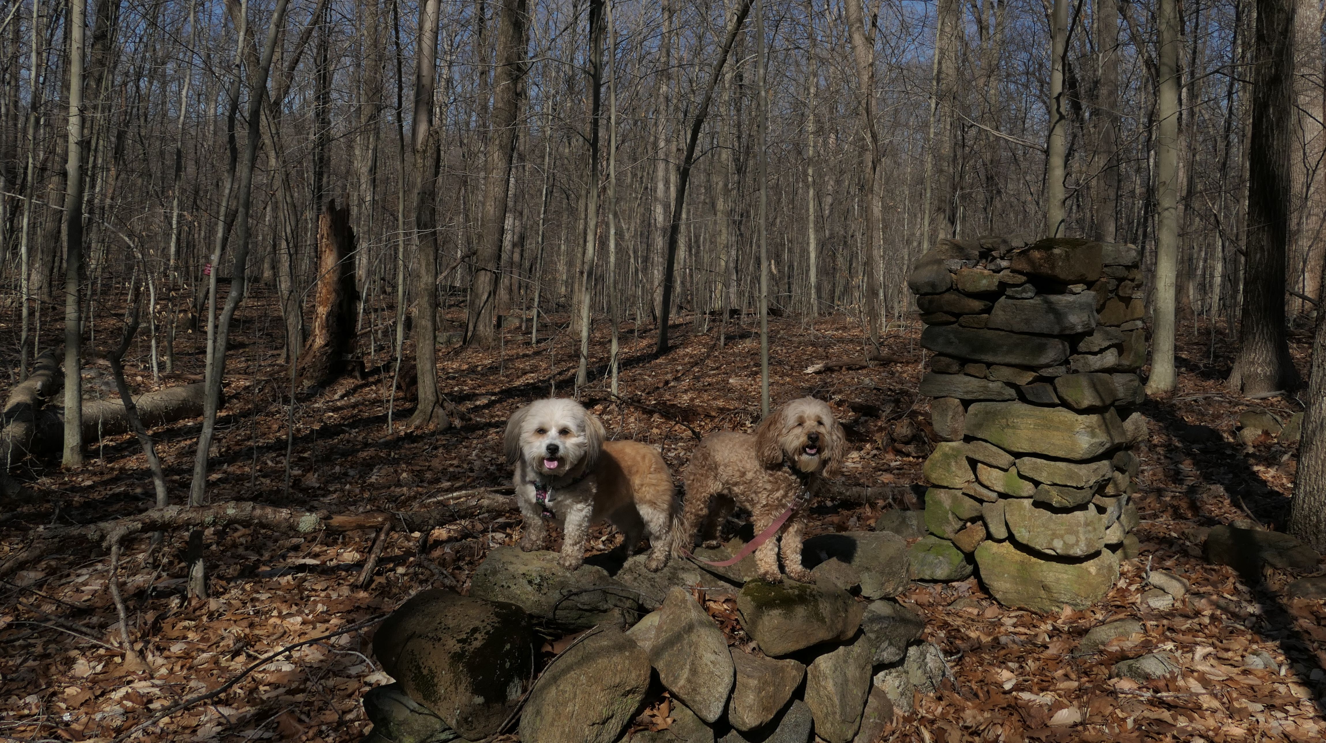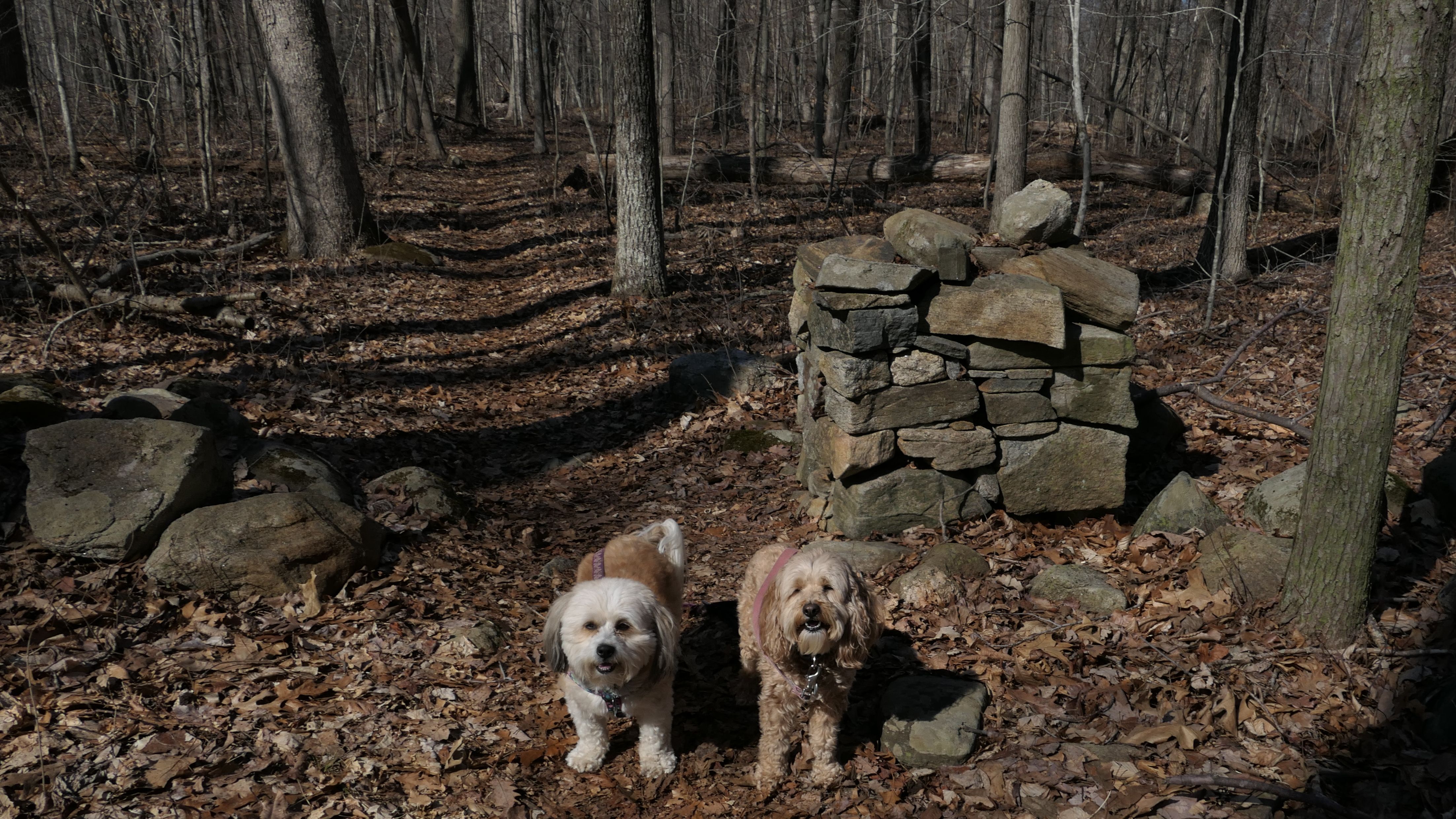 This is the first of two Madison Land Conservation Trust Trails we hiked on this day. Both were similar, and if my camera wasn't automatically geotagging the photos, I might have trouble figuring out which place each photo was from. We hiked a loop that was about a mile and a half long. The highlight of this one was the "Indian Rock Shelters" of course. Those are pretty much large rock formations, with some small caves. The trail itself is not very steep, but it is rocky. It was suprisingly not too muddy, but there were stream crossings with only rocks availble to cross. Of course the dogs just walked through the streams instead of balancing on the rocks.