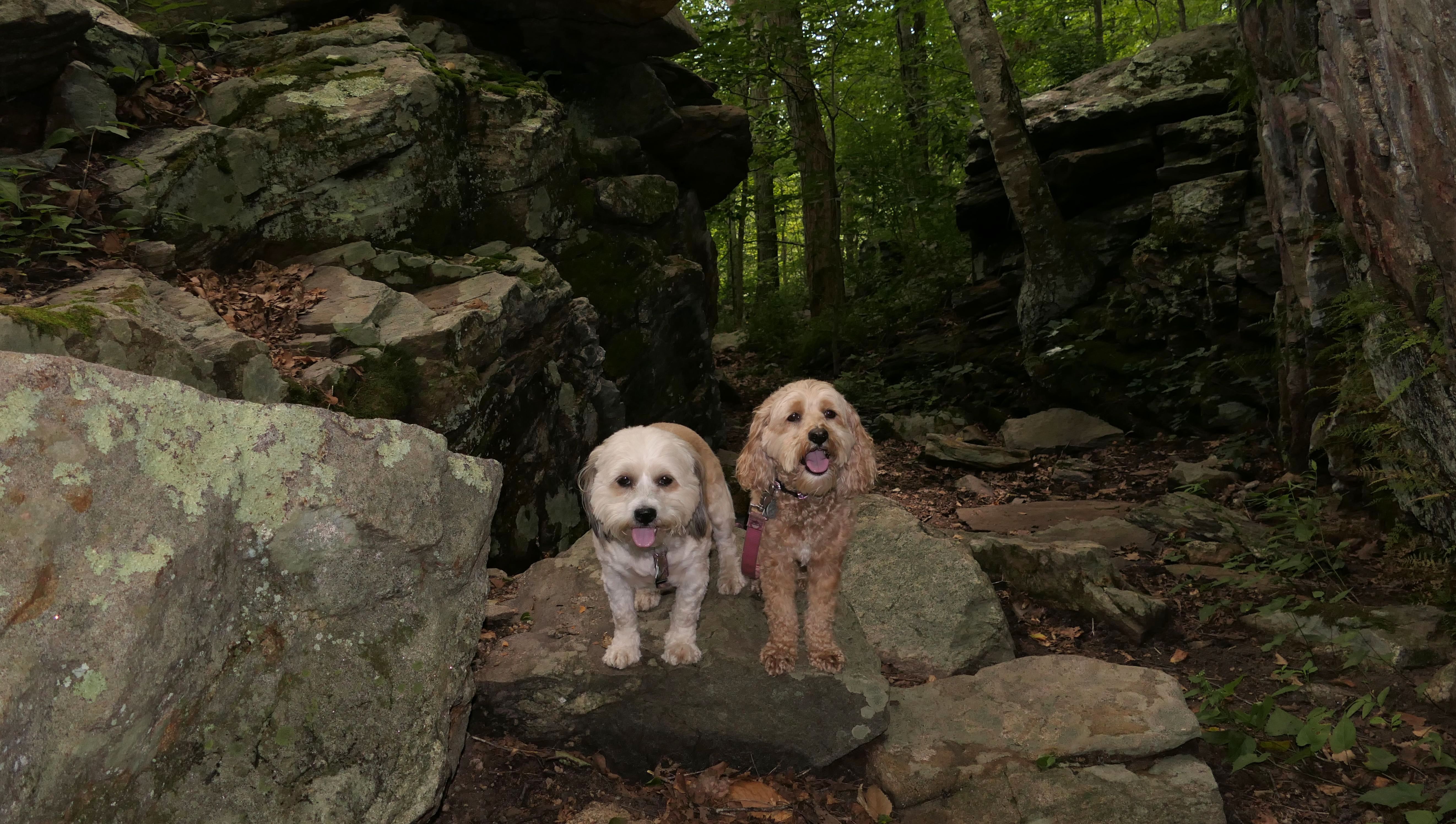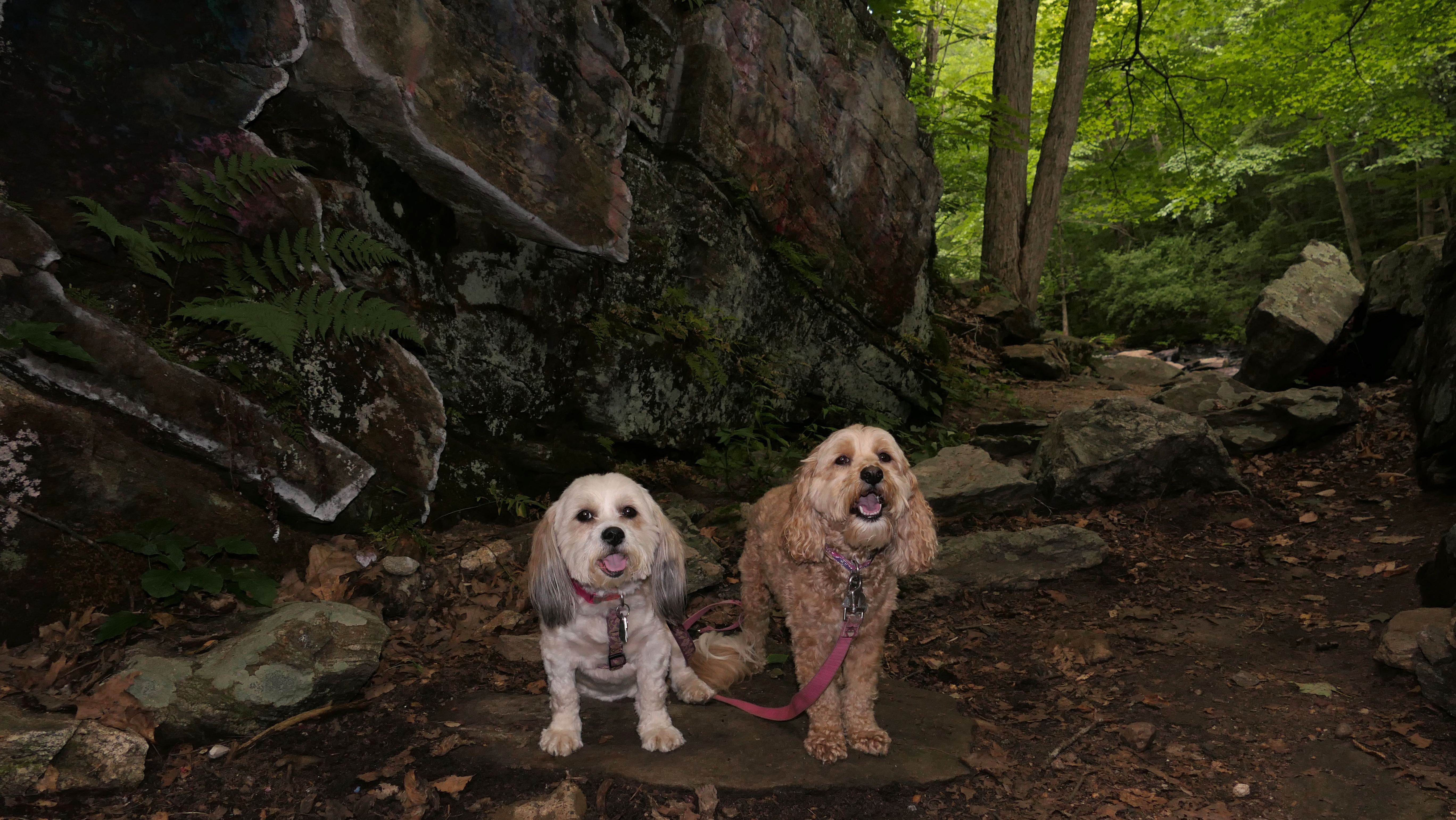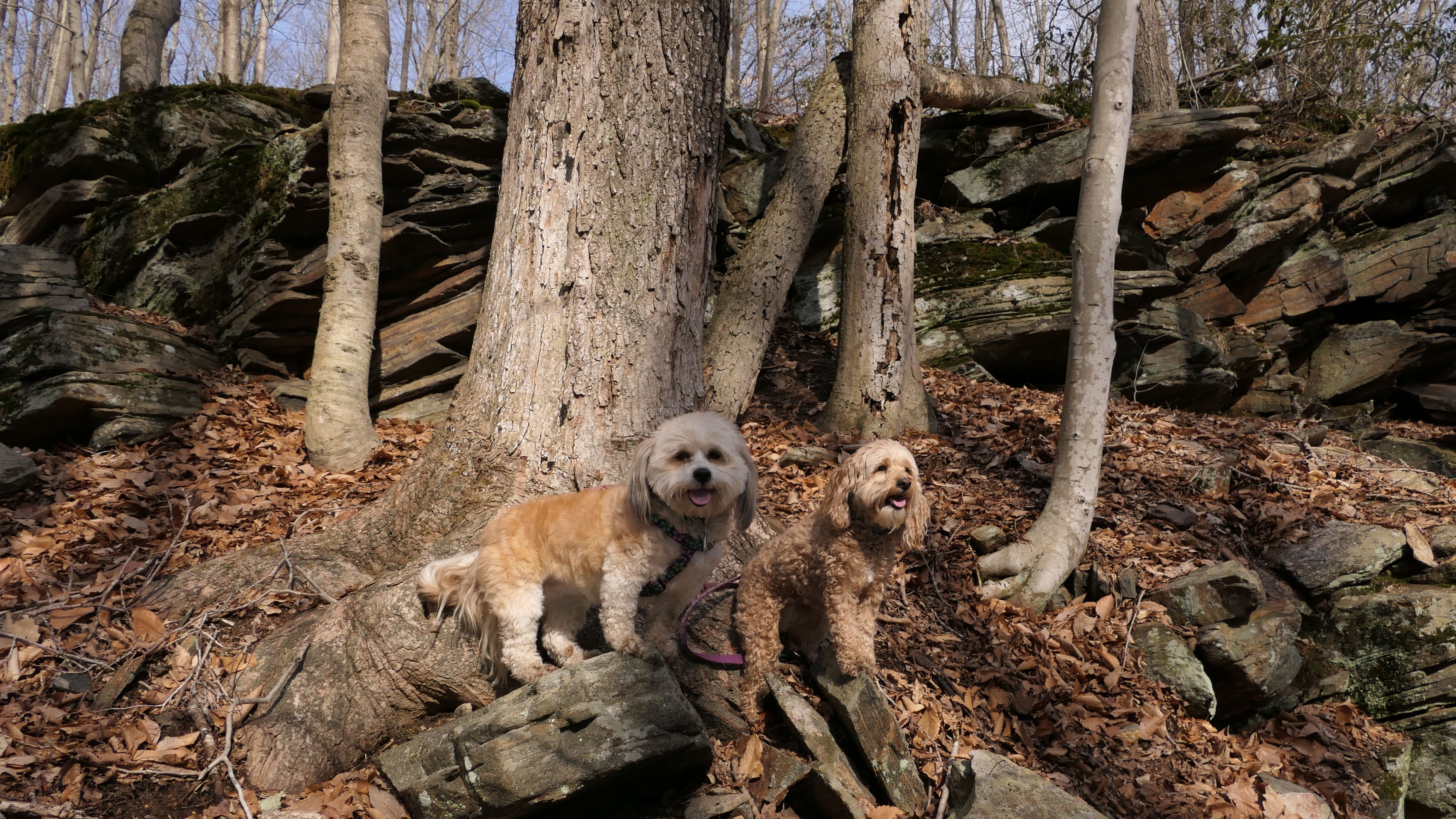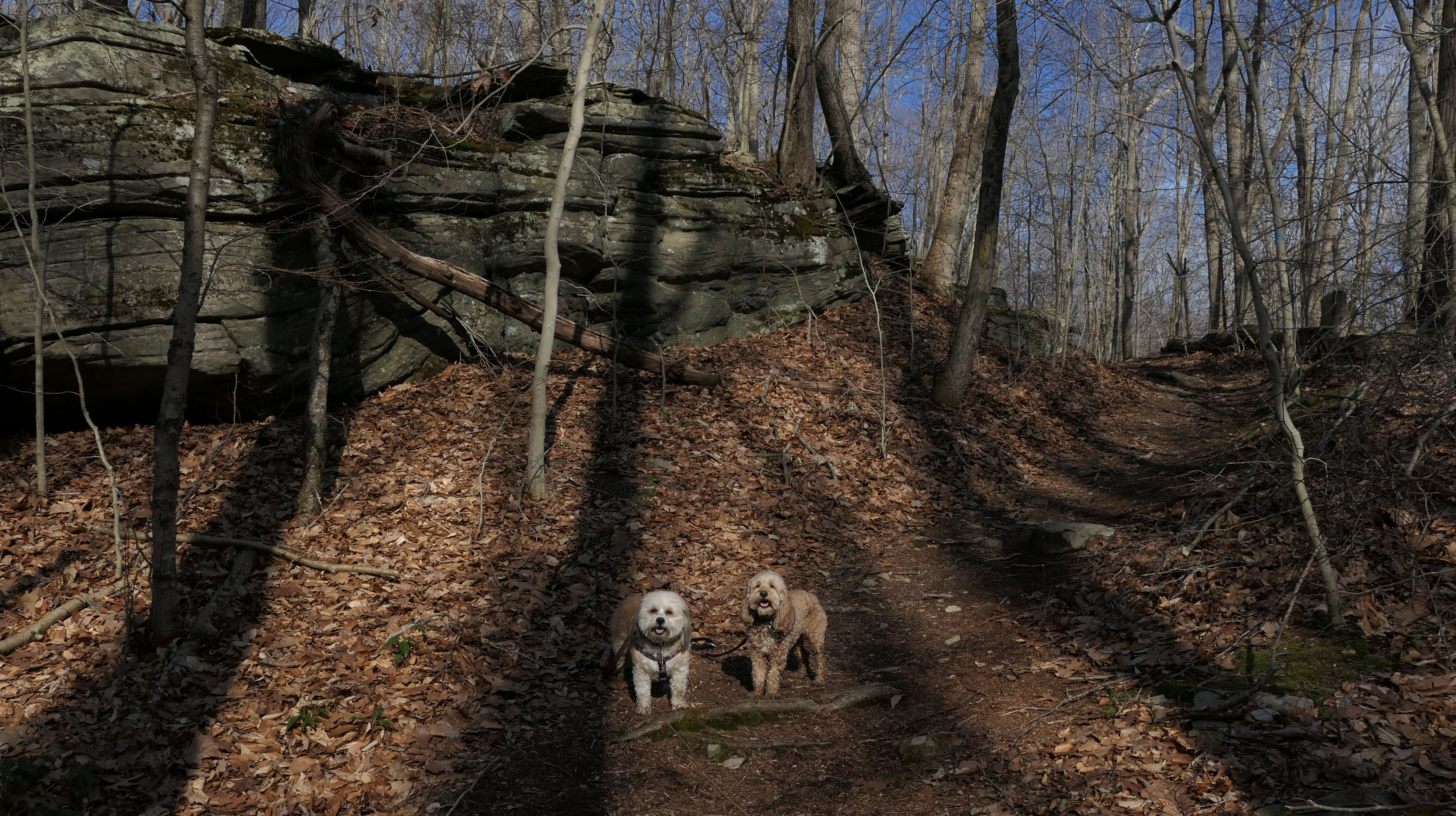 This is the first of two Madison Land Conservation Trust Trails we hiked on this day. Both were similar, and if my camera wasn't automatically geotagging the photos, I might have trouble figuring out which place each photo was from. We hiked a loop that was about a mile and a half long. The highlight of this one was the "Indian Rock Shelters" of course. Those are pretty much large rock formations, with some small caves. The trail itself is not very steep, but it is rocky. It was suprisingly not too muddy, but there were stream crossings with only rocks availble to cross. Of course the dogs just walked through the streams instead of balancing on the rocks.