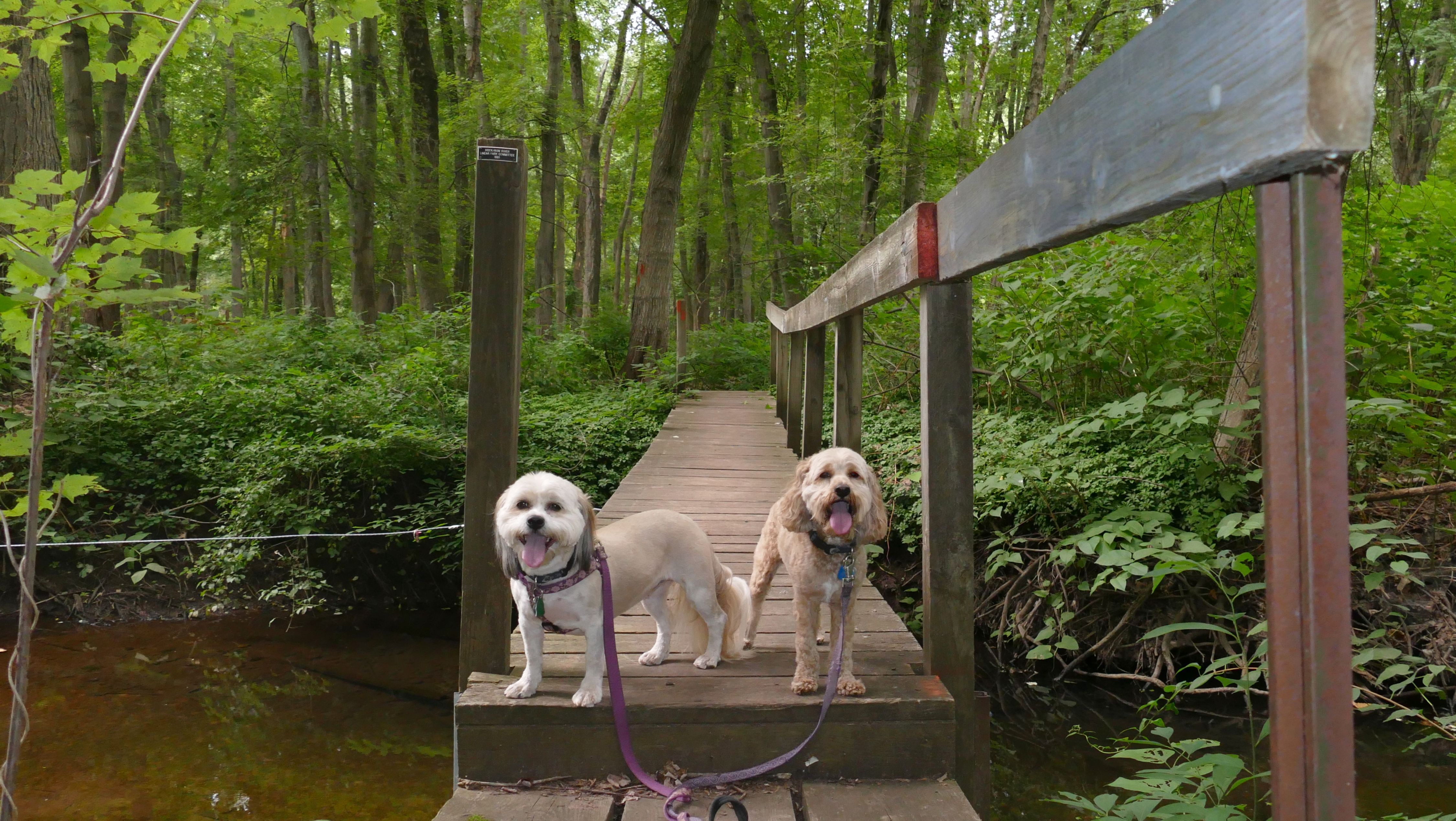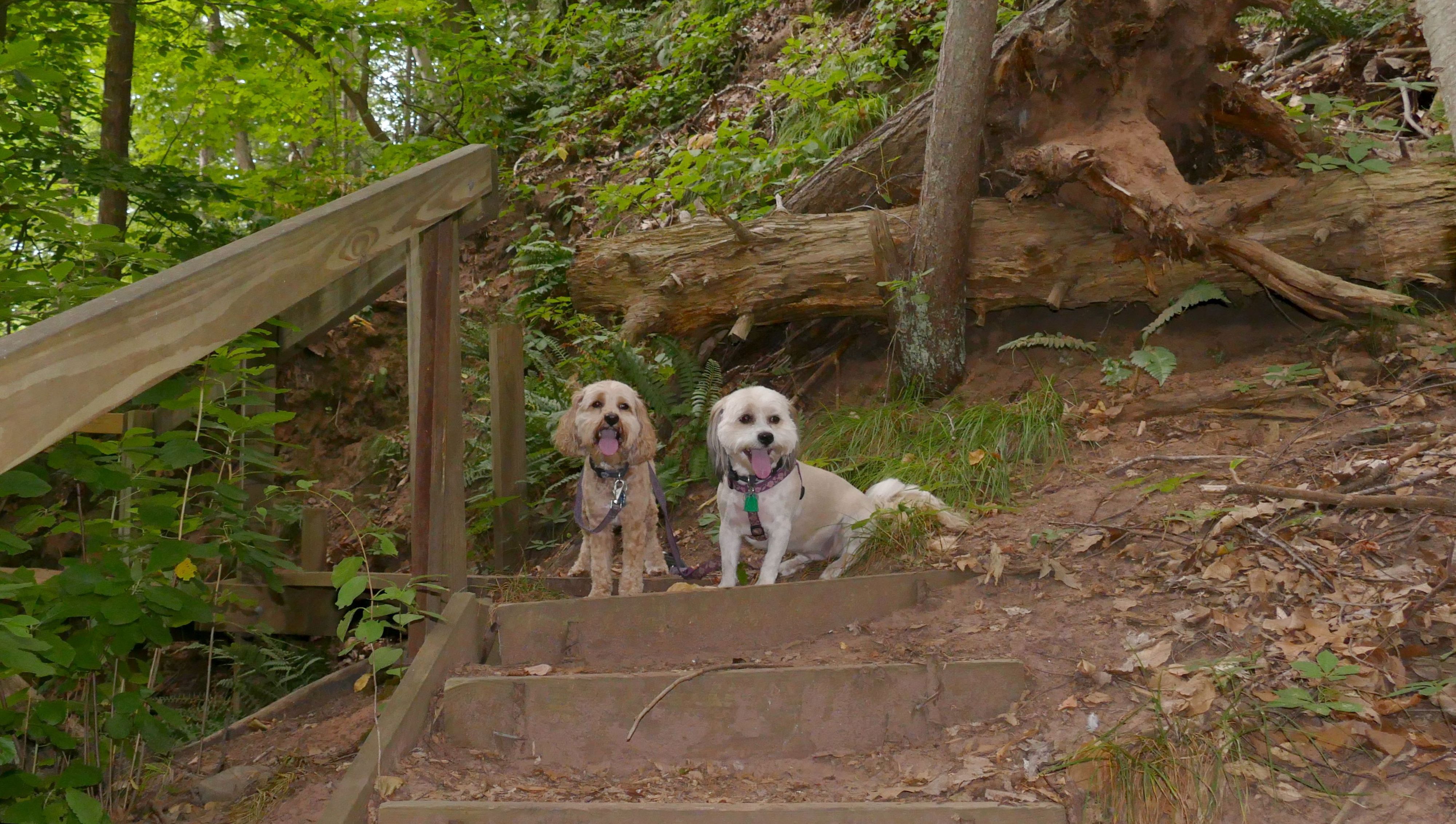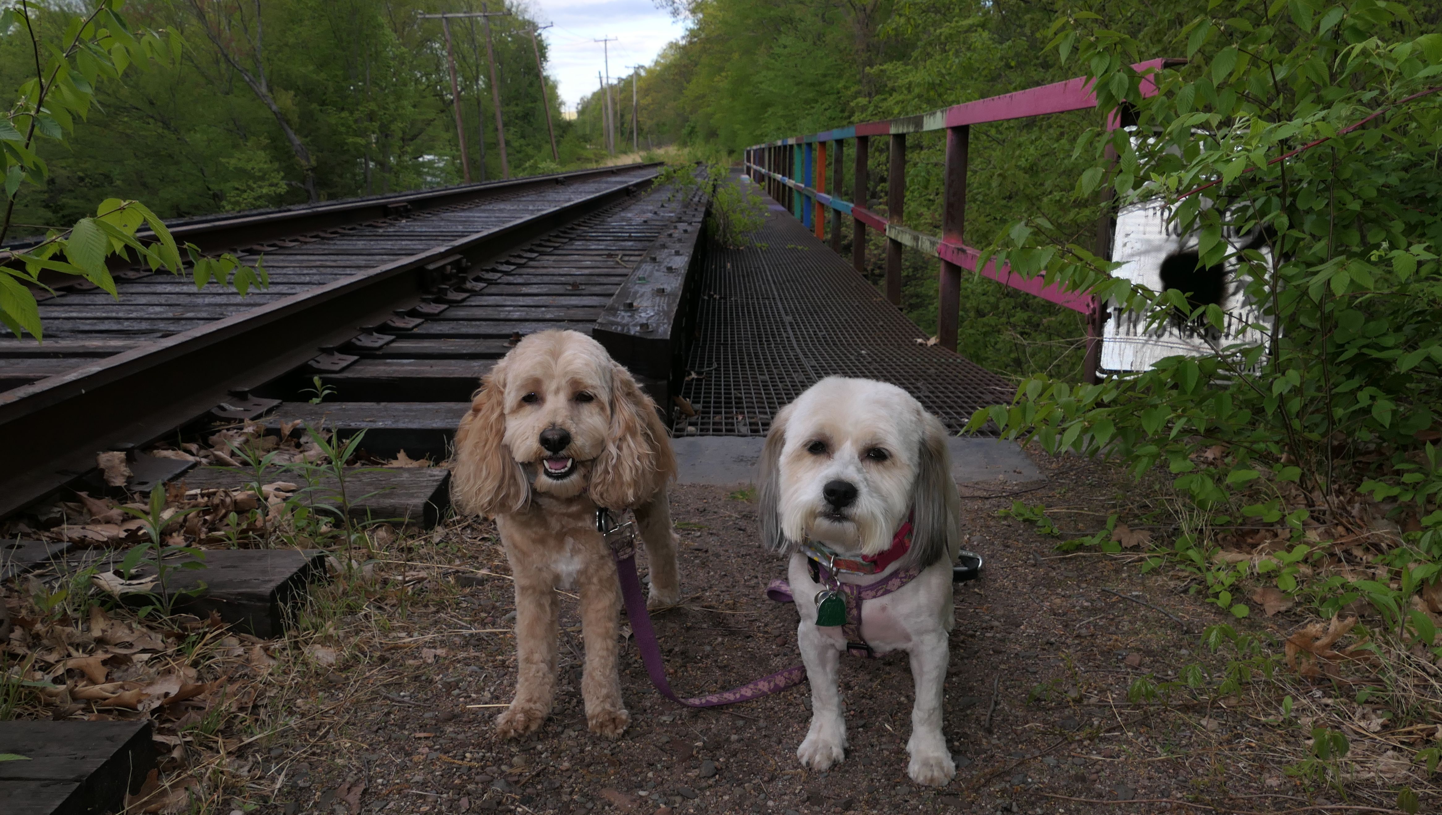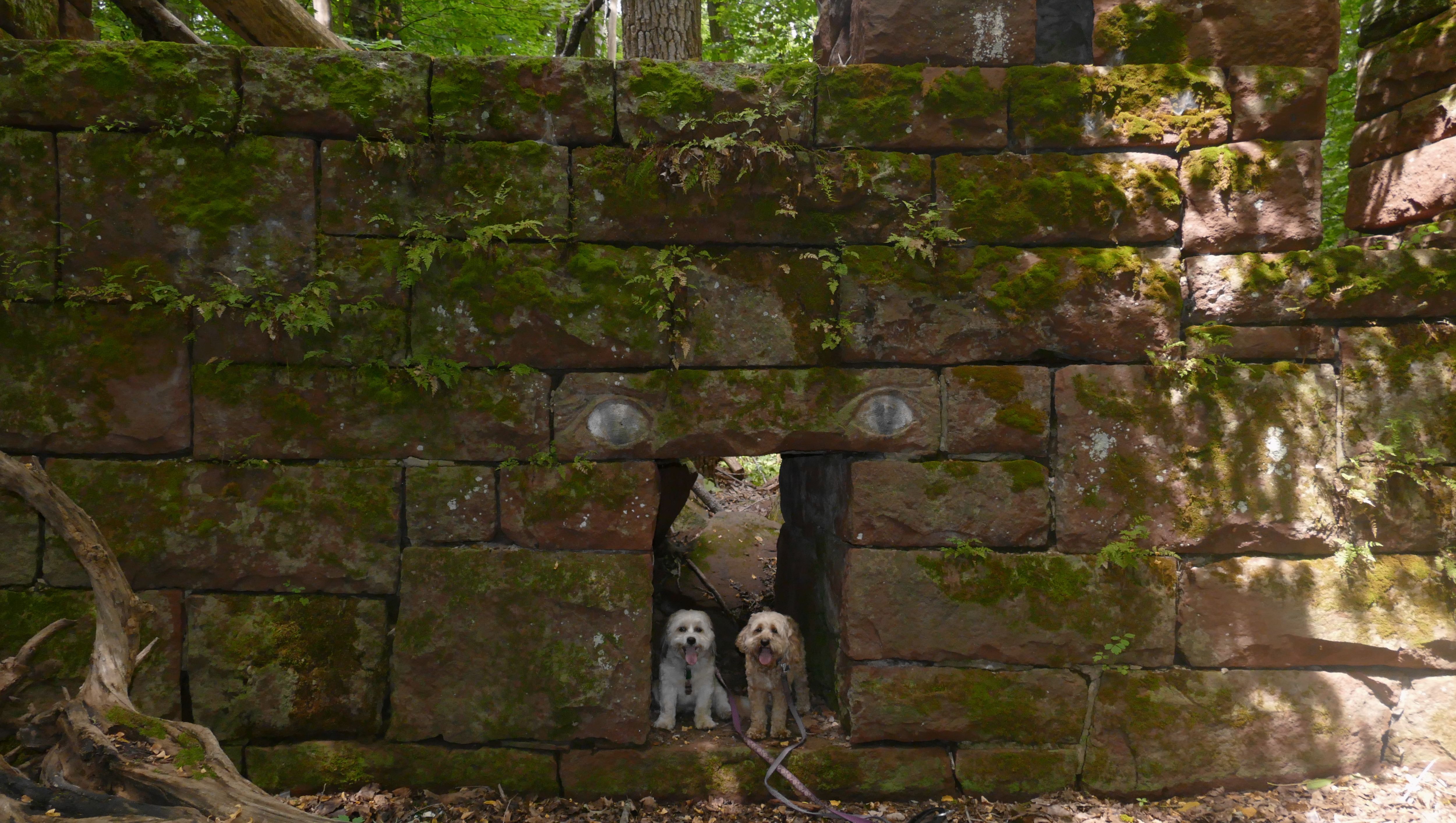 The Adam's Mill Restaurant was a staple in the town of Manchester for years. The restaruant has folded, and it is now Elicit Brewery. The trail starts behind the restaurant. You can walk a loop here, but you will come out down the road a bit next to the car dealership and have to walk the last segment on the sidewalk. The river crossing is actually over an old railroad bridge, and is technically closed to pedestrians. There really is no legitimate way to walk the loop unless you are a rule breaker! The bridge is a steel grate bridge. Mandy absolutely hates those, so we didn't actually cross the first time we visited. The second time we visited, I carried her over the bridge! Once on the other side of the bridge, there didn't seem to be an easy way back down the hill to the trail. We had to climb down a real steep hill. That was a real adventure with the dogs. Somehow we managed to get down in one piece! There's a side trail behind the restaurant, along a levee that leads to ruins of an old mill that were interesting to explore. Like the New State Road Trail, there is also a section on the side of a cliff that is a little tough to navigate.