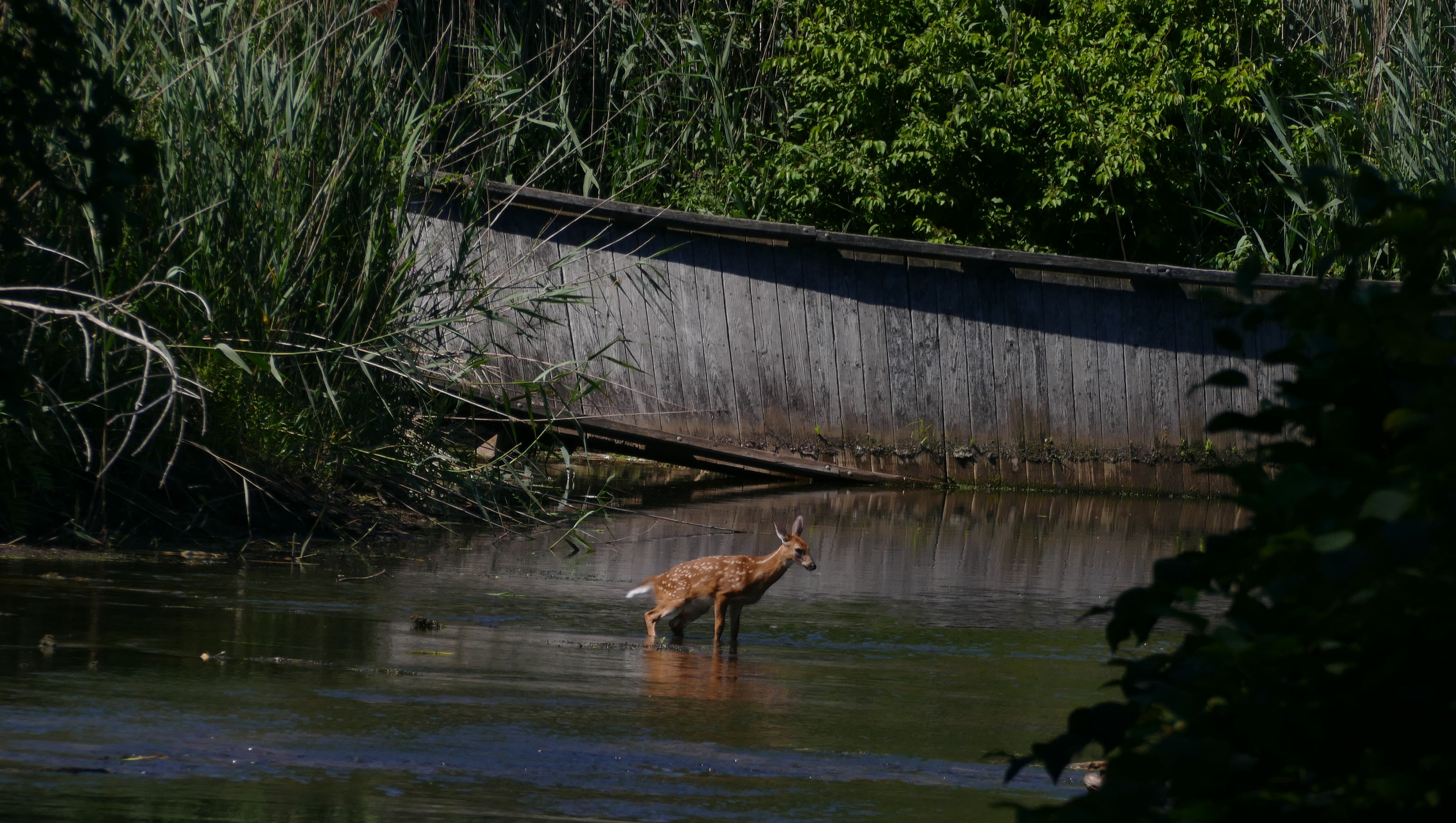 The longer loop is the one I enjoy the most. It has a wide variety of different types of terrains and views, from wooded areas to marsh lands, to more open areas. A protion of this trail incorporates the paved Captain John Bissell Greenway to cross the river. The other river crossing is on a large trail bridge. There is a large section that runs on elevated boardwalk, similar to the East Hartford sections. I brought Mandy and Lexi here for the first time in 2018, but I was disappointed as the boardwalk section of the trail was closed due to damage, and it was not possible to hike the entire loop. At some point within the last two years, the trail has been re-routed away from the damage, and the loop is complete once again. You can see the old boardwalk in the pictures below, the part that is still is in tact, and the part that is no longer passable. You can also see the doe who was enjoying cooling off in the Hockanum on that warm day.