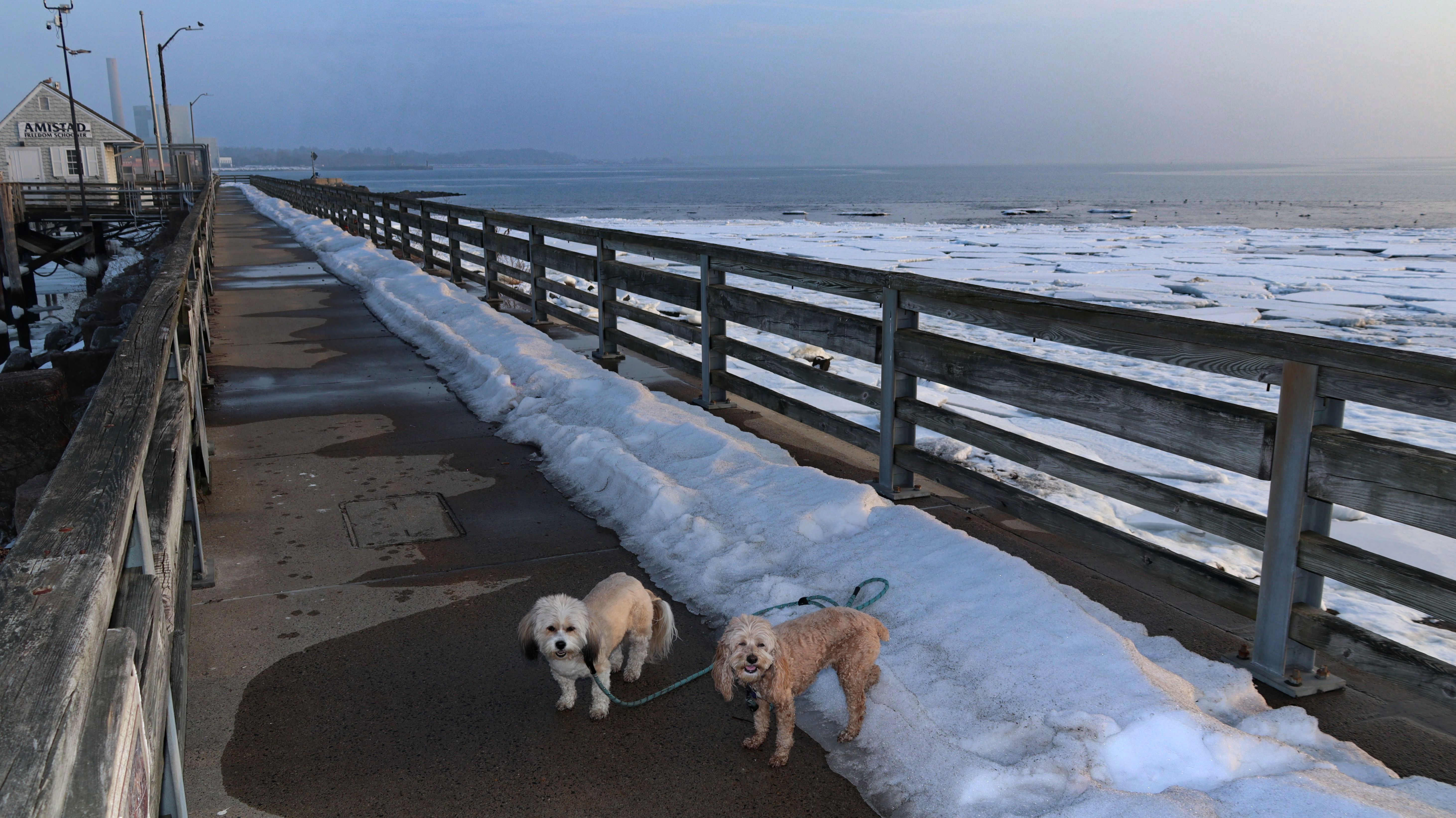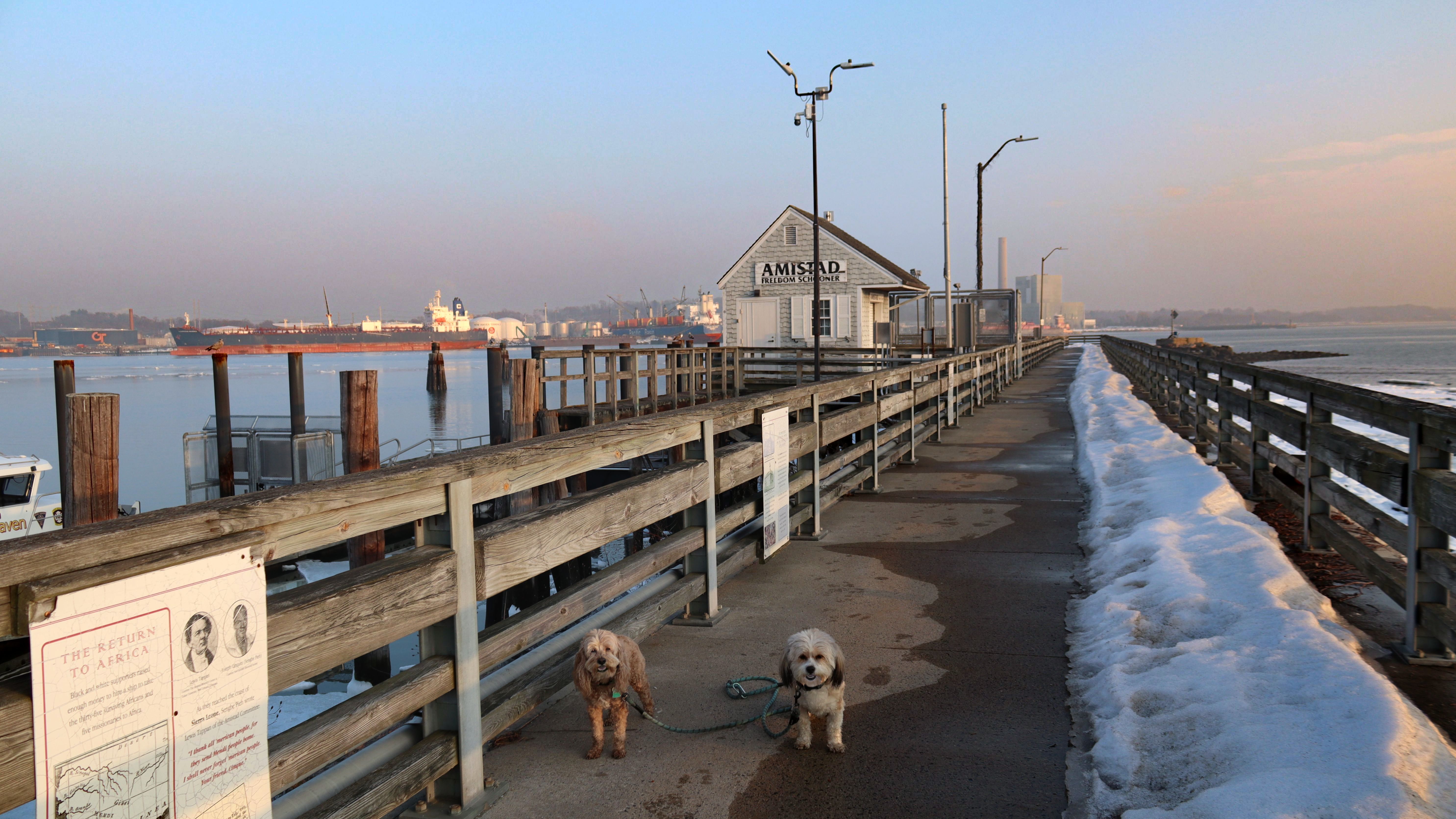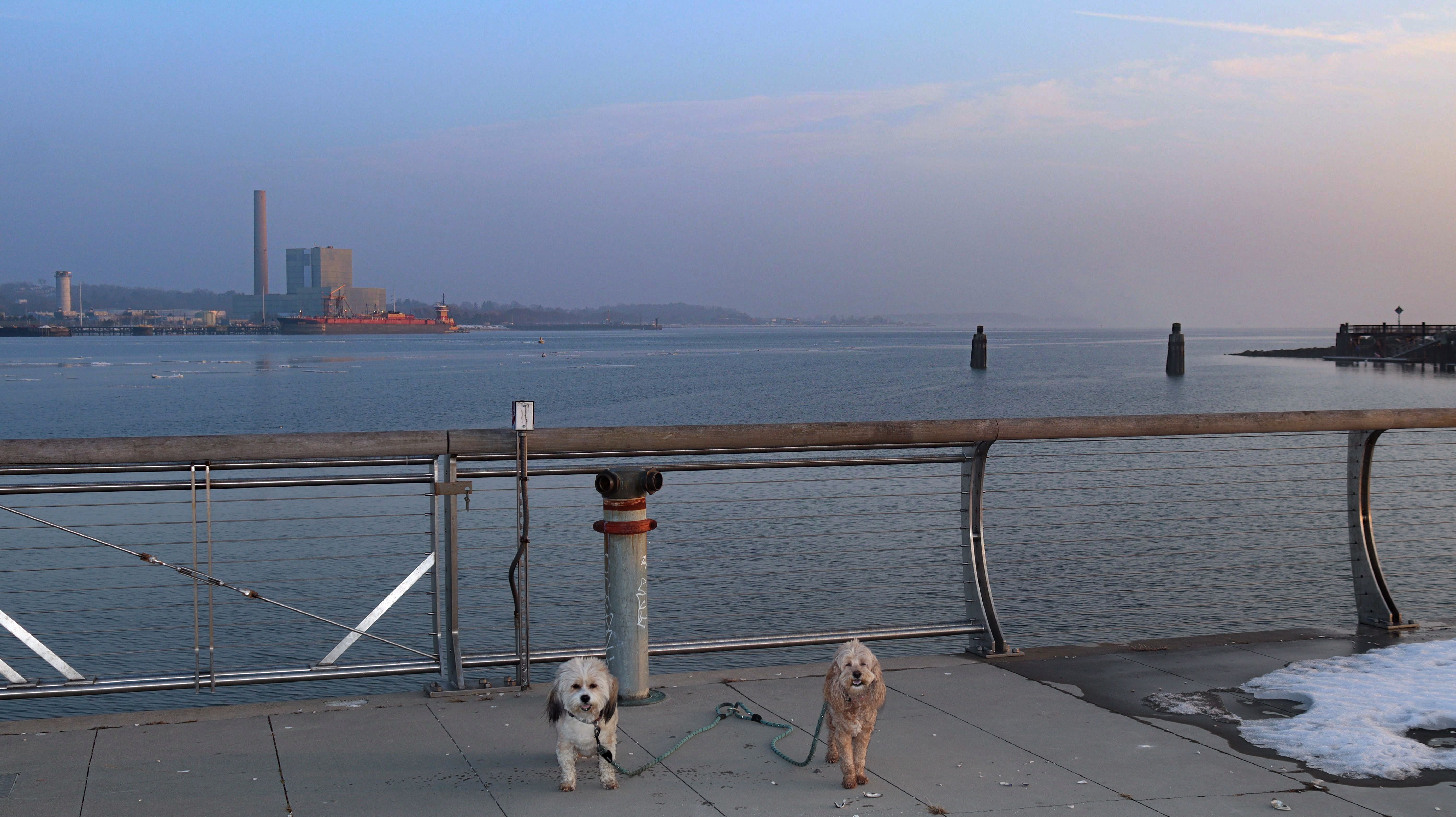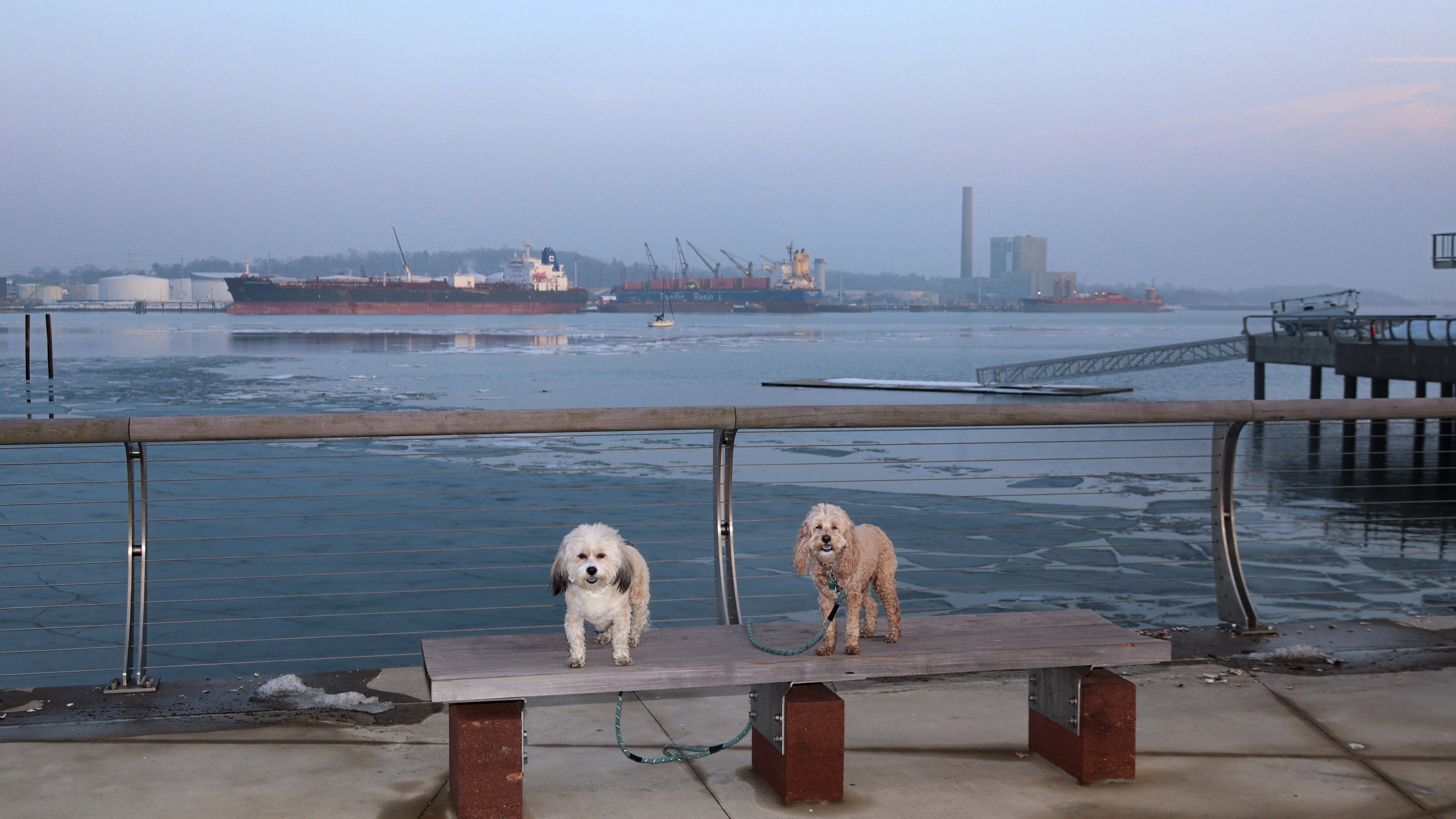 It was gray and gloomy for most of the day. The sun made a brief attempt to break through late in the afternoon, but it only left us with haze and fog, which created some interesting photo opportunities. We had visited before, first back in November of 2020, and later passed through again when we reached the southern end of the Farmington Canal Heritage Trail. It felt strange seeing chunks of ice floating in New Haven Harbor. We walked the full length of the harbor-side walkway, a little over two and a half miles round trip. On the opposite side of the street, food trucks were lined up, but every single one was a taco truck, so there wasn't much variety. The dogs enjoyed the walk, especially Mandy, who made it her personal mission to step in every puddle along the way.