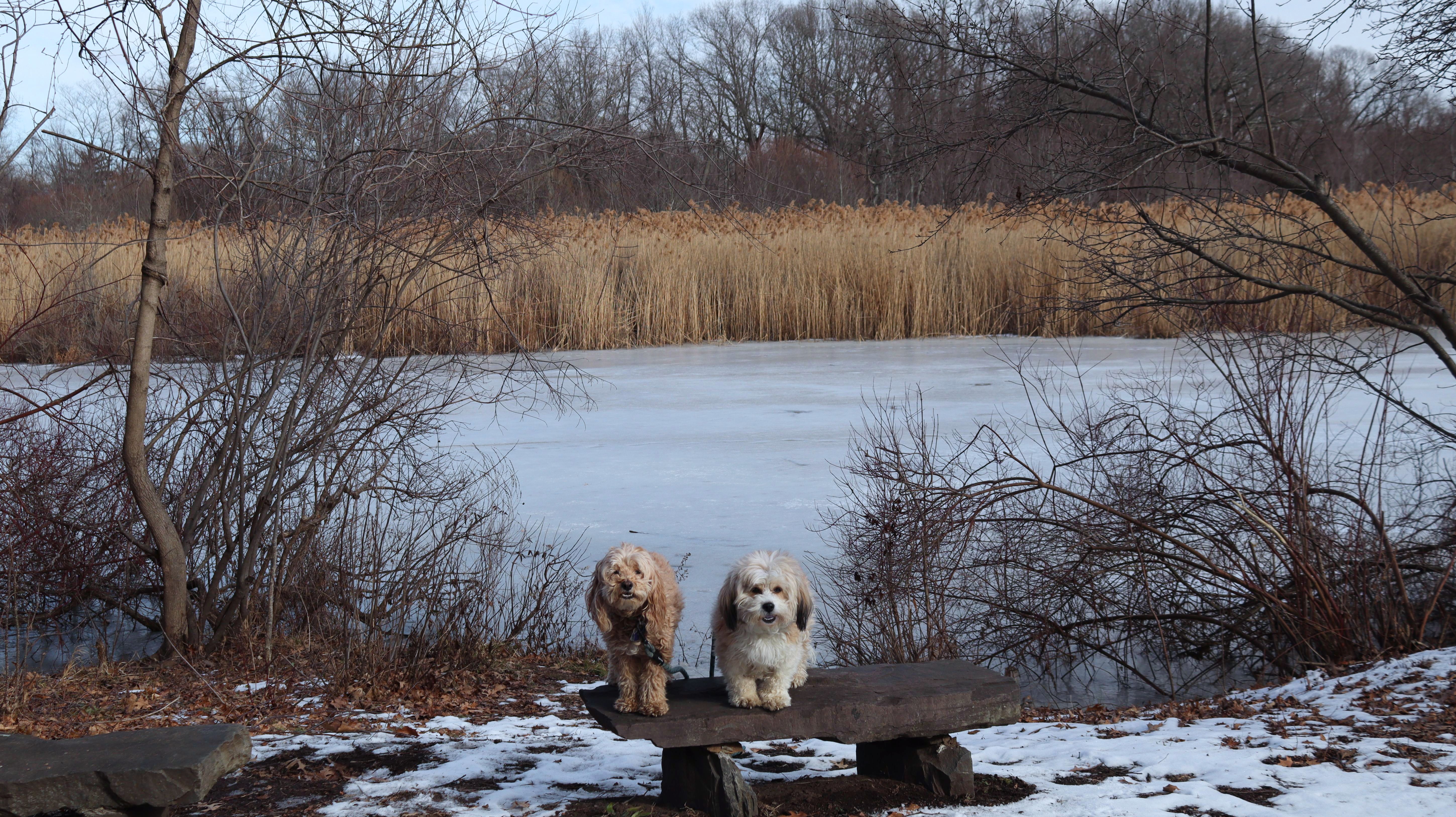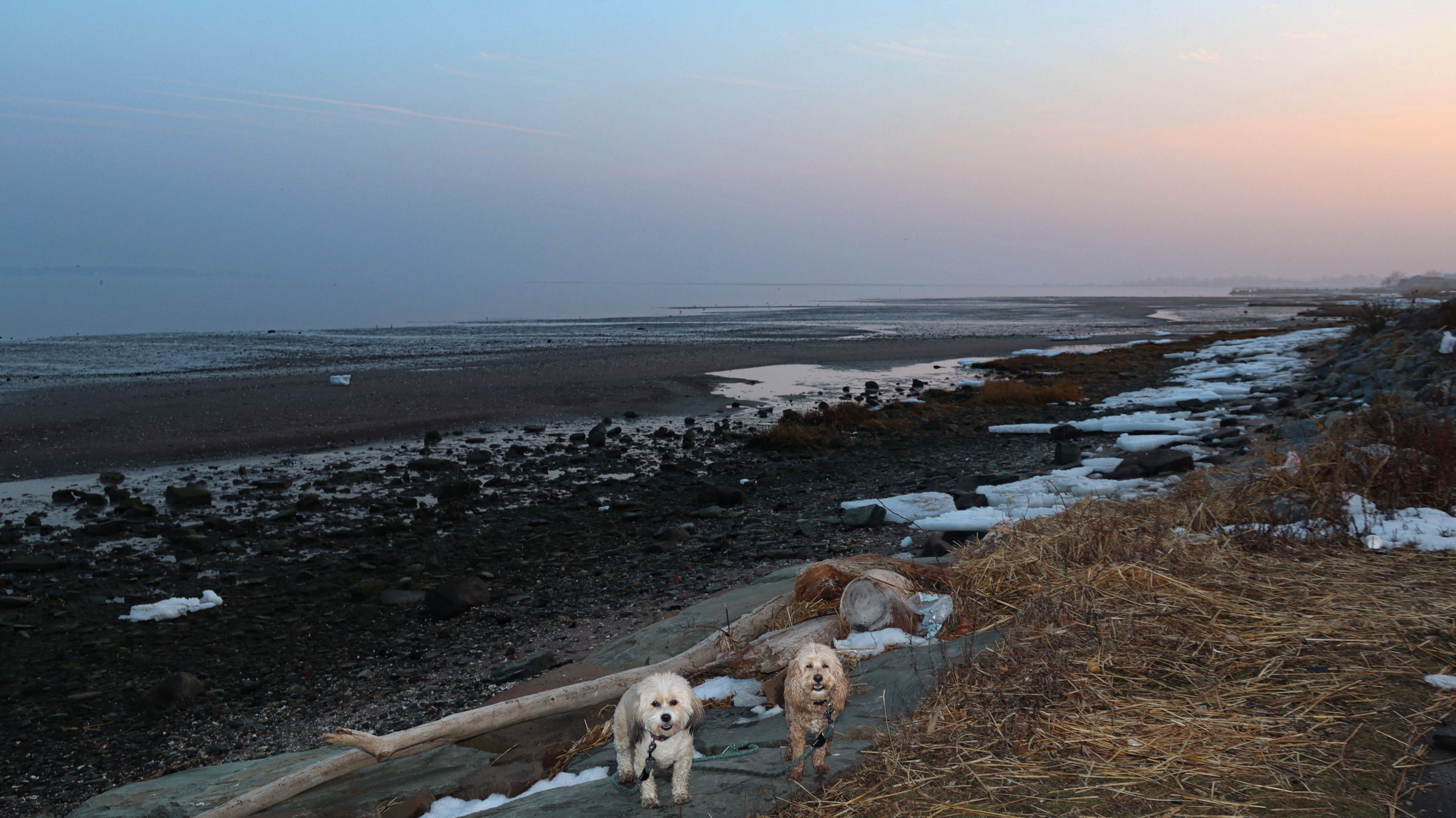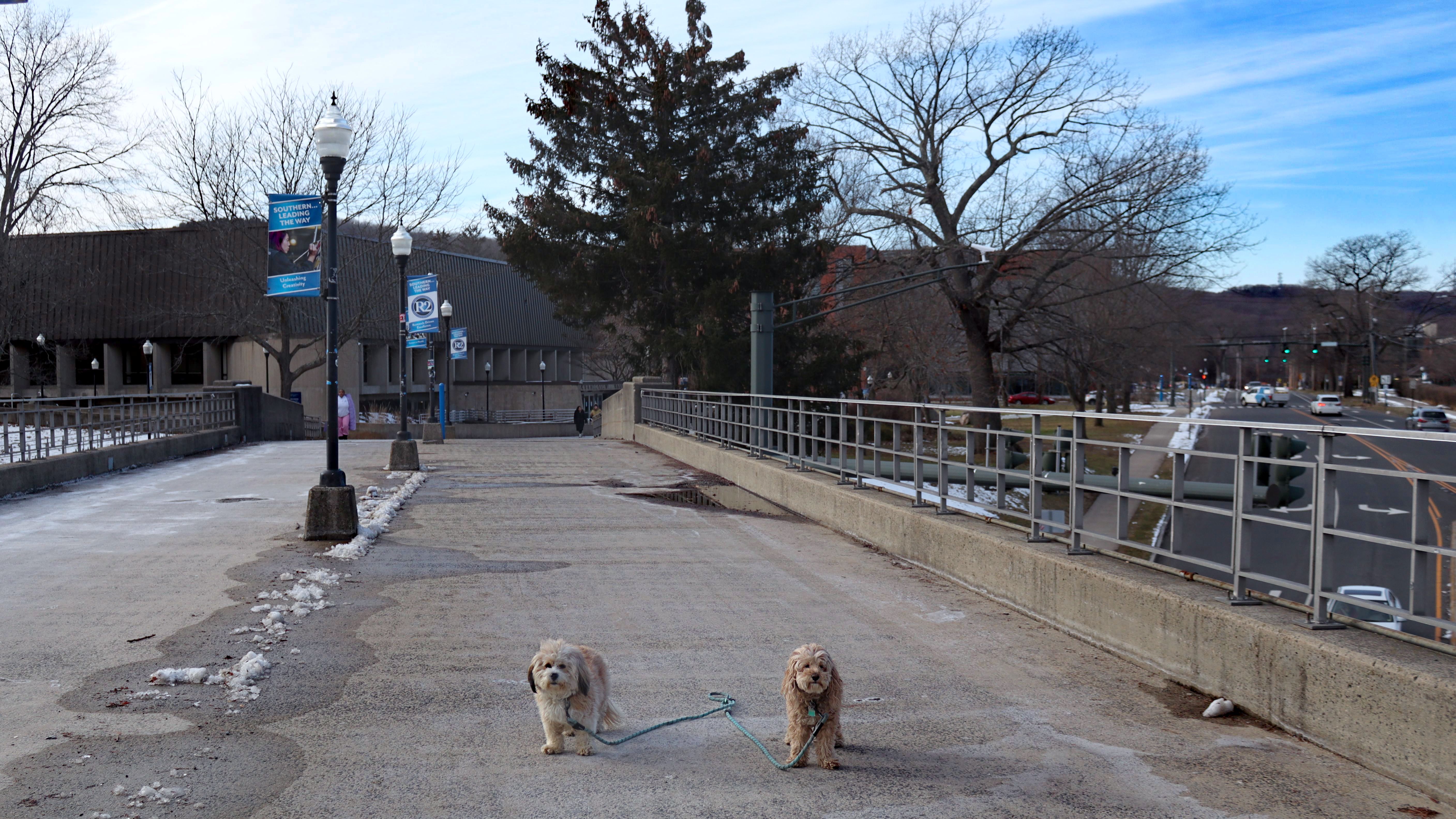 It was gray and gloomy for most of the day. The sun made a brief attempt to break through late in the afternoon, but it only left us with haze and fog, which created some interesting photo opportunities. We had visited before, first back in November of 2020, and later passed through again when we reached the southern end of the Farmington Canal Heritage Trail. It felt strange seeing chunks of ice floating in New Haven Harbor. We walked the full length of the harbor-side walkway, a little over two and a half miles round trip. On the opposite side of the street, food trucks were lined up, but every single one was a taco truck, so there wasn't much variety. The dogs enjoyed the walk, especially Mandy, who made it her personal mission to step in every puddle along the way.