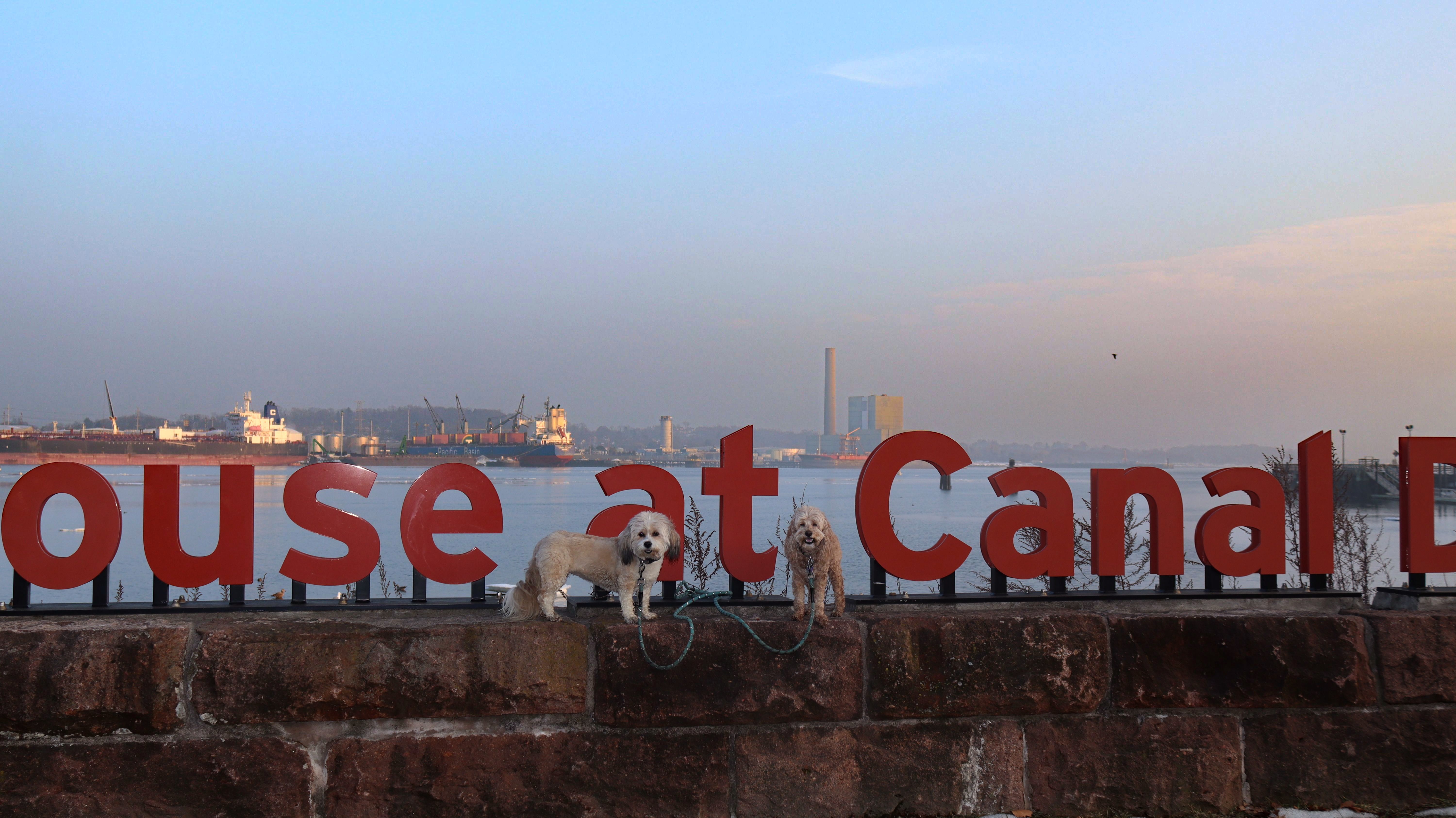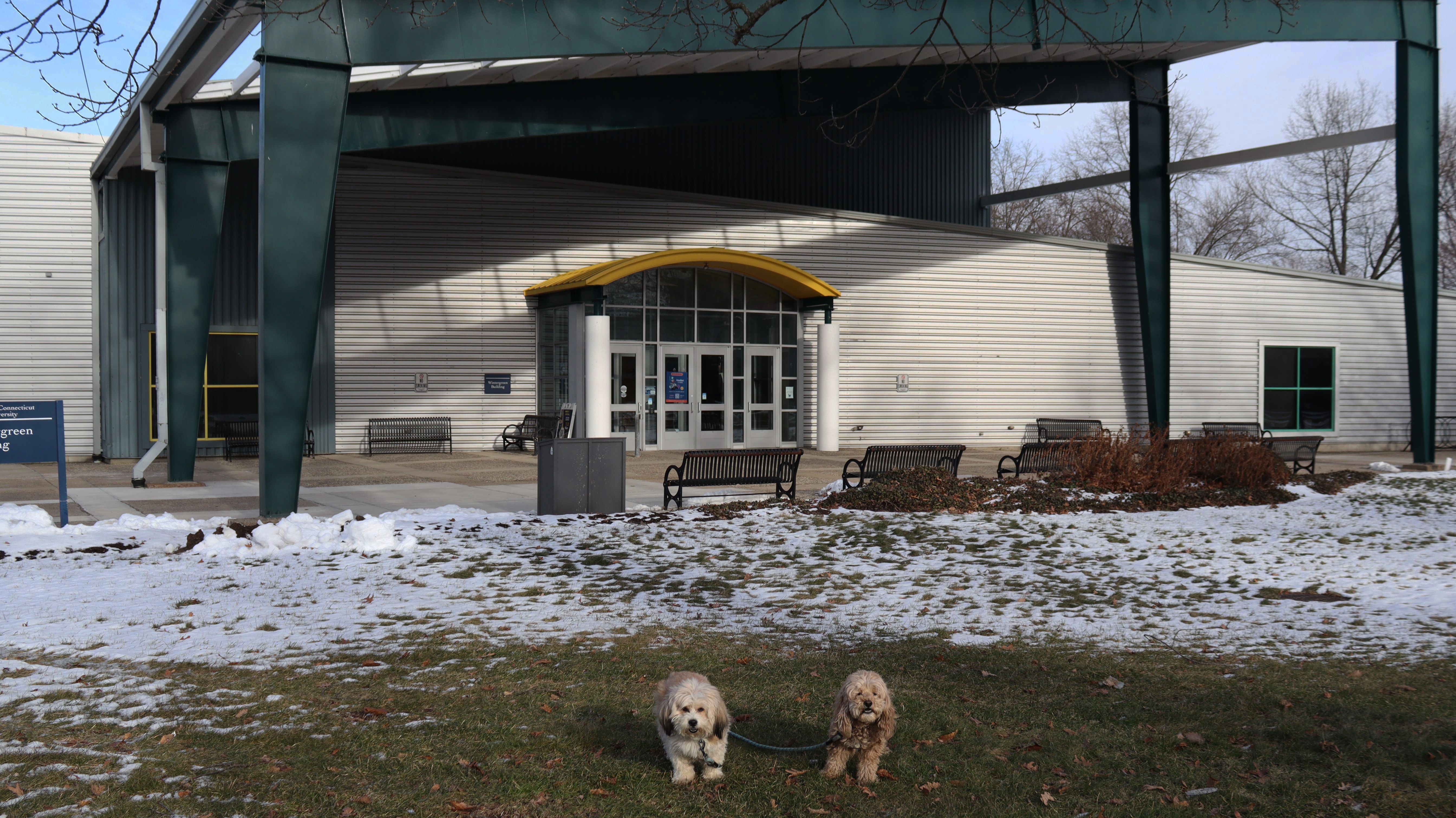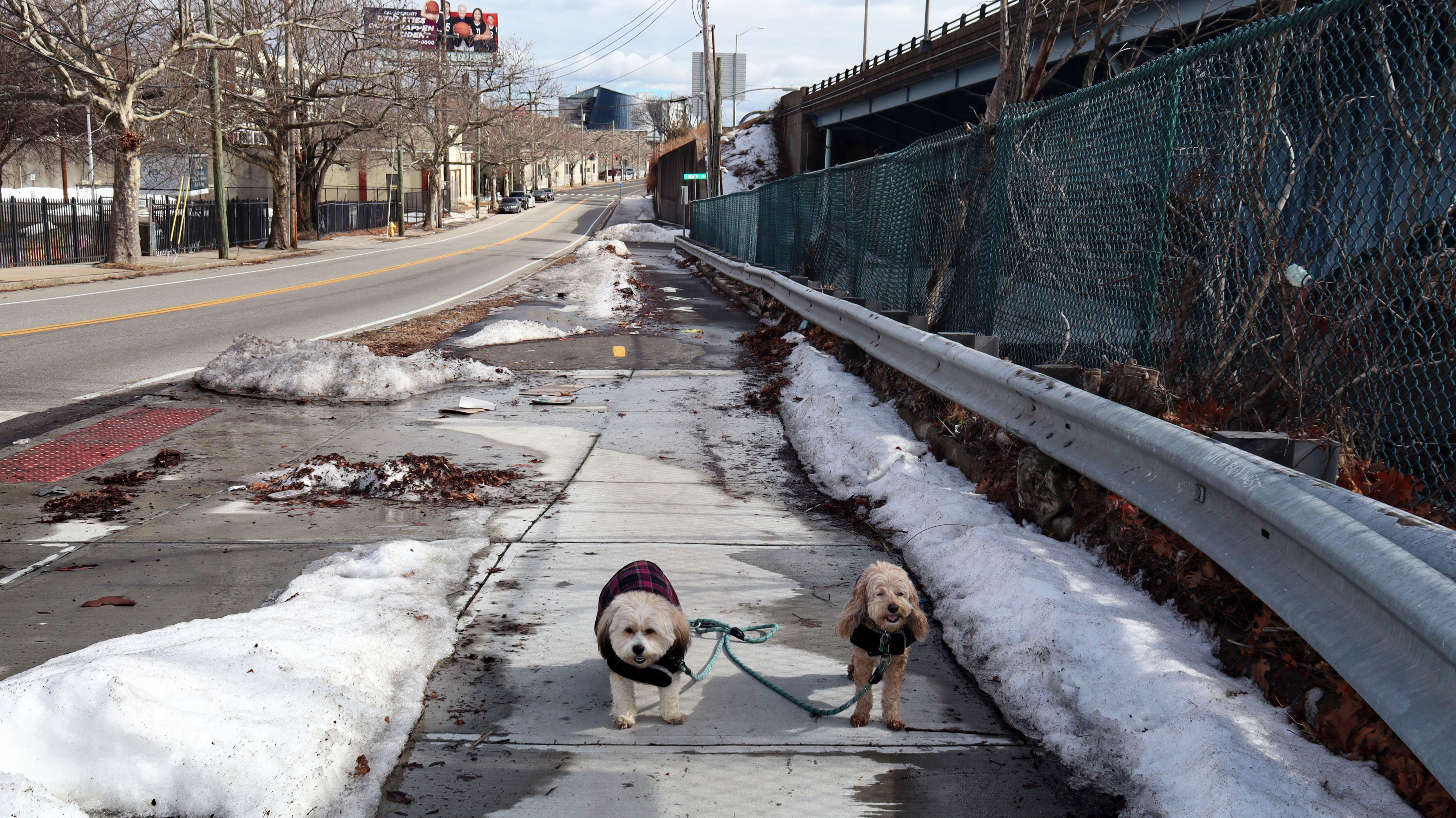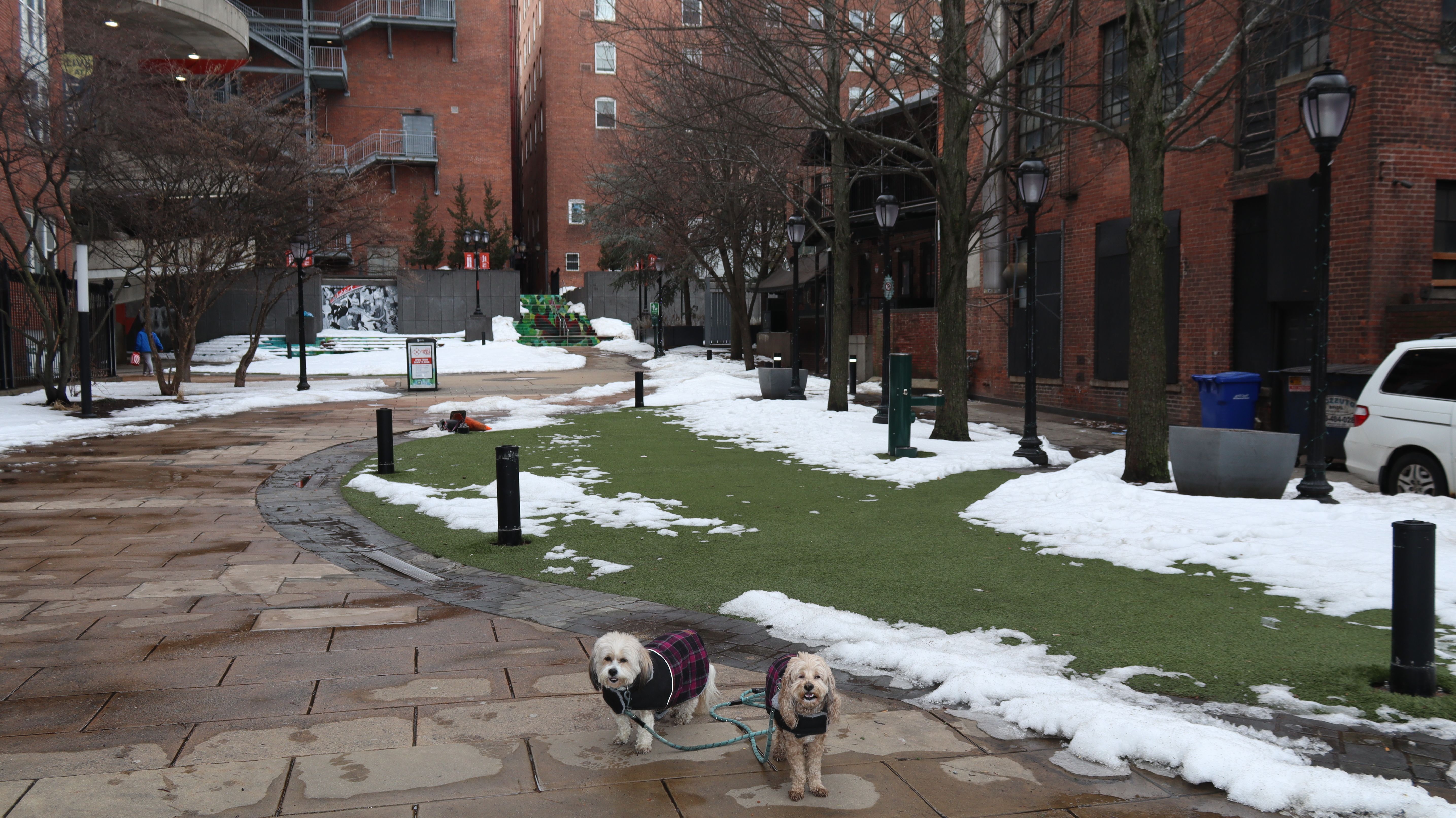 It was gray and gloomy for most of the day. The sun made a brief attempt to break through late in the afternoon, but it only left us with haze and fog, which created some interesting photo opportunities. We had visited before, first back in November of 2020, and later passed through again when we reached the southern end of the Farmington Canal Heritage Trail. It felt strange seeing chunks of ice floating in New Haven Harbor. We walked the full length of the harbor-side walkway, a little over two and a half miles round trip. On the opposite side of the street, food trucks were lined up, but every single one was a taco truck, so there wasn't much variety. The dogs enjoyed the walk, especially Mandy, who made it her personal mission to step in every puddle along the way.